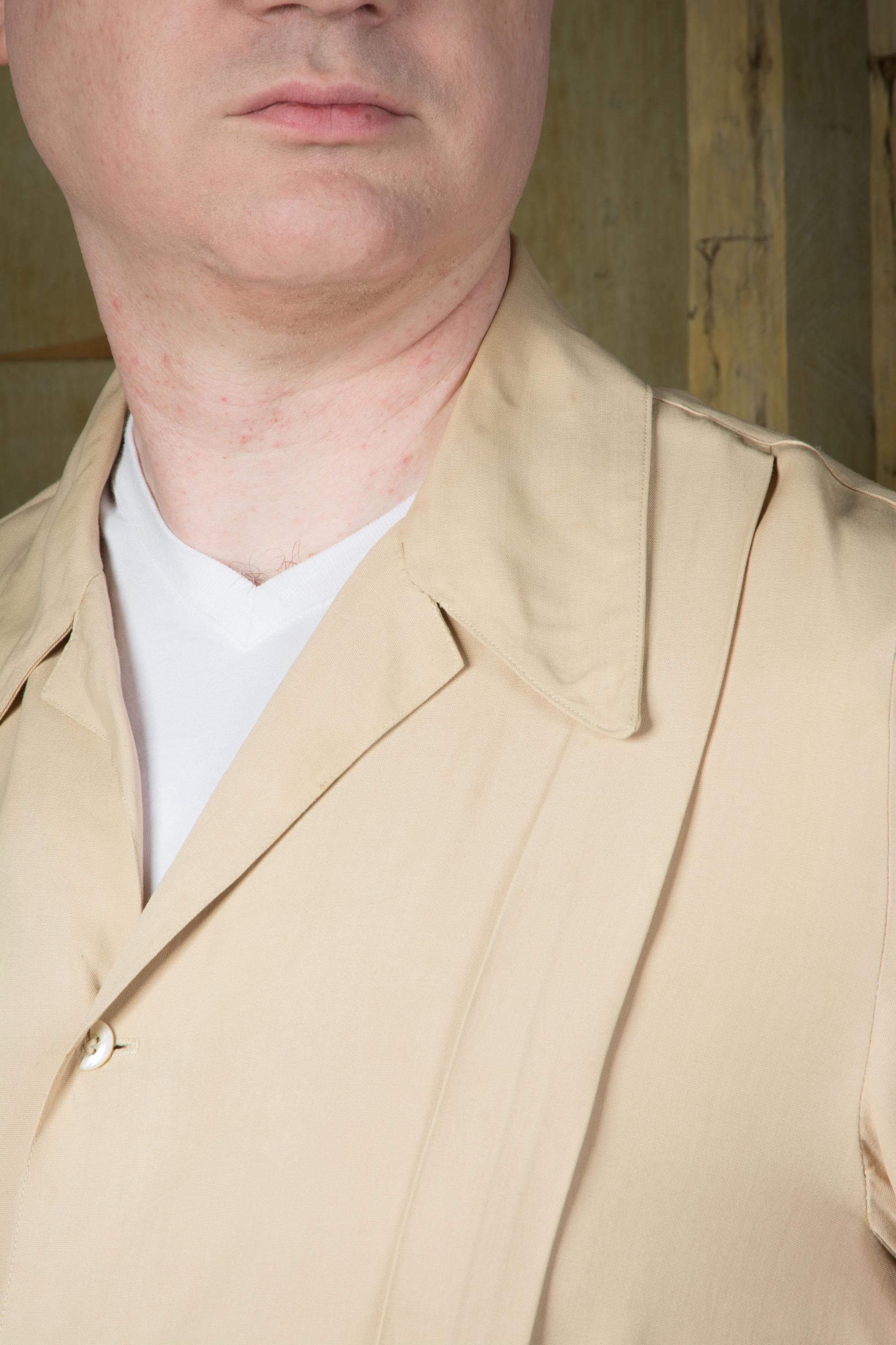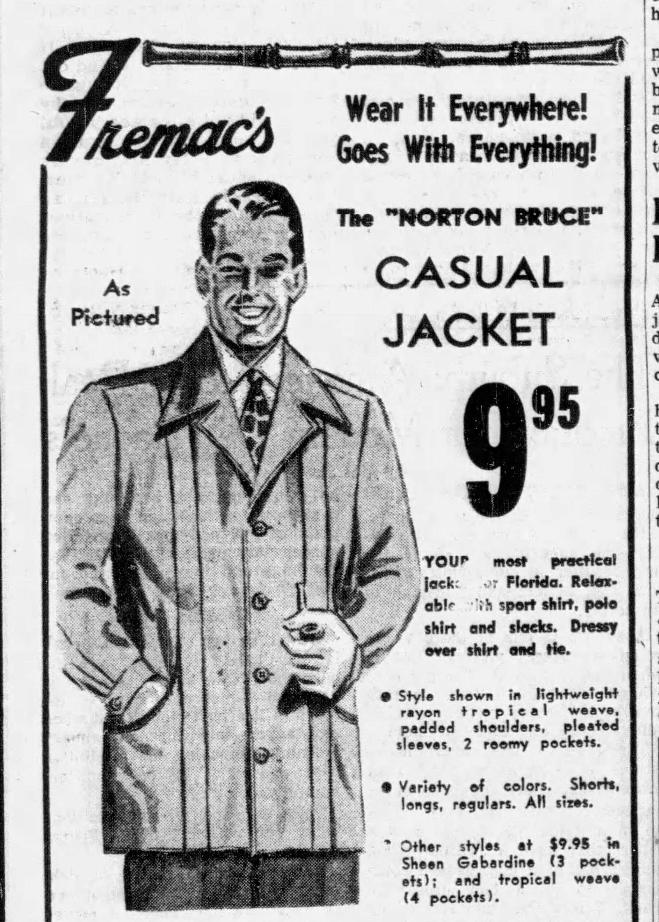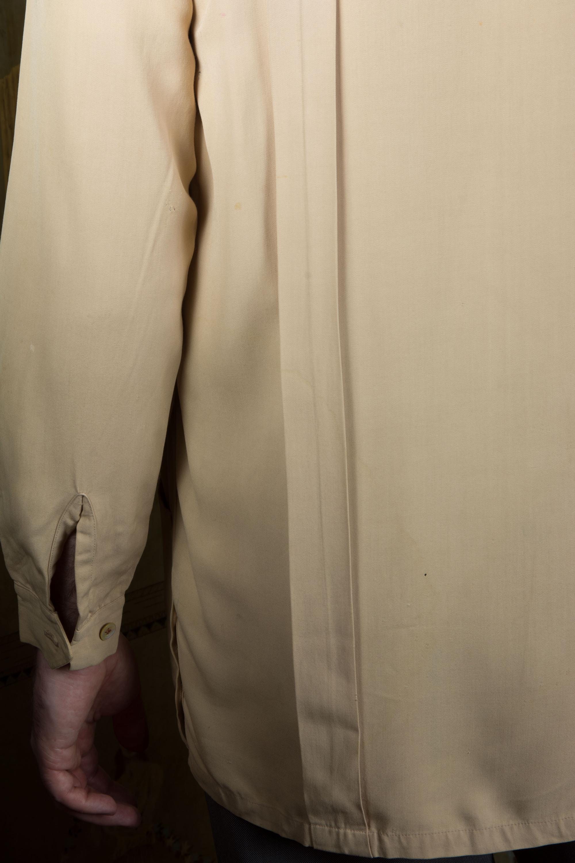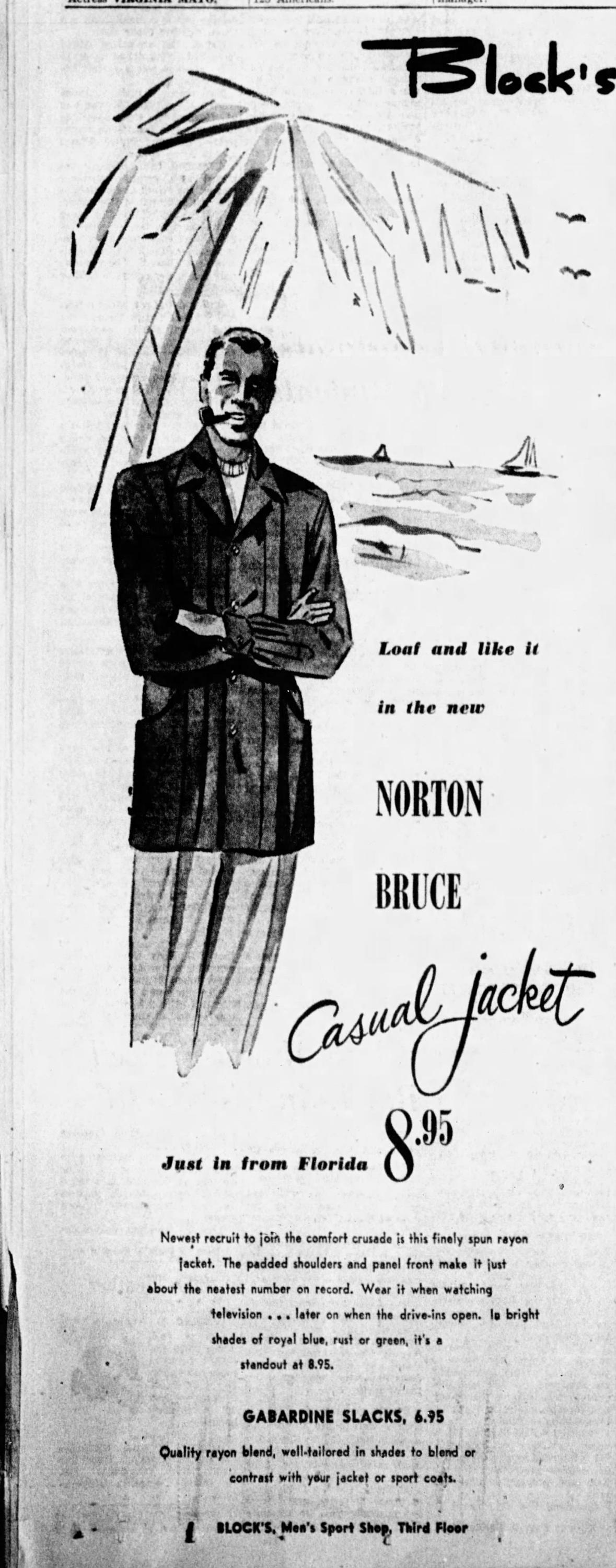 A unique early 1950s leisure jacket in a "tropical weave" according the 1952 advertisement - I found ads for this style from 1951 to 1953. This was made for lounging - and looking like it! It has a western back yoke. Four long pleats run vertical - one at each side of the front and back. It features two softly curving pockets, with working buttons on the sides which can be opened as vents. It is unlined, excellent for sunny weather.