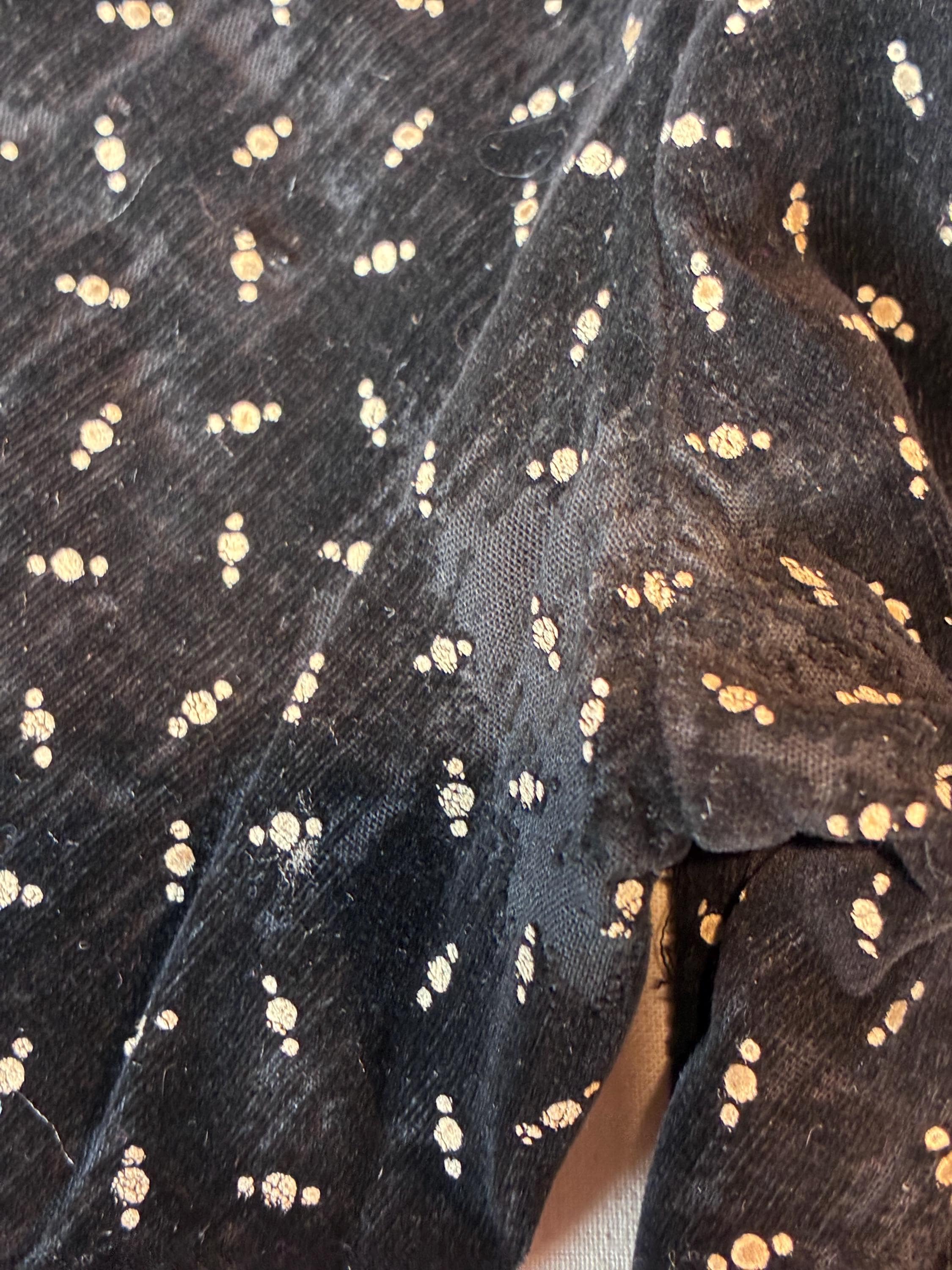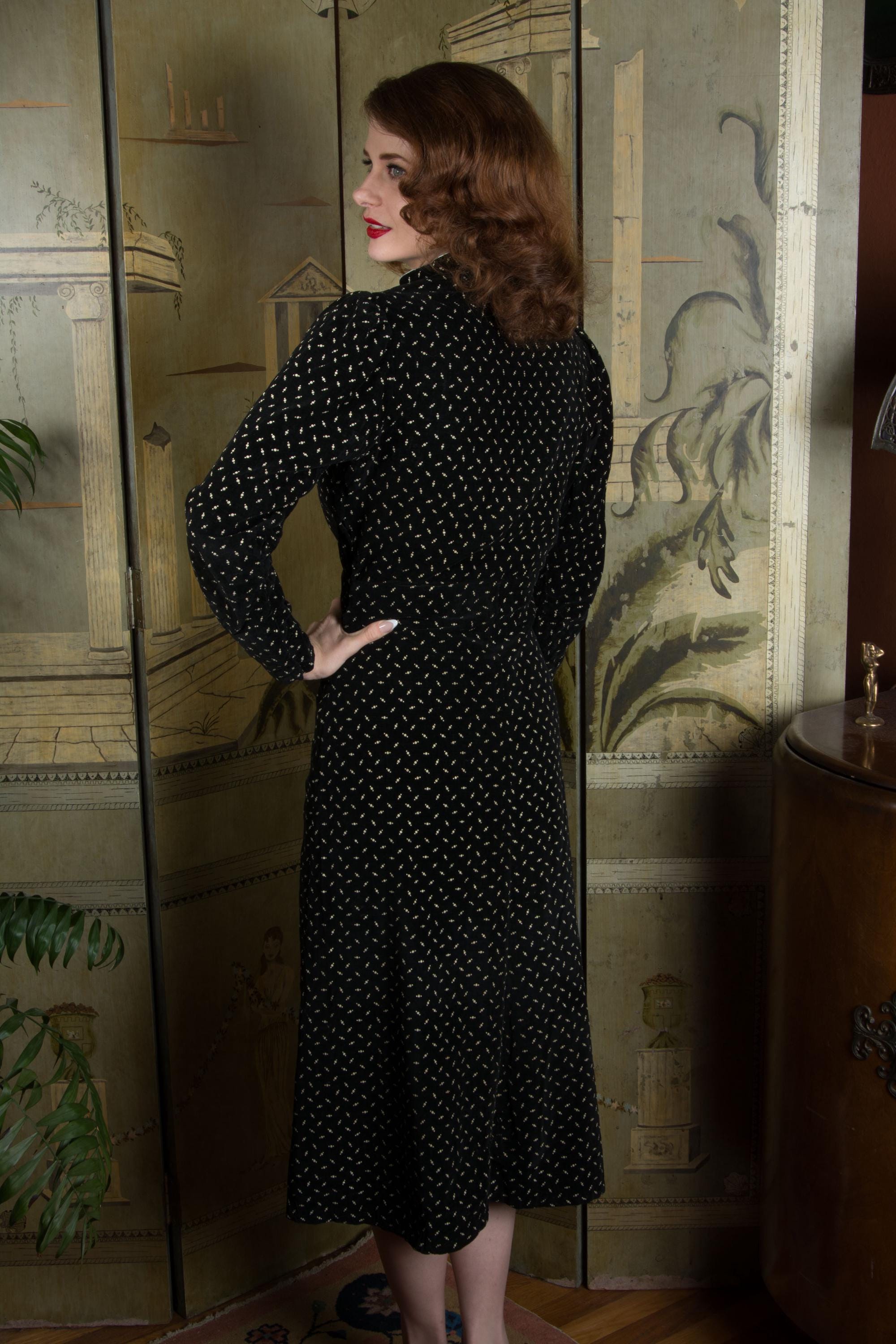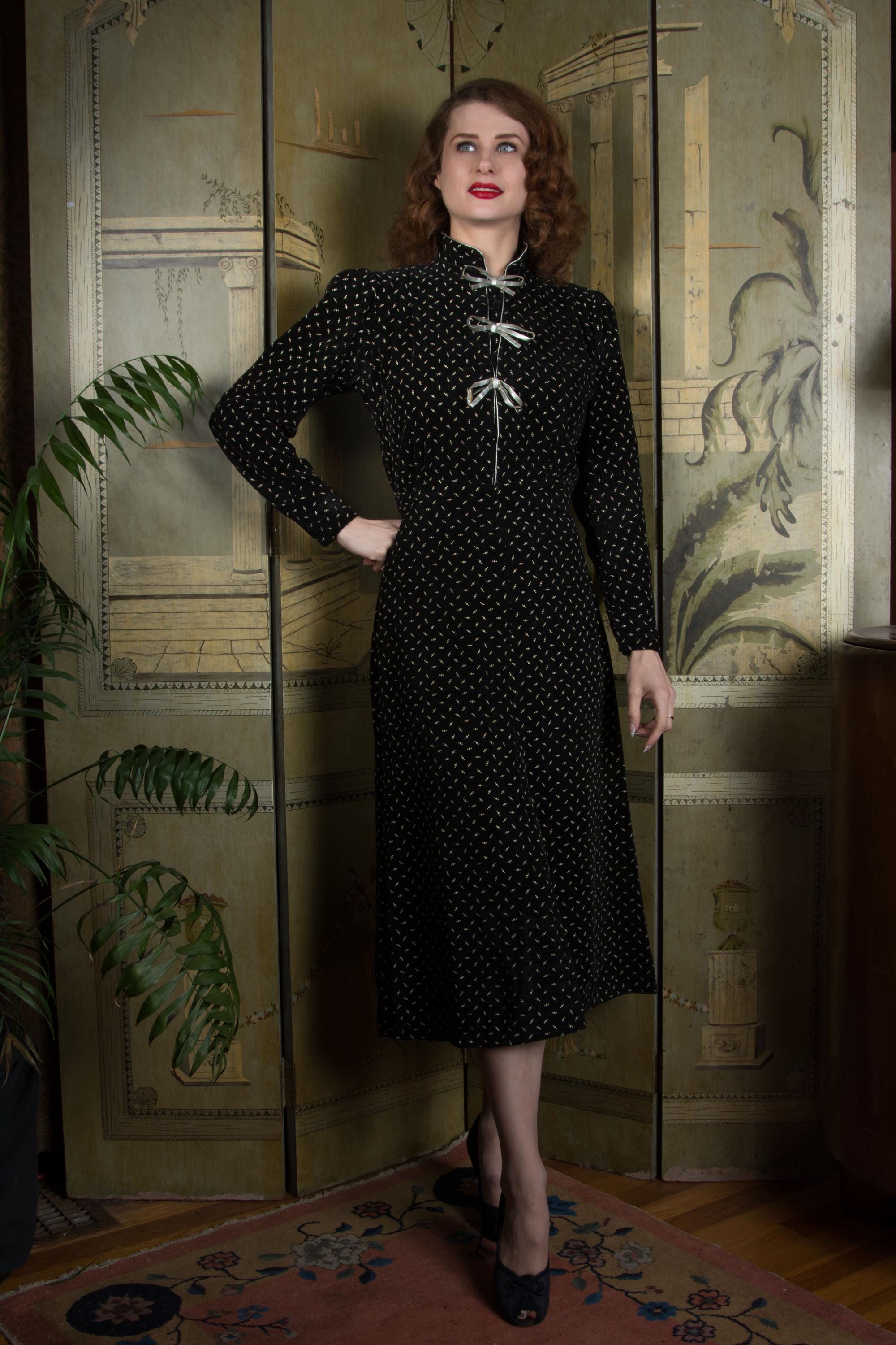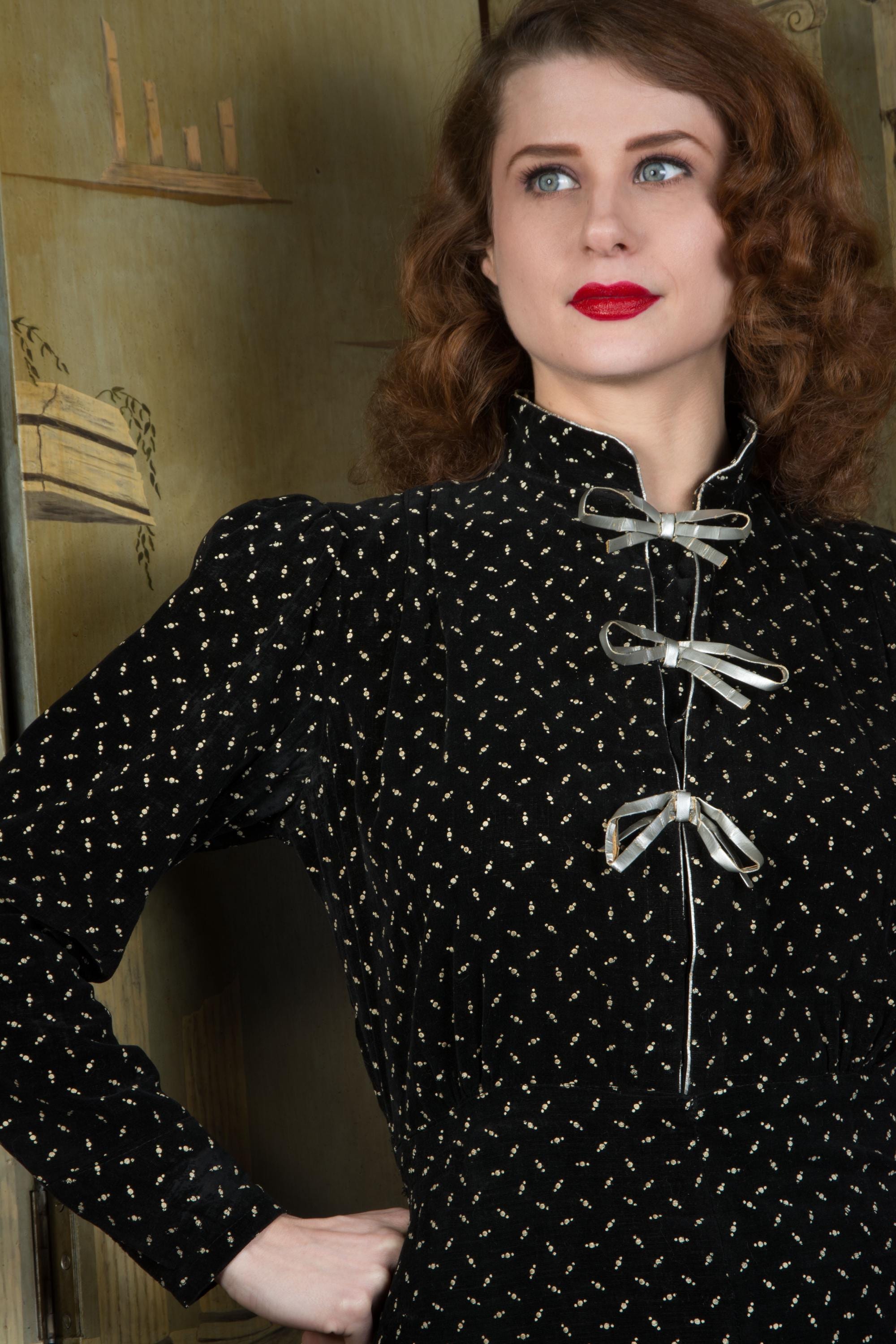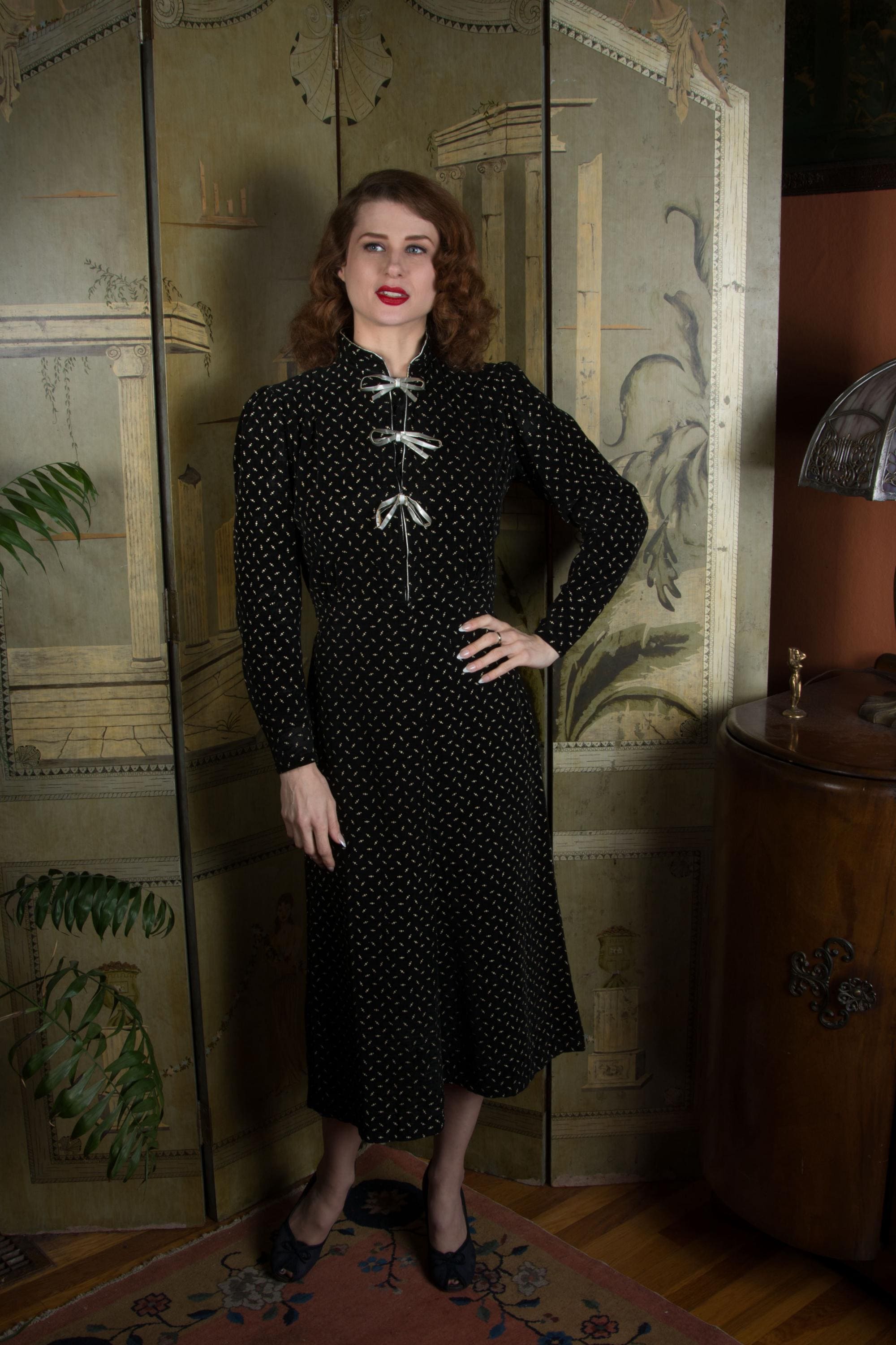 Vintage late 1930s dress is as-is, but oh, so on-point! This very 1937 frock is made of a black screen printed velveteen - the little dots sort of look like little wrapped taffy. This has a high standing collar, with three stiff bows that are made of ... maybe a reinforced paper or cardboard, and the neckline and placket has piping of the same - talk about a depression era detail. The sleeves are a very low key gigot style, puffed at the shoulder and more fitted to the lower sleeve. The dress closes on the side and partway down the front placket with snaps.