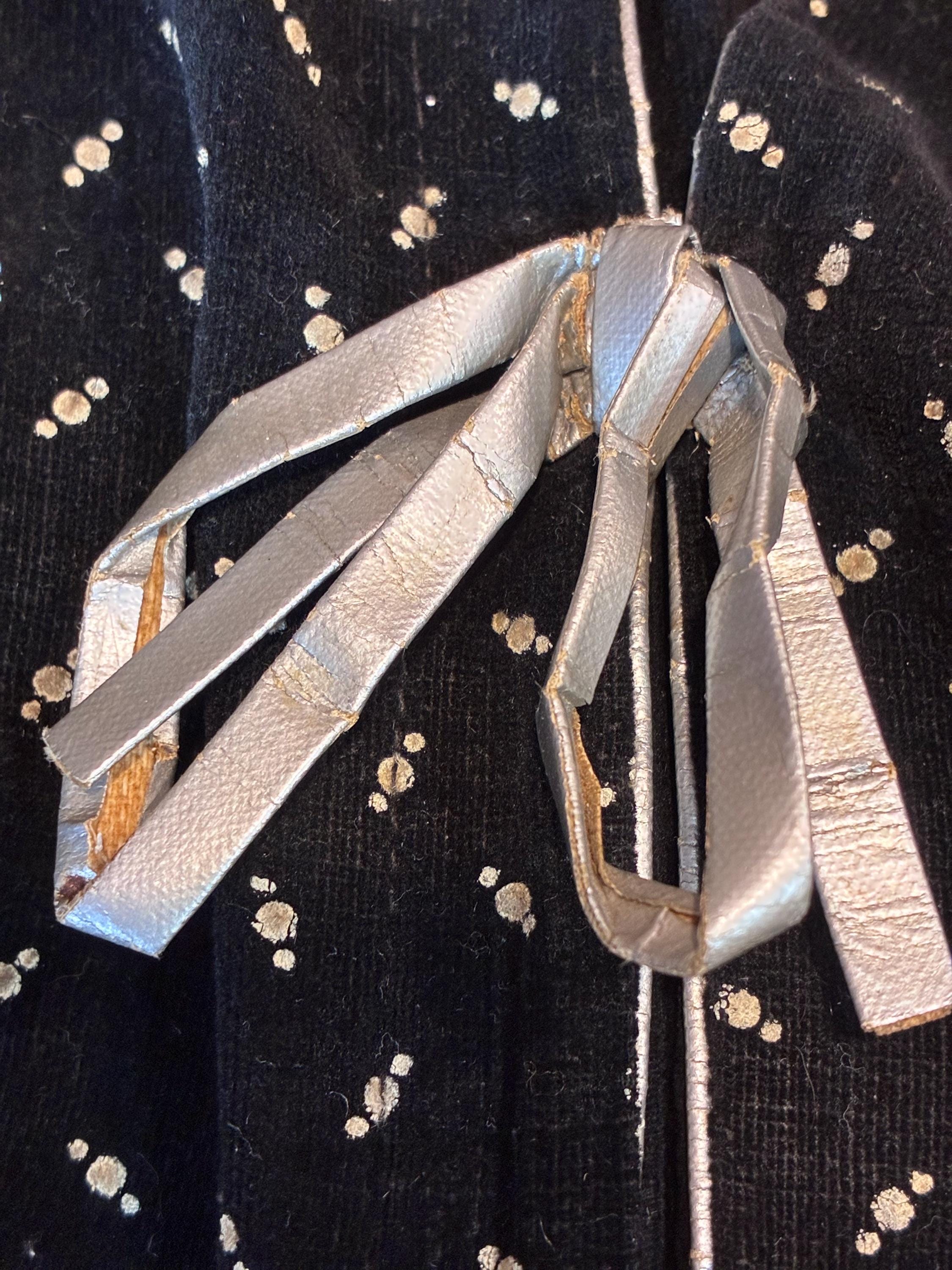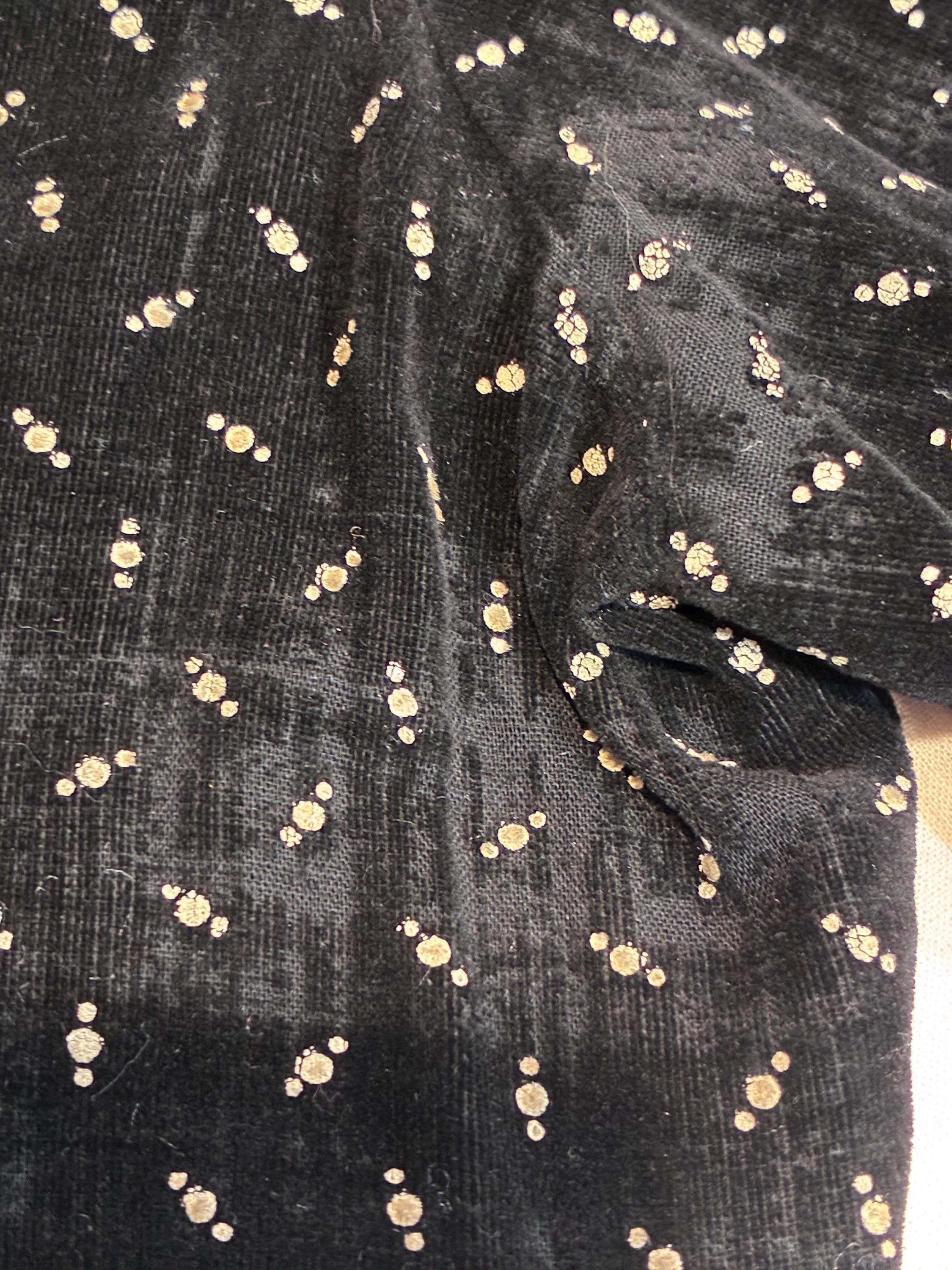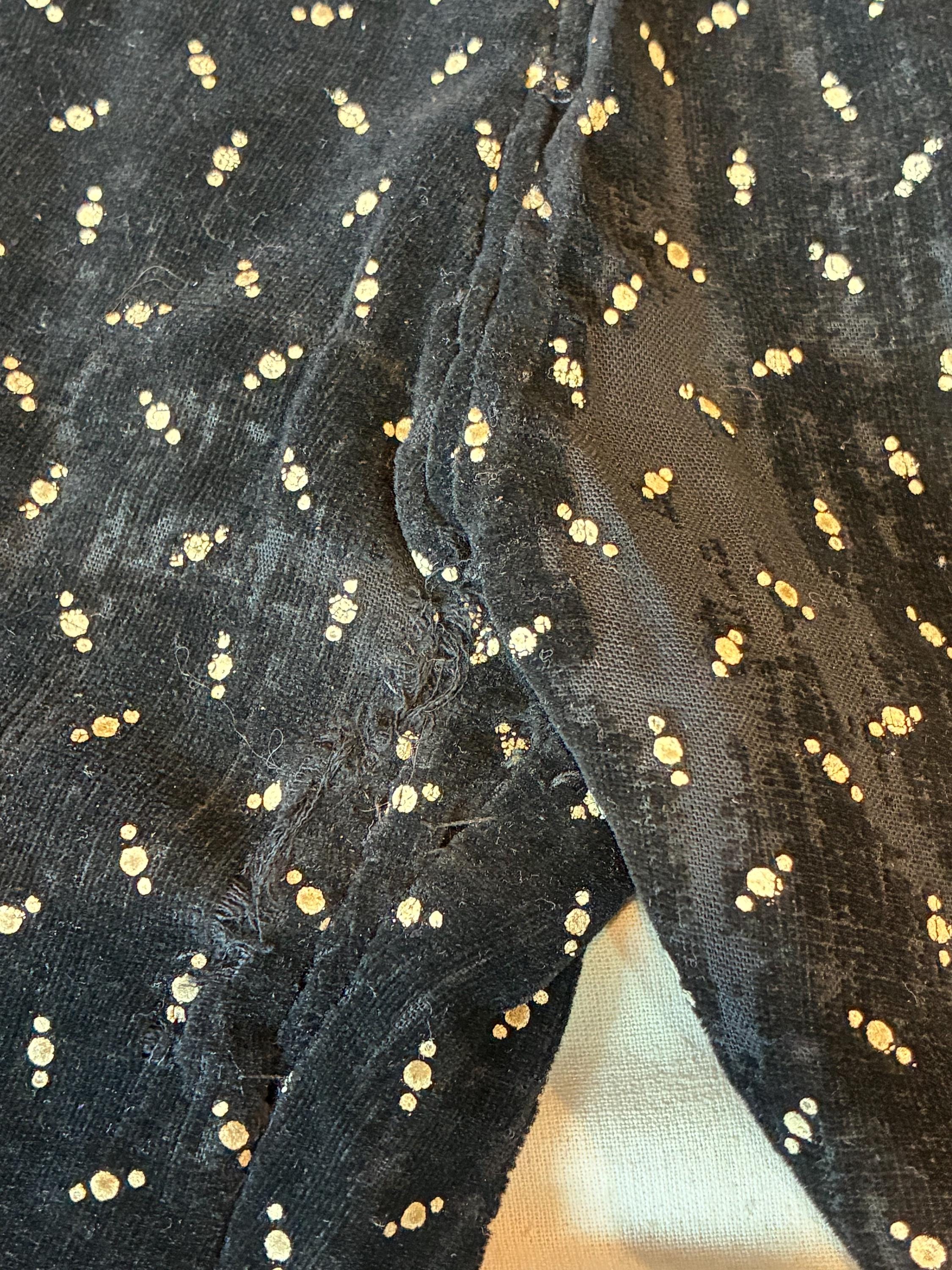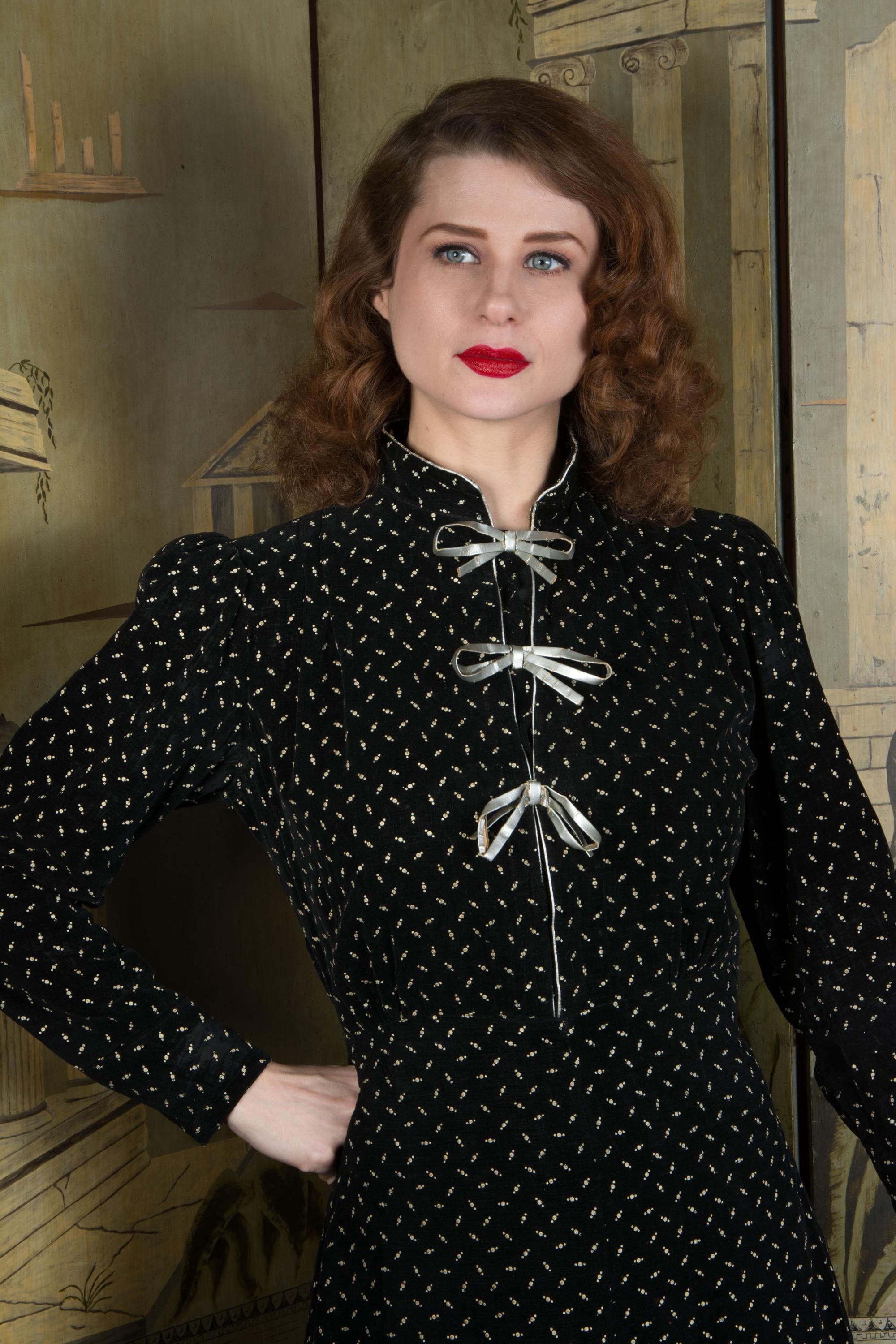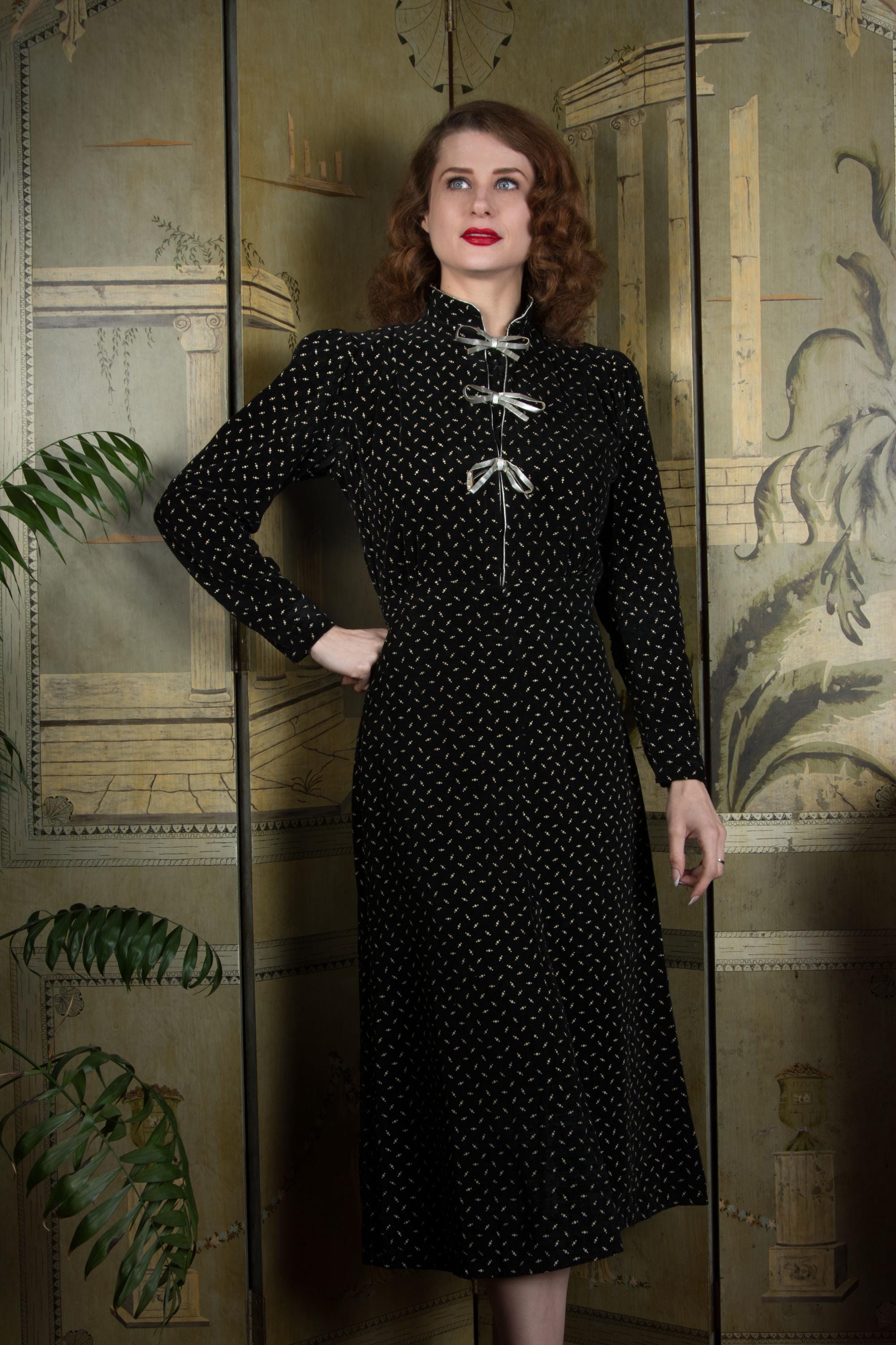 Vintage late 1930s dress is as-is, but oh, so on-point! This very 1937 frock is made of a black screen printed velveteen - the little dots sort of look like little wrapped taffy. This has a high standing collar, with three stiff bows that are made of ... maybe a reinforced paper or cardboard, and the neckline and placket has piping of the same - talk about a depression era detail. The sleeves are a very low key gigot style, puffed at the shoulder and more fitted to the lower sleeve. The dress closes on the side and partway down the front placket with snaps.