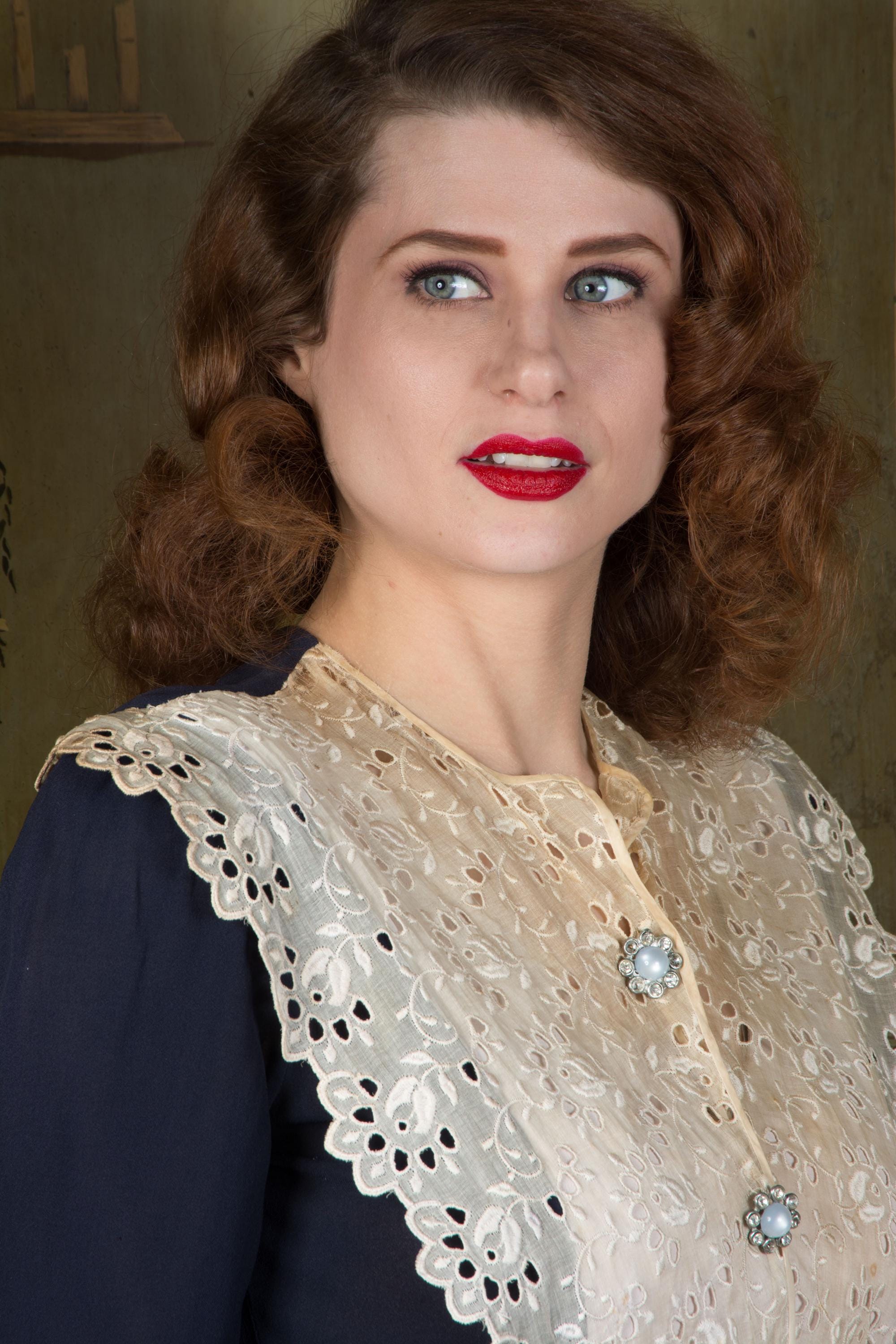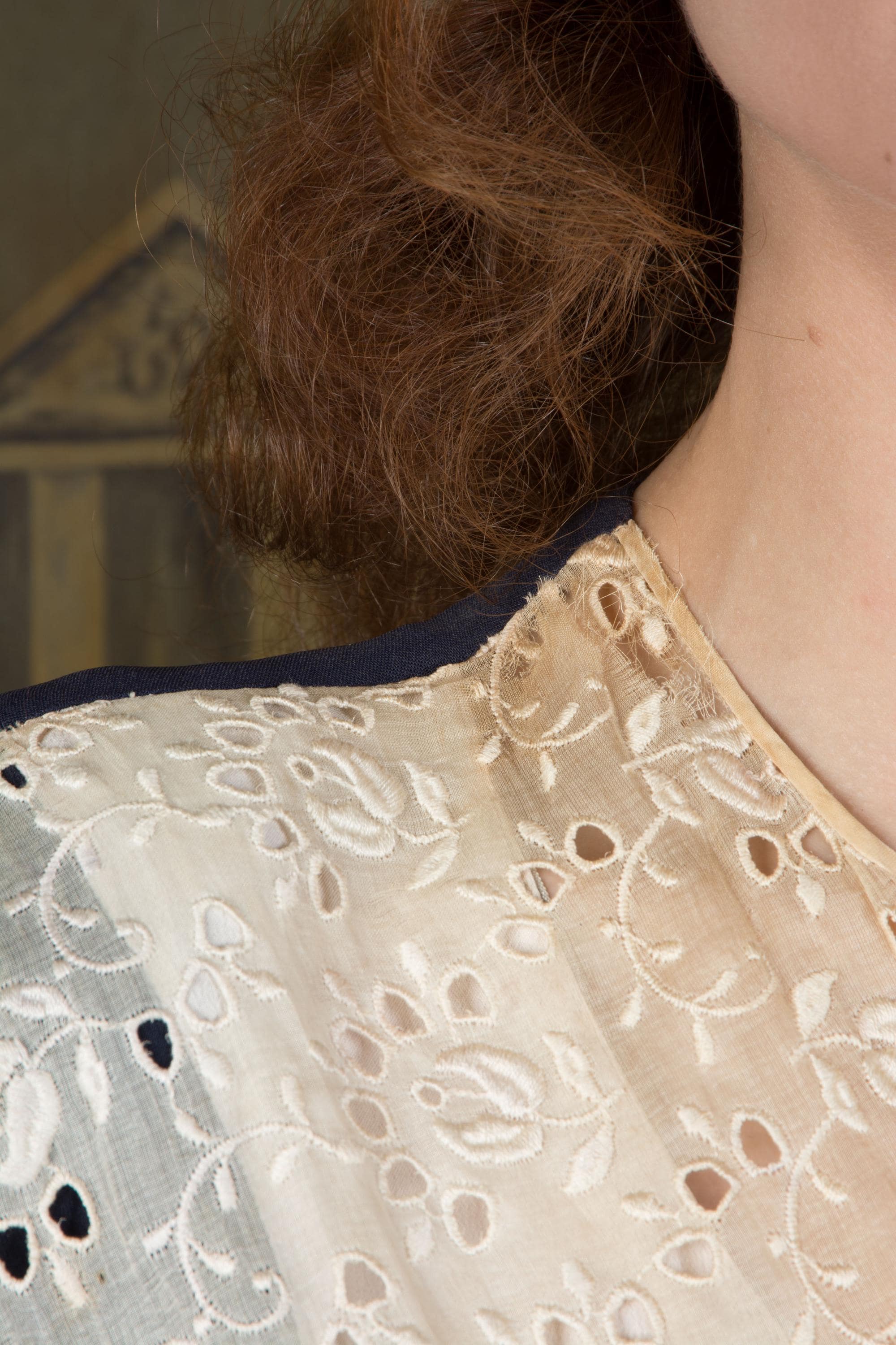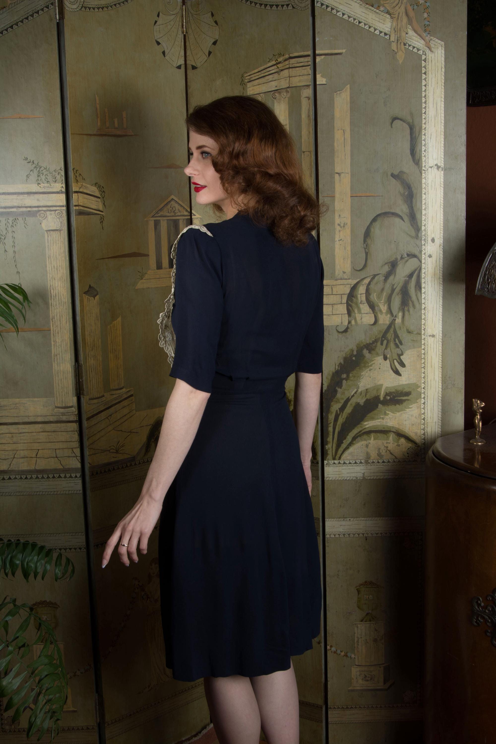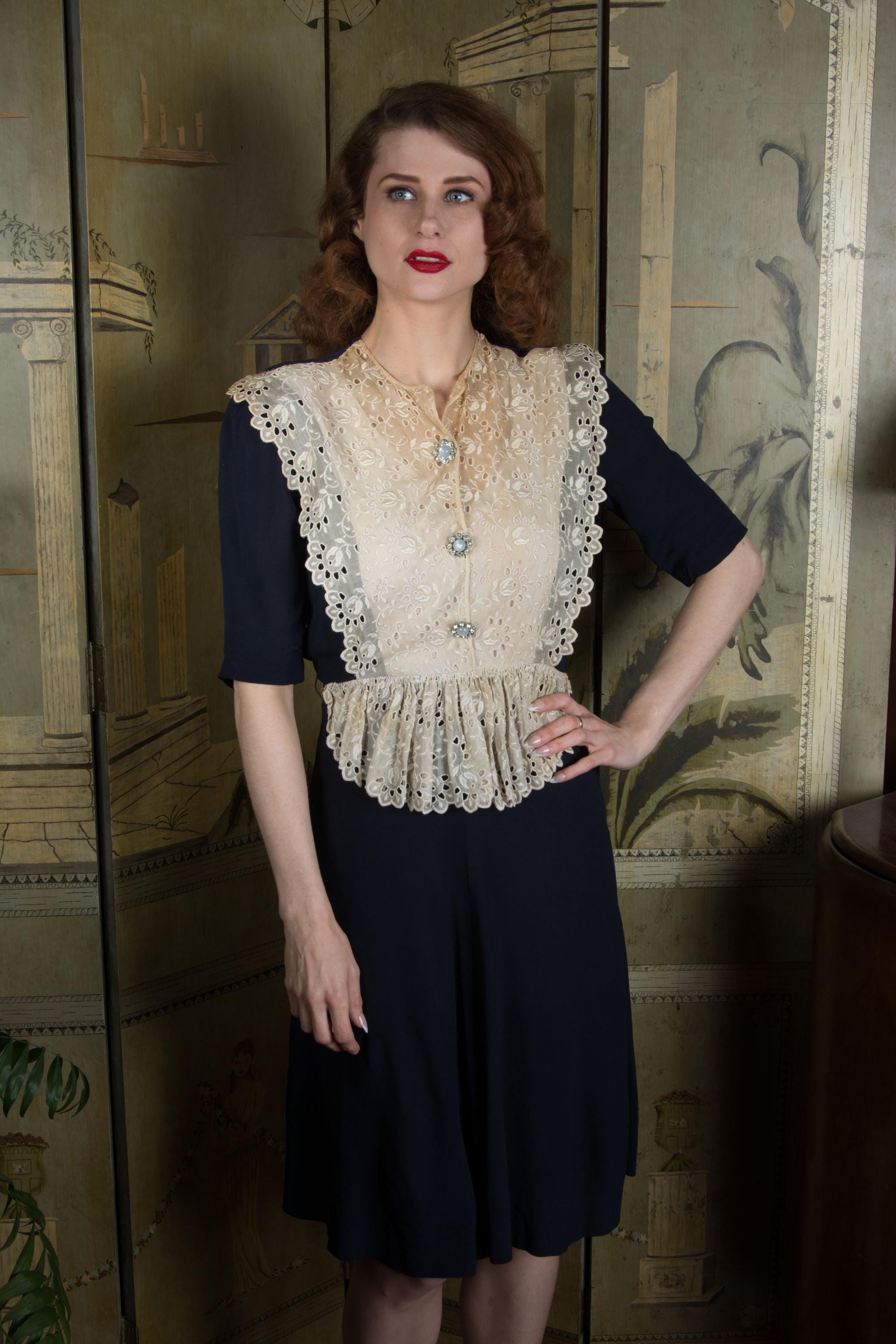 This dress has been dry cleaned and the navy components are sturdy. The lace did not come clean at the cleaners, and I cannot deconstruct the dress to remove and wash it. It is yellowed and has scattered spots, mostly at the shoulders/neckline. There's small, darker areas near the edge that have frayed through. Beautiful, wounded - still wearable.