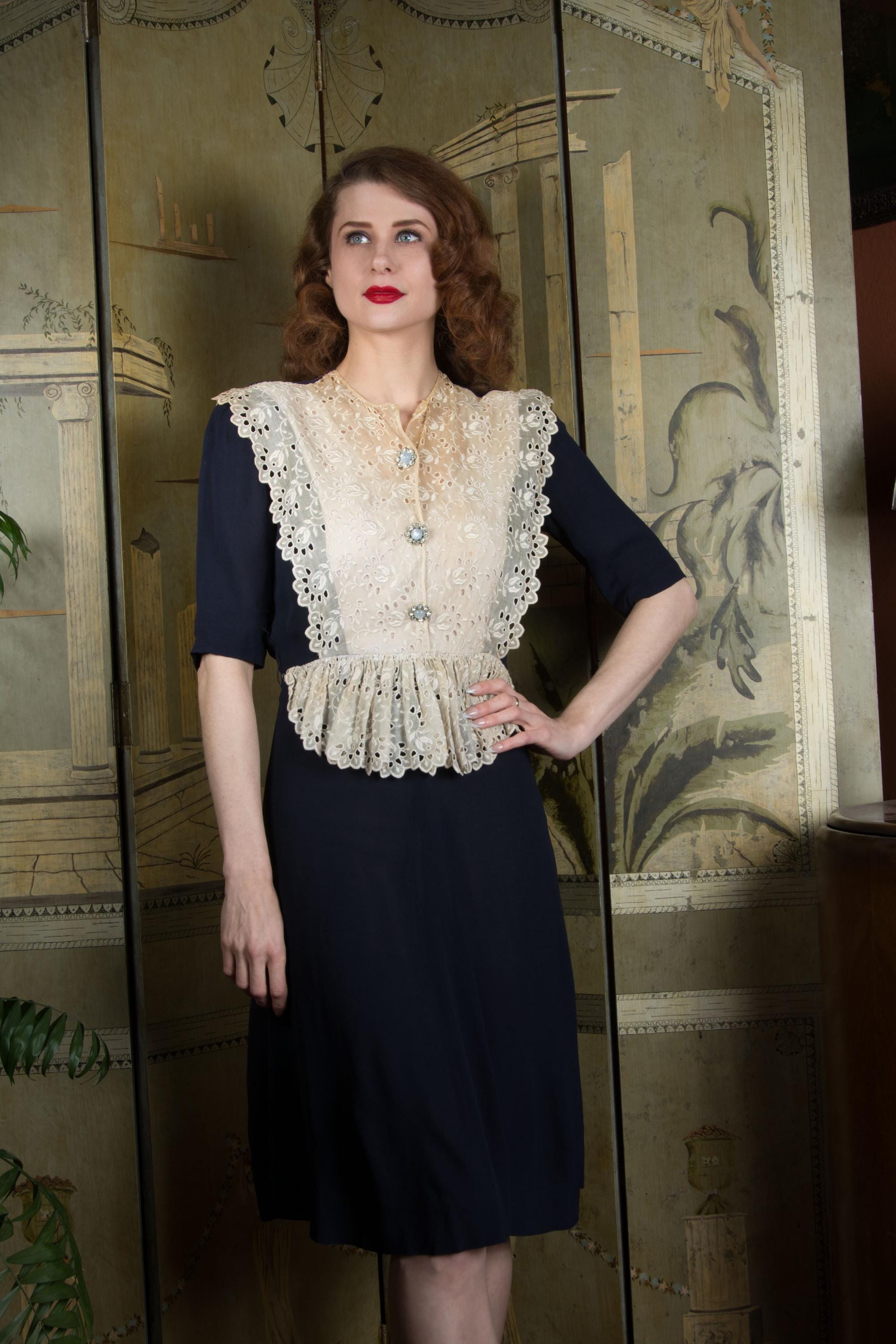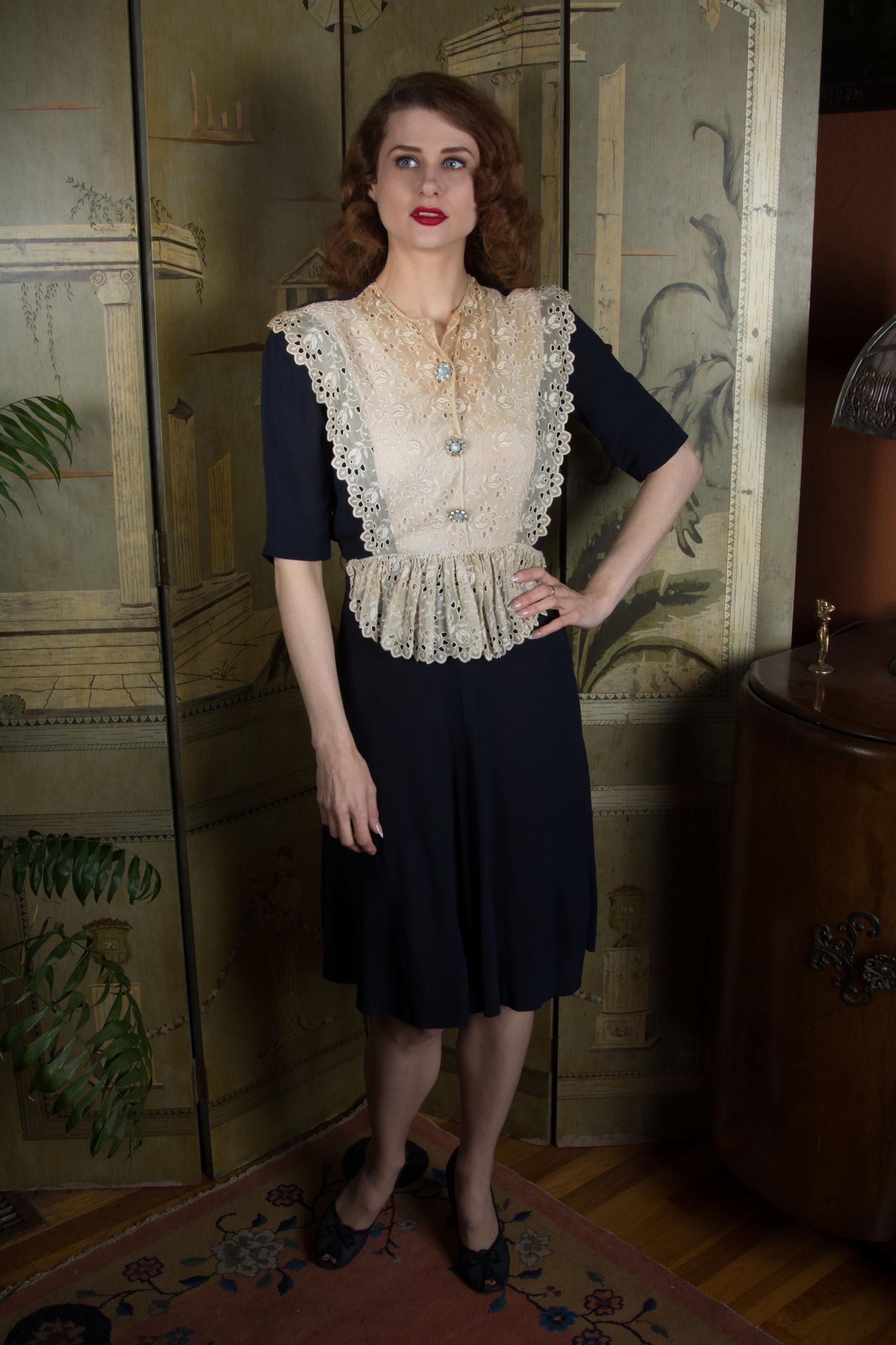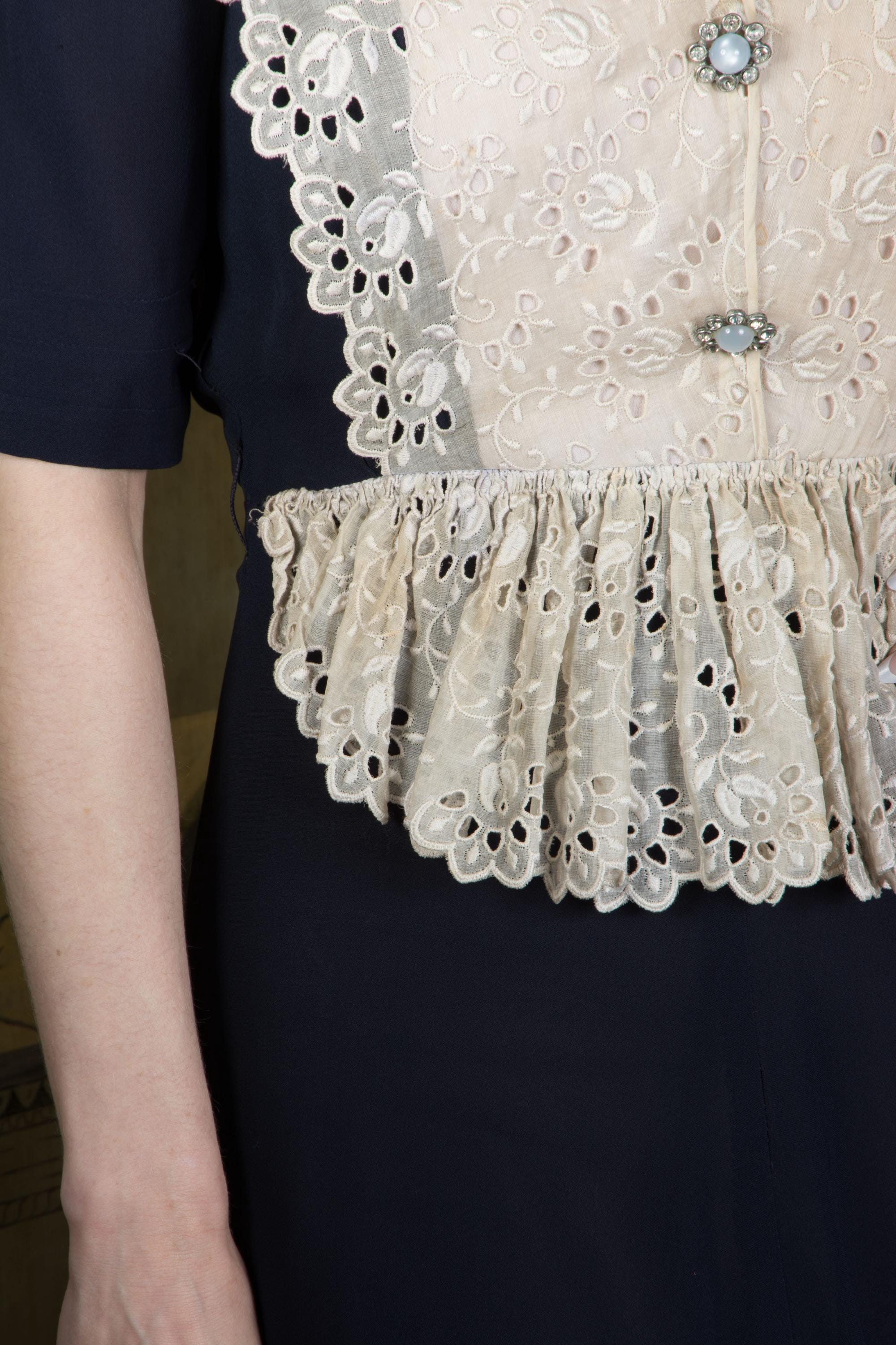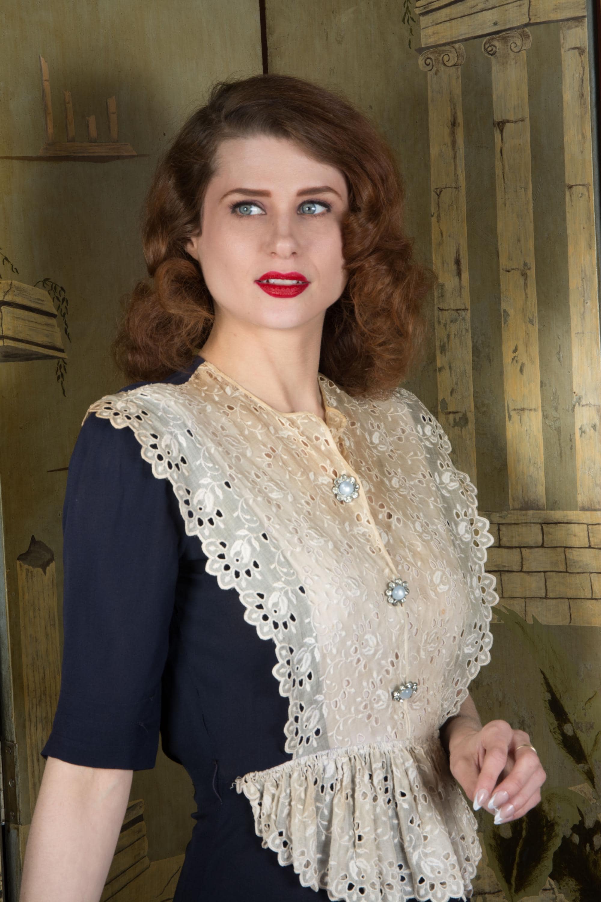 Vintage late day dress from New York Creations is absolutely darling. It has lightly padded puffed sleeve shoulders and a swishy skirt, shaped with four flared gores. The feature of the piece is the eyelet lace done on delicate organza. This is backed in a colorblock inset of ecru. The effect it has is flattering, accenting the width of the shoulders and nipping the waist. The shirred peplum is made of the same cotton organza eyelet lace. The dress closes on the side with a sturdy metal zipper.