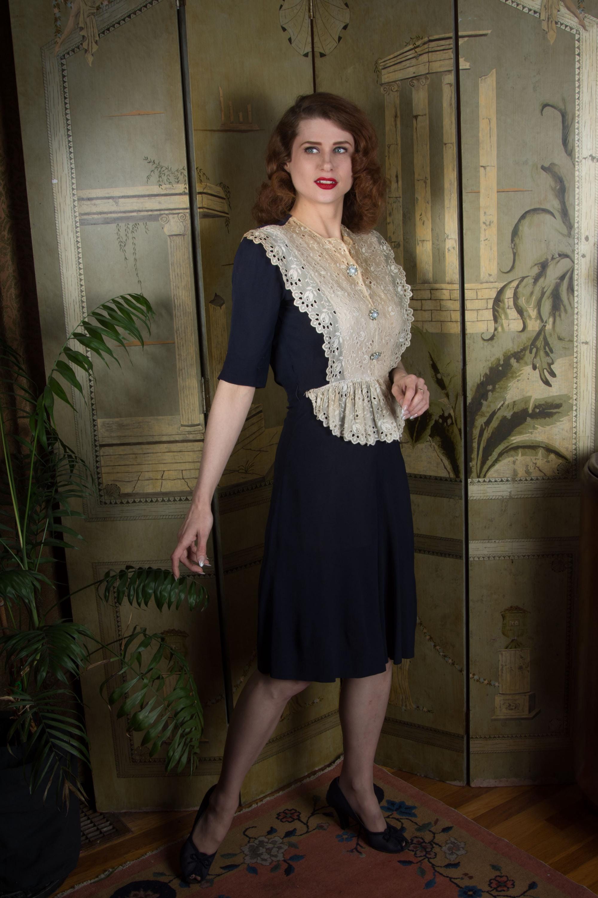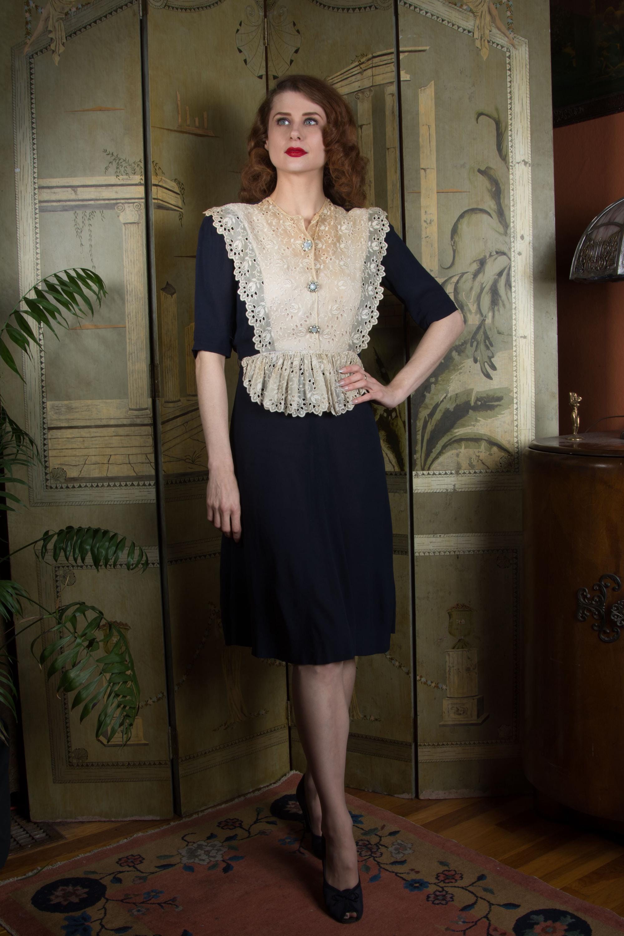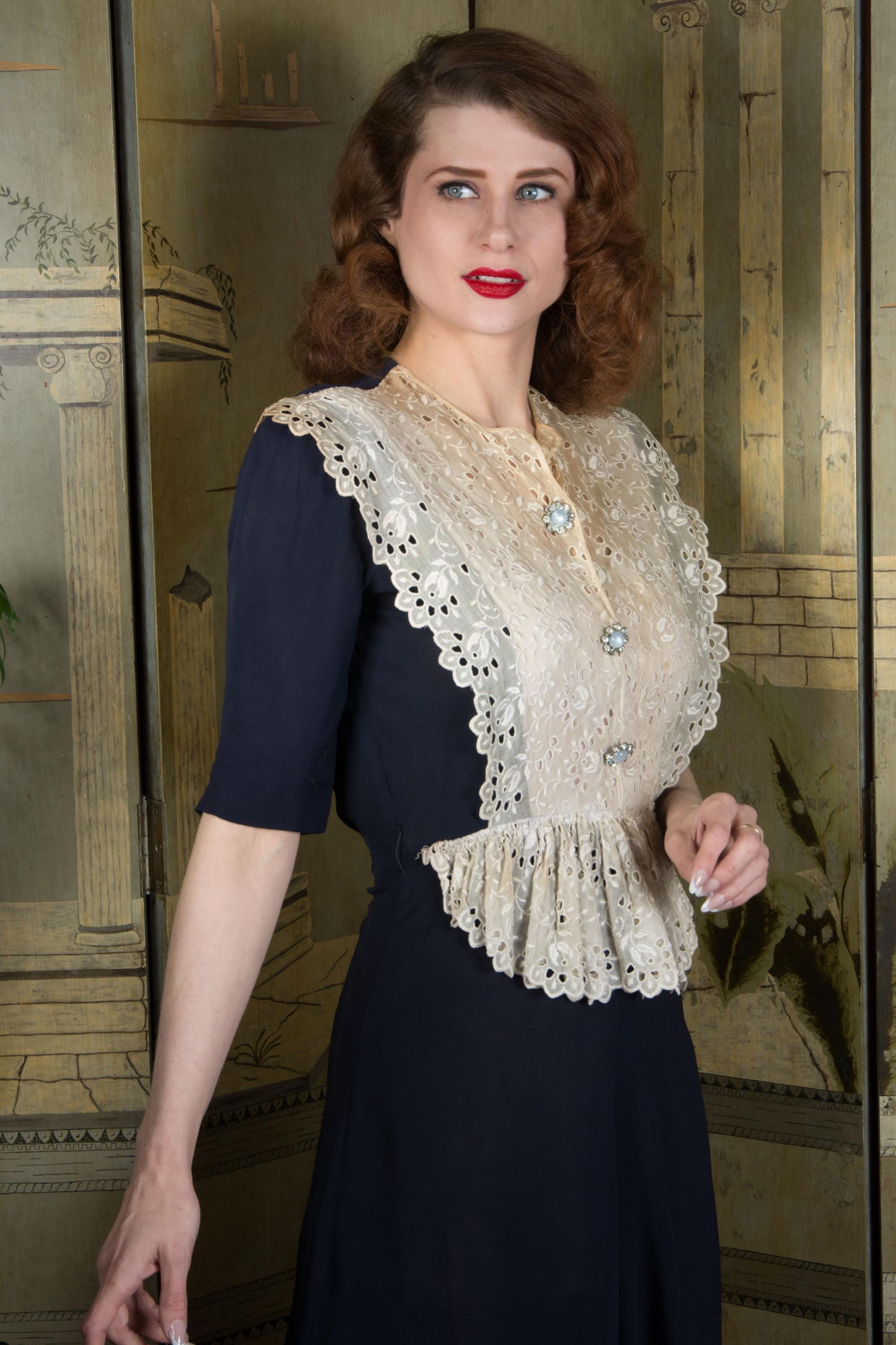 Vintage late day dress from New York Creations is absolutely darling. It has lightly padded puffed sleeve shoulders and a swishy skirt, shaped with four flared gores. The feature of the piece is the eyelet lace done on delicate organza. This is backed in a colorblock inset of ecru. The effect it has is flattering, accenting the width of the shoulders and nipping the waist. The shirred peplum is made of the same cotton organza eyelet lace. The dress closes on the side with a sturdy metal zipper.