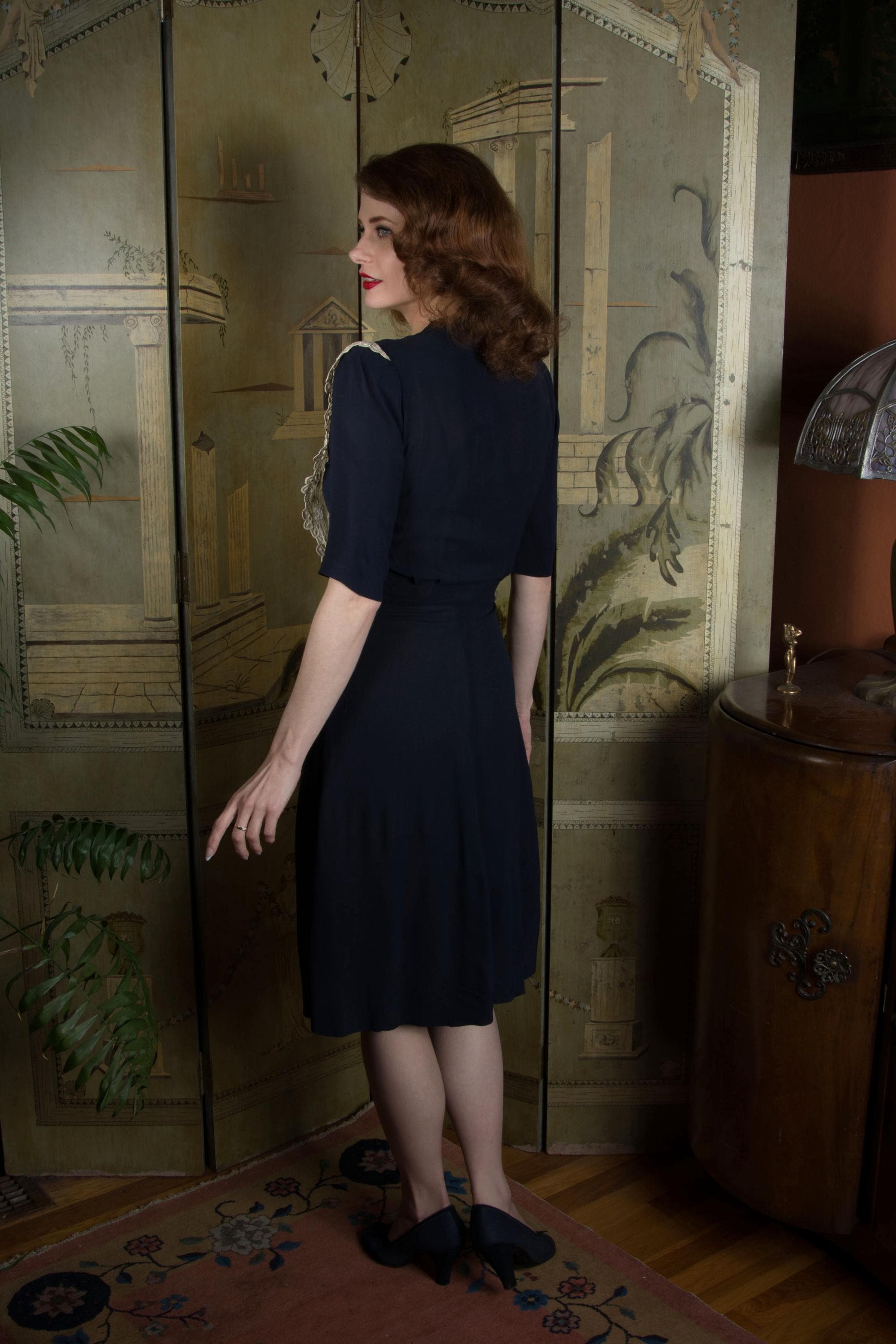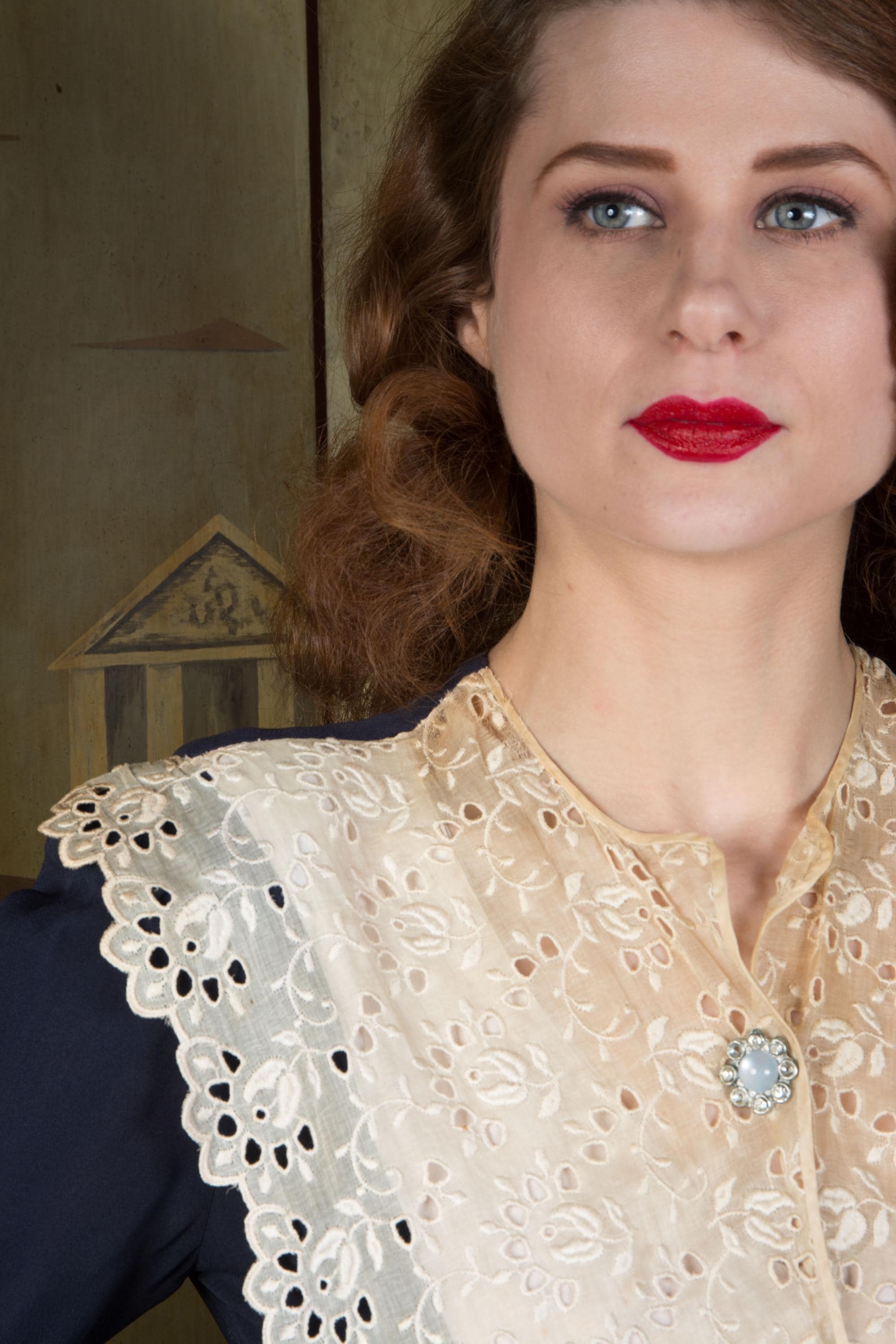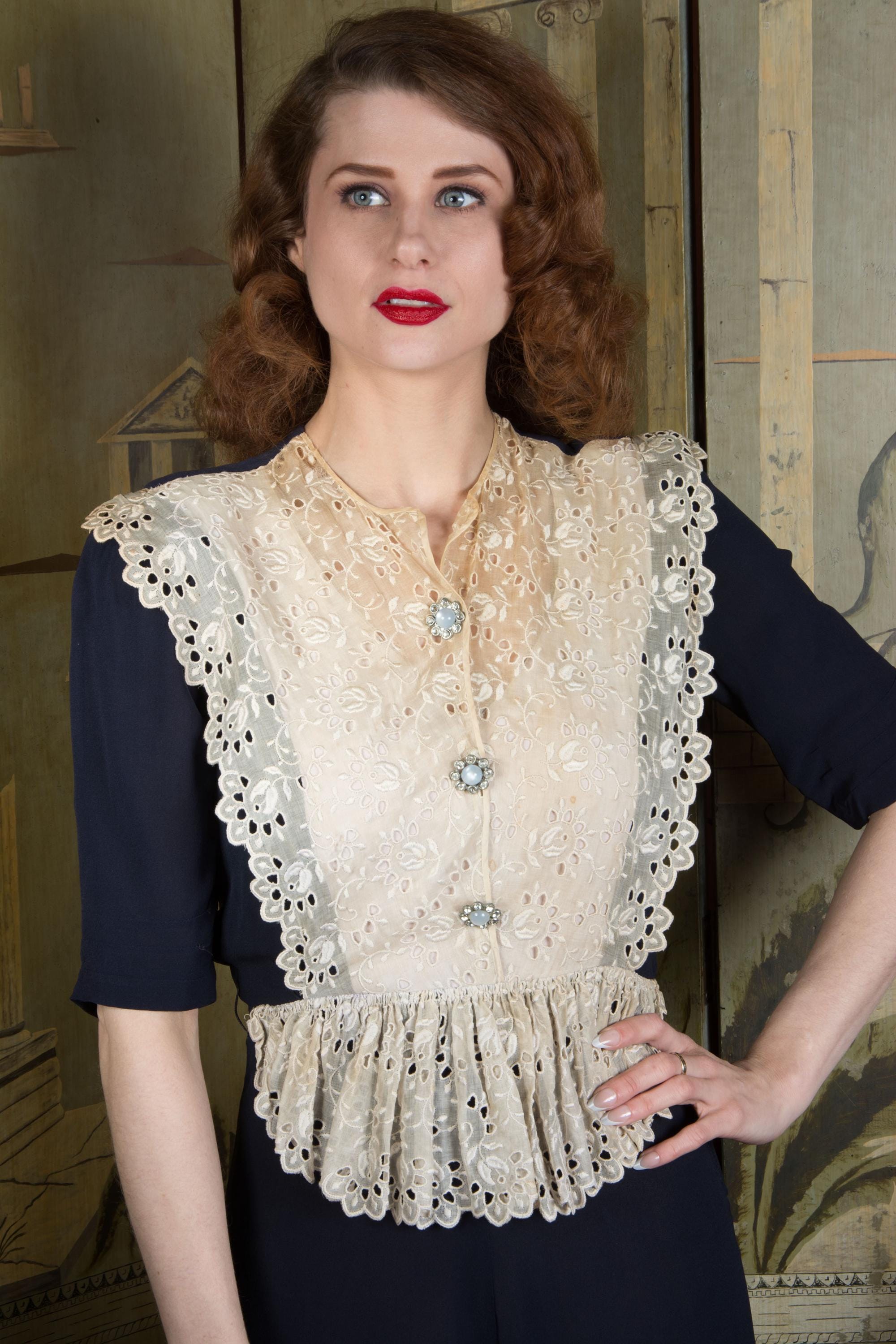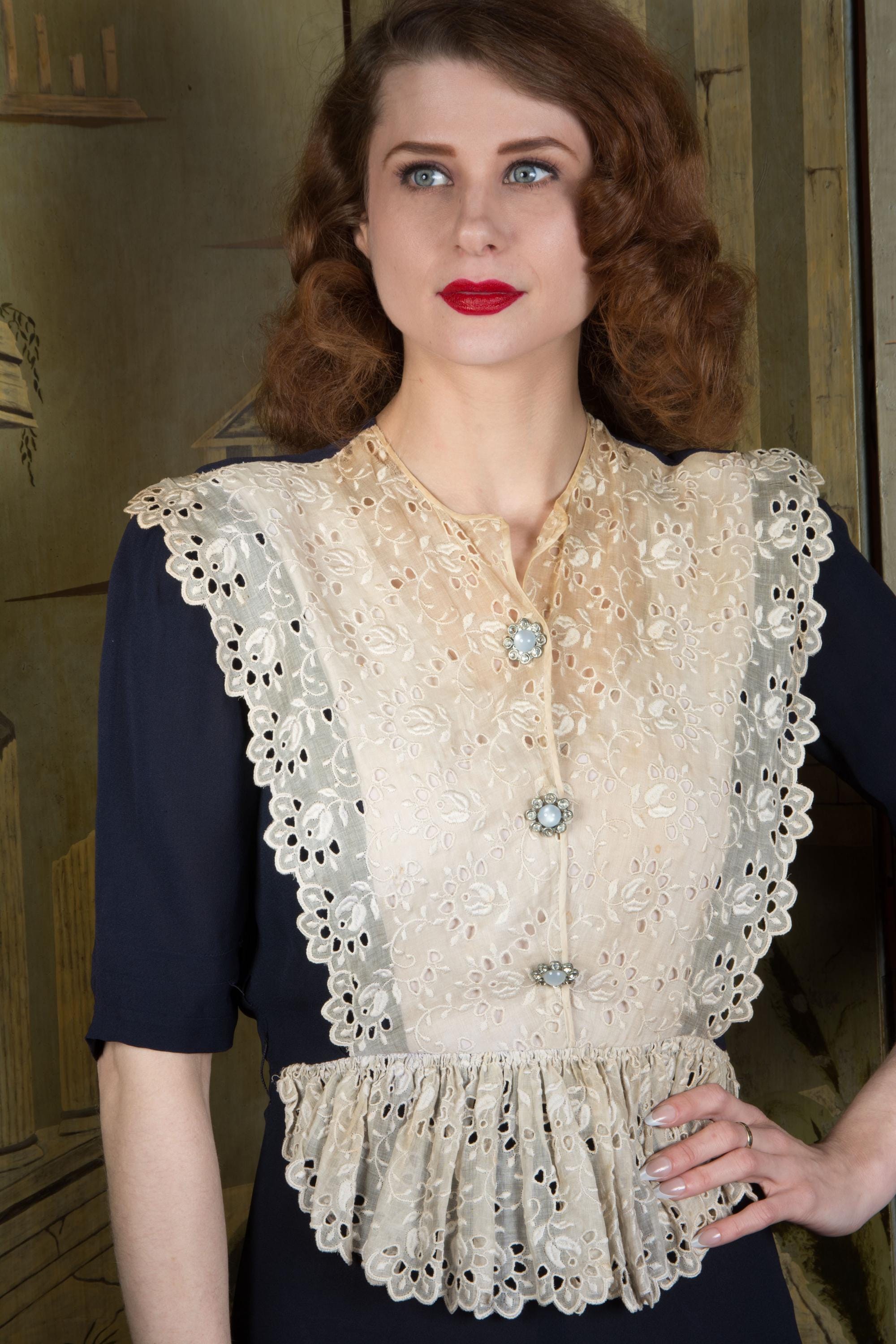 Vintage late day dress from New York Creations is absolutely darling. It has lightly padded puffed sleeve shoulders and a swishy skirt, shaped with four flared gores. The feature of the piece is the eyelet lace done on delicate organza. This is backed in a colorblock inset of ecru. The effect it has is flattering, accenting the width of the shoulders and nipping the waist. The shirred peplum is made of the same cotton organza eyelet lace. The dress closes on the side with a sturdy metal zipper.