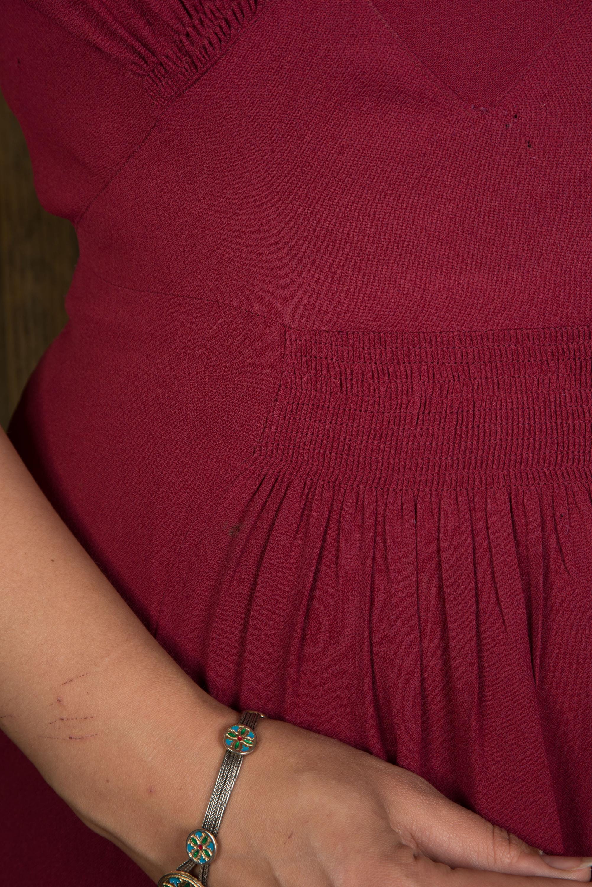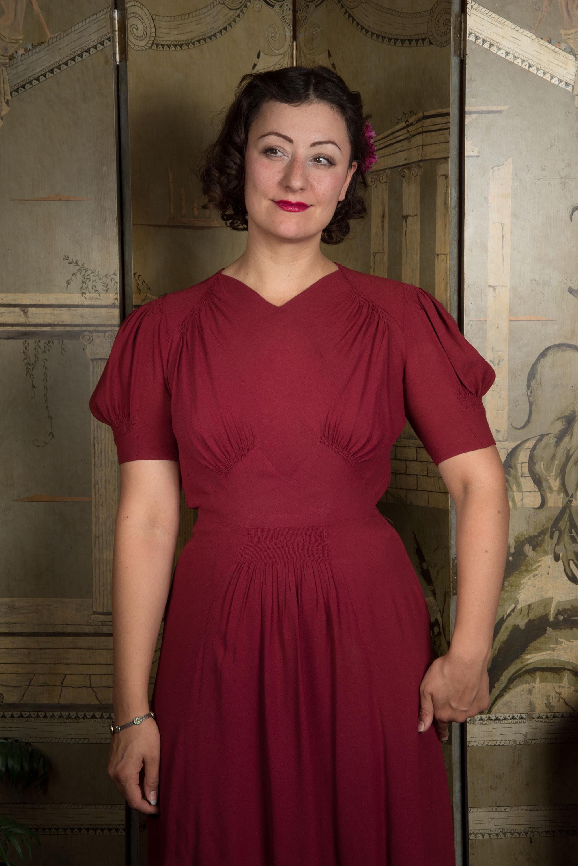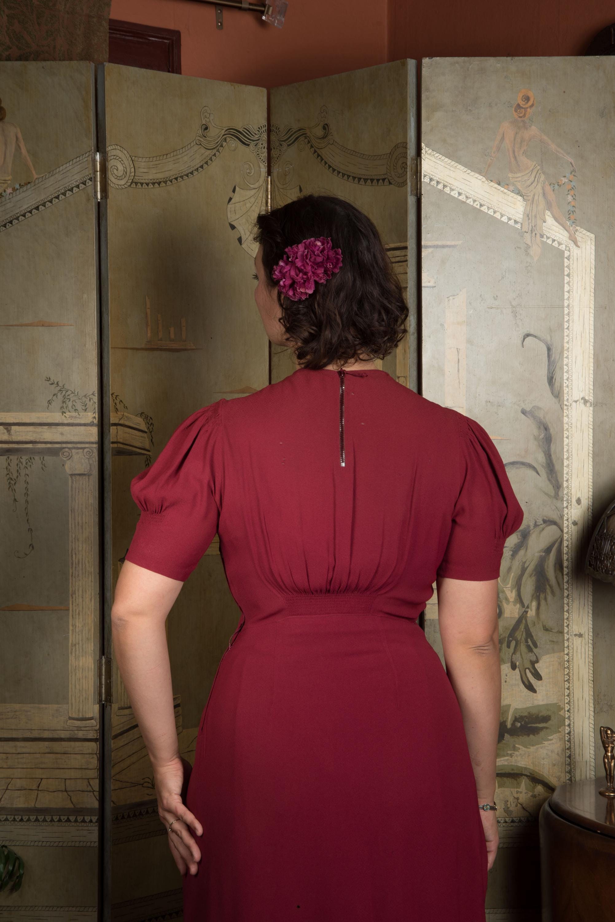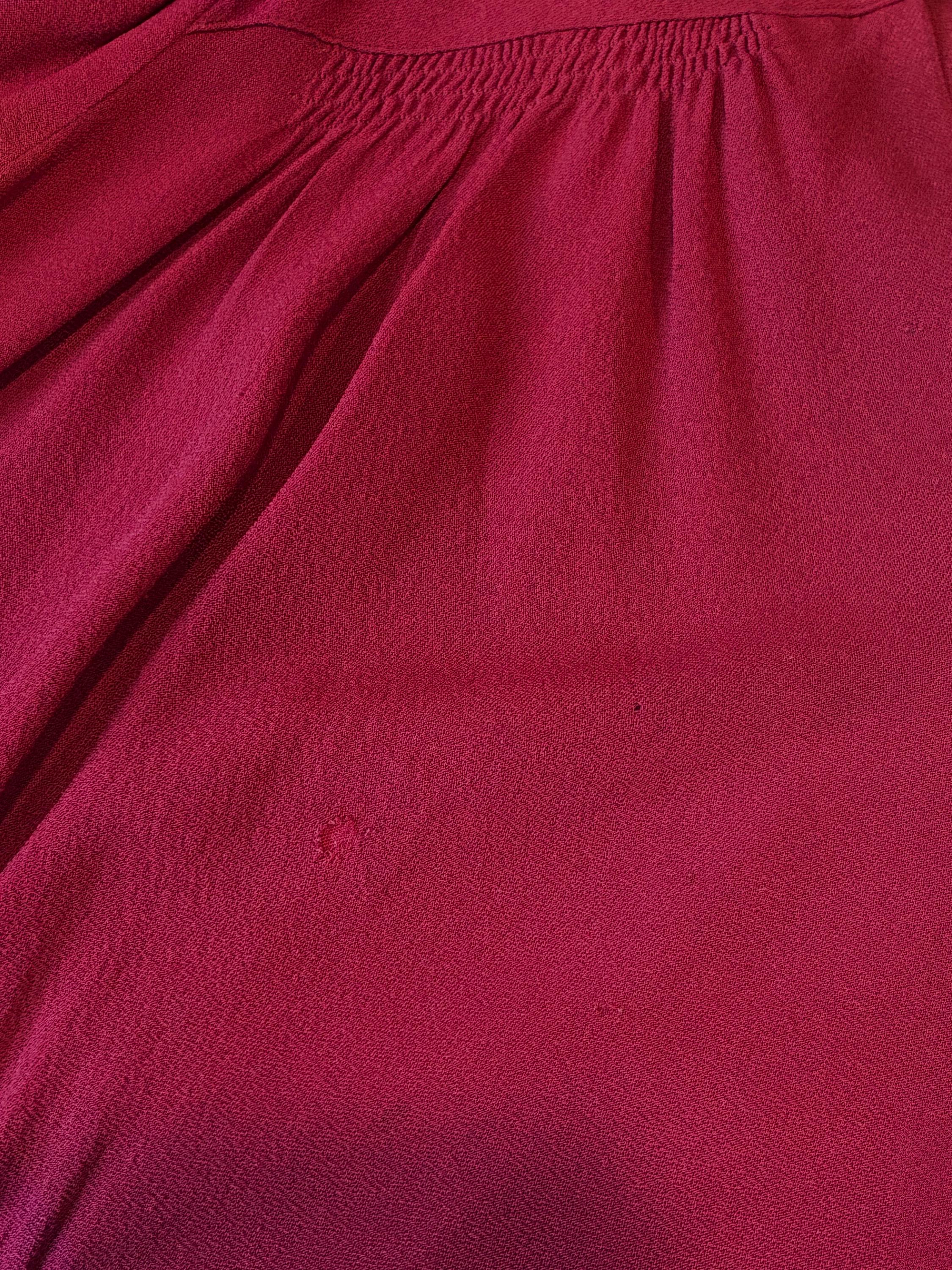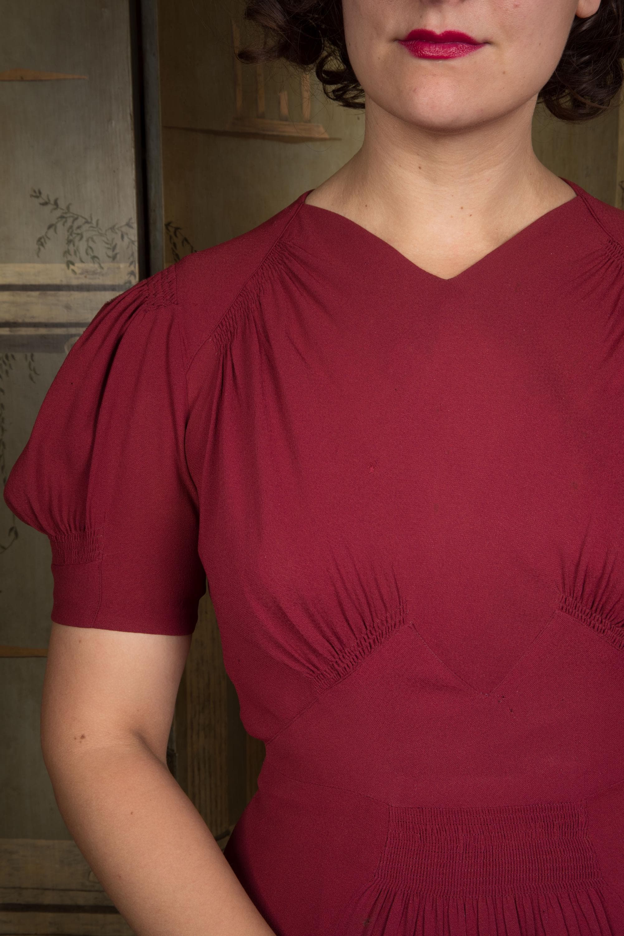 Vintage late 1930s dress is far from perfect, but is perfectly darling. It's a great rusty raspberry hue, that can look a little more brick in some lights, and more berry in others. The rayon crepe is drapey and swishes when you walk. There's SO much shirring - at the top of the puffed sleeves, diagonally above the bust, and at center front of the skirt. This closes on the side with a metal Talon zipper (stamped A8 on the stop, for January 1938) and an early chunky plastic Talon zipper at the back of the neck. Please scroll down to read all the condition notes!