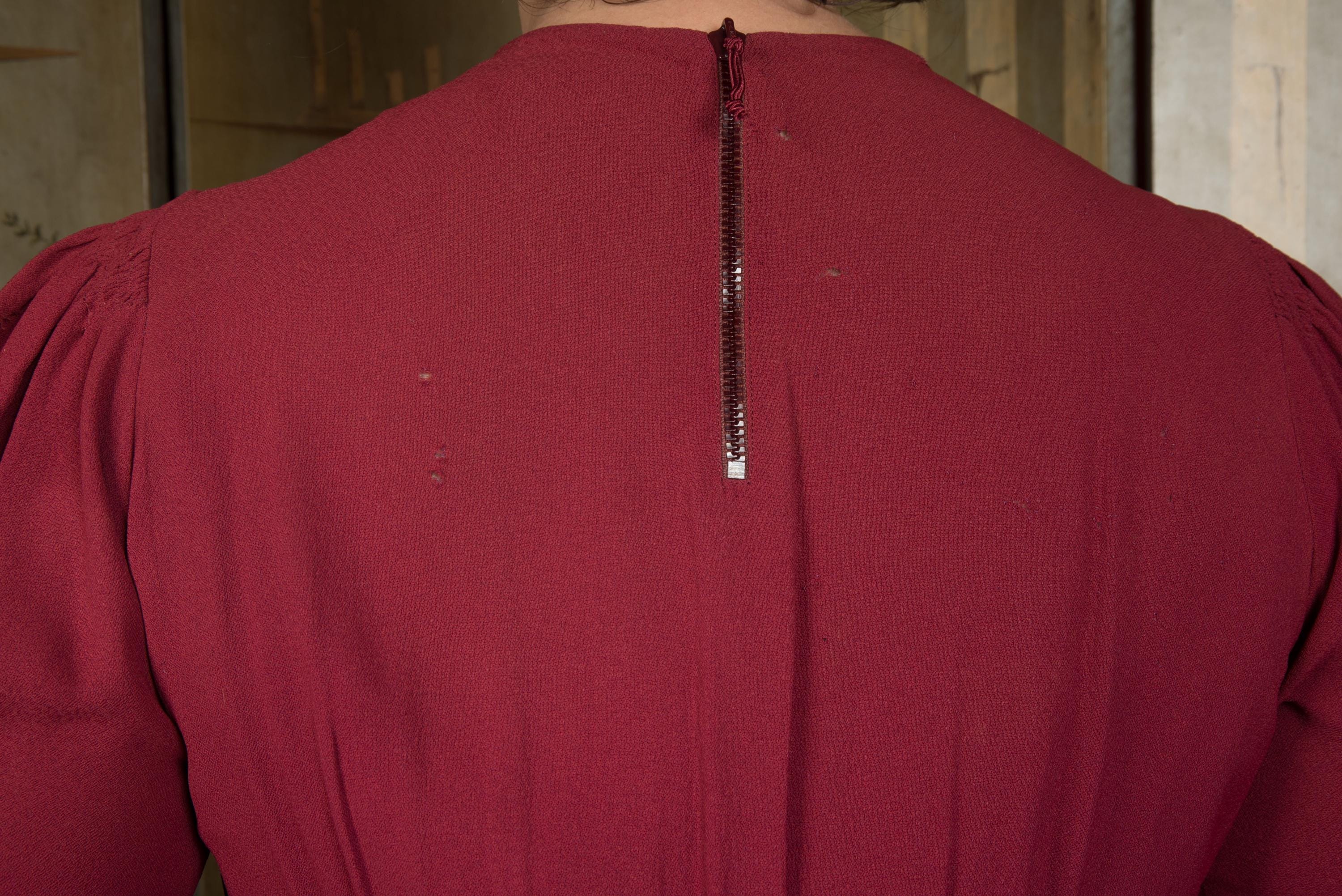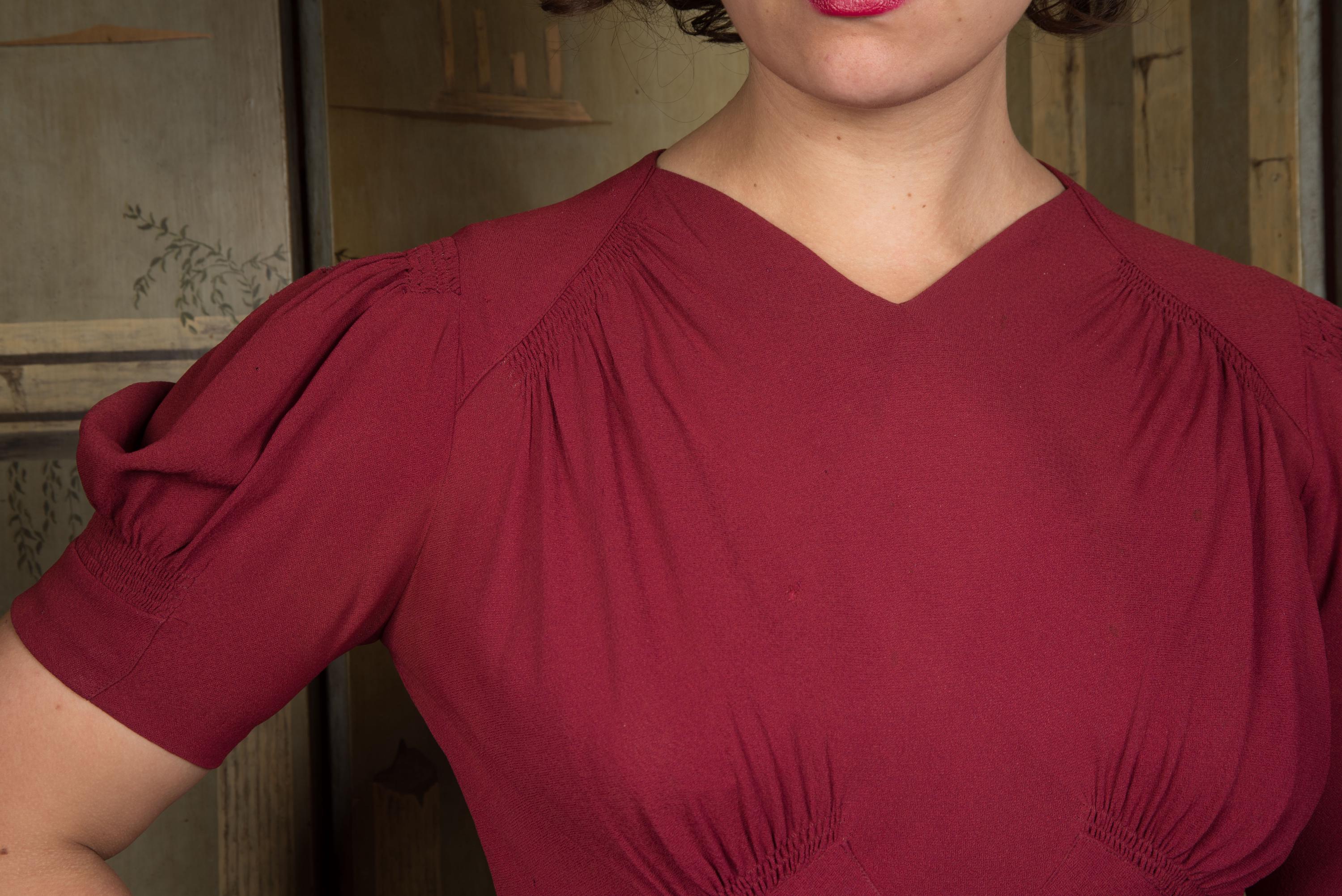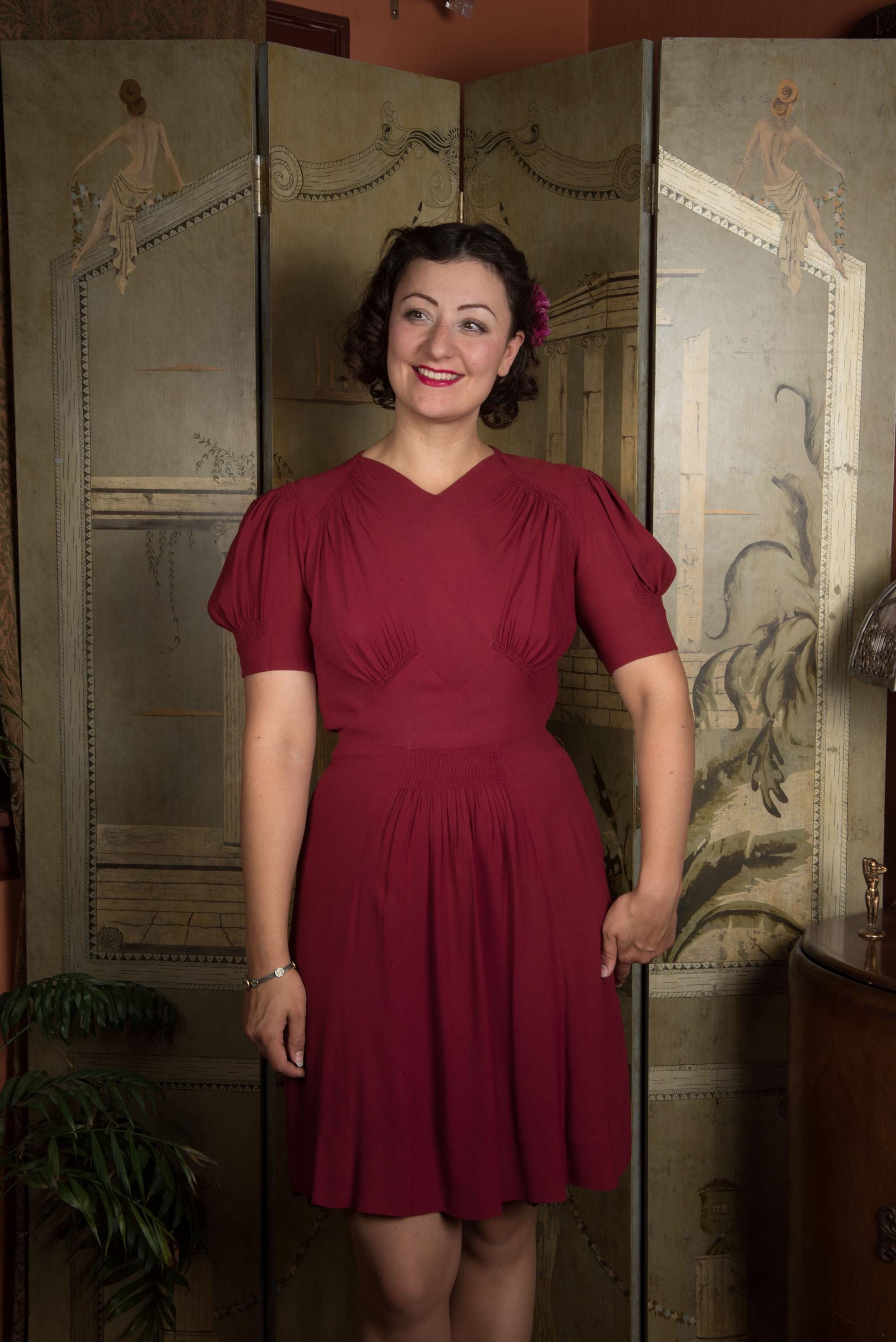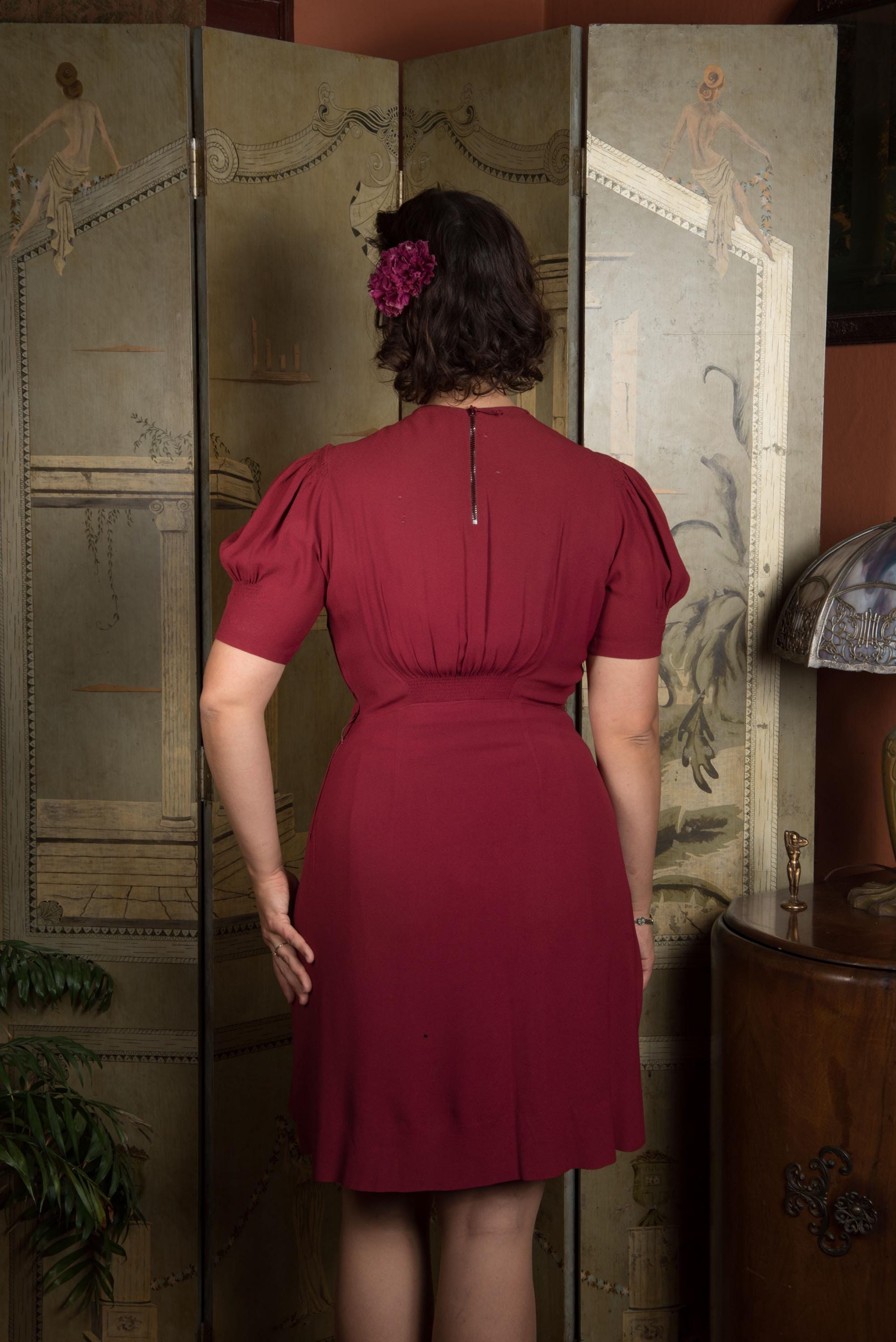 Vintage late 1930s dress is far from perfect, but is perfectly darling. It's a great rusty raspberry hue, that can look a little more brick in some lights, and more berry in others. The rayon crepe is drapey and swishes when you walk. There's SO much shirring - at the top of the puffed sleeves, diagonally above the bust, and at center front of the skirt. This closes on the side with a metal Talon zipper (stamped A8 on the stop, for January 1938) and an early chunky plastic Talon zipper at the back of the neck. Please scroll down to read all the condition notes!