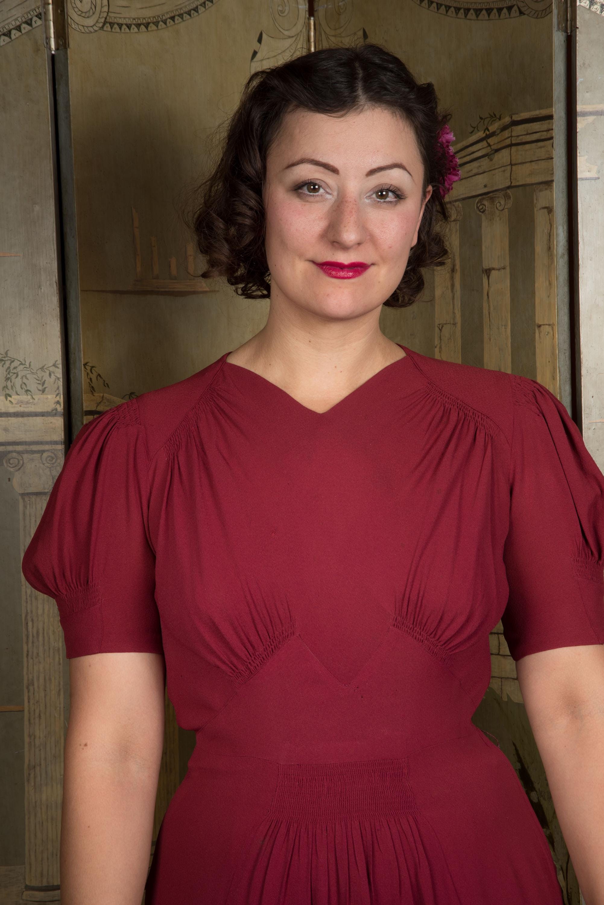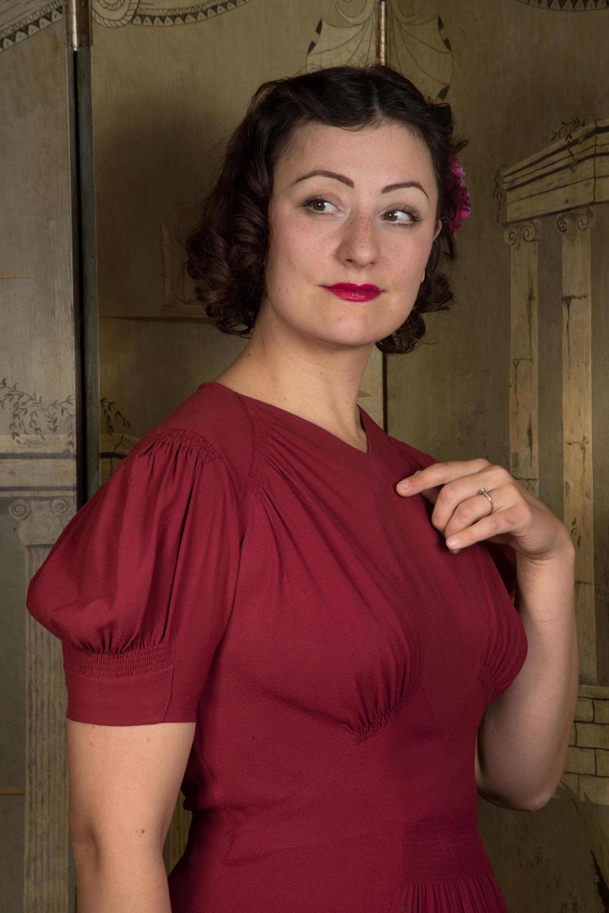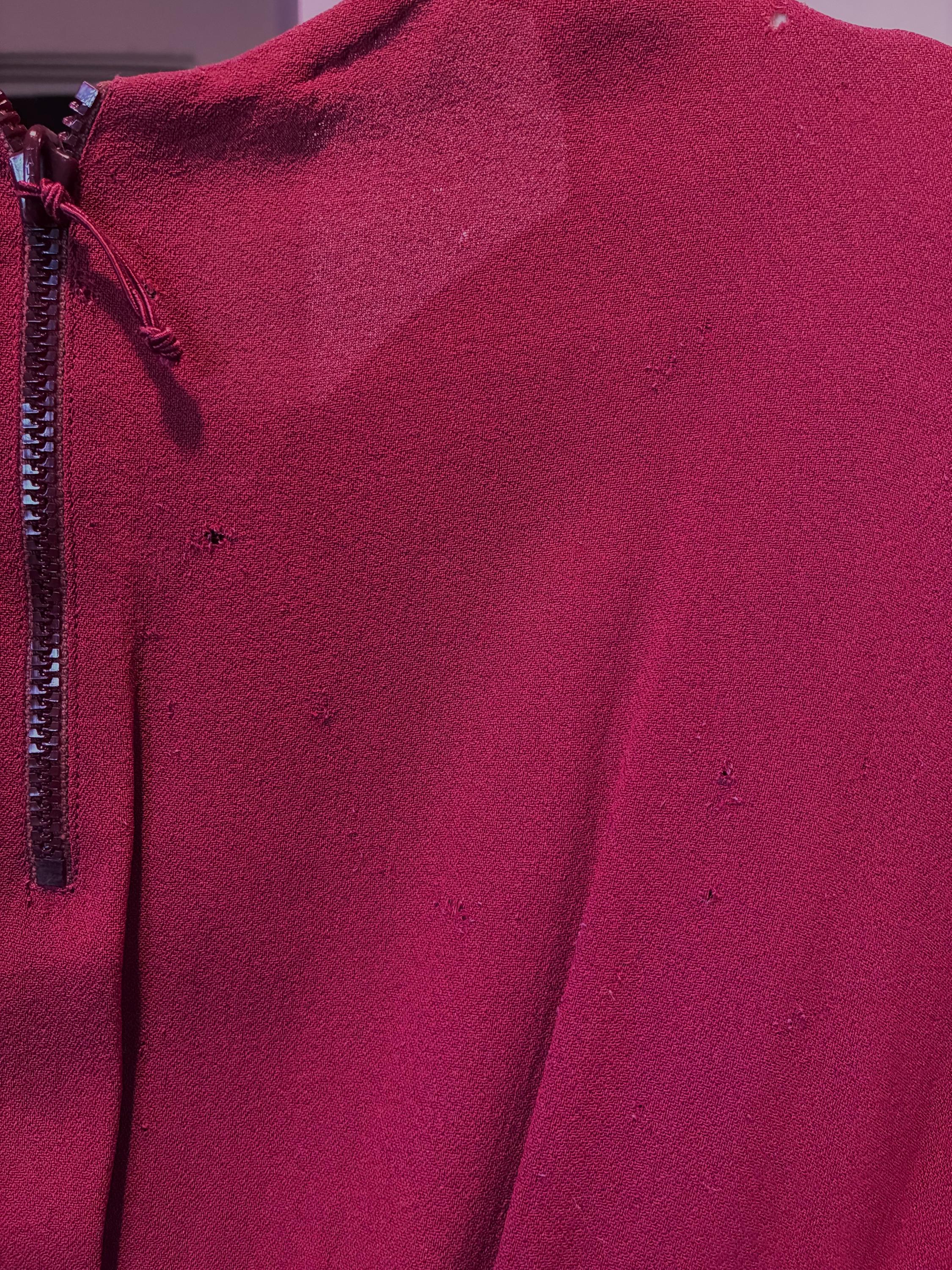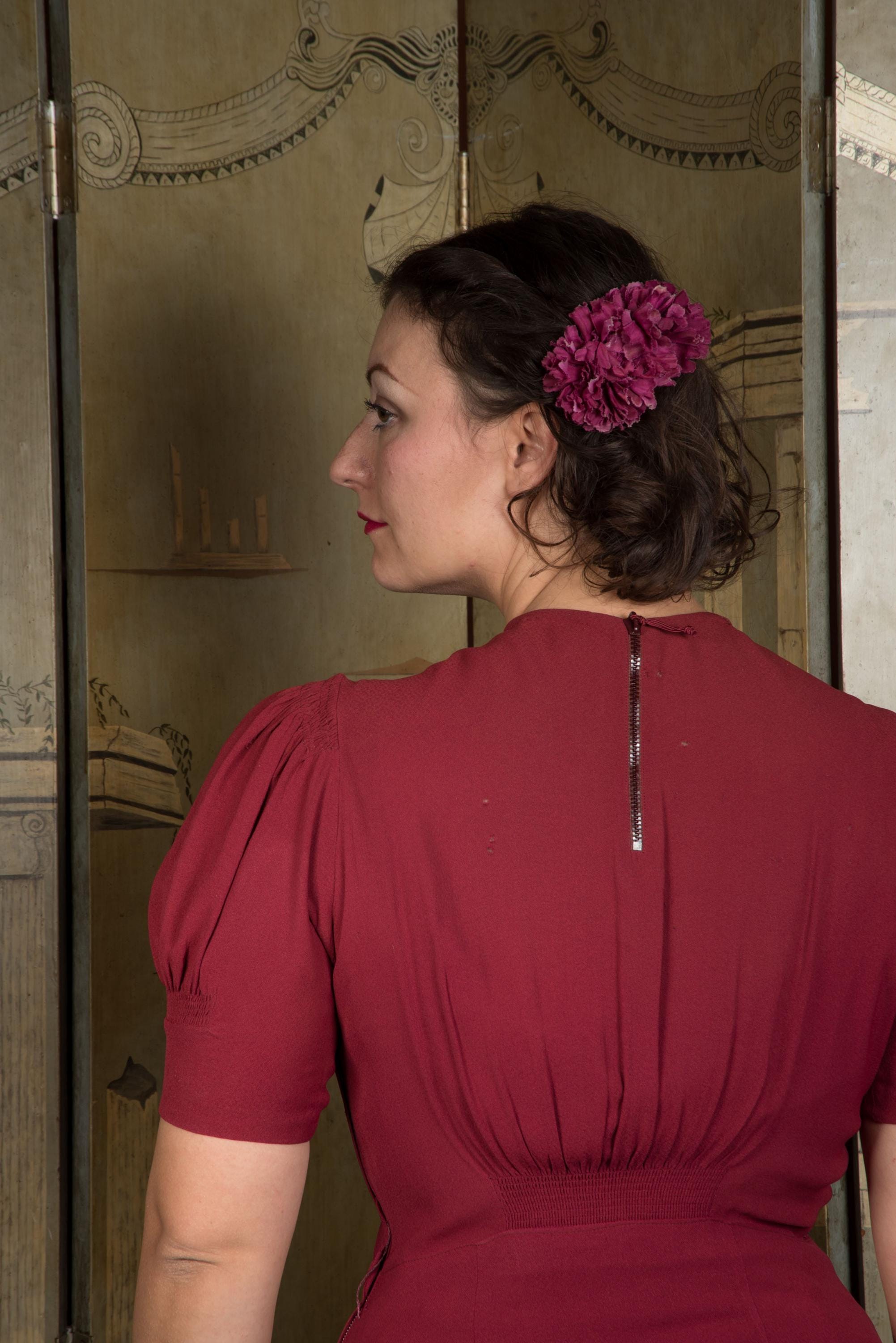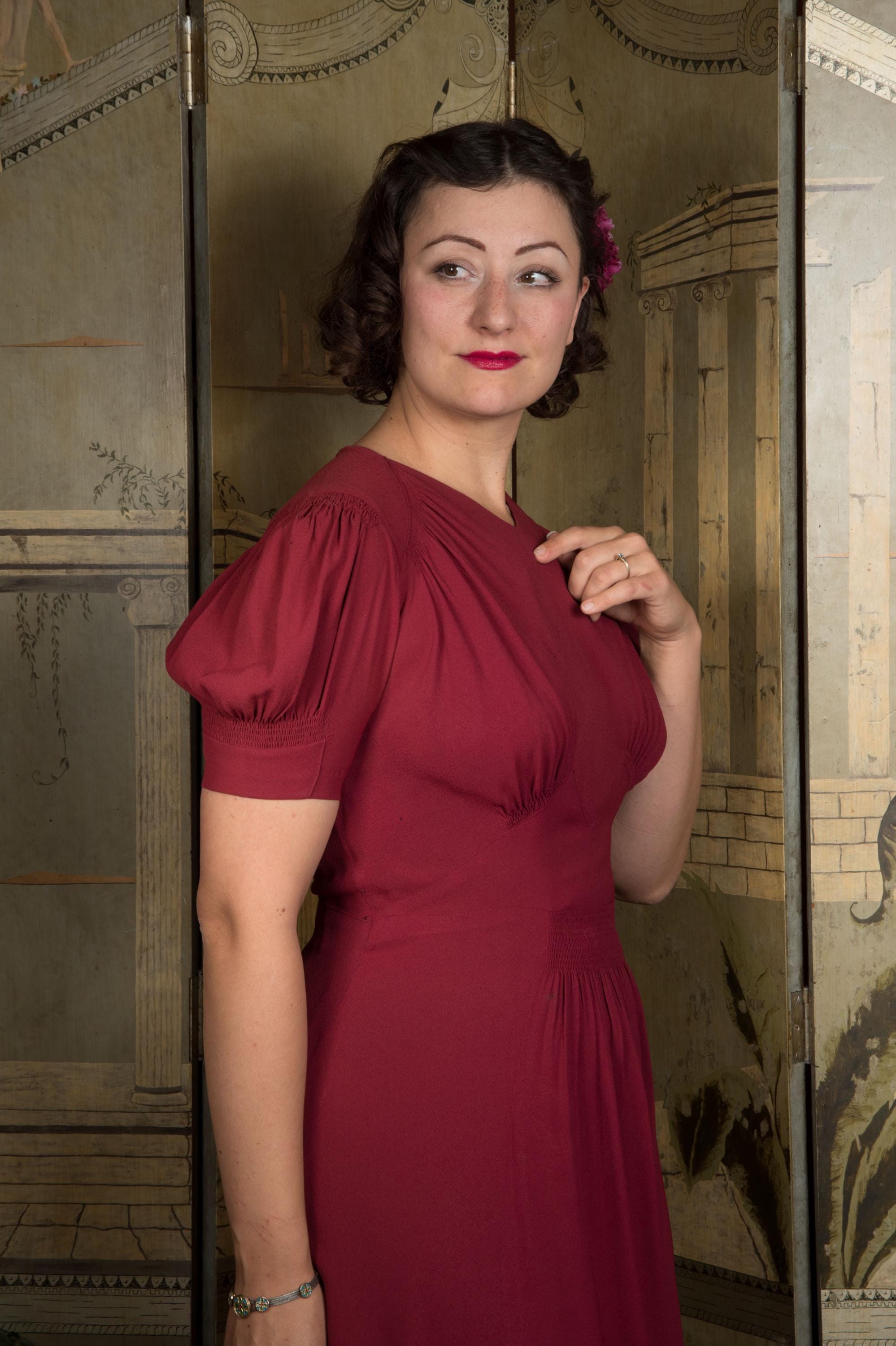 Vintage late 1930s dress is far from perfect, but is perfectly darling. It's a great rusty raspberry hue, that can look a little more brick in some lights, and more berry in others. The rayon crepe is drapey and swishes when you walk. There's SO much shirring - at the top of the puffed sleeves, diagonally above the bust, and at center front of the skirt. This closes on the side with a metal Talon zipper (stamped A8 on the stop, for January 1938) and an early chunky plastic Talon zipper at the back of the neck. Please scroll down to read all the condition notes!