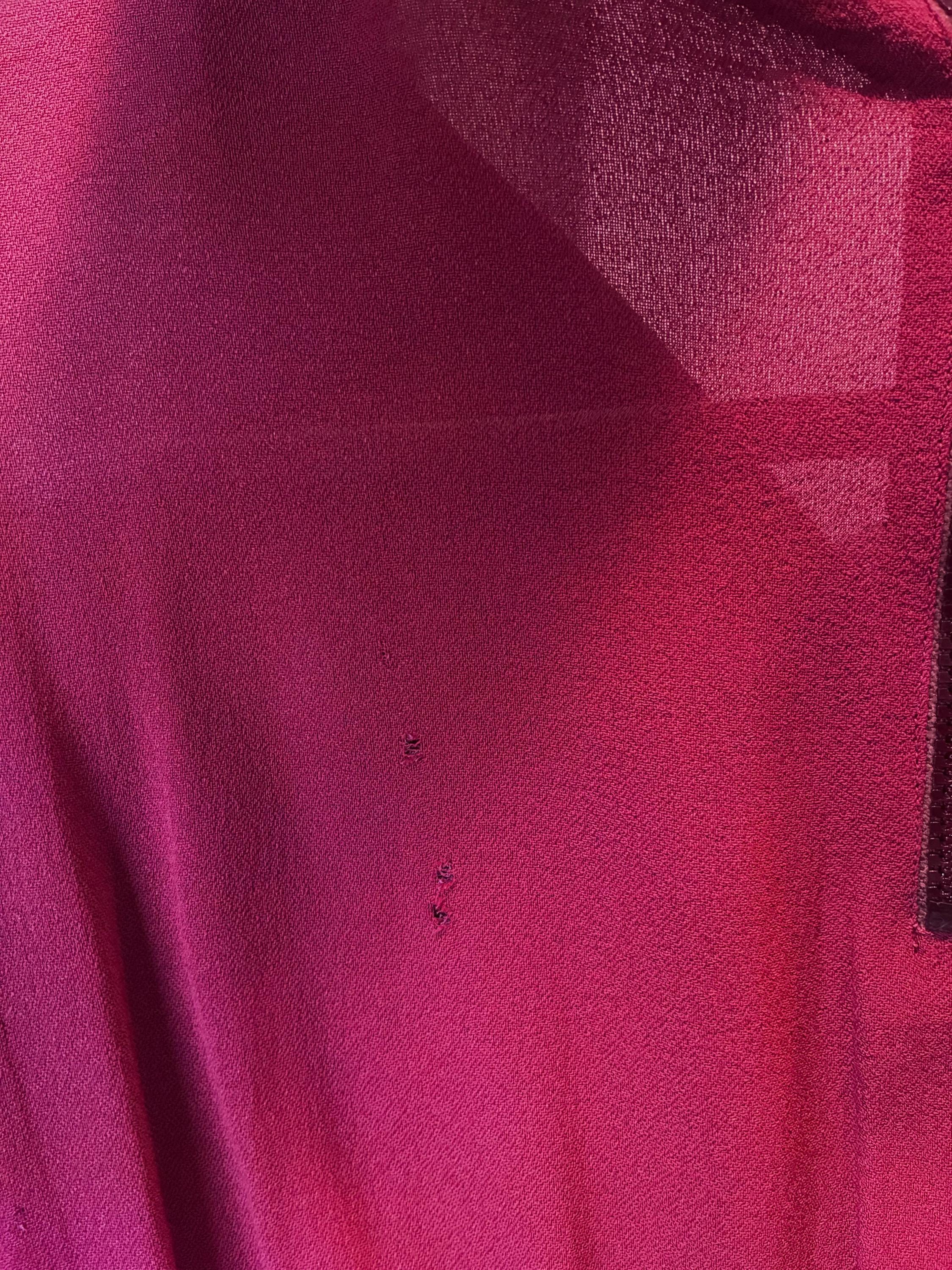 This dress has been dry cleaned. It is very as is, but also very wearable. This survived being used as a costume rental and despite the flaws, its sturdier than I would expect. This has pinholes and slightly larger pinhead holes, either from moths or snags that opened up over time. Most of these are at the upper back and top right shoulder, but there's a few on the waistband, and some scattered in the skirt, included a 1/4" hole at the lower back left. There is a larger hole at the front right hem, possibly why they took the hem up. There are three spots in the draping on the left bust, and mild fade at the underarms. There is 1/2" repair on the right side of the neck. The pull has been replaced on the early talon zipper at the back of the neck. While I've done my best to list all the flaws, this is an as-is dress with multiple issues, and it's possible I've missed something small. This is best for a understanding collector who doesn't mind wounded birds.