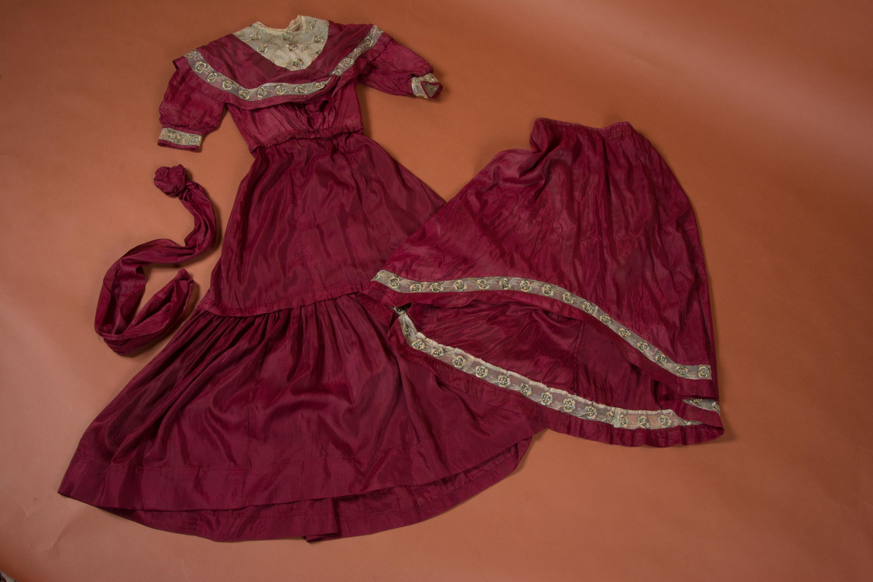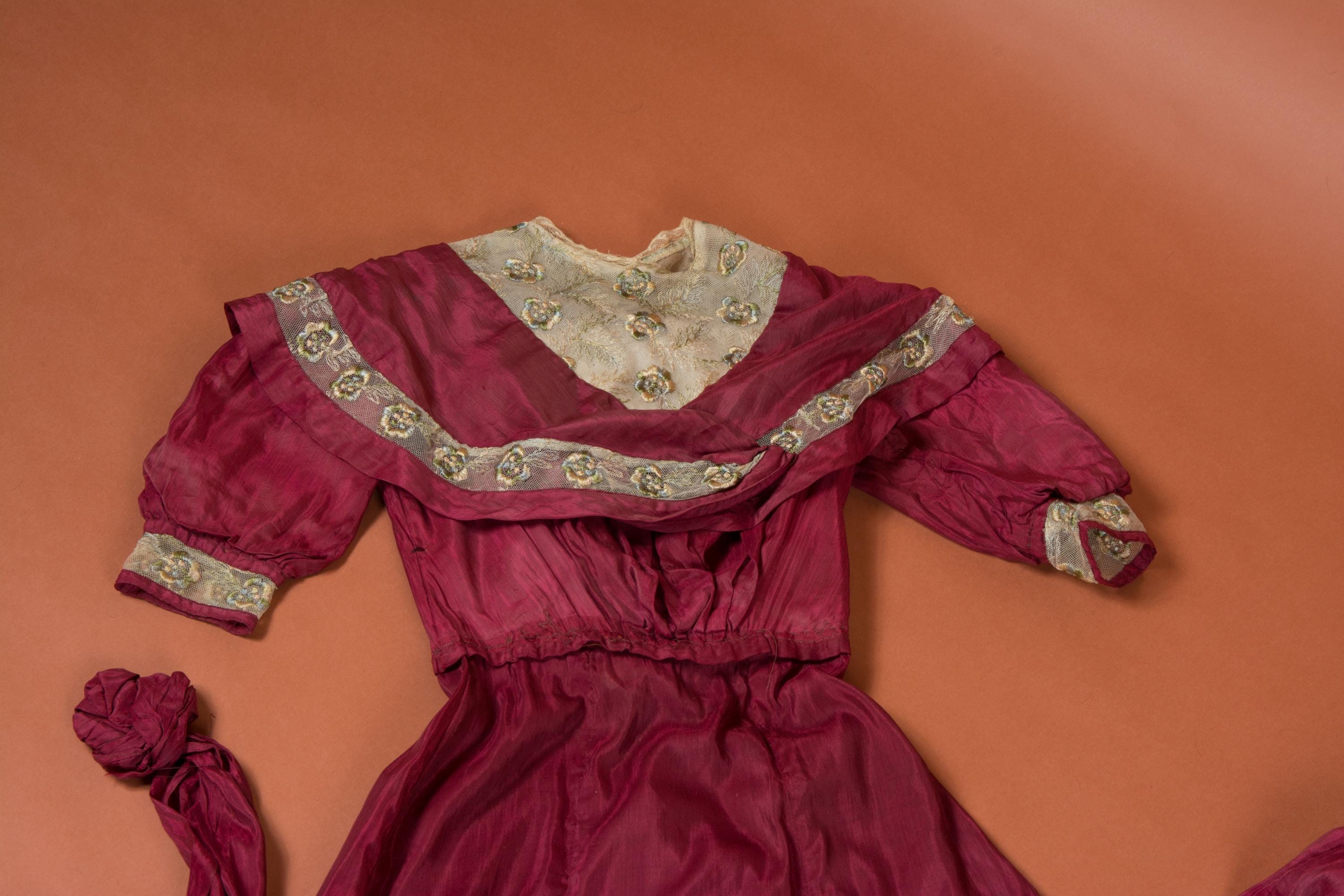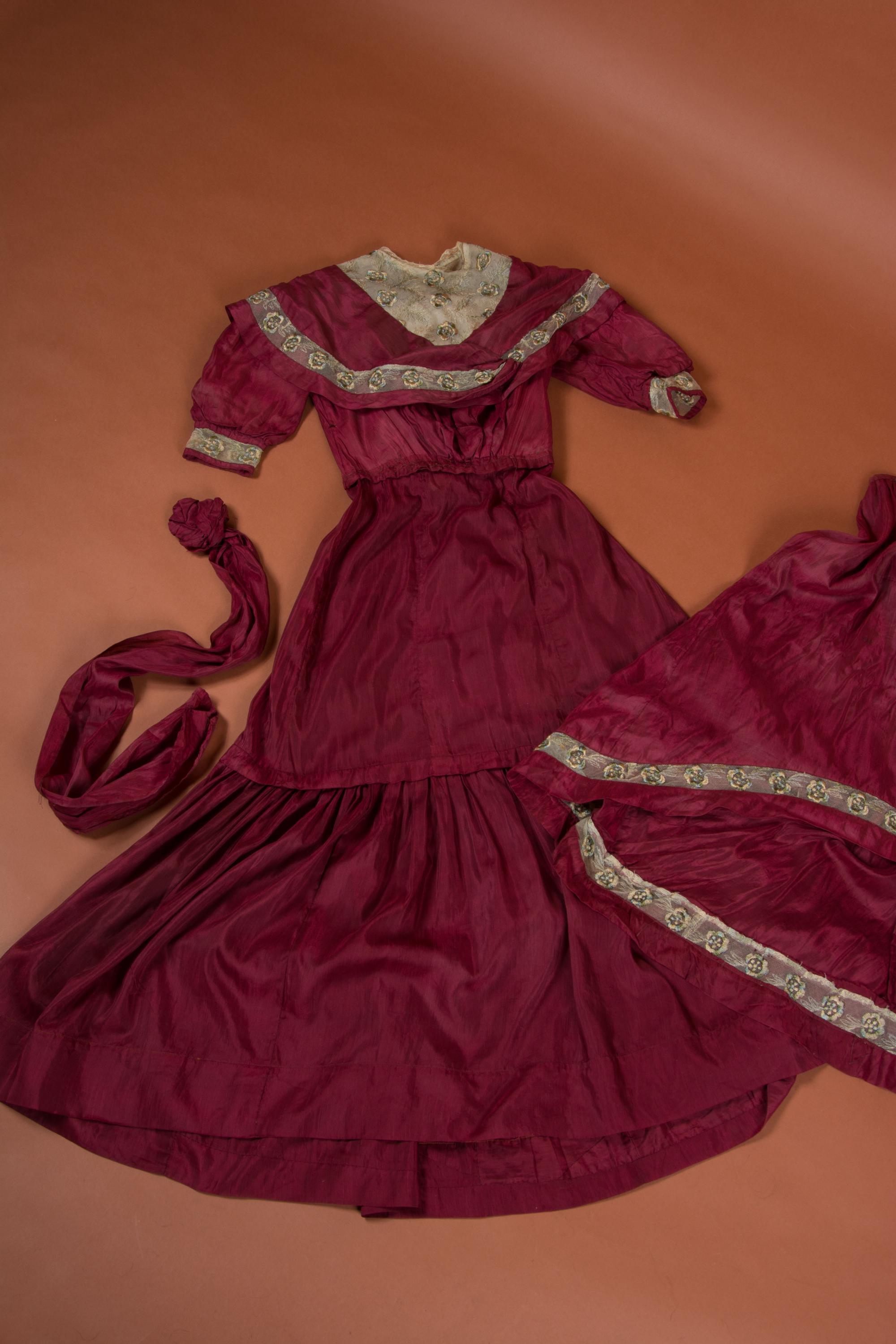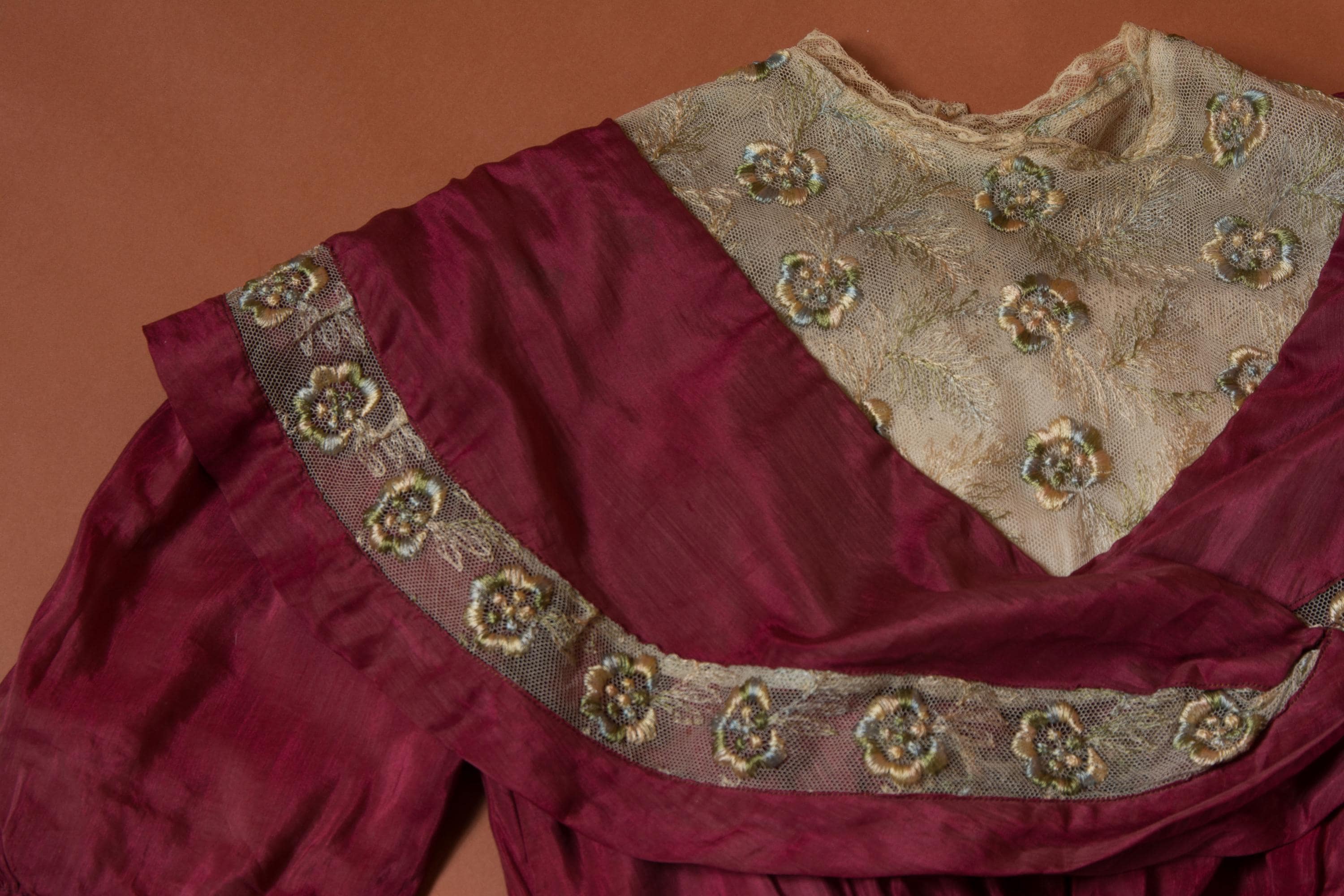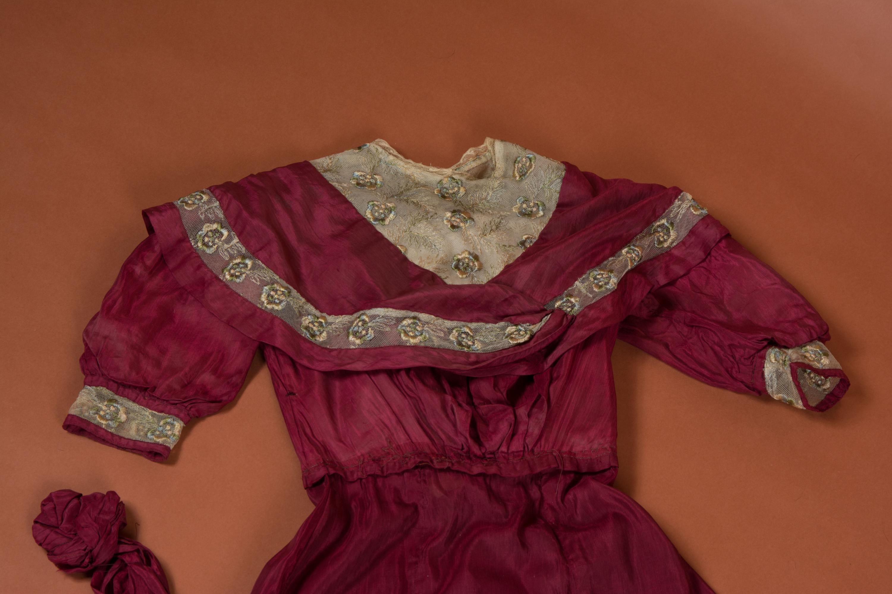 A lustrous 1900s dress of a light, lustrous burgundy silk with pastel embroidered net trim. This has an overskirt and matching sash. The neckline is high, and the sleeves are short and puffed. Light as air textil, beautifully gathered by a home sewist.