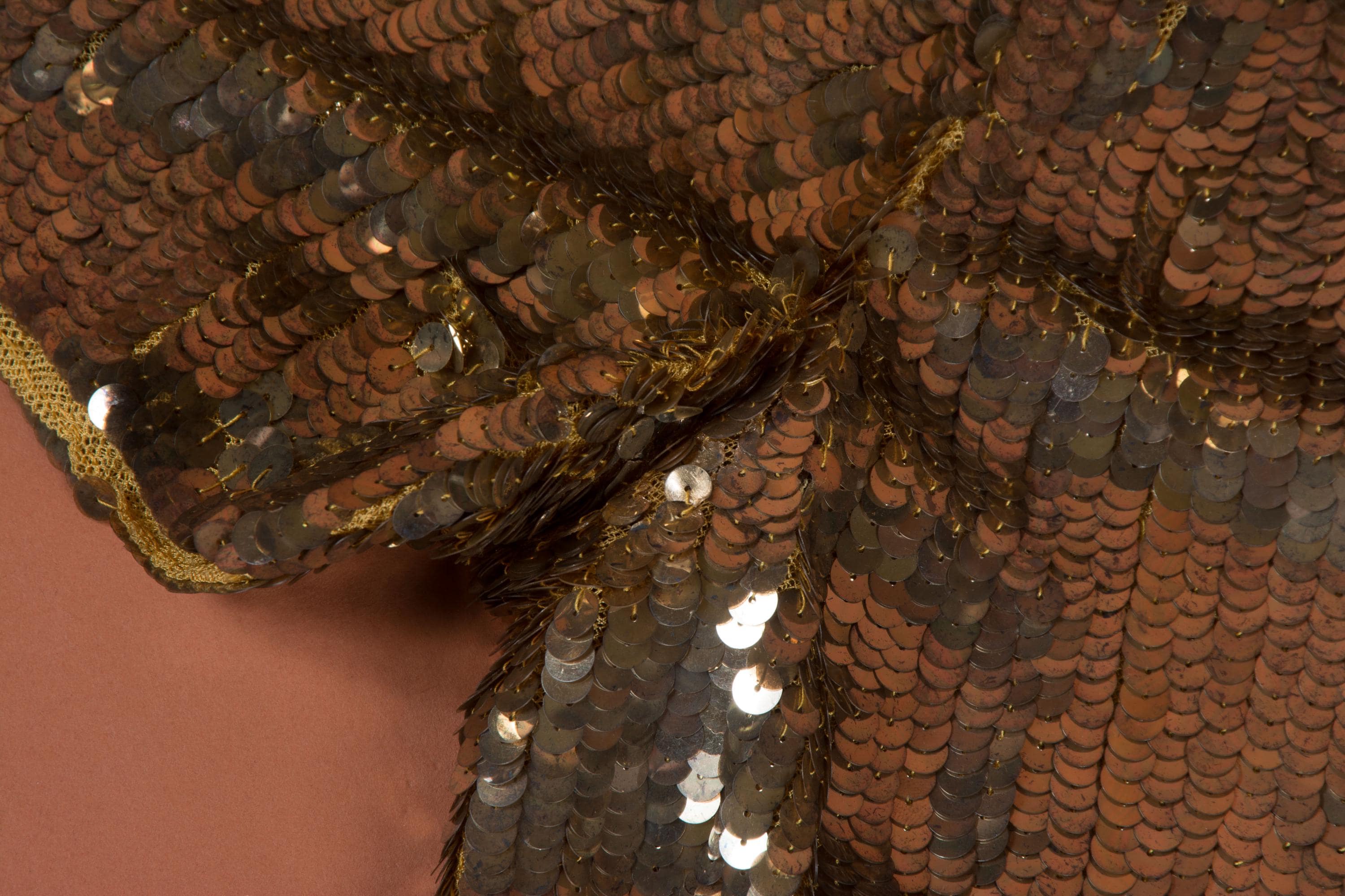 The gelatin sequins at the underarms have fused together from body moisture. Sequins are loose on the top shoulders and some are missing there. There is 1" missing at the lower back right side, and just a couple other scattered missing ones. There's some old repairs on the interior.