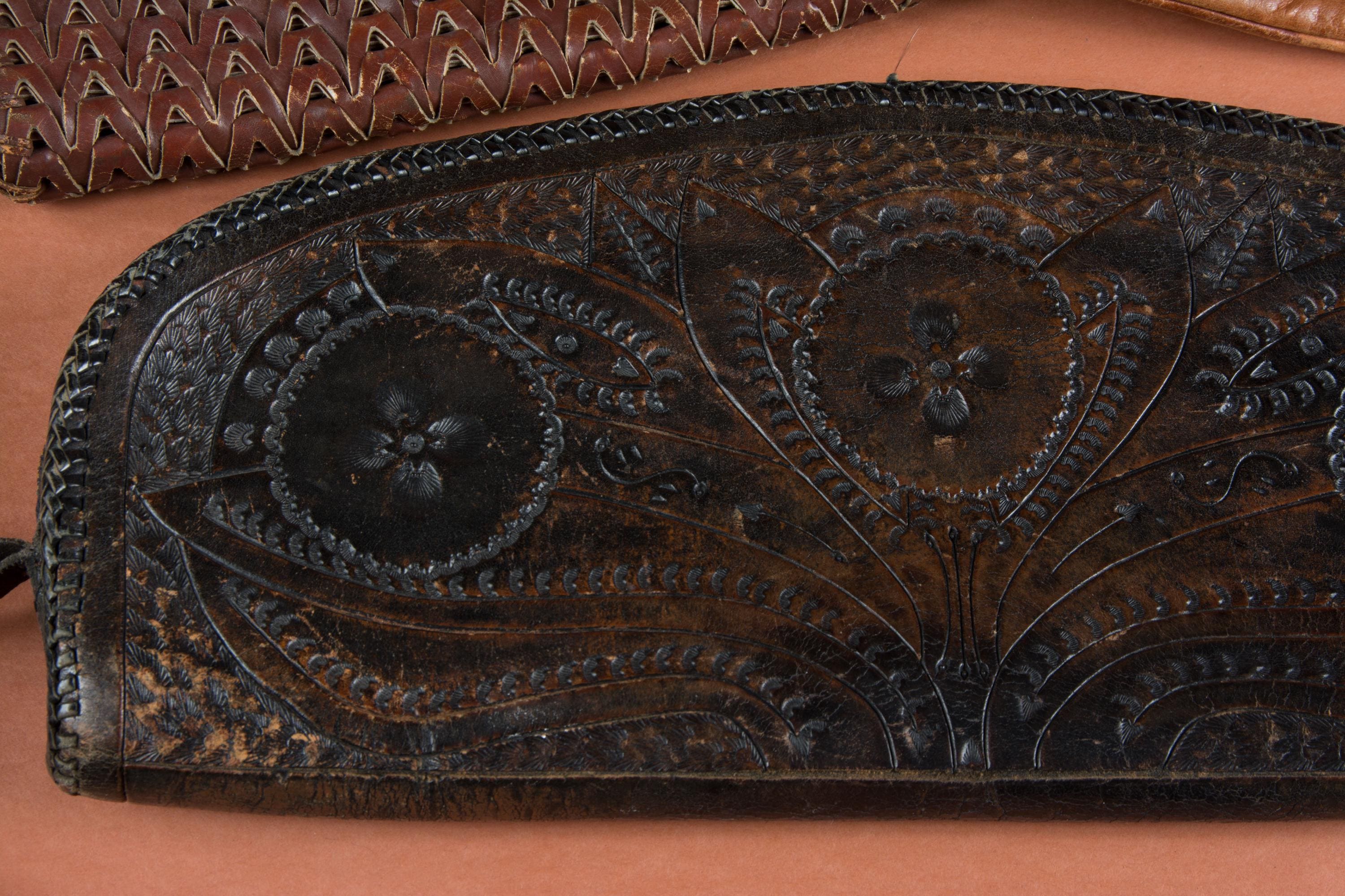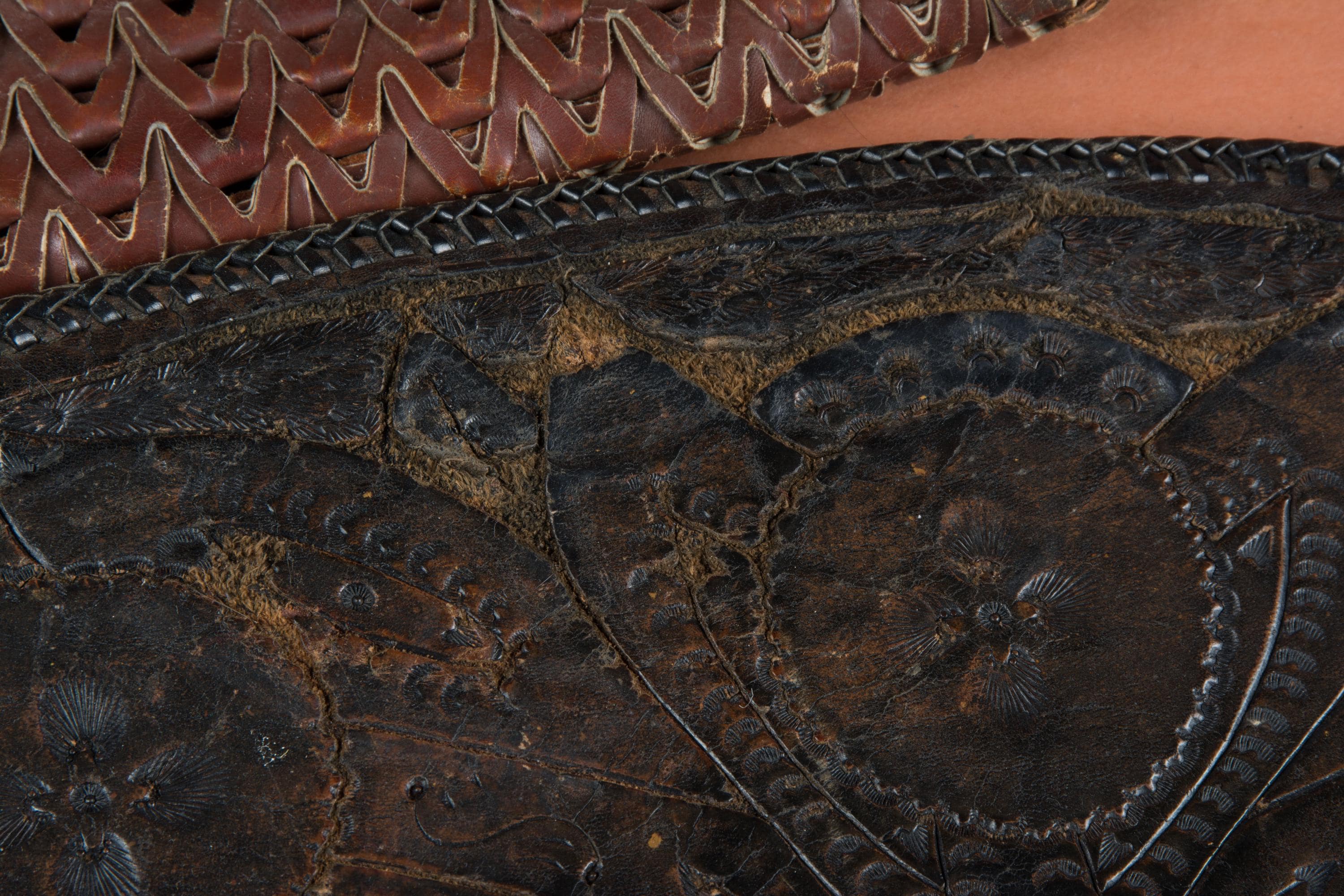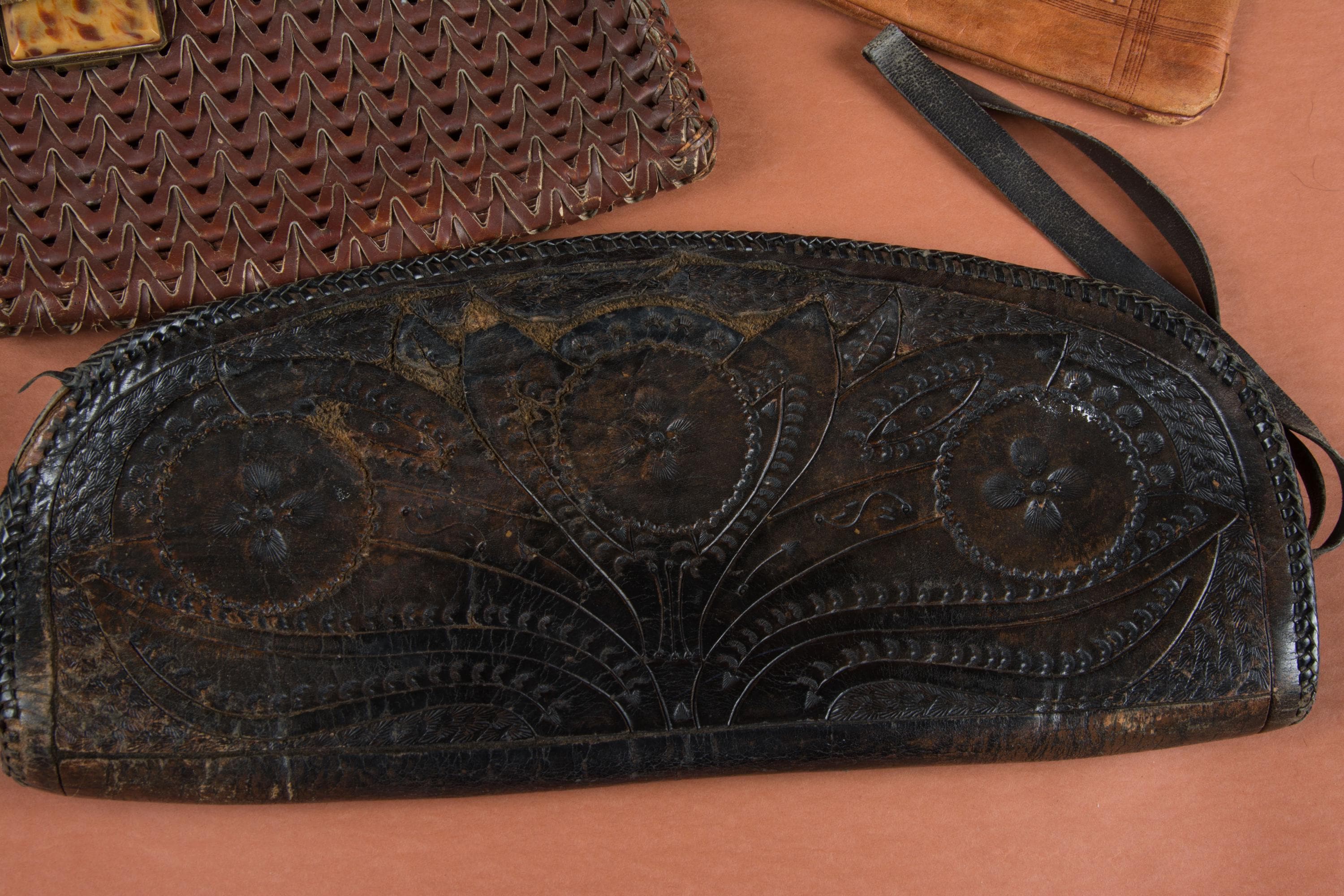 3. 1930s/40s Tooled Leather handbag. 15"x7"! Has rubbing and wear to the black finishe with some natural leather showing through. Some of the leather wrap edging is missing on the right side in two approximately 1"ish inch section. There is some dryness n the deeper part of the design on one side, causing peeling, and then some surface wear/rubbing/cracks throughout. Zipper works and the leather interior is nice.