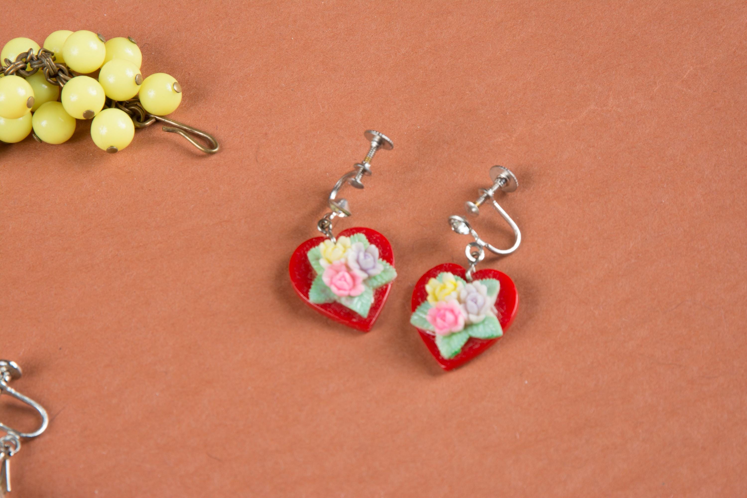 4. Three pairs of screw back earrings - red plastic, reverse carved lucite, and "cake flower" plastic hearts