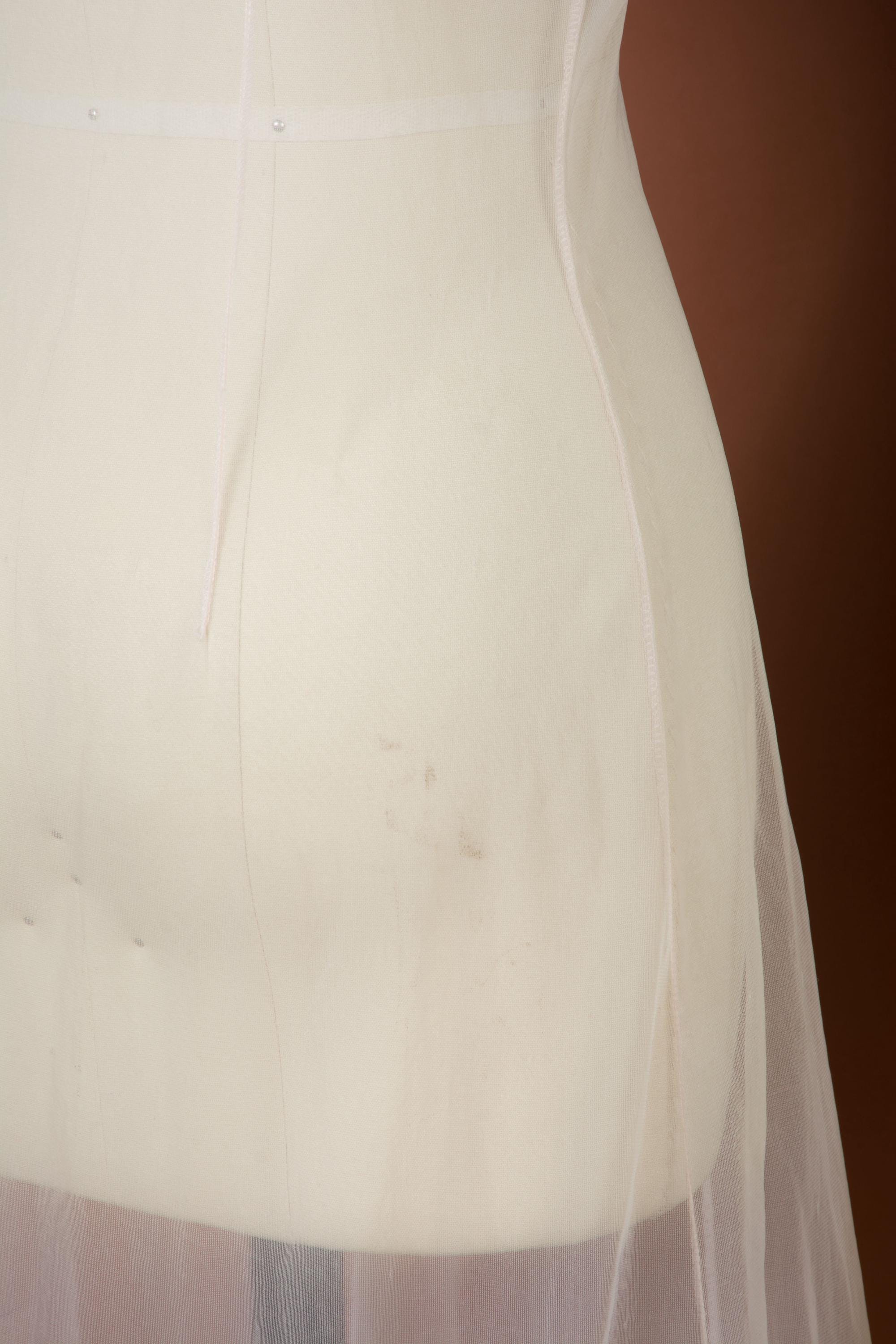There's a couple places where the chiffon trim is separating away from the seam. There's little snags in the fine nylon throughout. Some greyish smudging on the back right hips