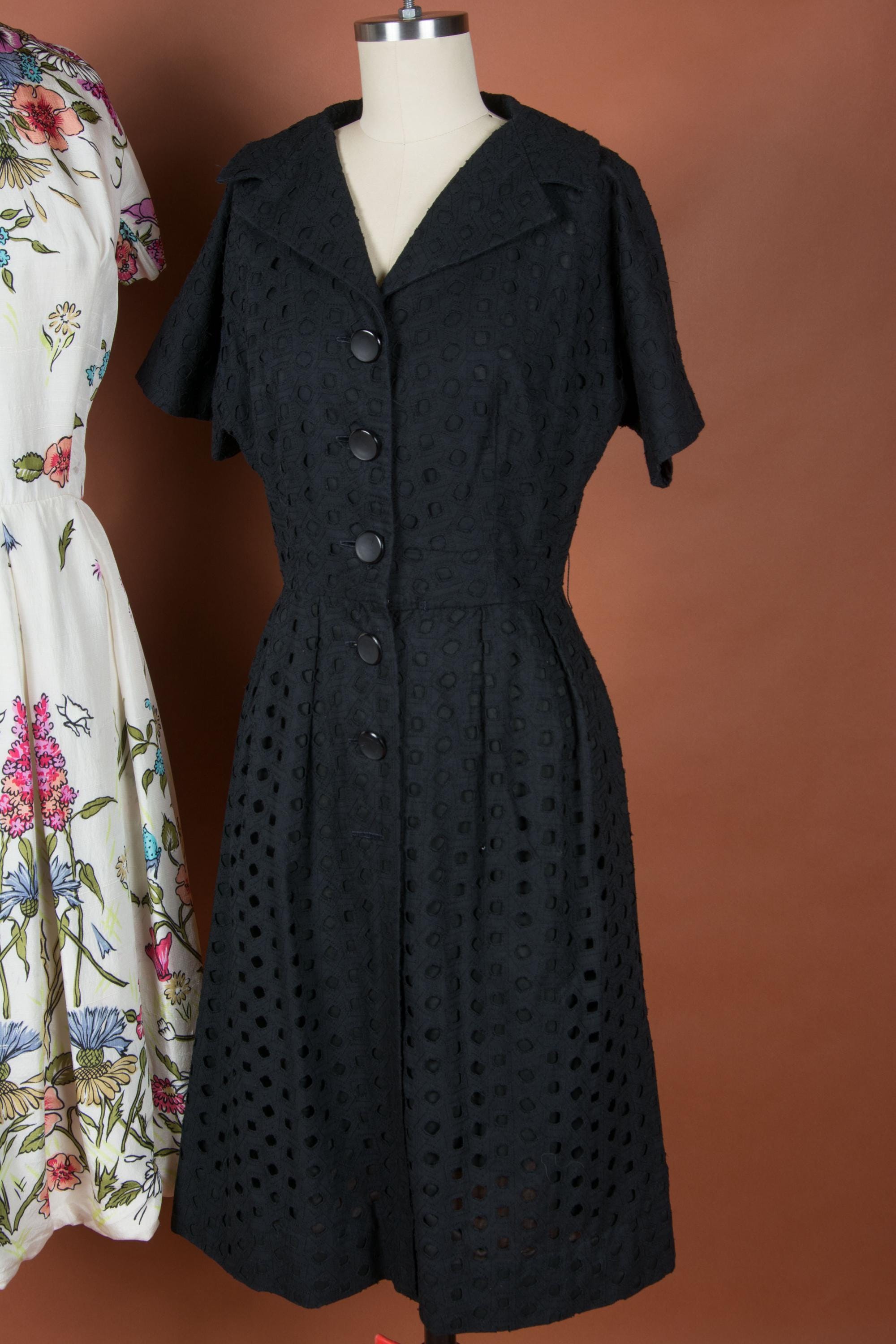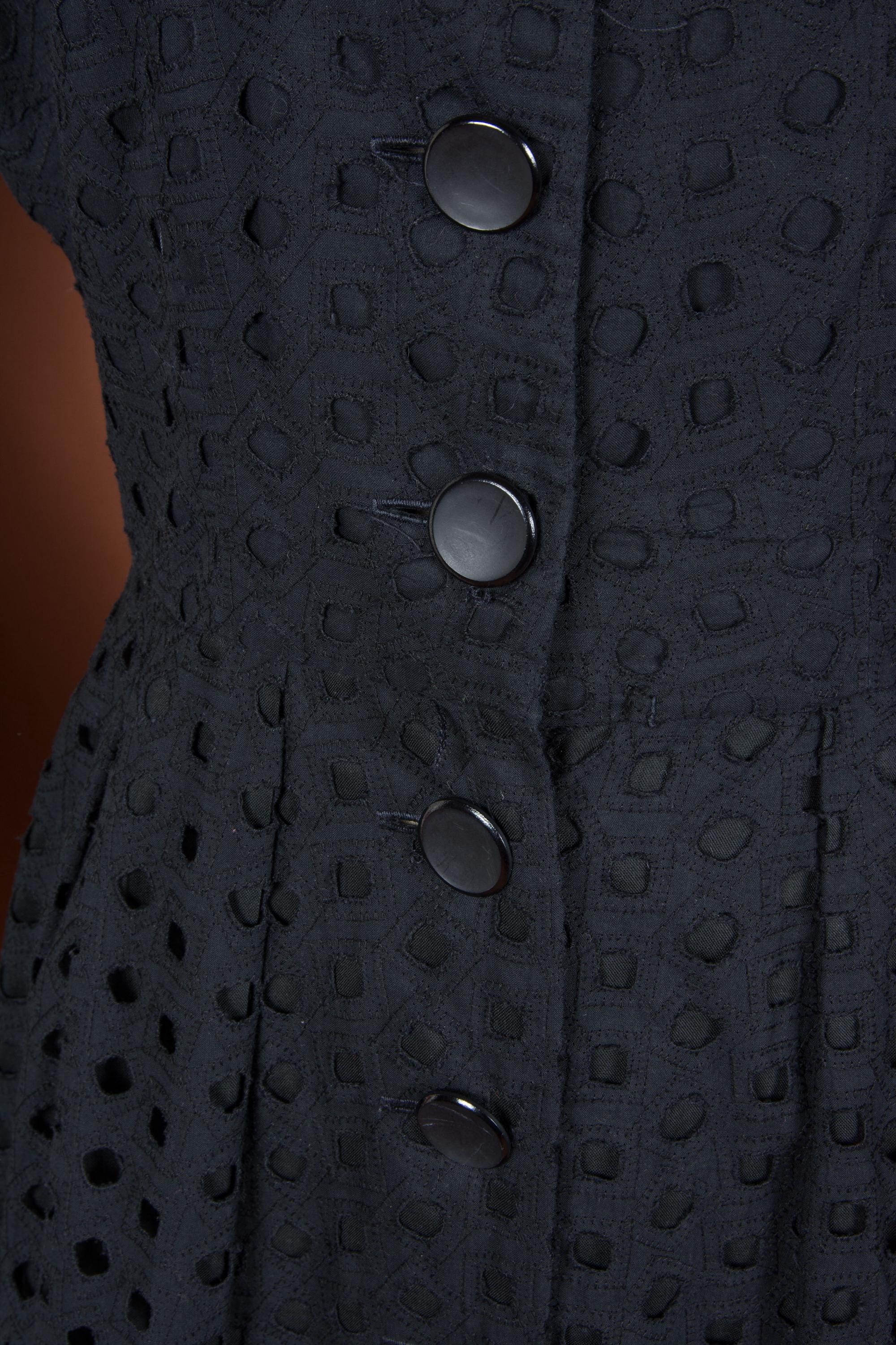 Sturdy black cotton lace with early cotton blend lining, pleated skirt. Great 1960s daywear.