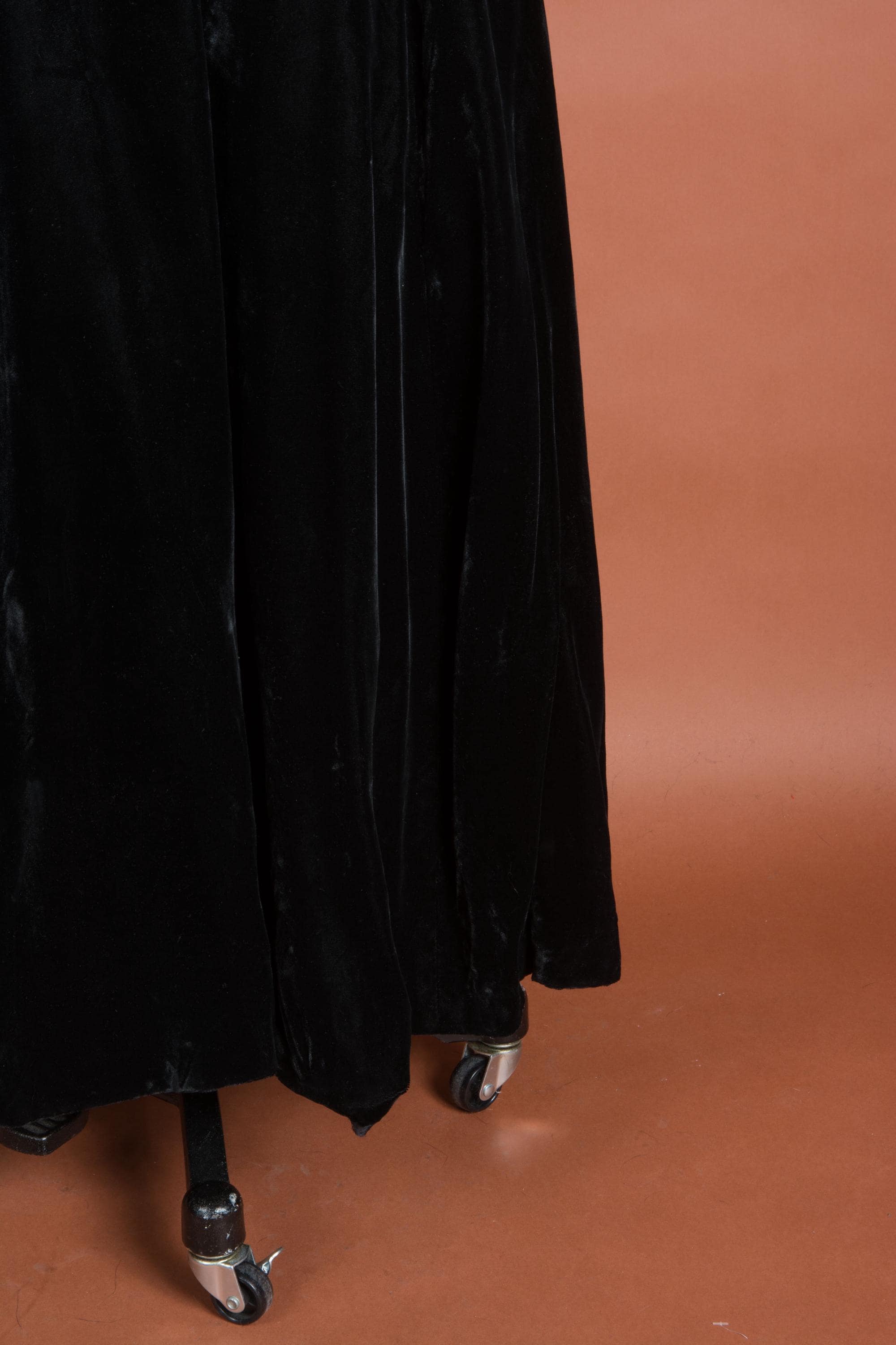The velvet has some seating from storage. The underskirts are a bit bunchy and should be steamed. The hem is partly out and needs to be resewn.