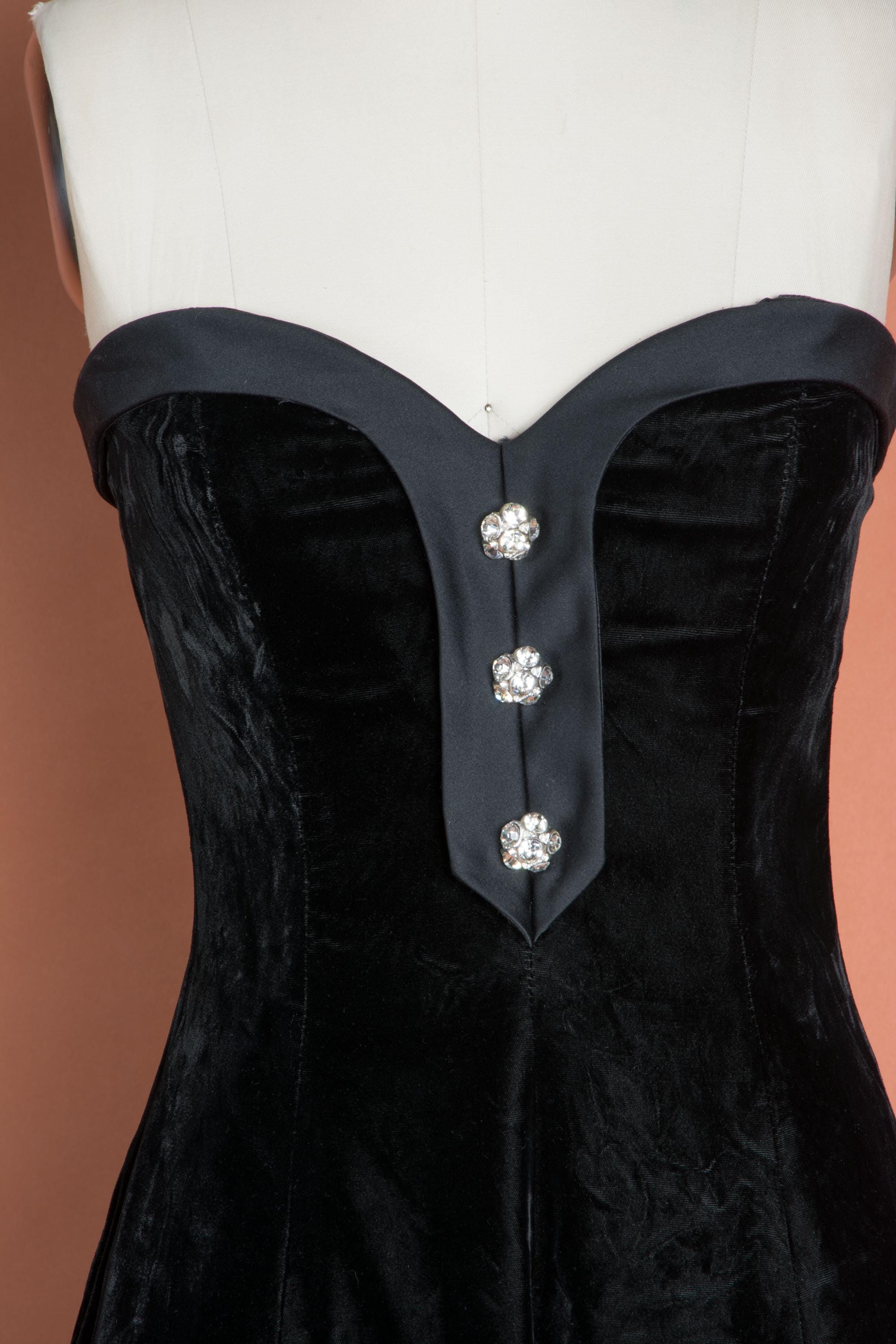 Gorgeous 1980s Strapless Victor Costa in black velvet with faille trim, and crisp underskirts for shape.