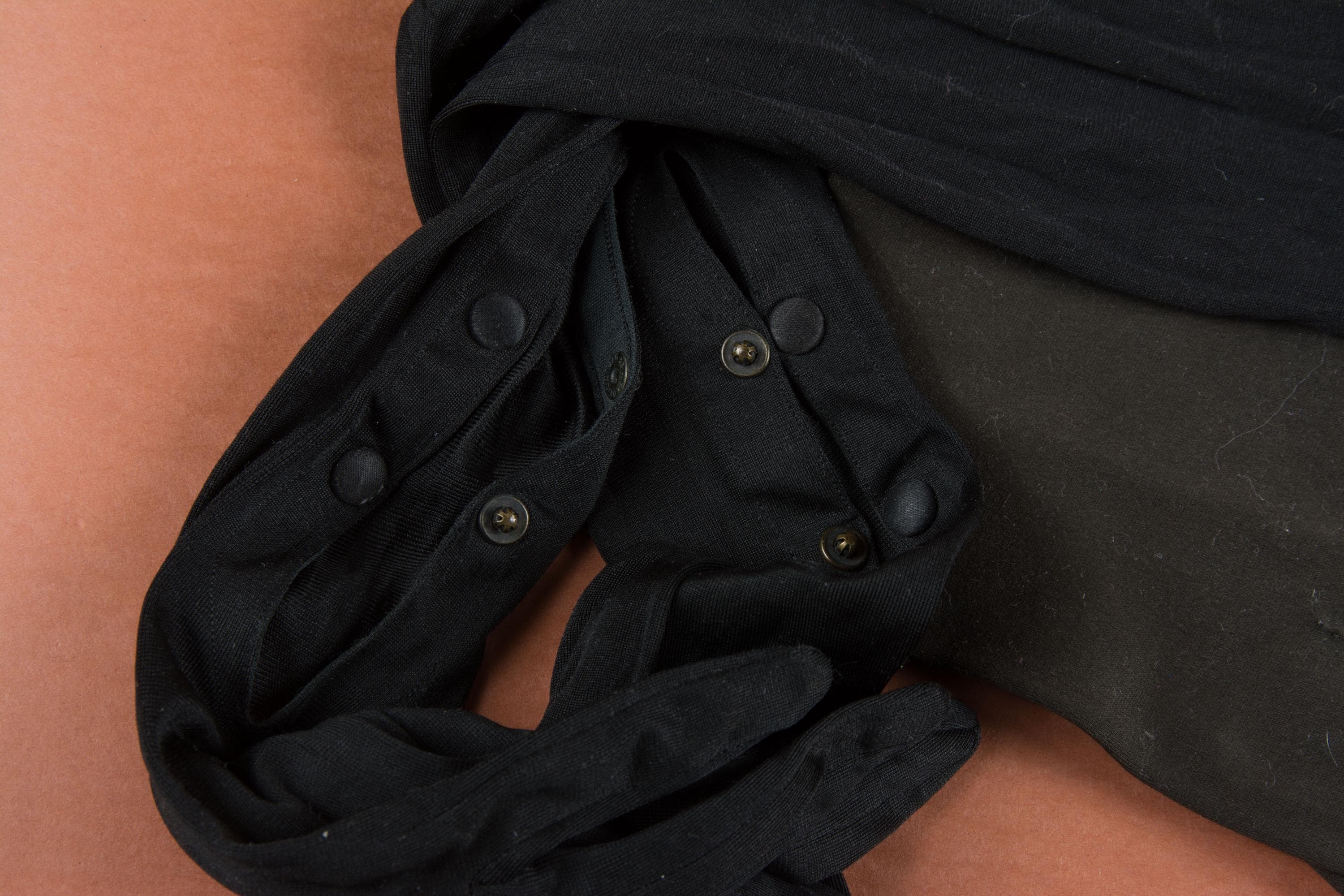 7. 1950s opera length black gloves. Marked size B. Have some wear to fingers and light soil