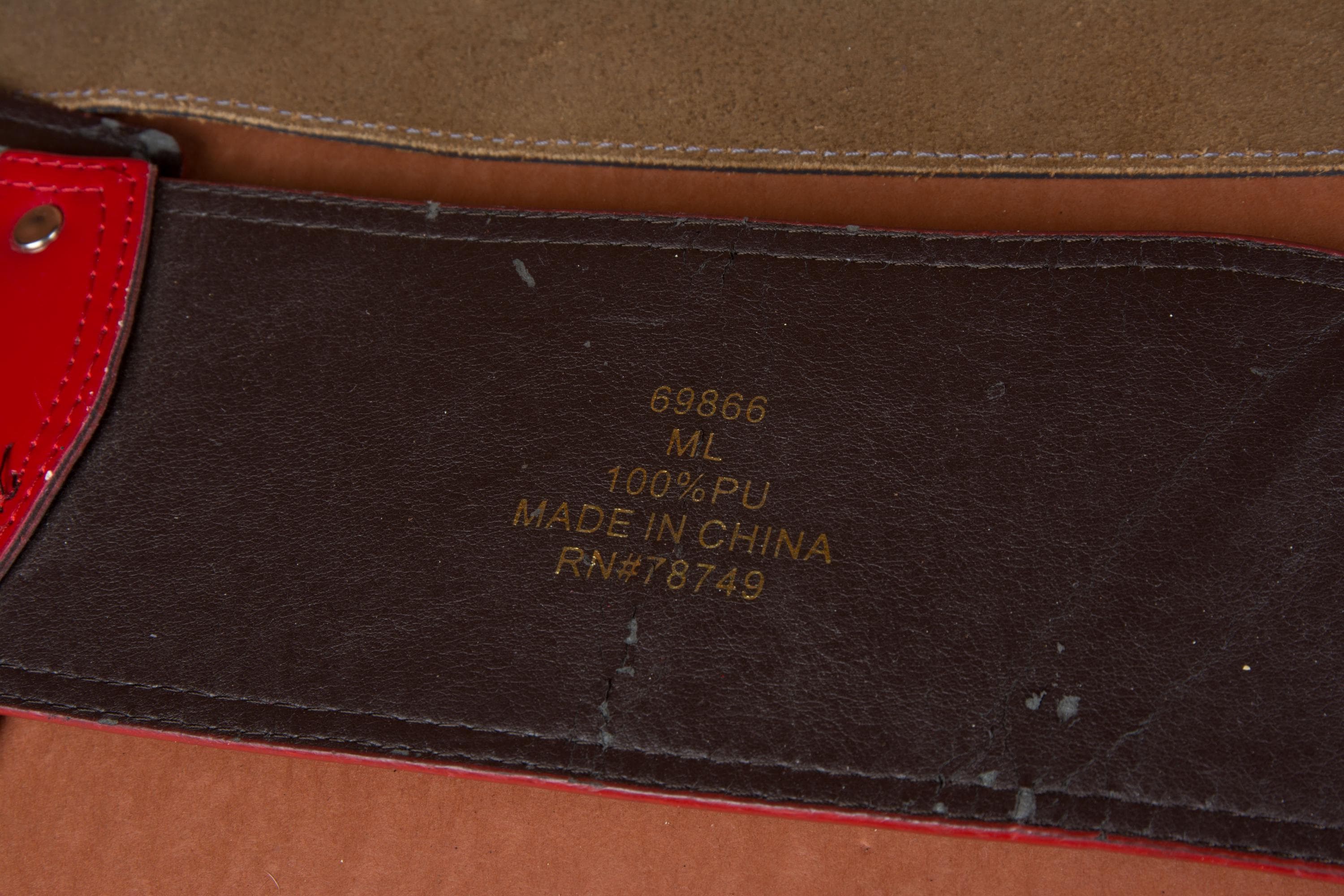 4. A 1980s red vinyl contour belt with shield buckle, fits 27" to 33"