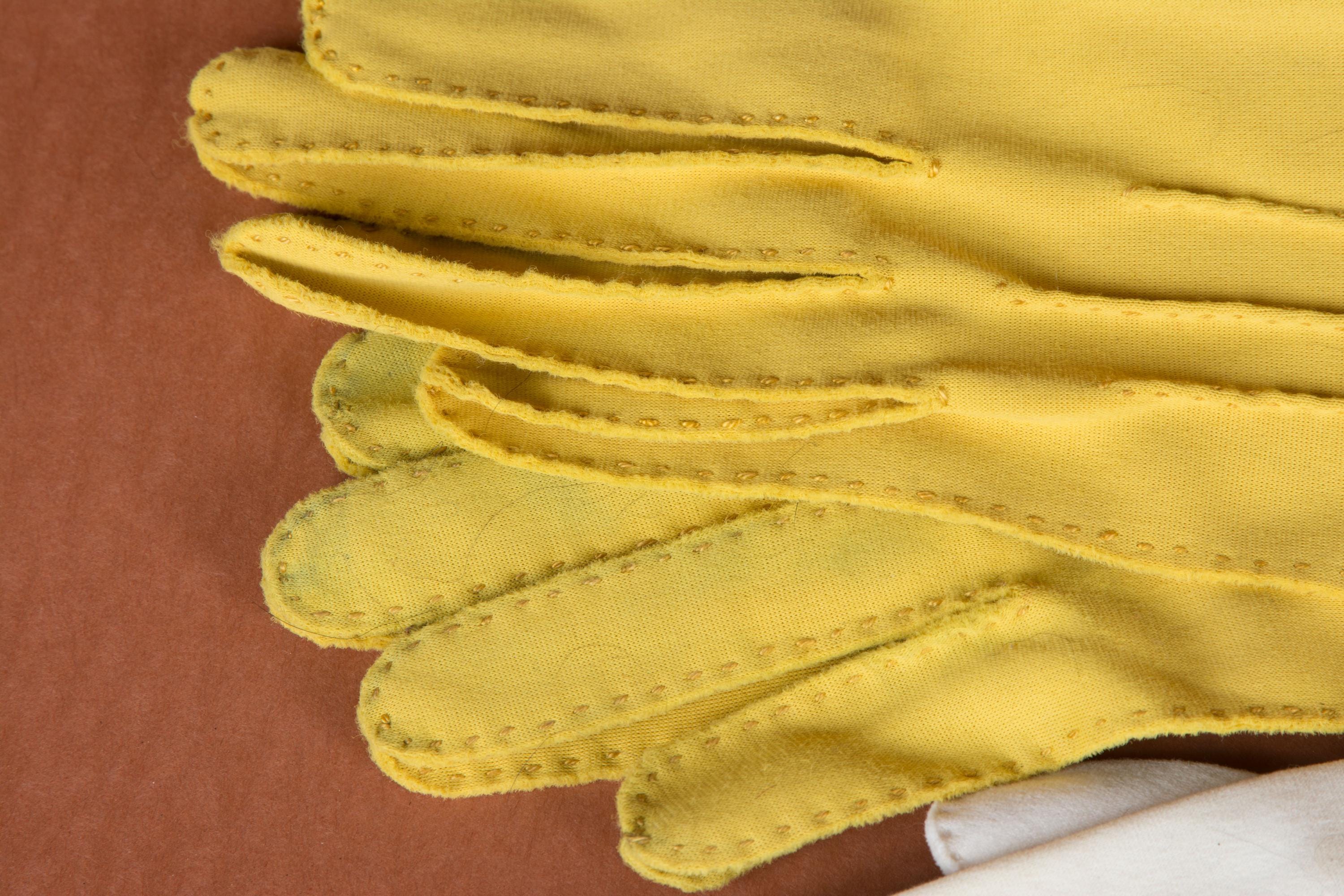 2. 50s yellow gloves. marked size A. Light fingertip soil