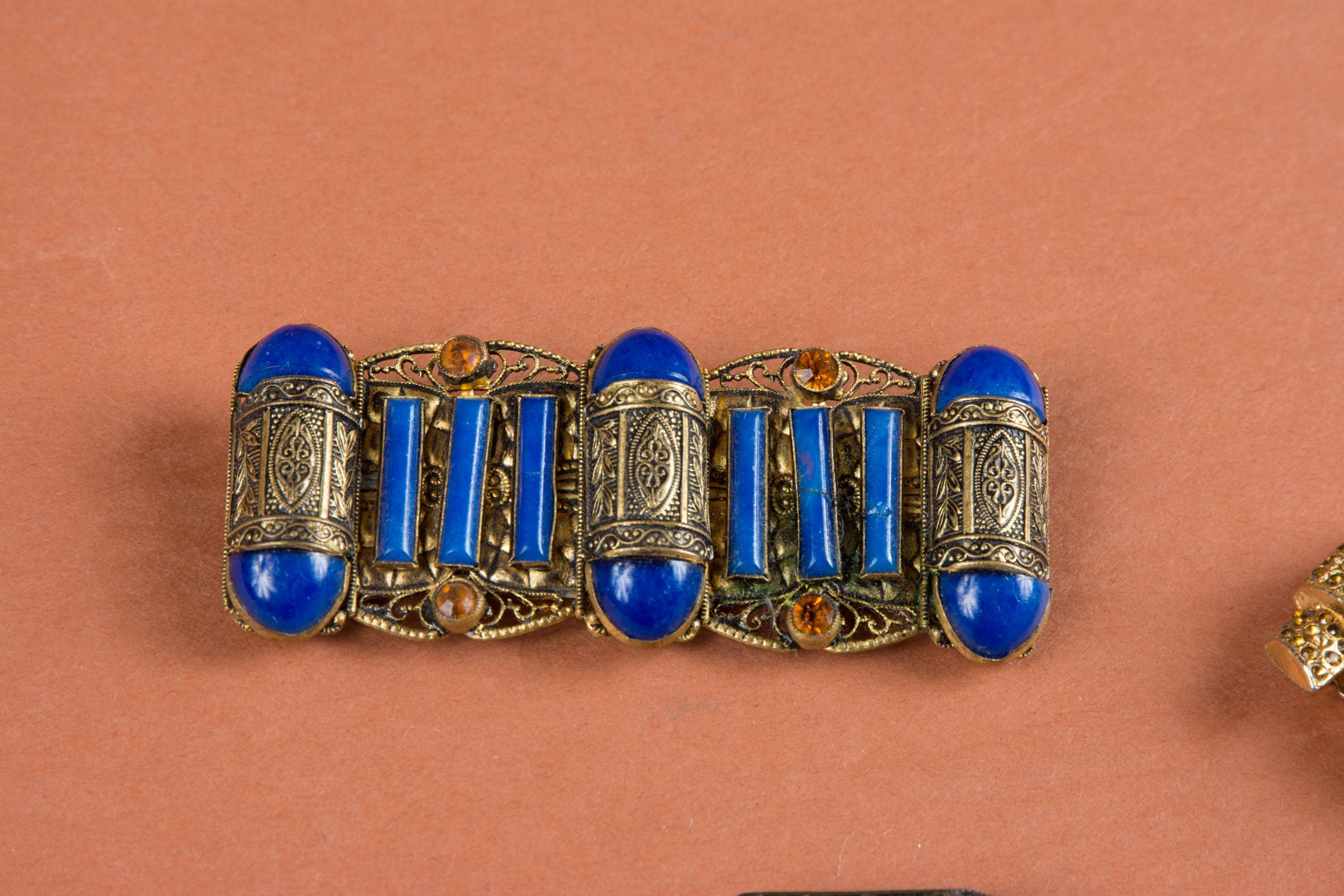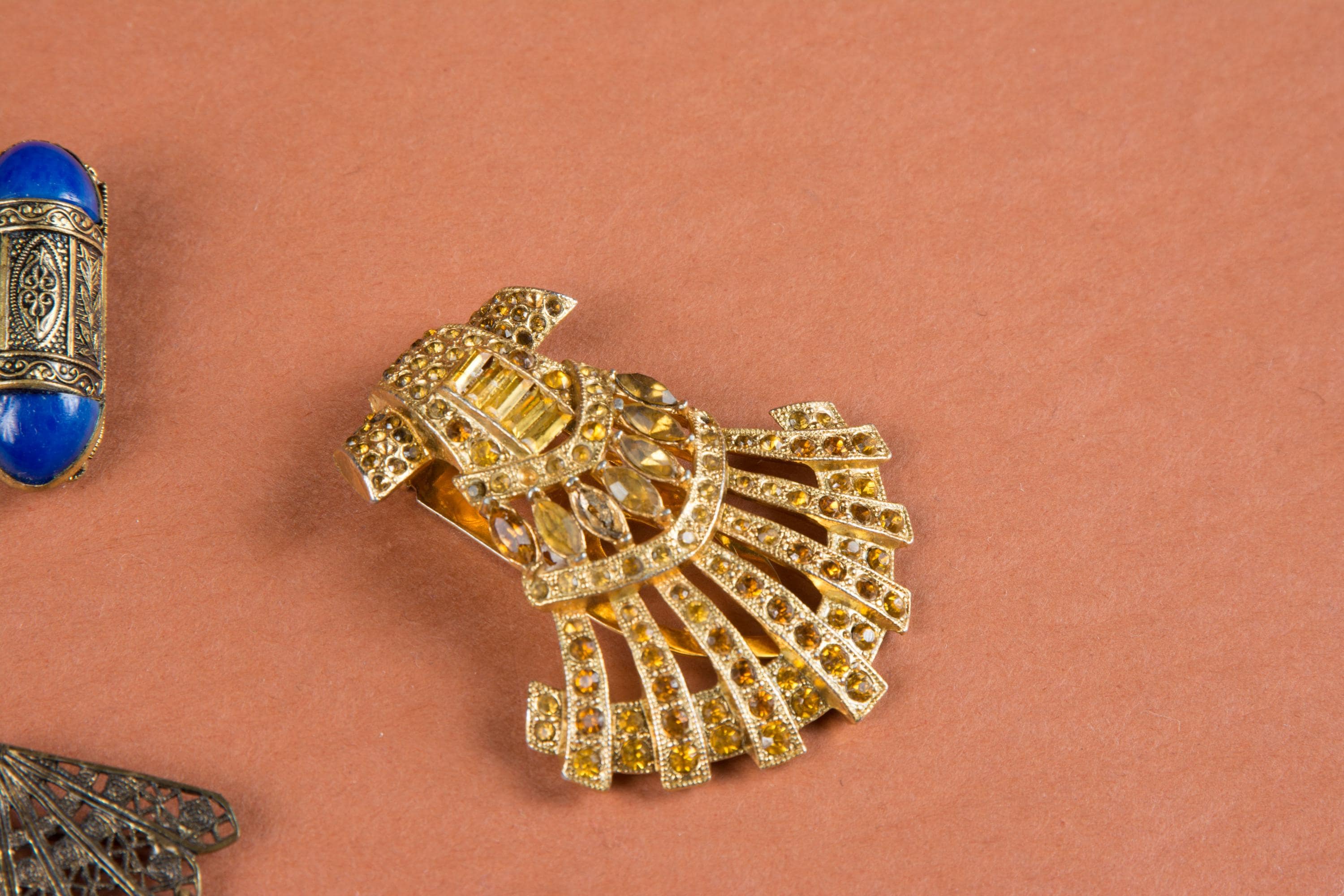 1. 1930s stamped metal brooch with blue stone and amber rhinestones, bends a bit easily, has some small bends on close inspection