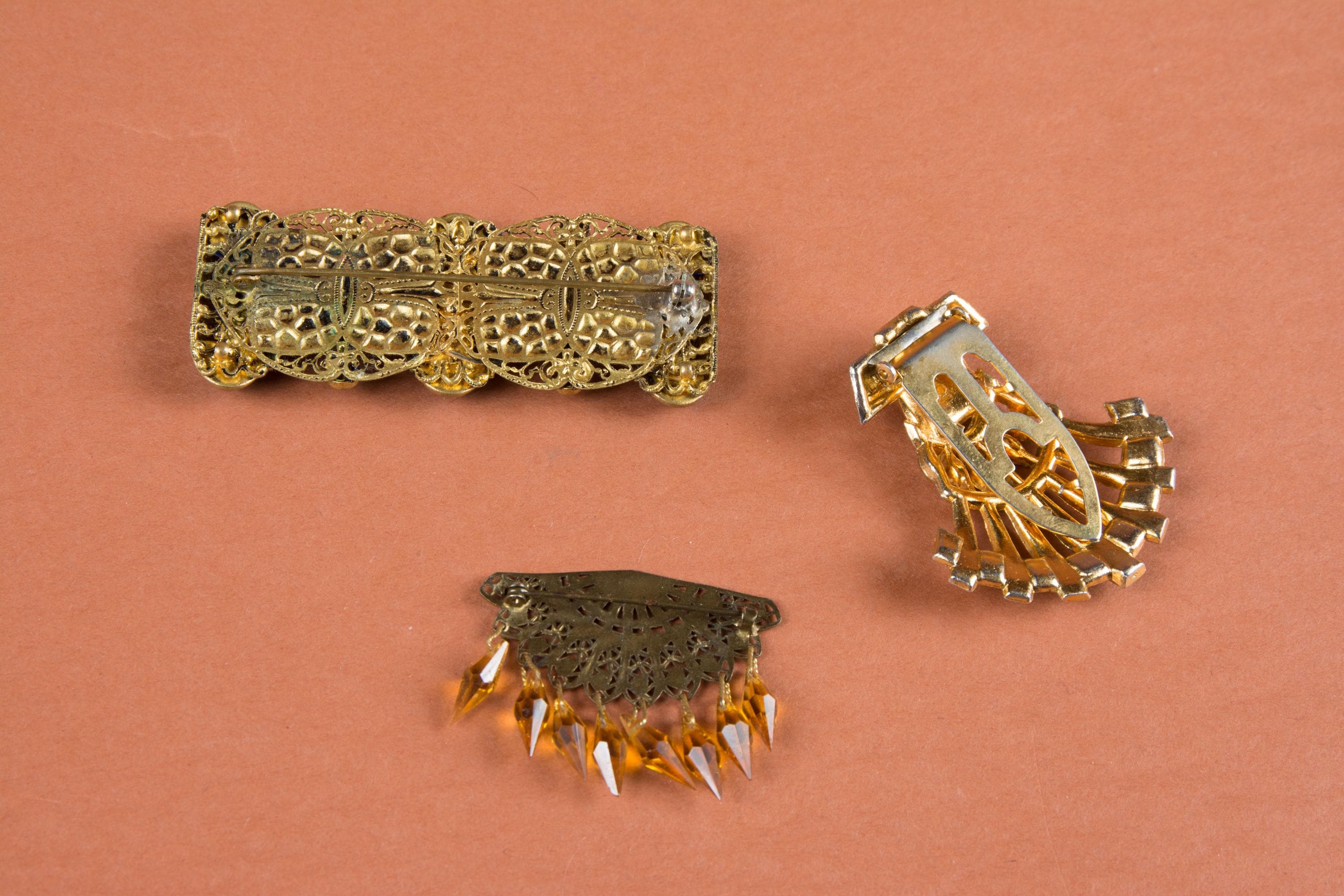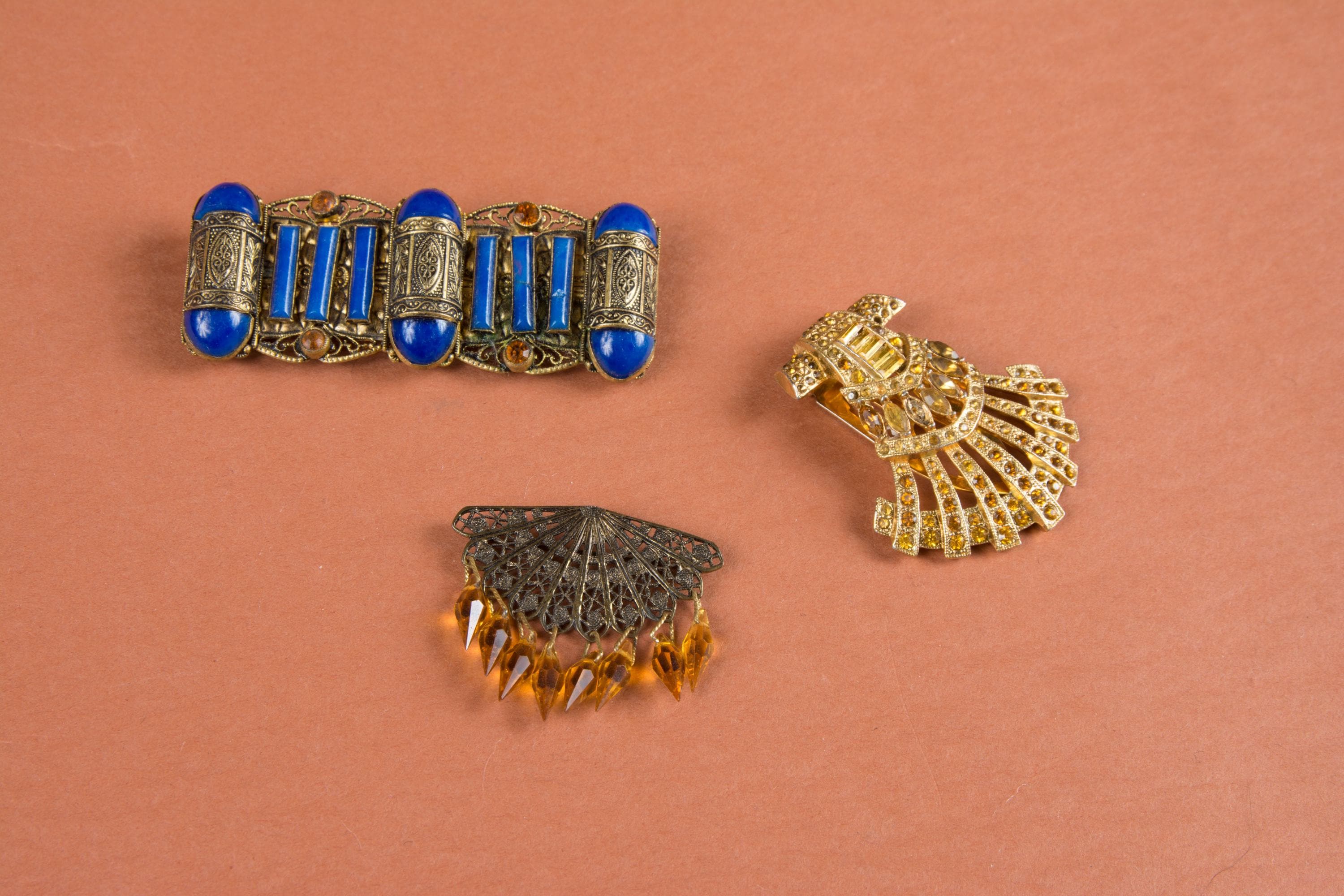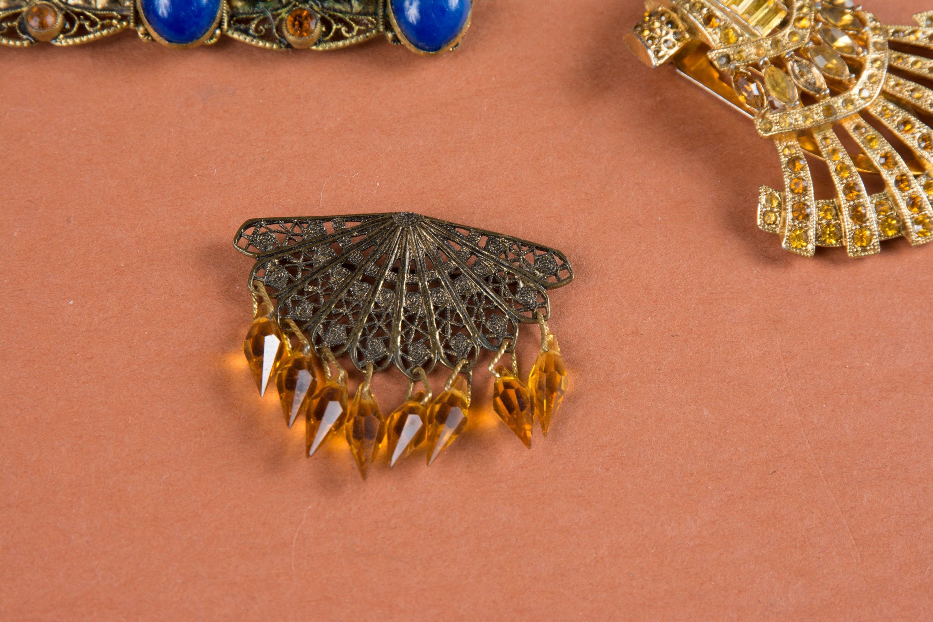 3. 1930s Amber colored dress clip, only one missing stone and strong clip. Very good minus