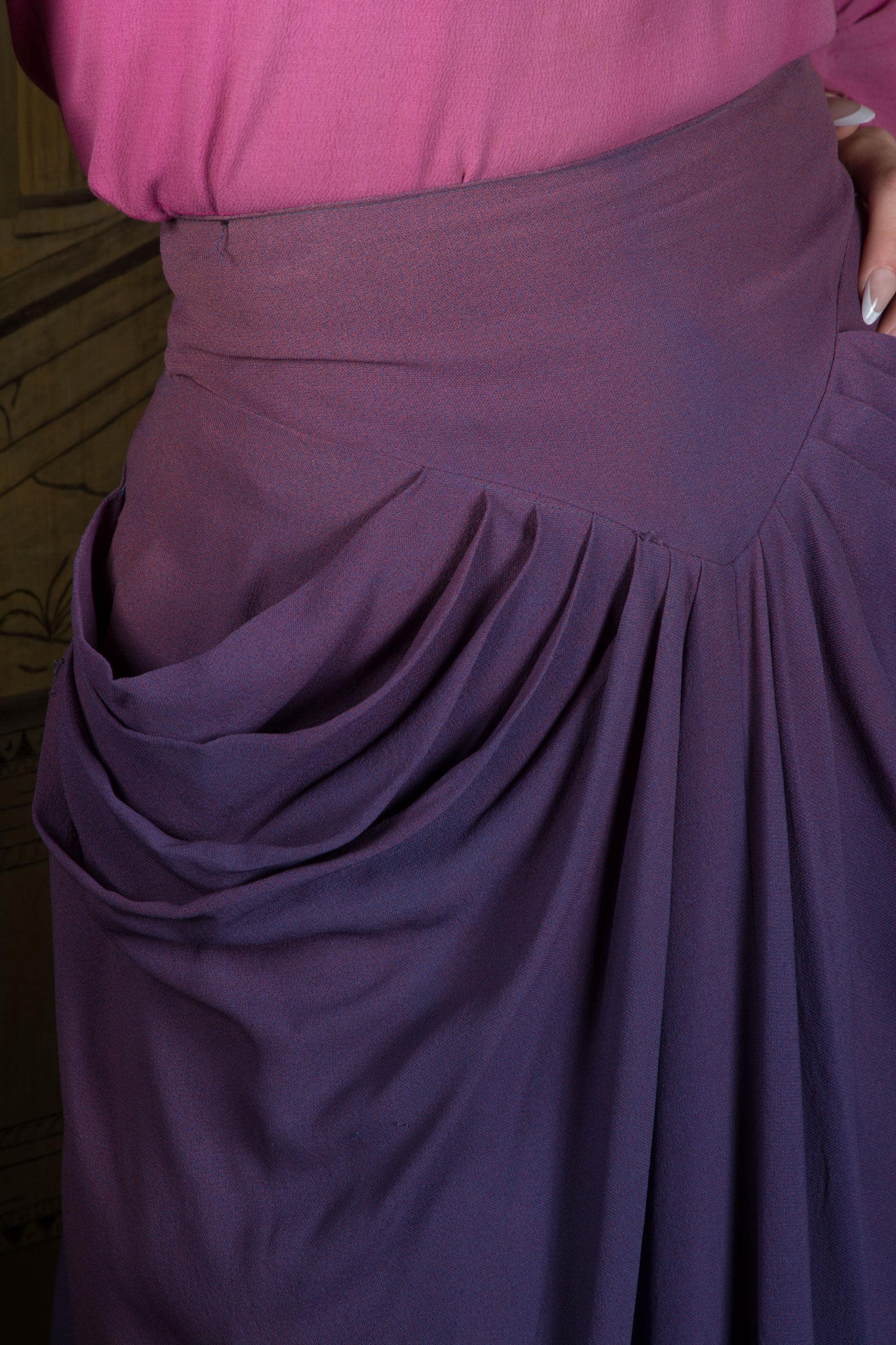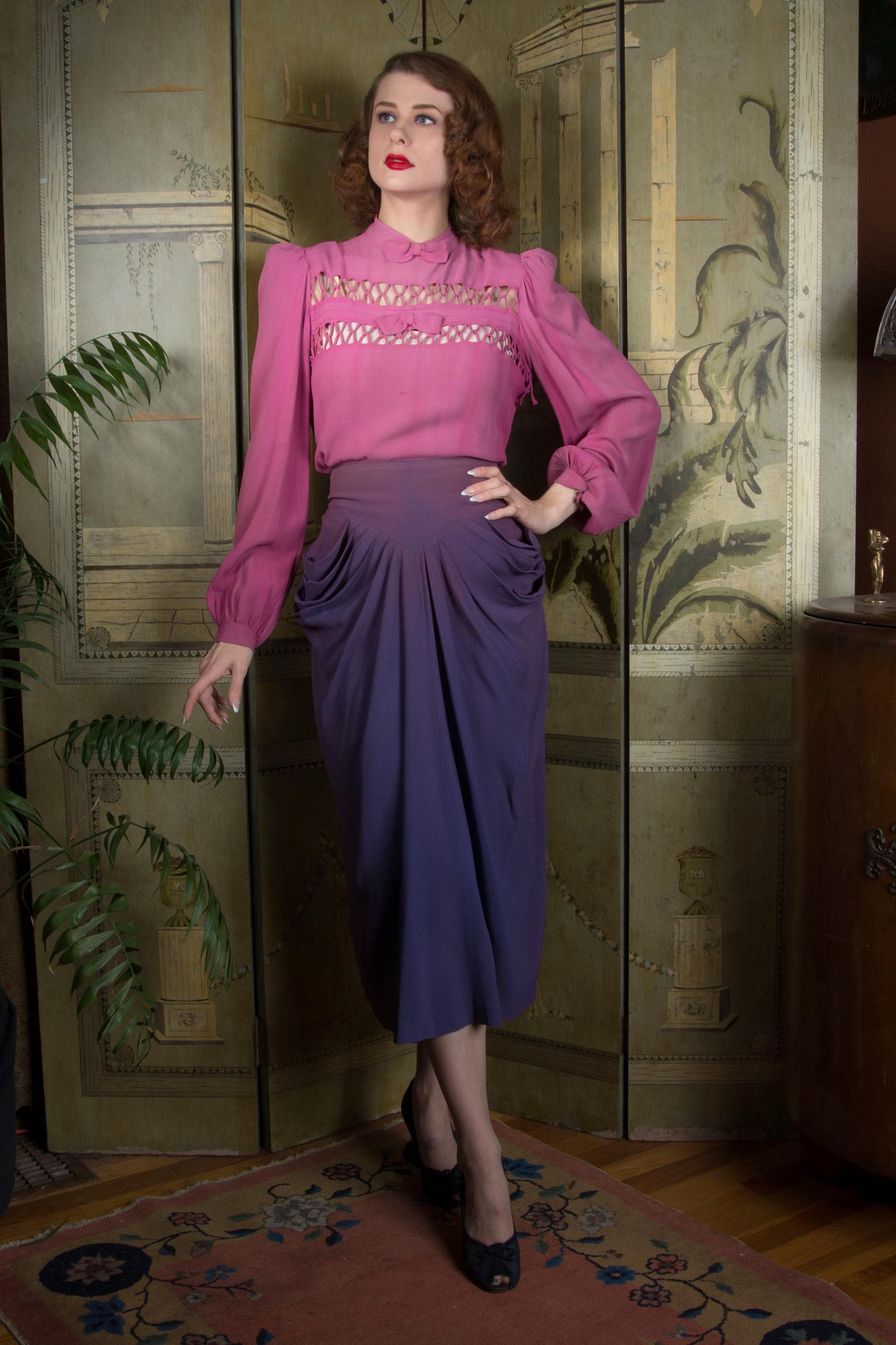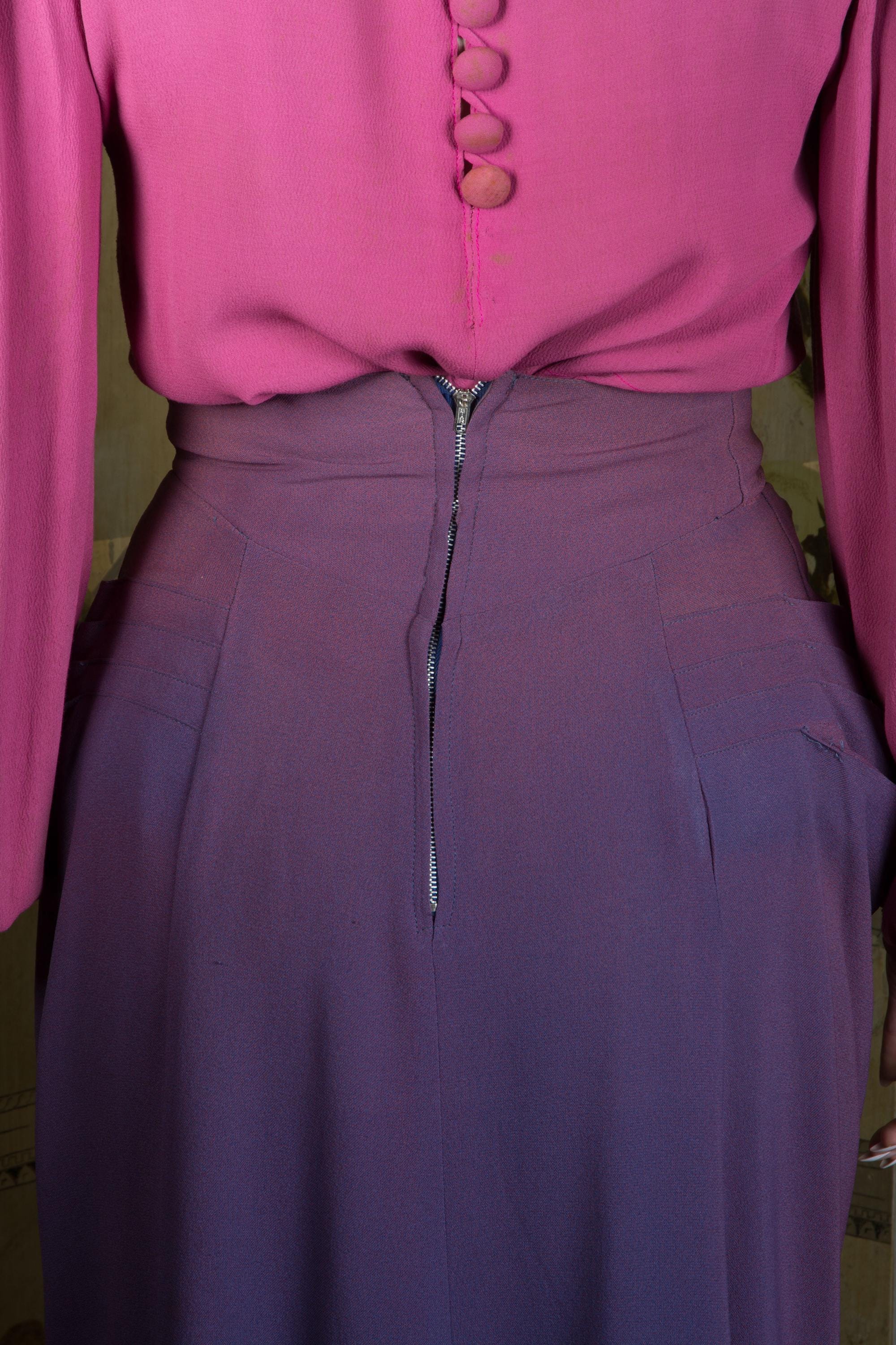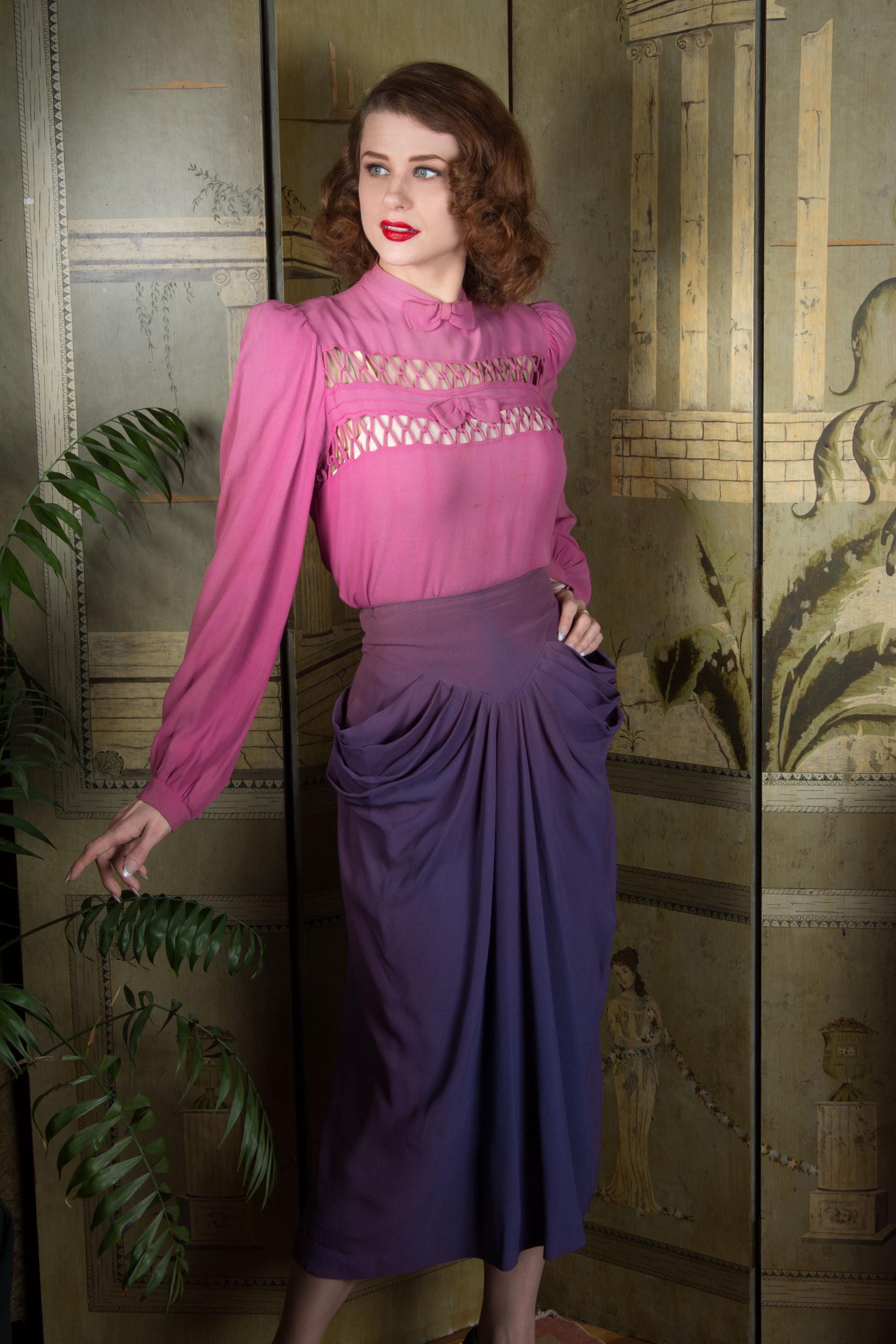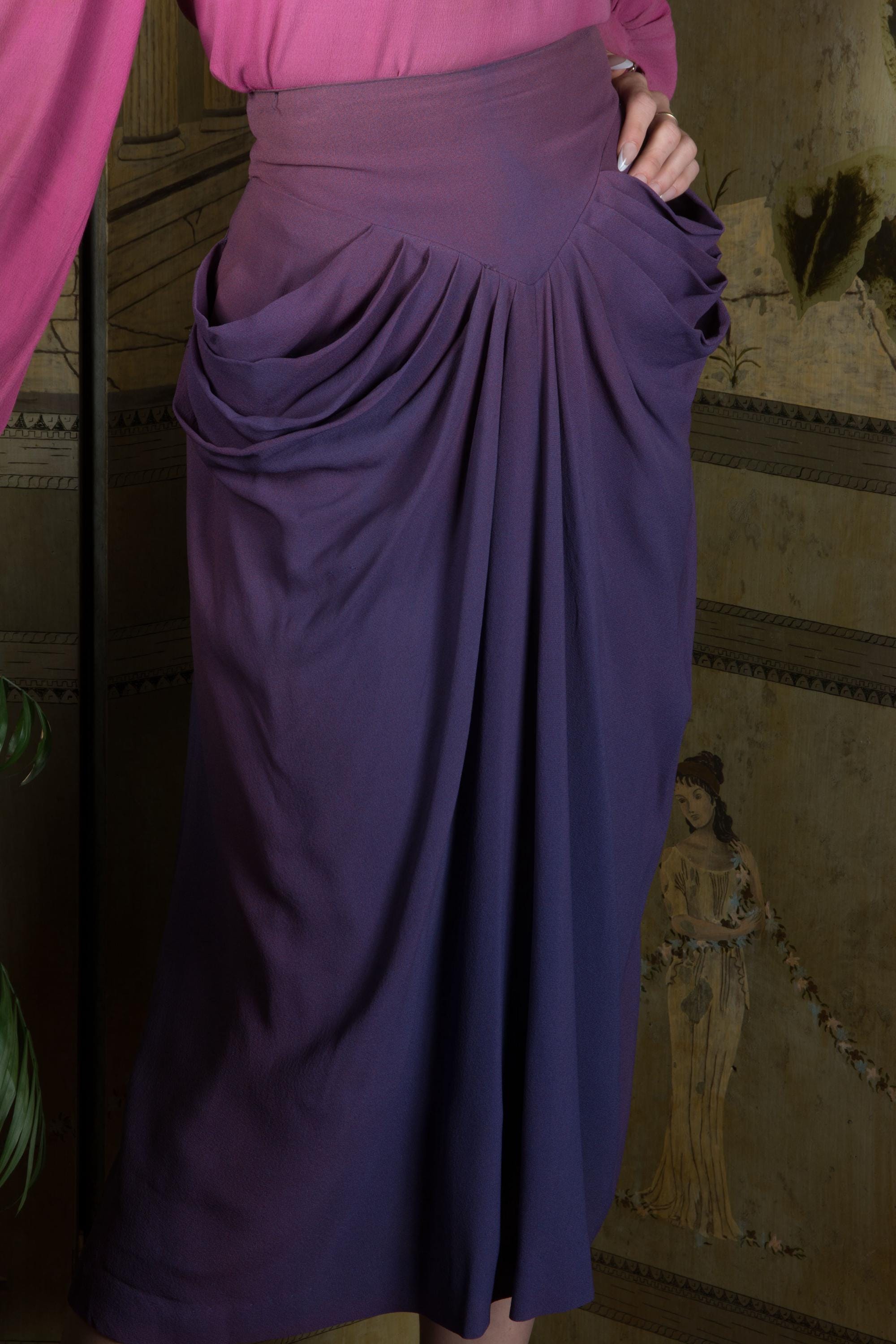 This 1940s rayon skirt is a wounded bird, but is also one of the hottest separates you could ask for. Made of a rayon celanese crepe in The waistband is high with a basque point both front and back. Seven pleats at each side create incredible draping at center front and around the hips. Four of these become curve hugging darts. Made for a vixen, and you're going to slay in it. Closes at the back with a long metal zipper to the waist.