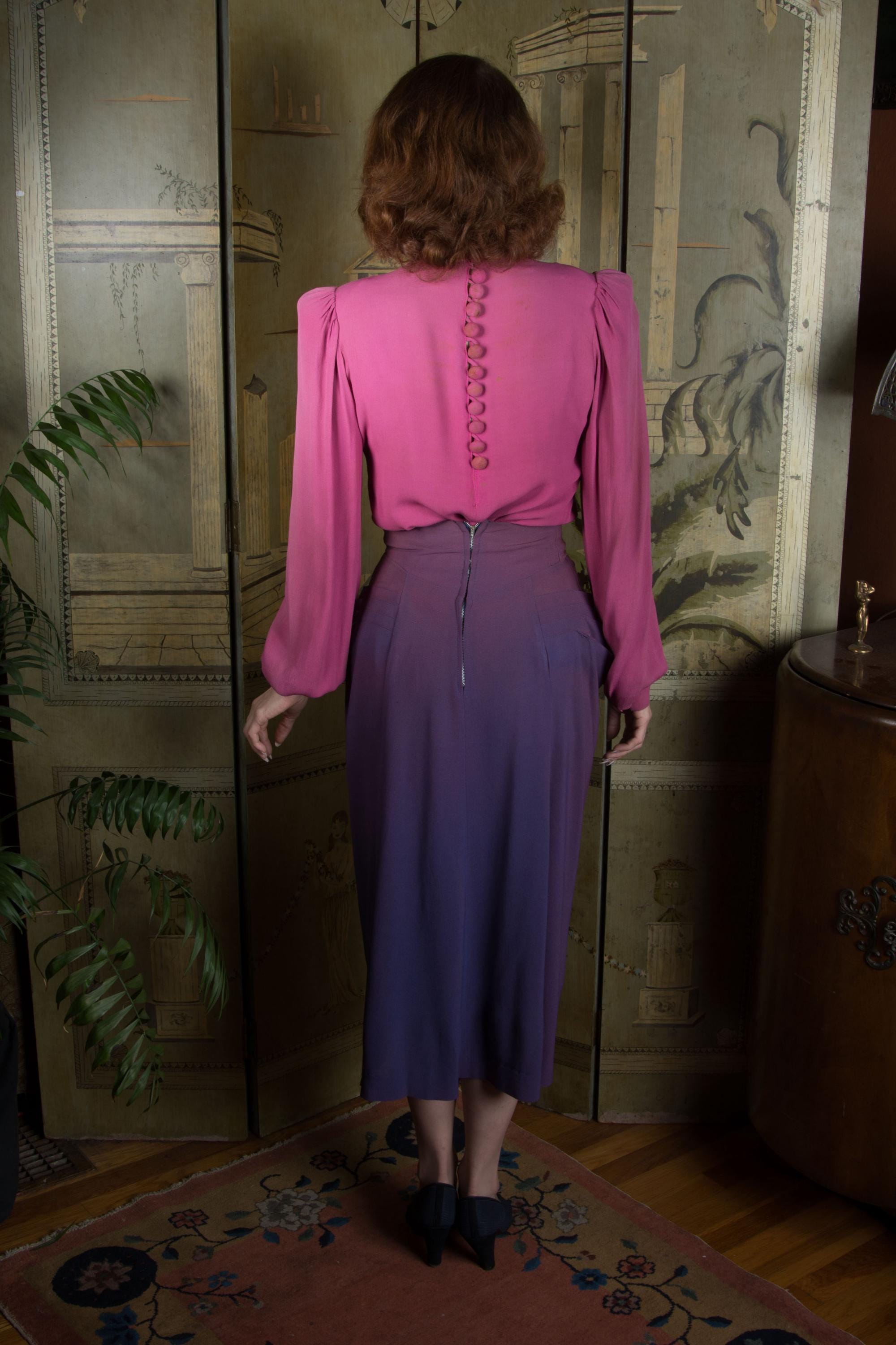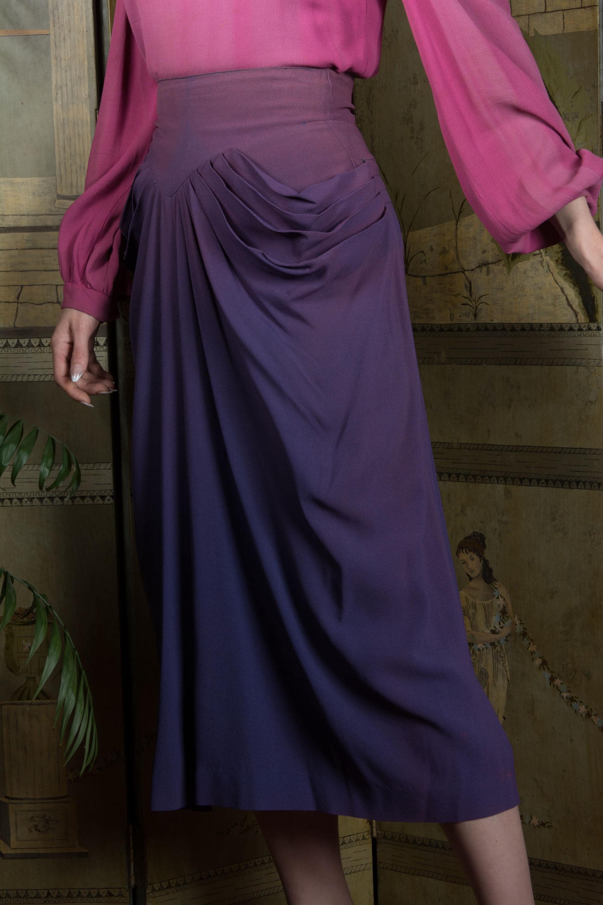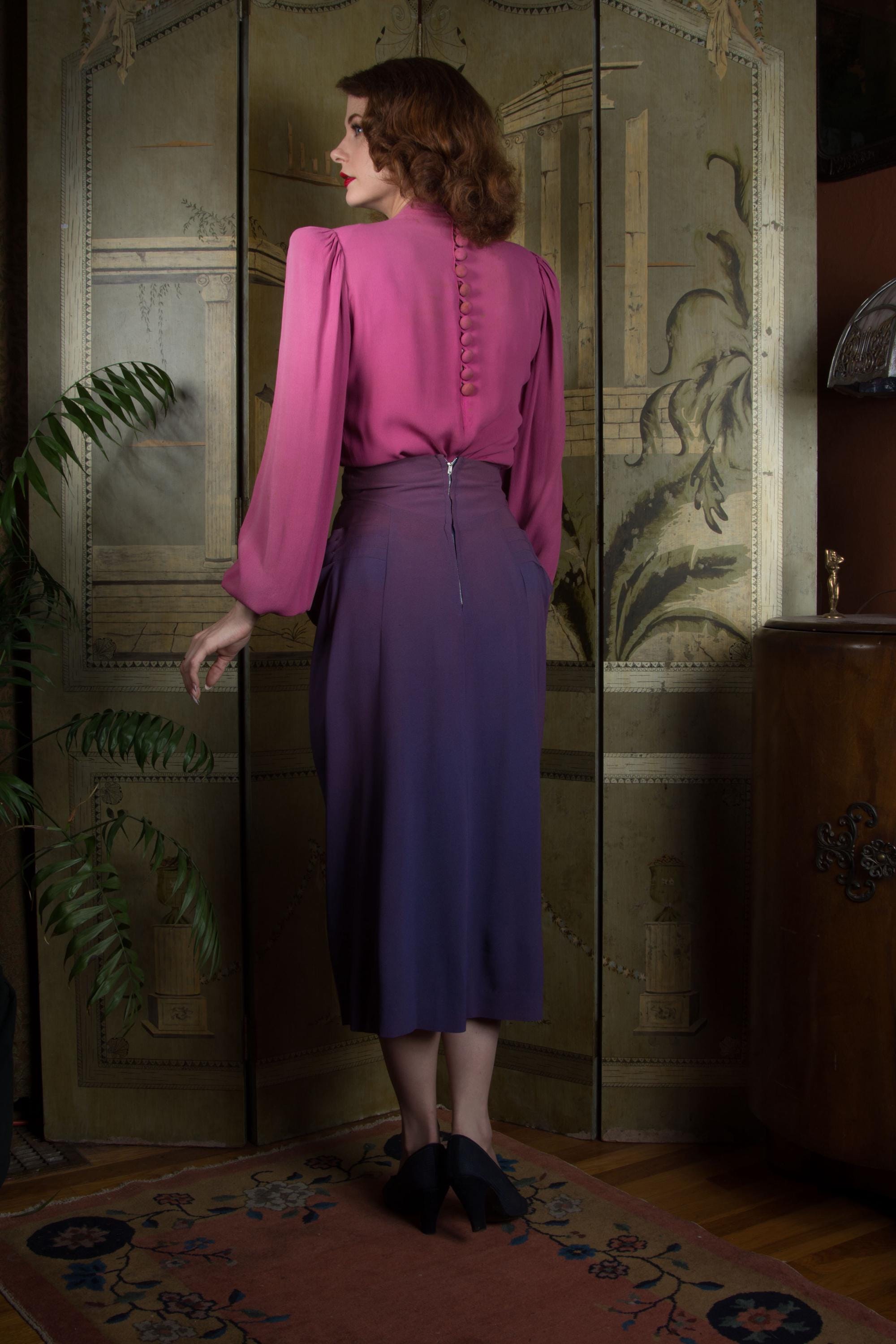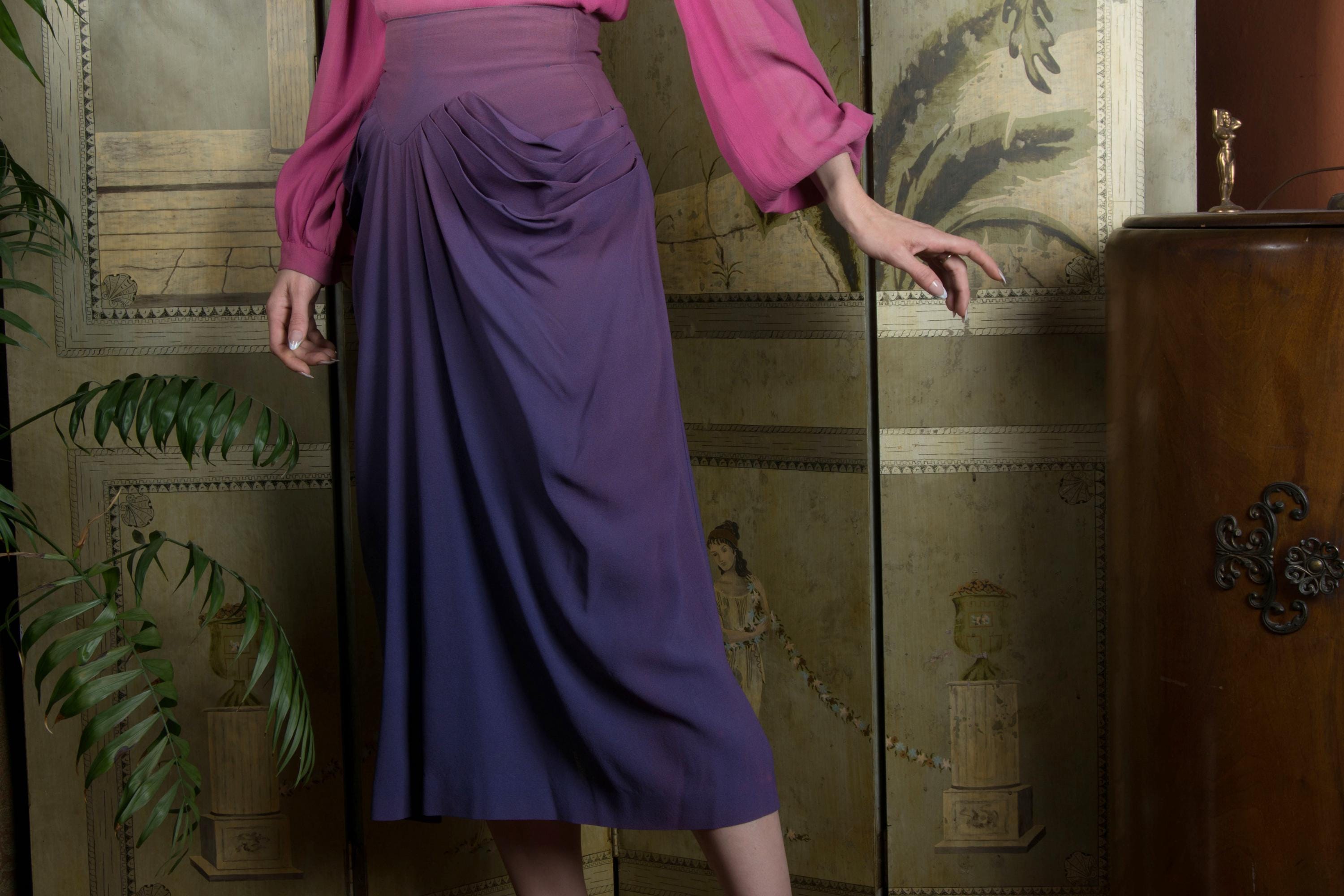 This skirt is freshly dry cleaned and ready to wear. This has no serious structural issues, but as is clear in photos, it has significant fade that travels waist to hem, strongest at the top, then sides. There is a single 1/2" fray on the back right side of the waistband, where it meets the draping of the skirt, but as this is just the outer layer, it really doesn't affect wear. A great wounded bird for those who see imperfection as character.