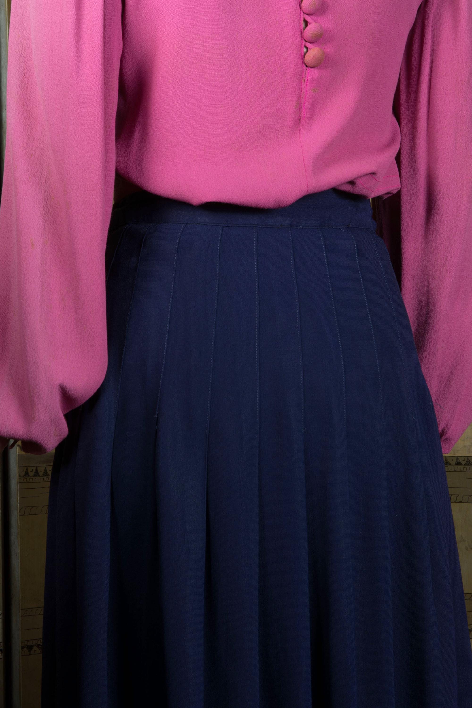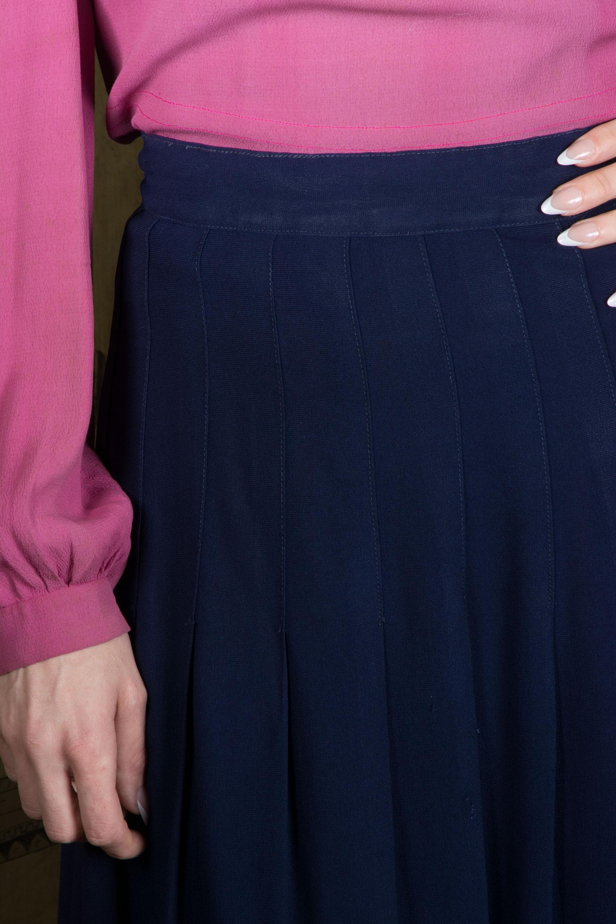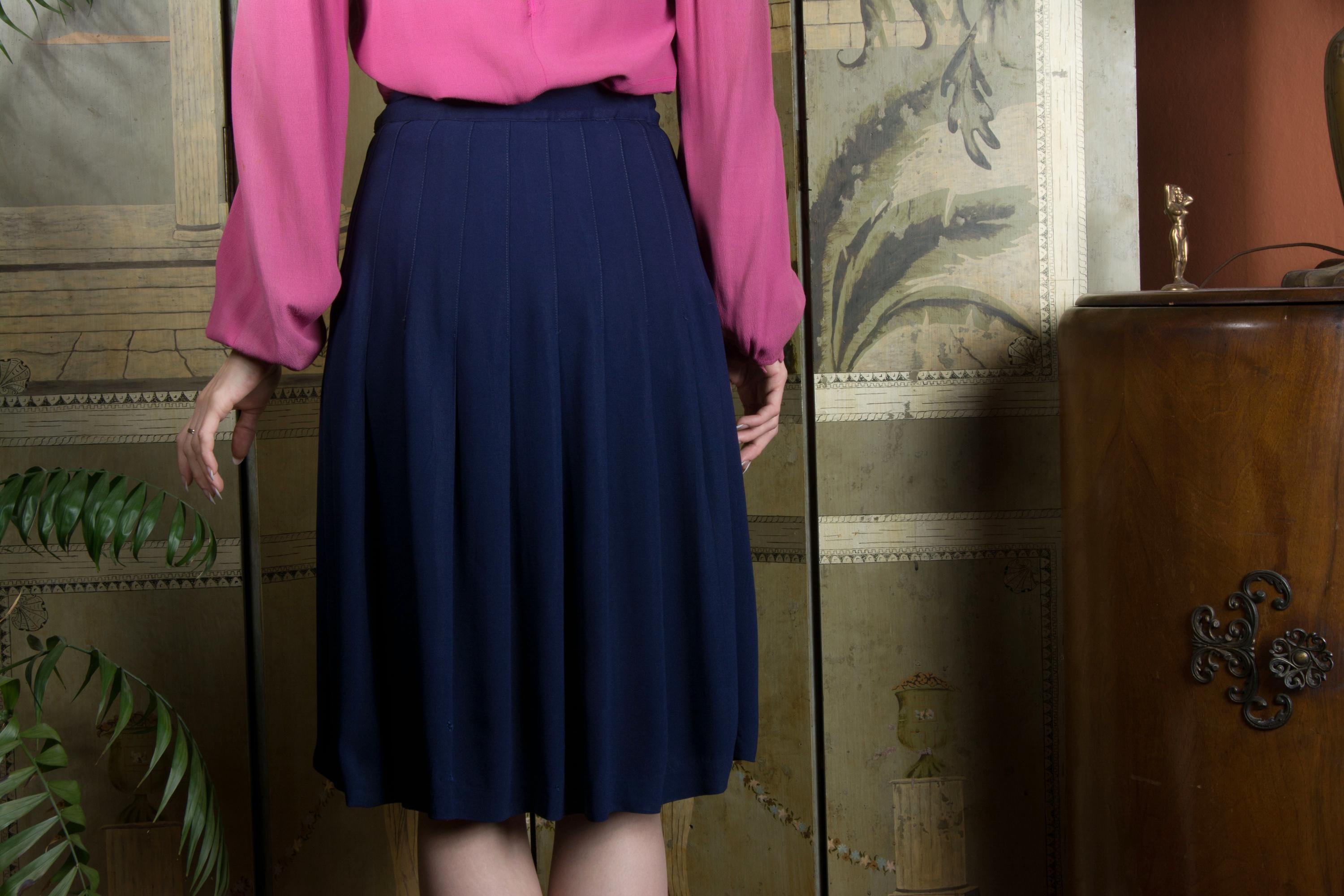 A timeless vintage separate, this is a swishy navy rayon skirt, the shape created by long darts that open low to pleats. Perfect with casual sweaters or dressy blouses alike. This closes on the side with a zipper, and buttons on the waist.