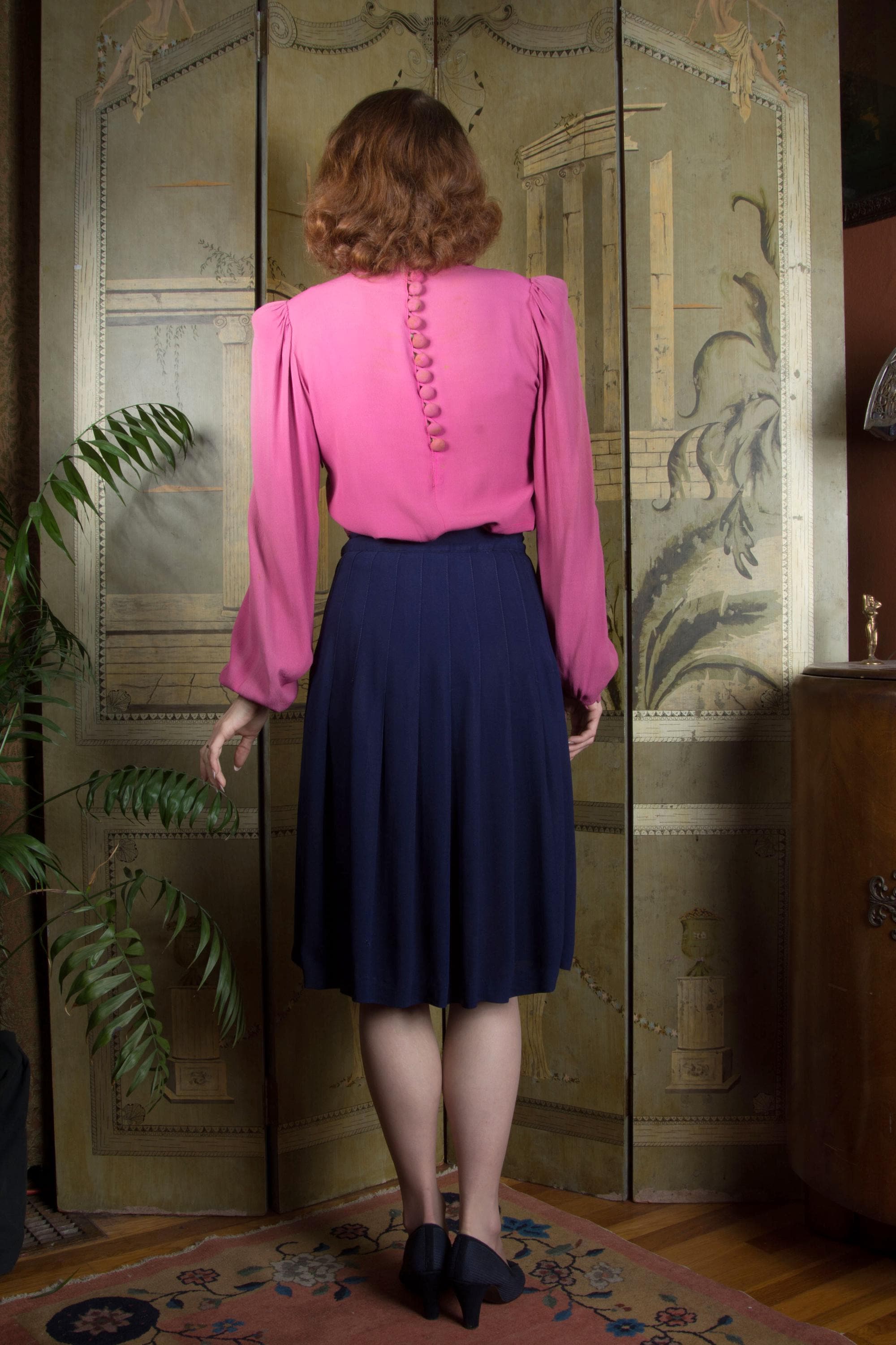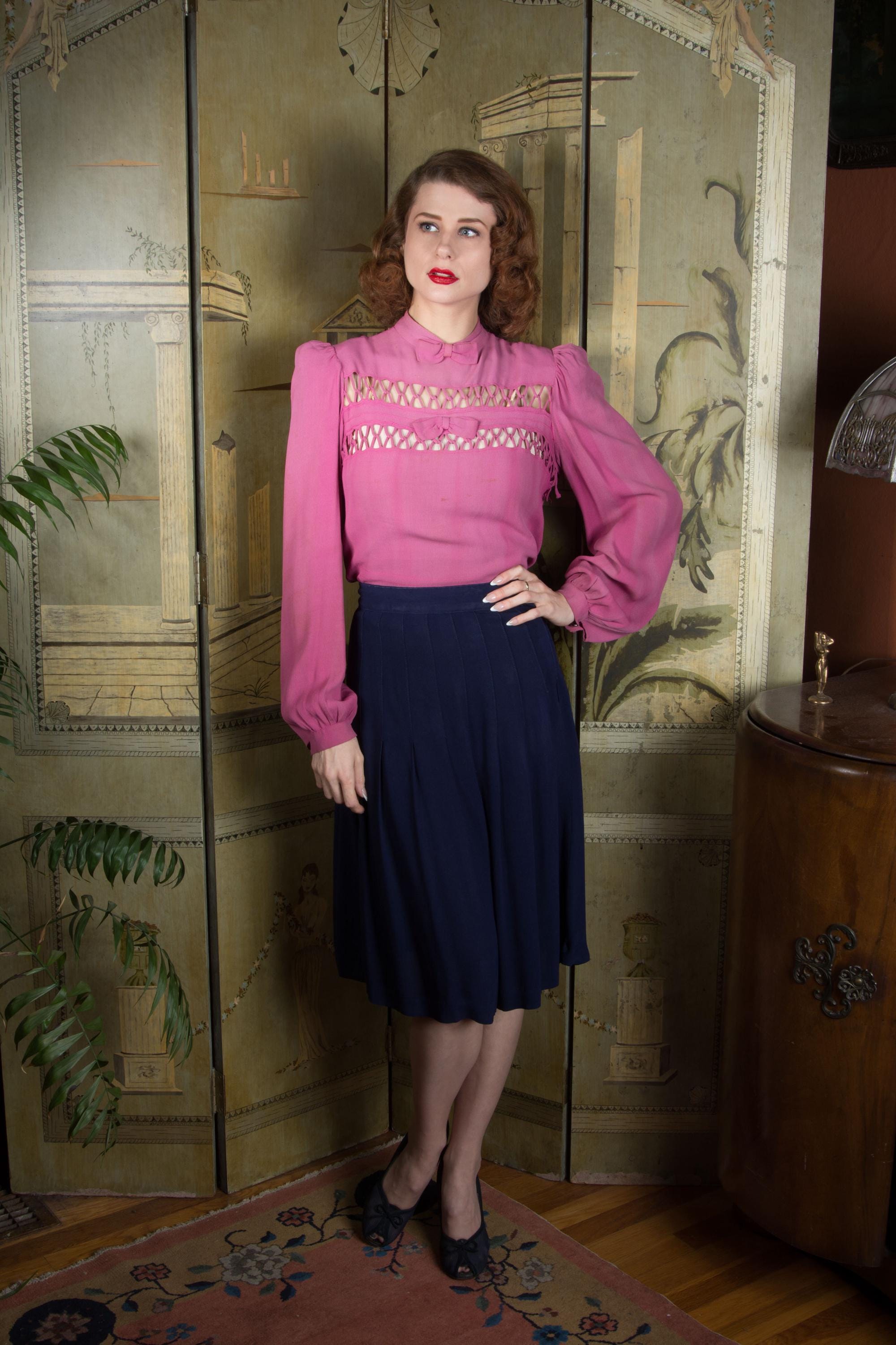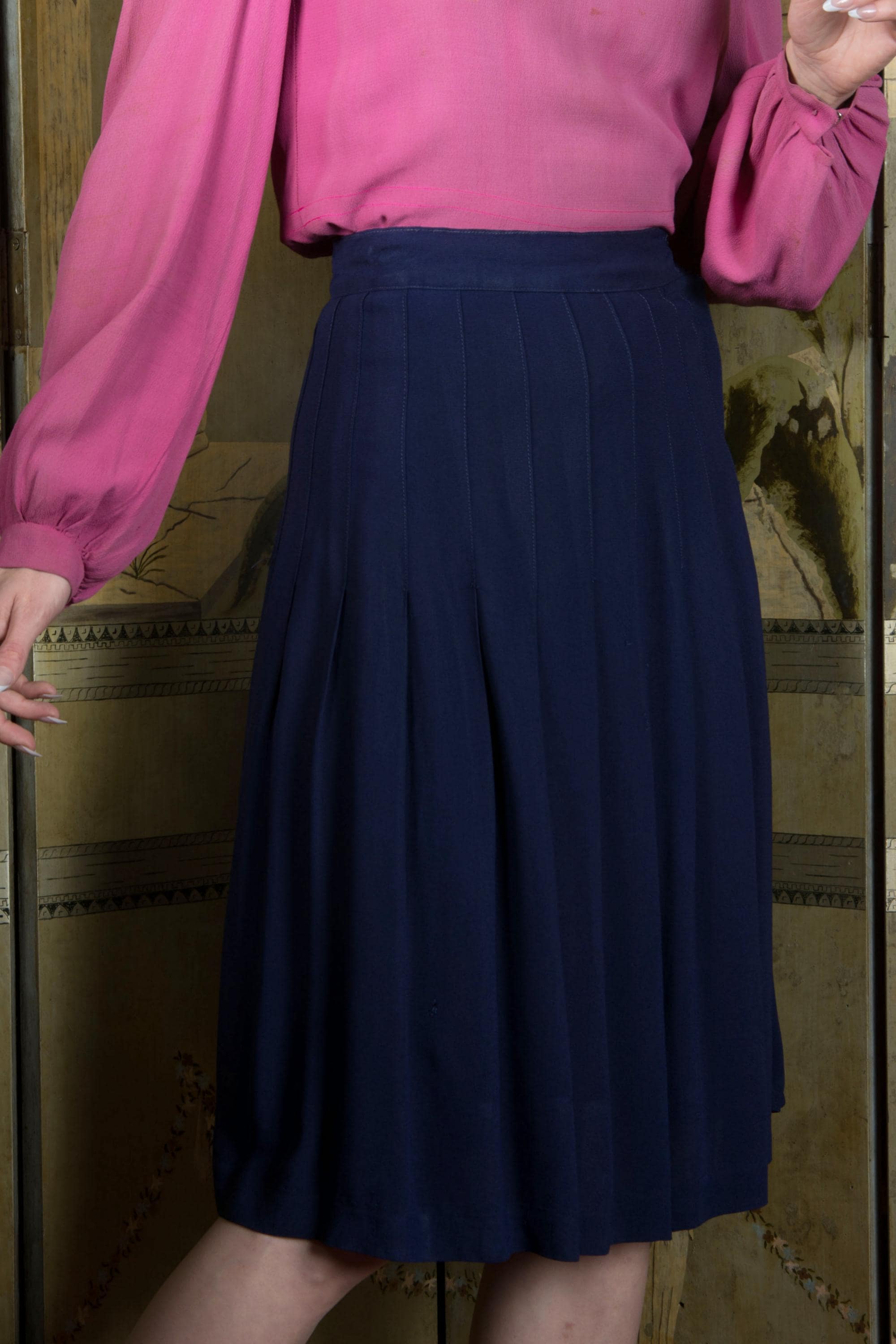 A timeless vintage separate, this is a swishy navy rayon skirt, the shape created by long darts that open low to pleats. Perfect with casual sweaters or dressy blouses alike. This closes on the side with a zipper, and buttons on the waist.