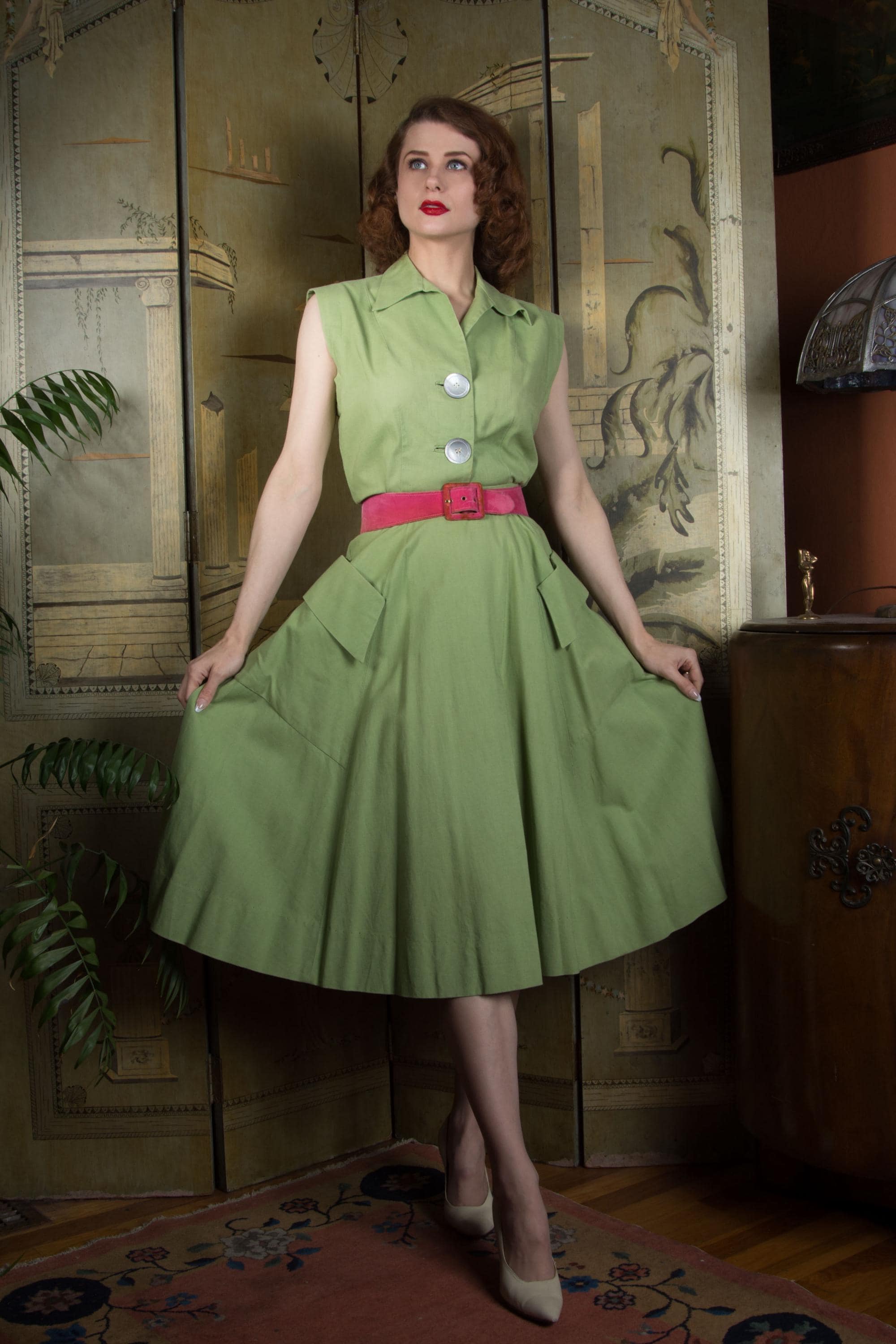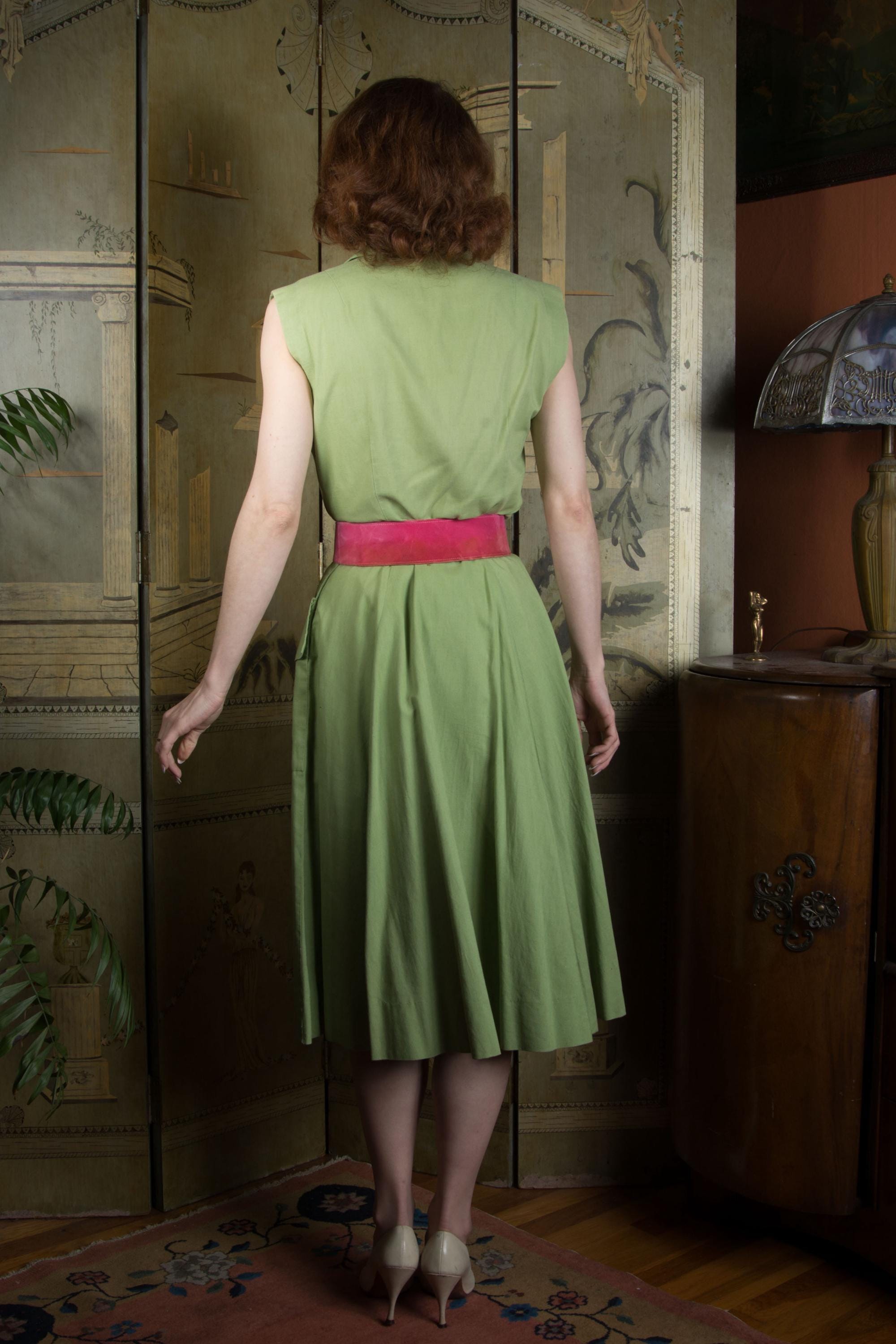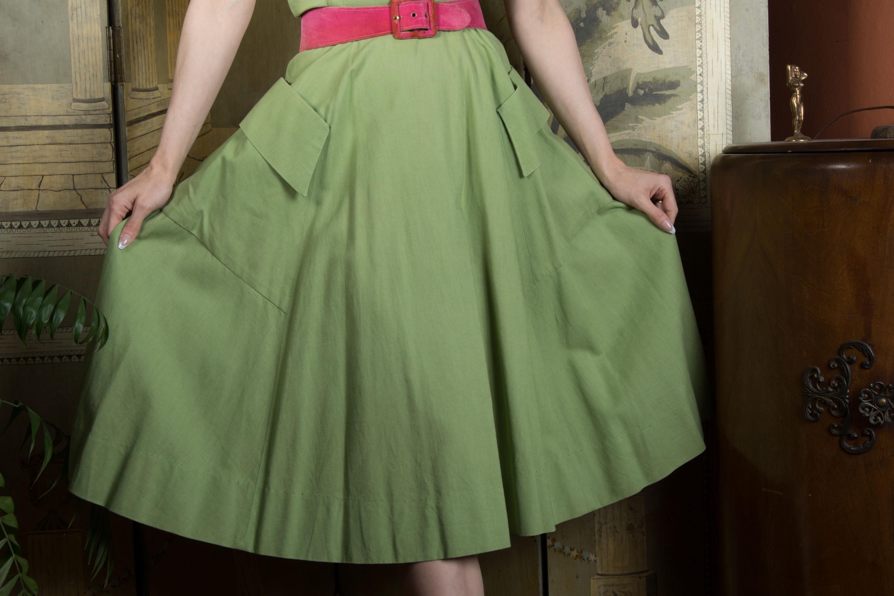 1950s Ensemble - Vintage 50s Green Cotton-Linen Sturdy Two Piece Set with Deep Pocket Skirt and Large Buttons
