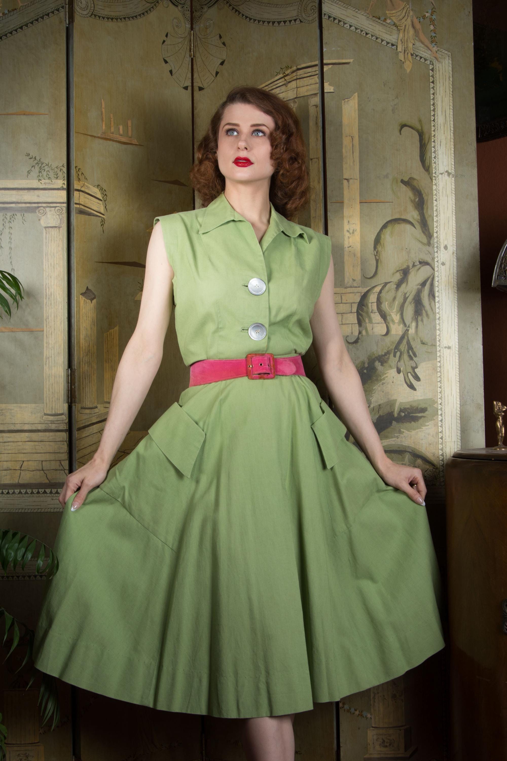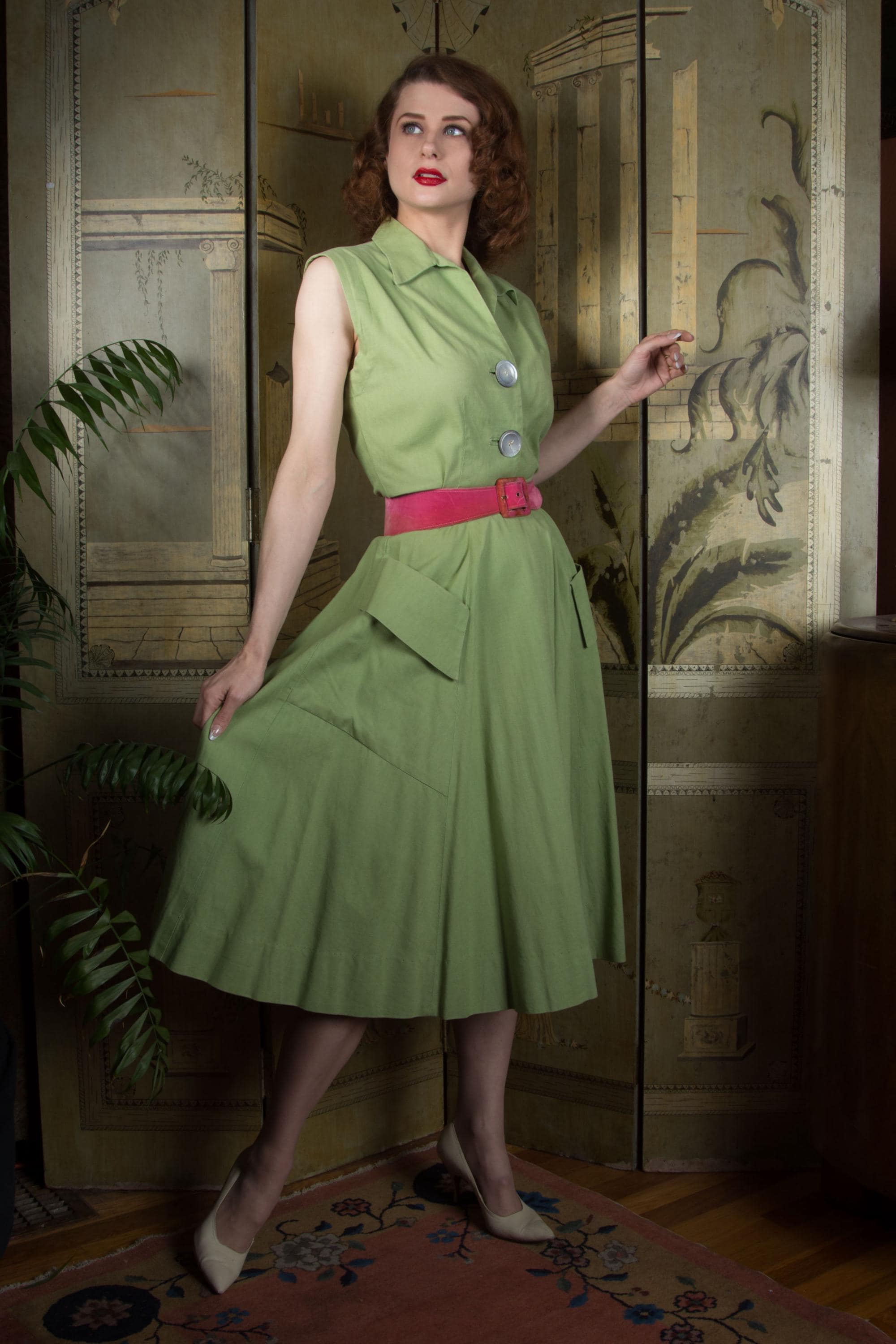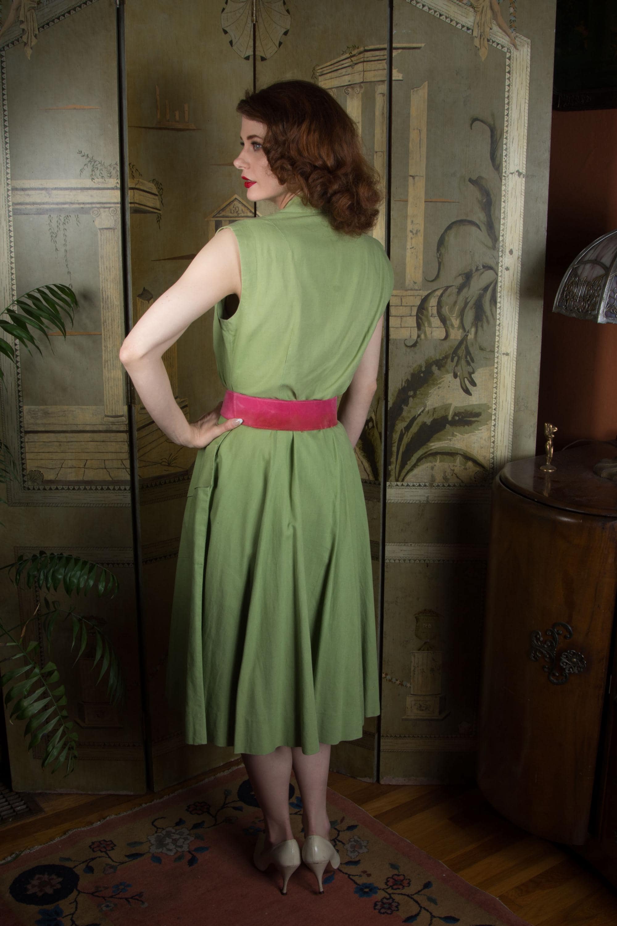 1950s Ensemble - Vintage 50s Green Cotton-Linen Sturdy Two Piece Set with Deep Pocket Skirt and Large Buttons