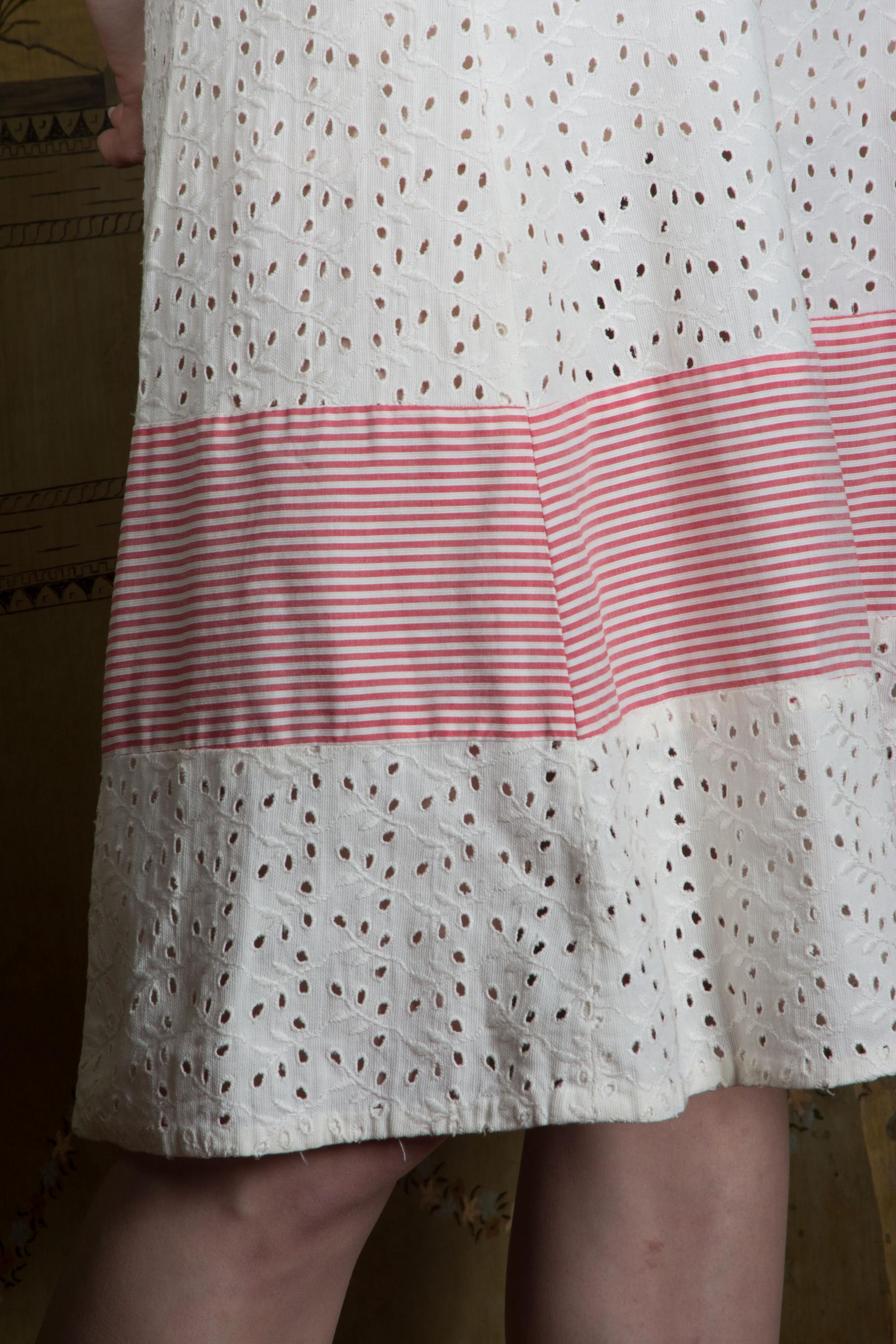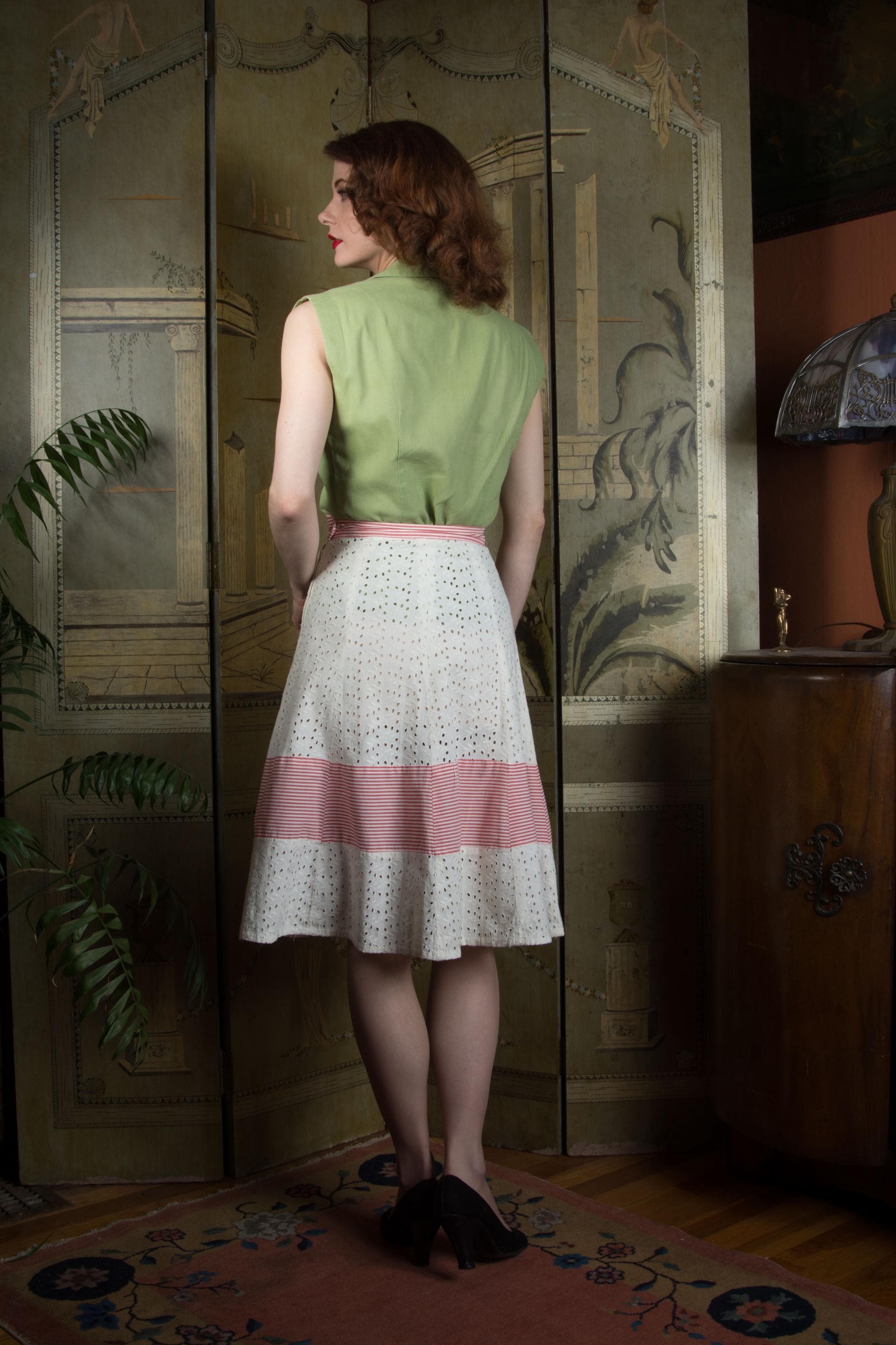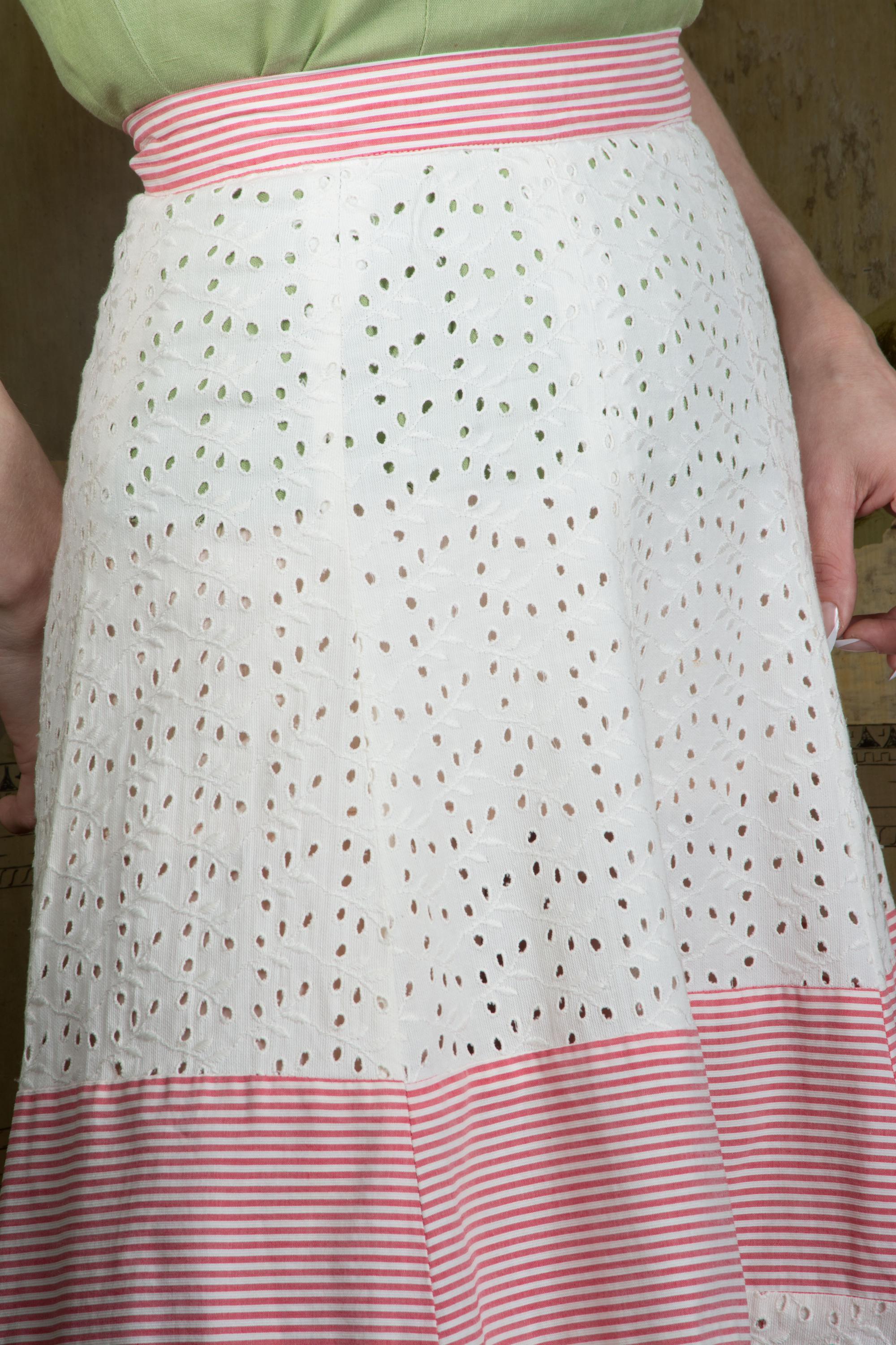 A darling 1940s summer skirt made of eight gores, it is a combination of pale red and white pinstripe, paired with heavy cotton eyelet. They alternate - a striped waistband, striped band above the hem, all with that ideal a-line flare. It will be just the thing paired with 40s bra tops or wrap shirts! This closes on the side with a metal bell zipper, and three hooks on the waist.