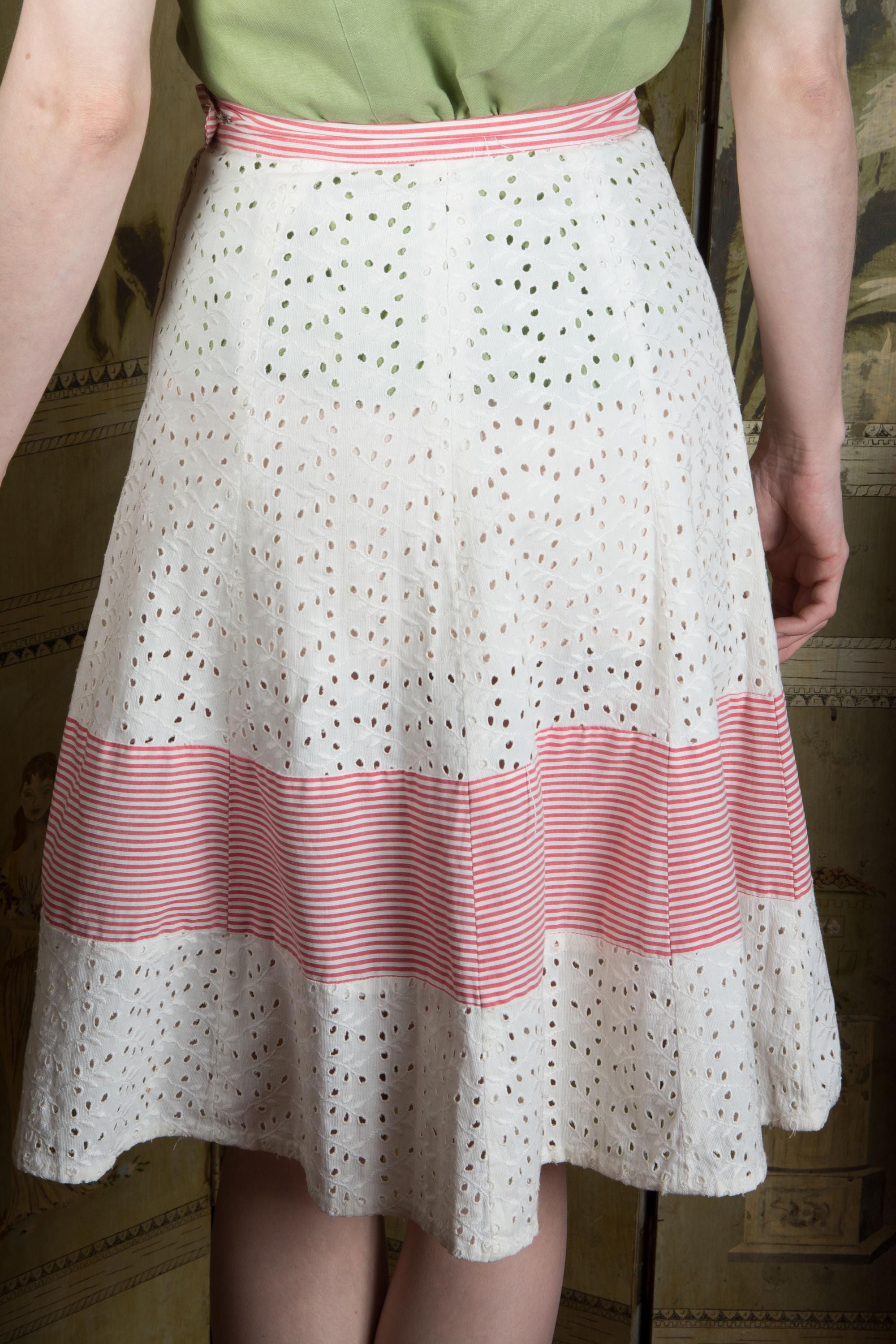 1940s Skirt - Charming Cotton Vintage 40s Eyelet Skirt Banded with Red and White Stripes