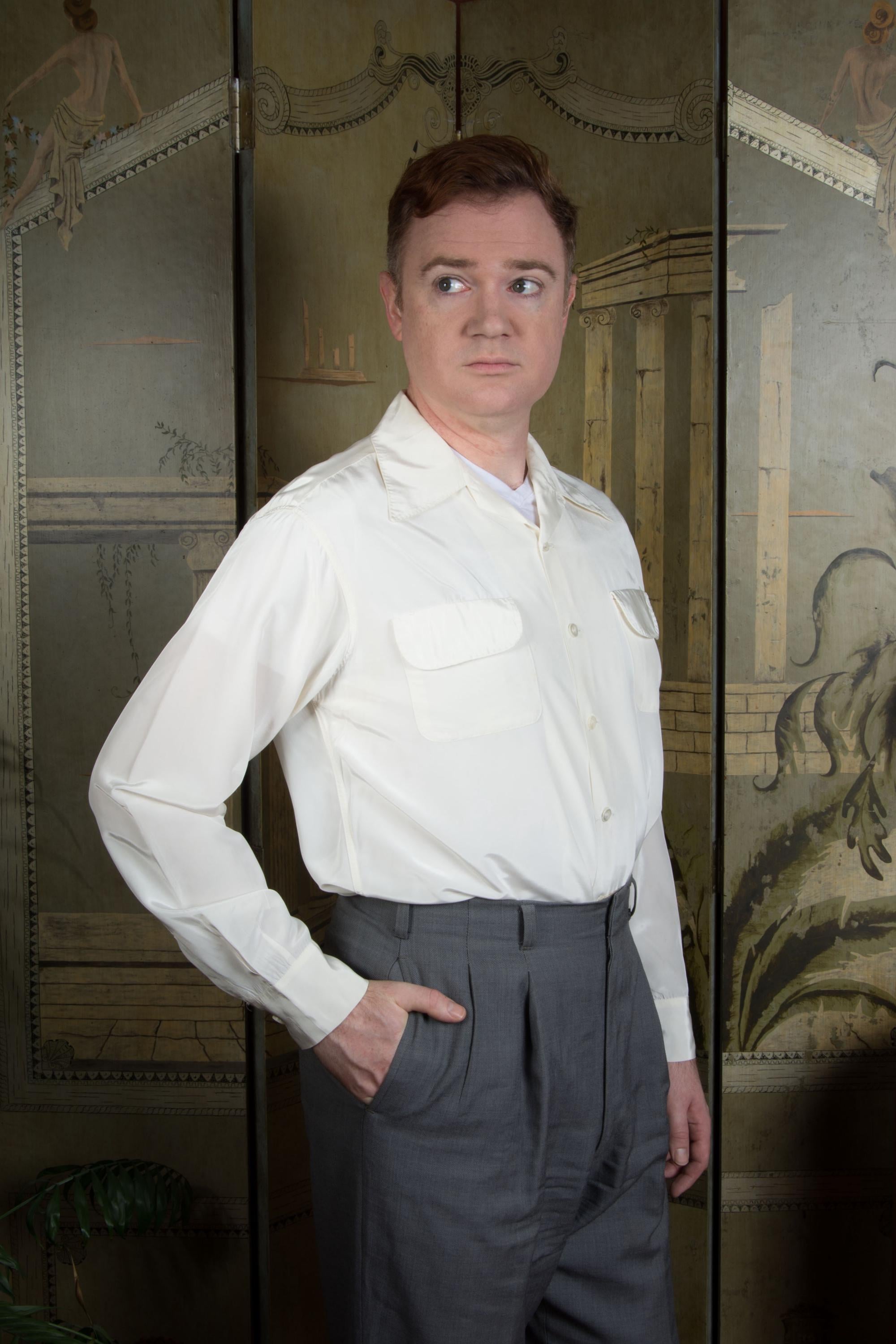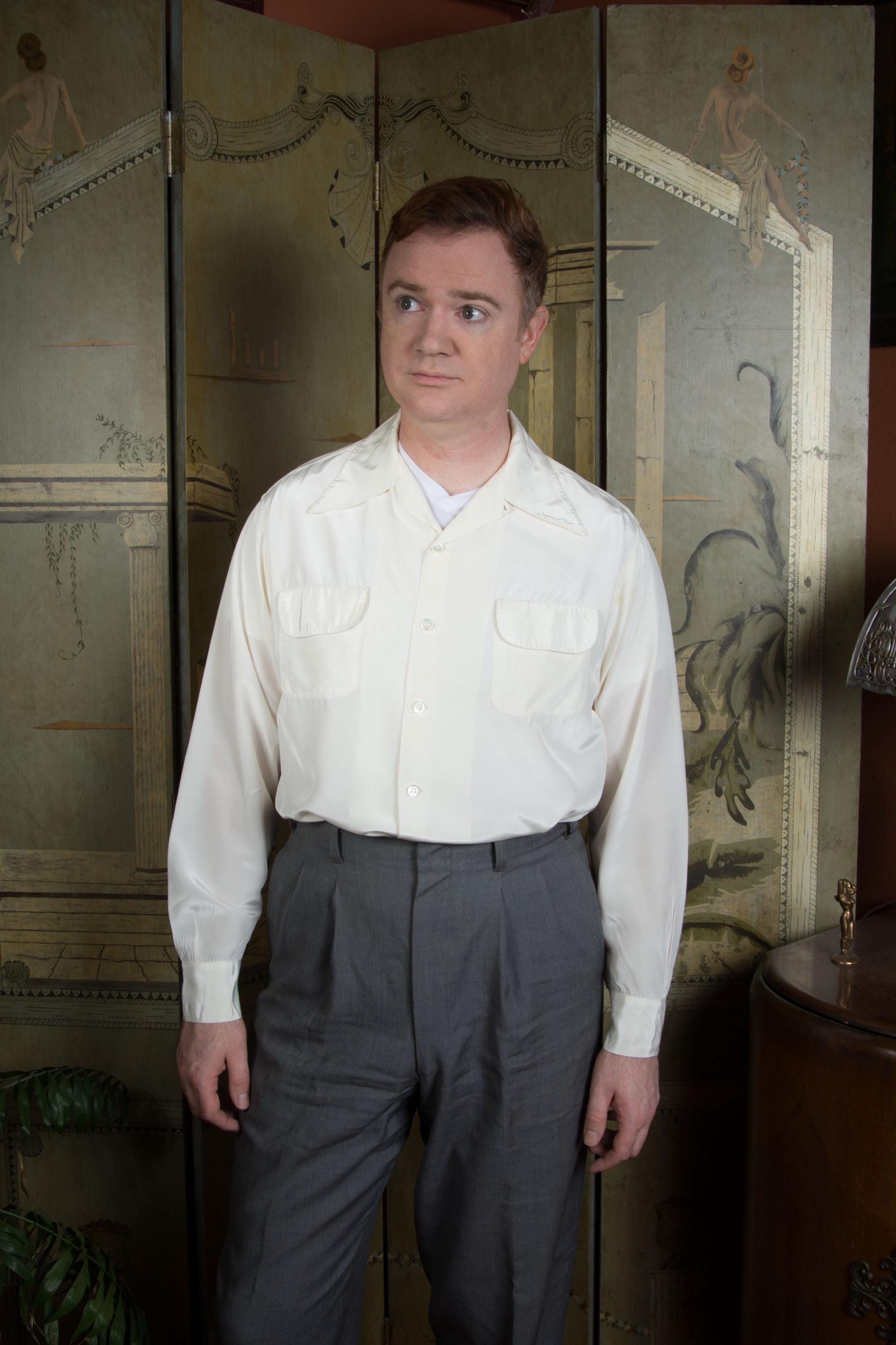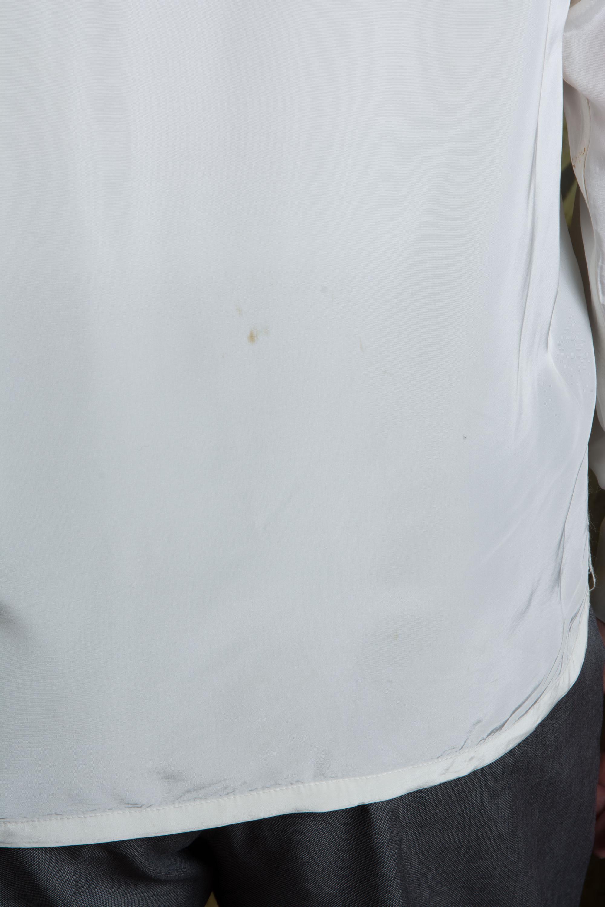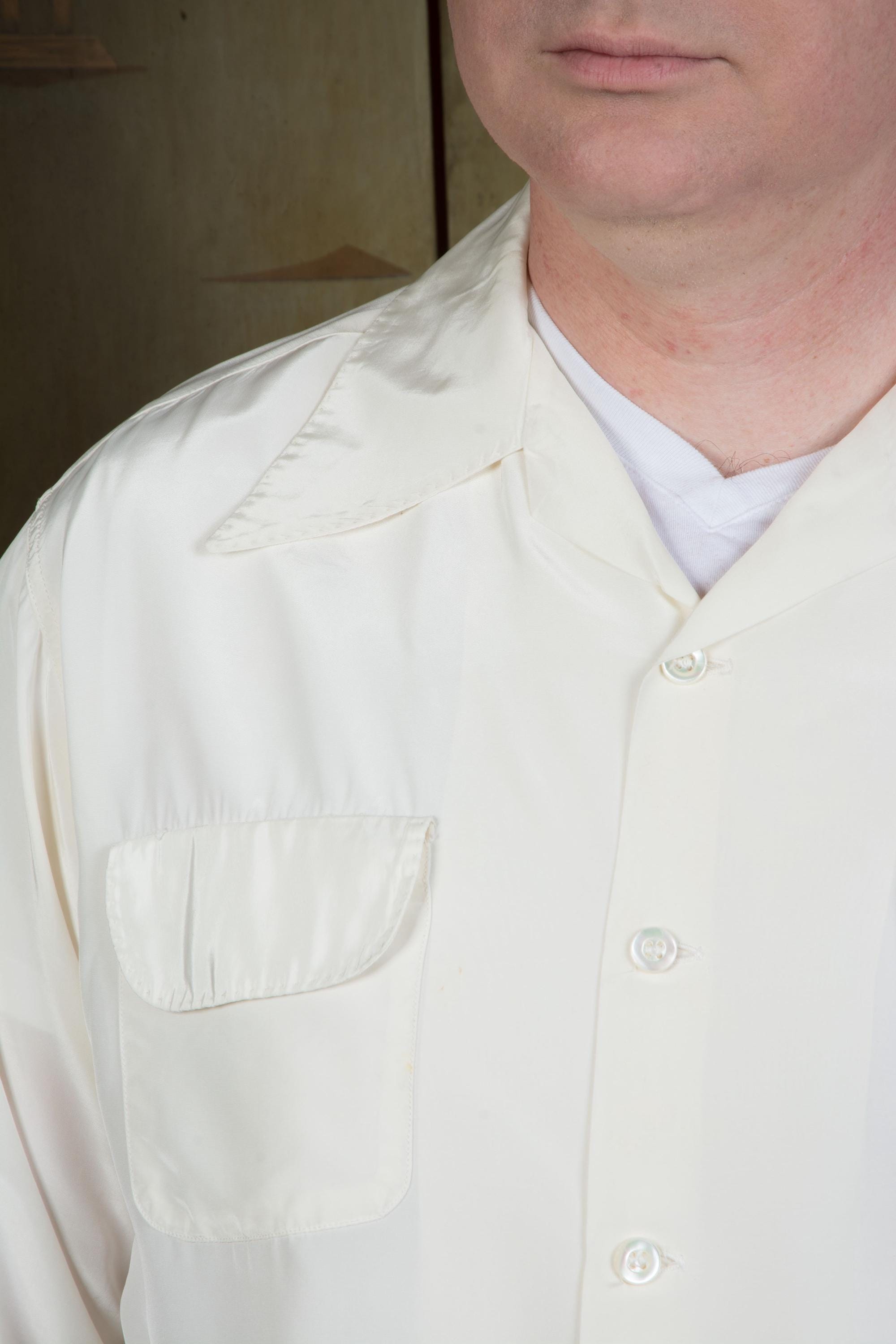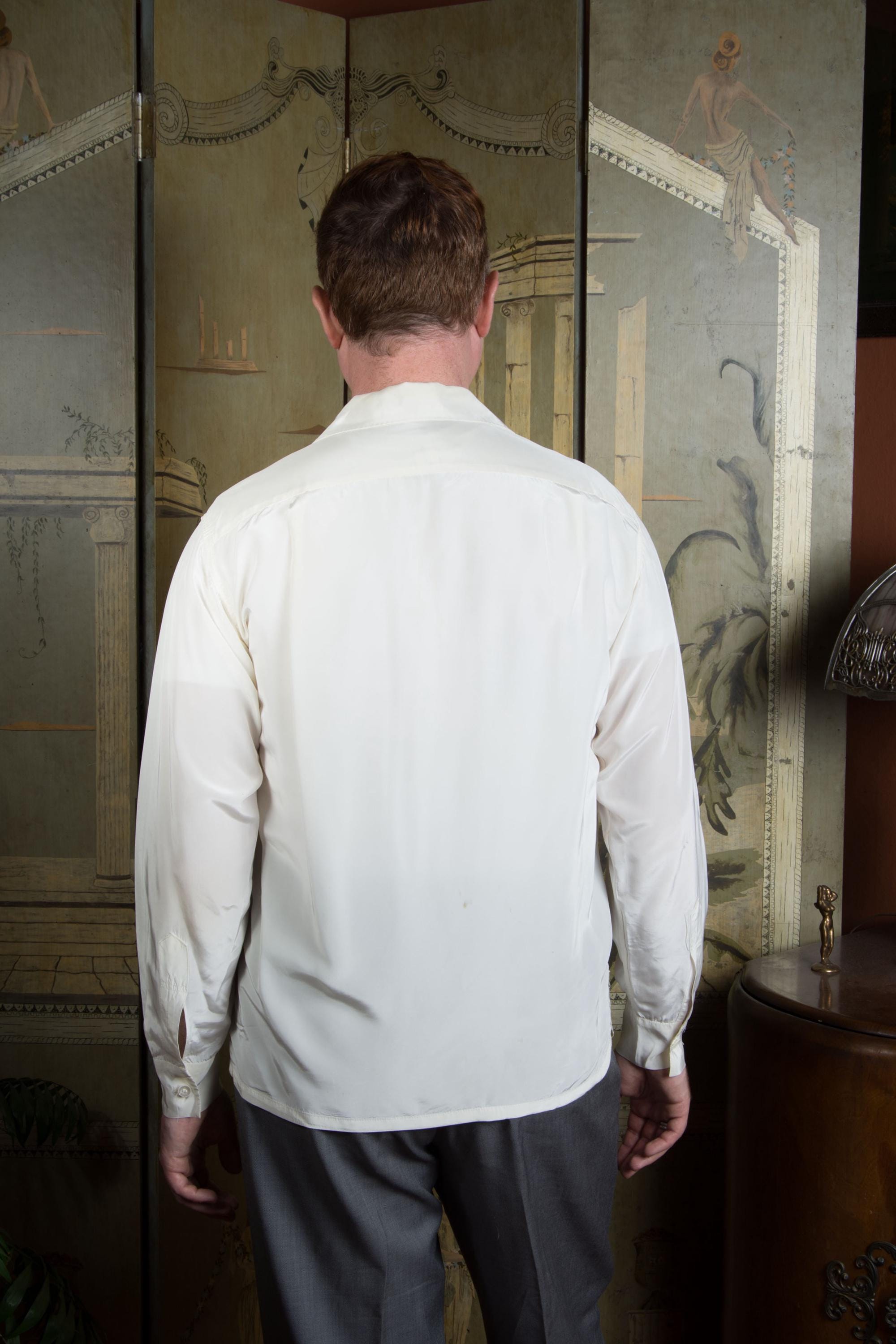 Vintage 1940s Lustrous Nylon Blend Loop Collar Flap Pocket Long Sleeve Sportswear Shirt in Crisp White with Dagger Collar