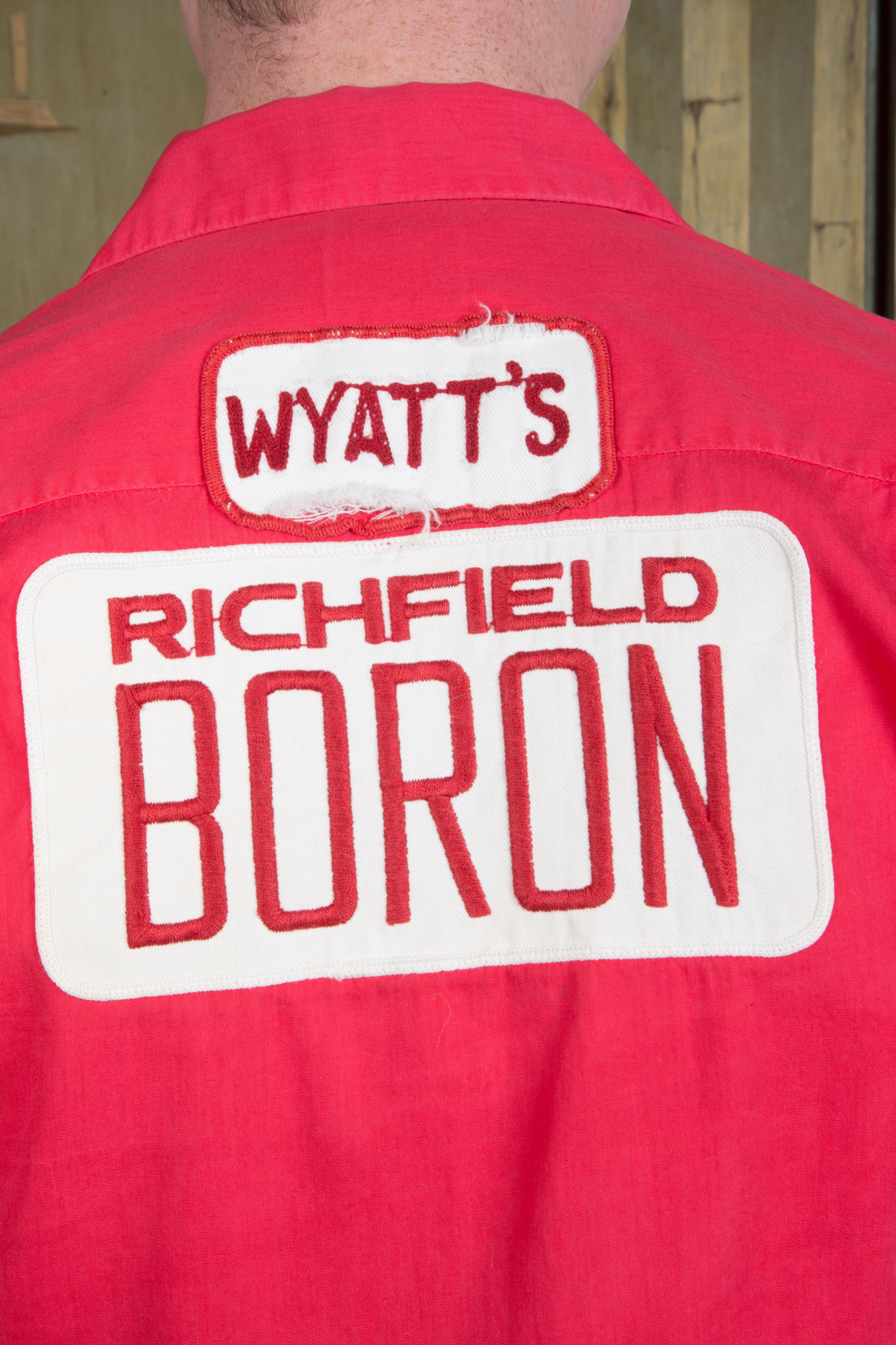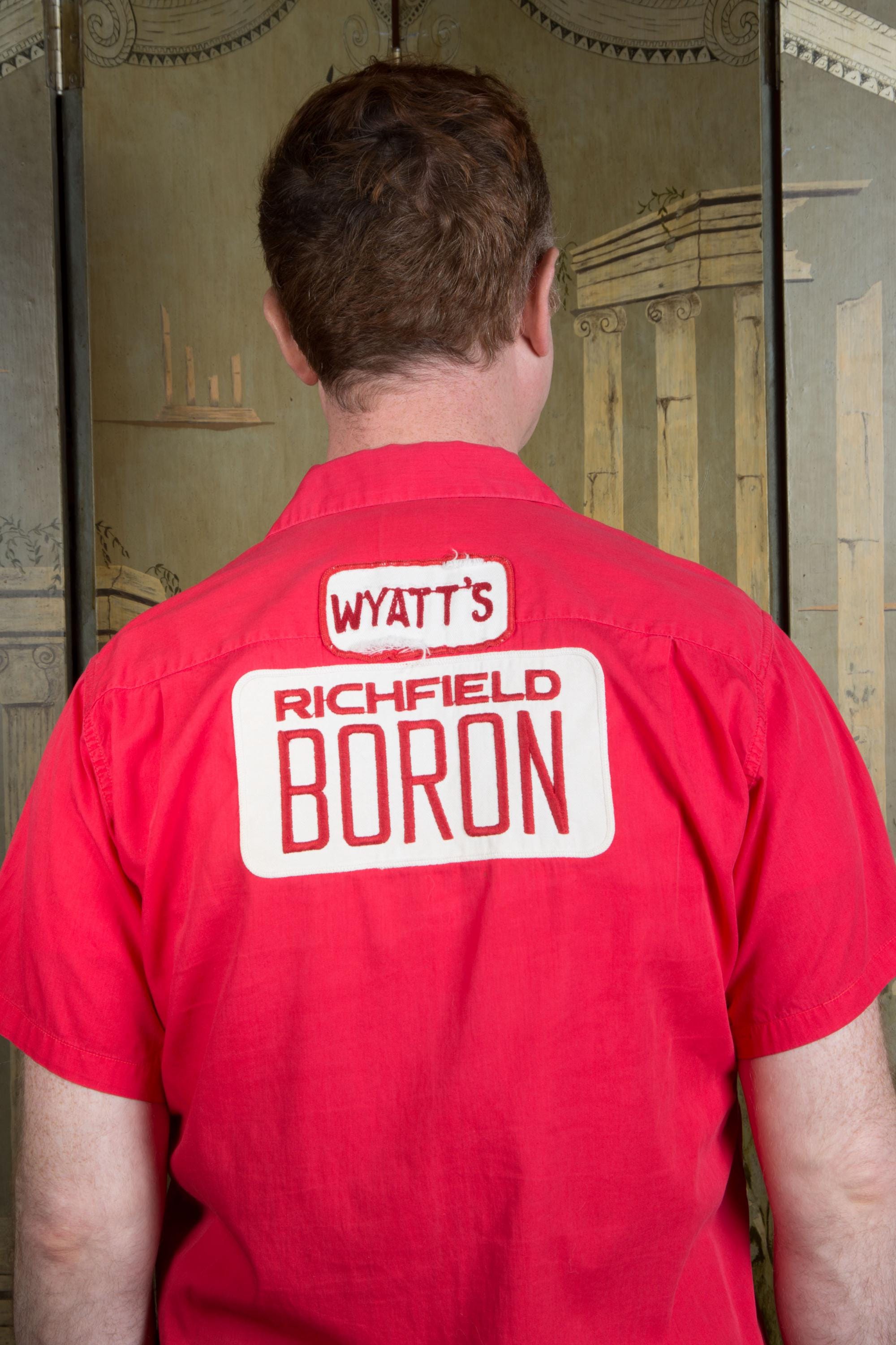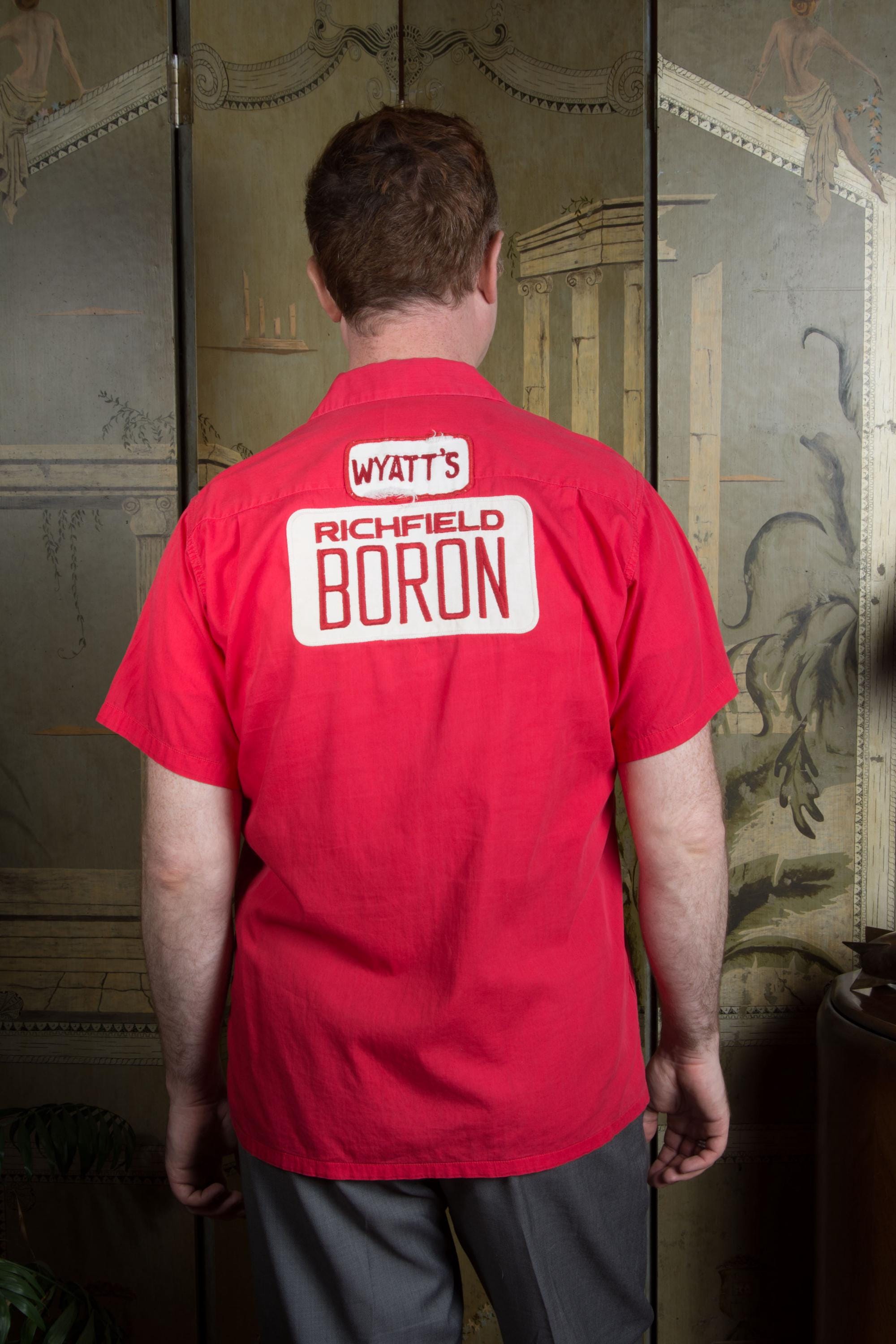 A crisp, sporty cotton uniform shirt by Boss Commercial Uniform Coo made in the late 1950s or early 60s. The color is a cherry red cotton. The patch pockets have working buttons! Classic loop style sportswear collar. The back features two patches - "Wyatt's" and "Richfield Boron."