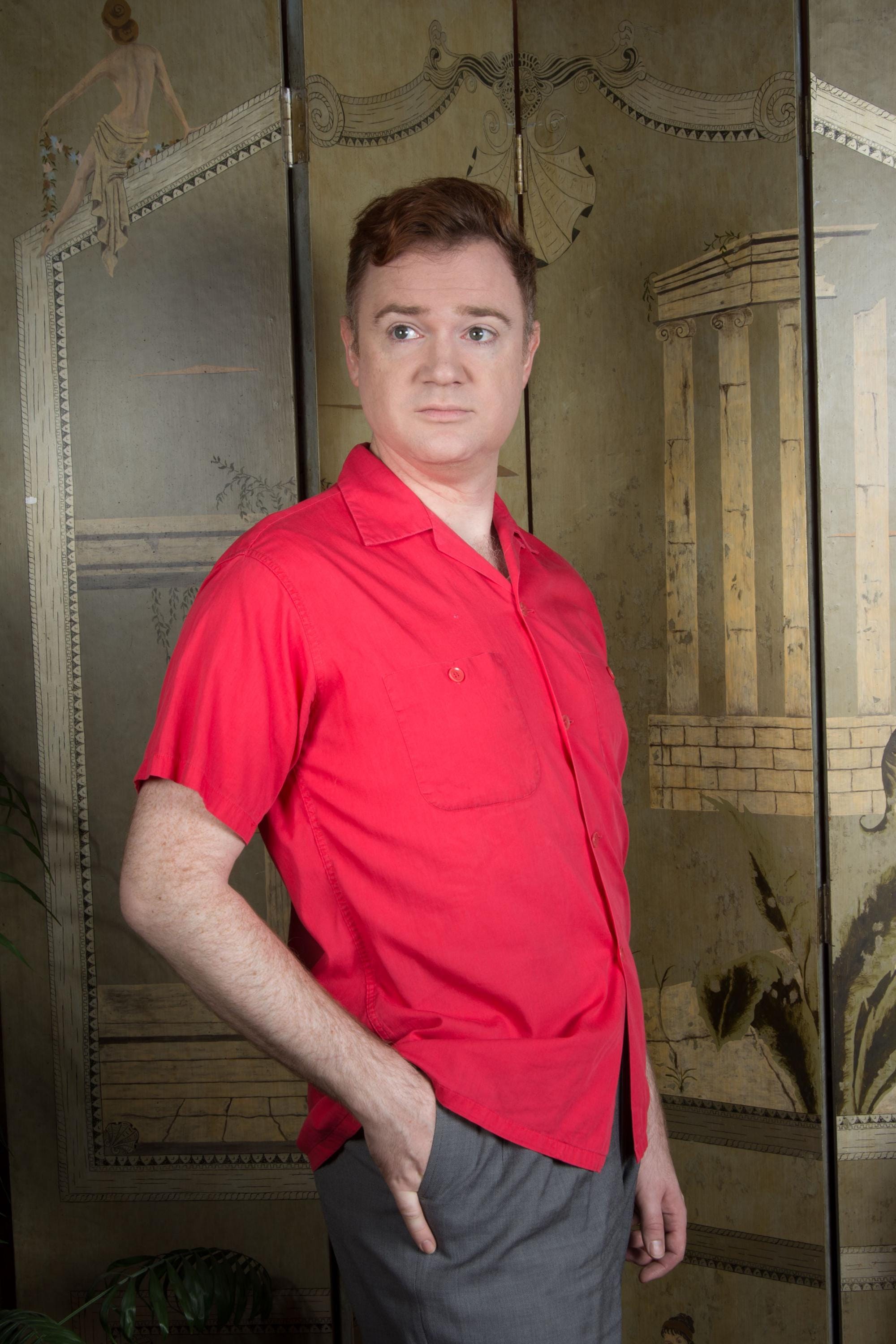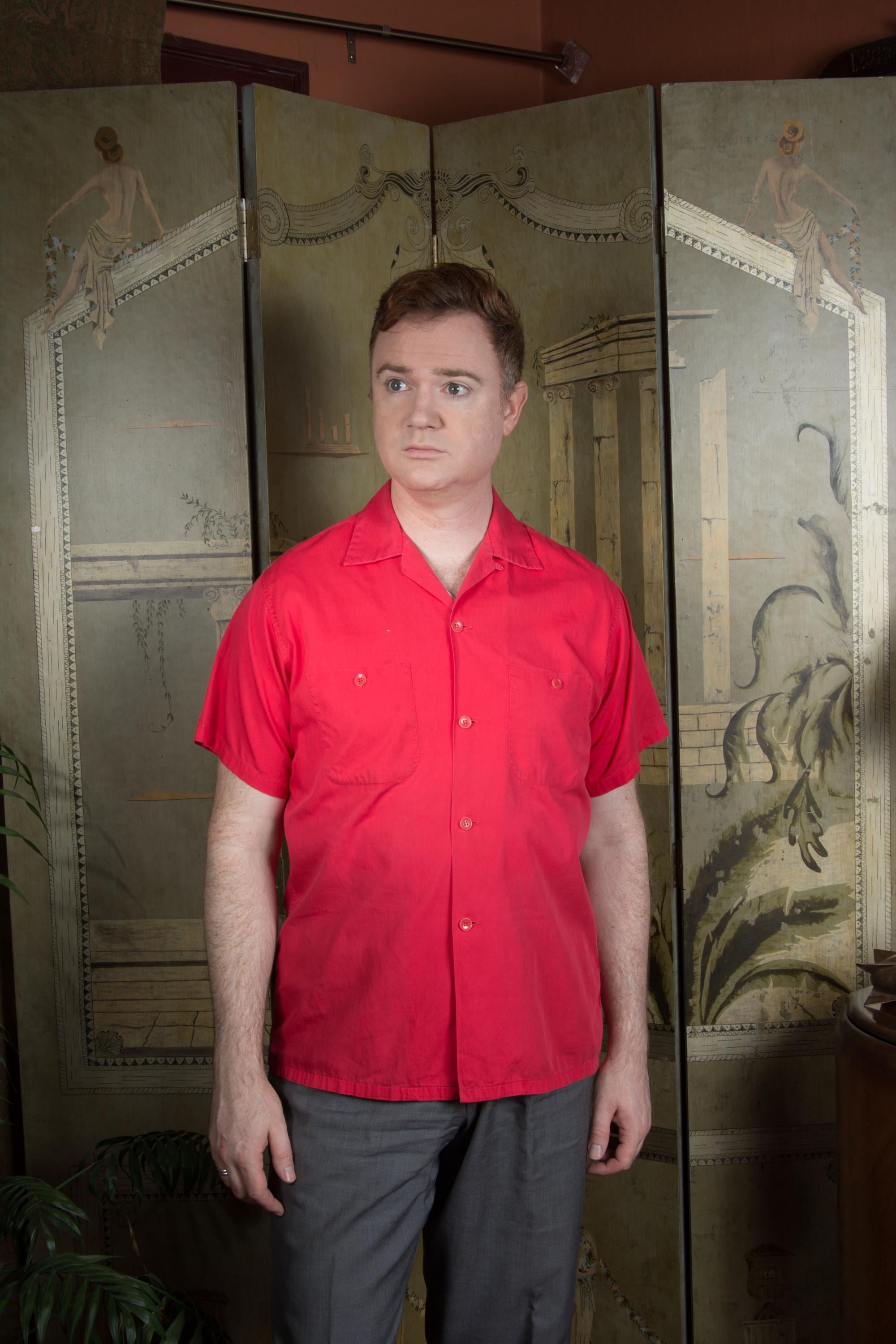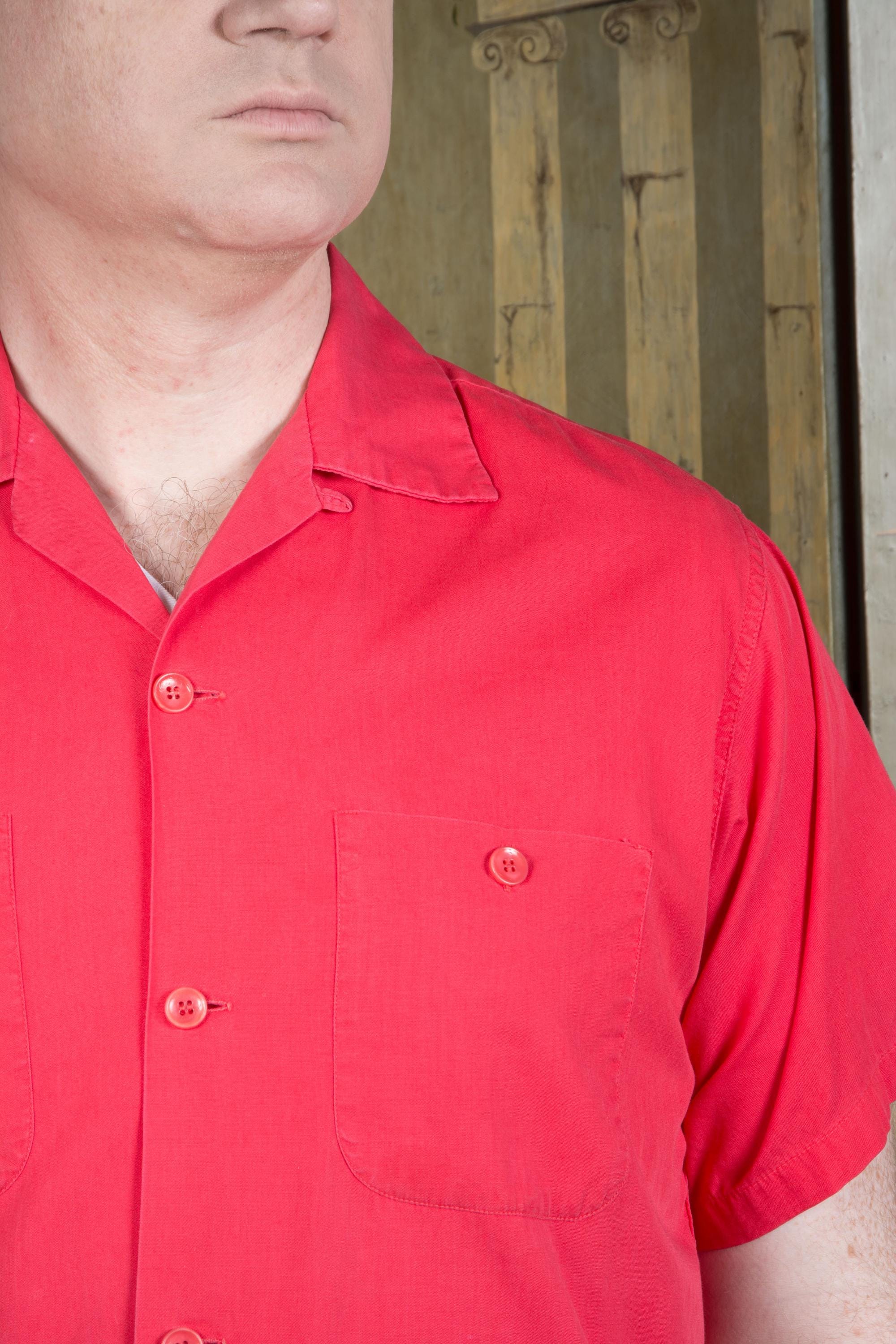A crisp, sporty cotton uniform shirt by Boss Commercial Uniform Coo made in the late 1950s or early 60s. The color is a cherry red cotton. The patch pockets have working buttons! Classic loop style sportswear collar. The back features two patches - "Wyatt's" and "Richfield Boron."