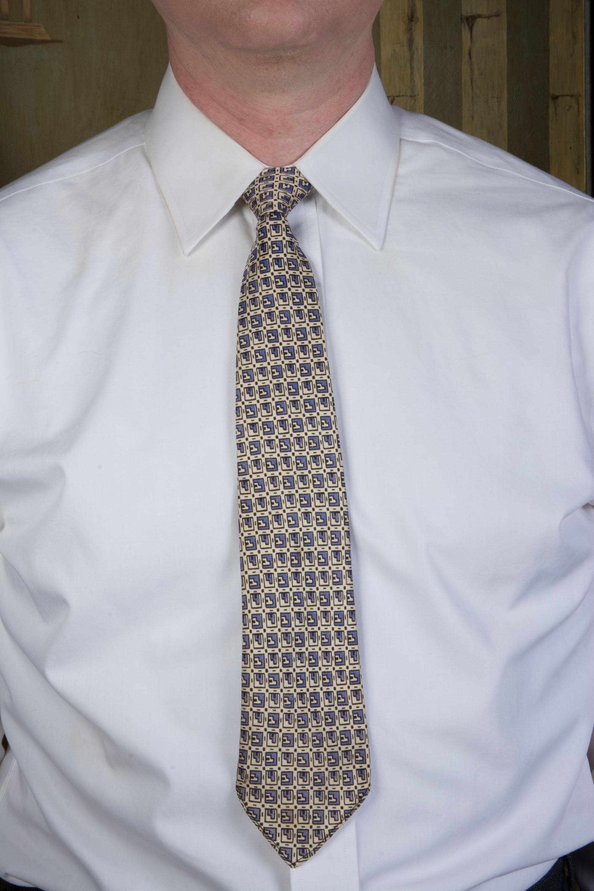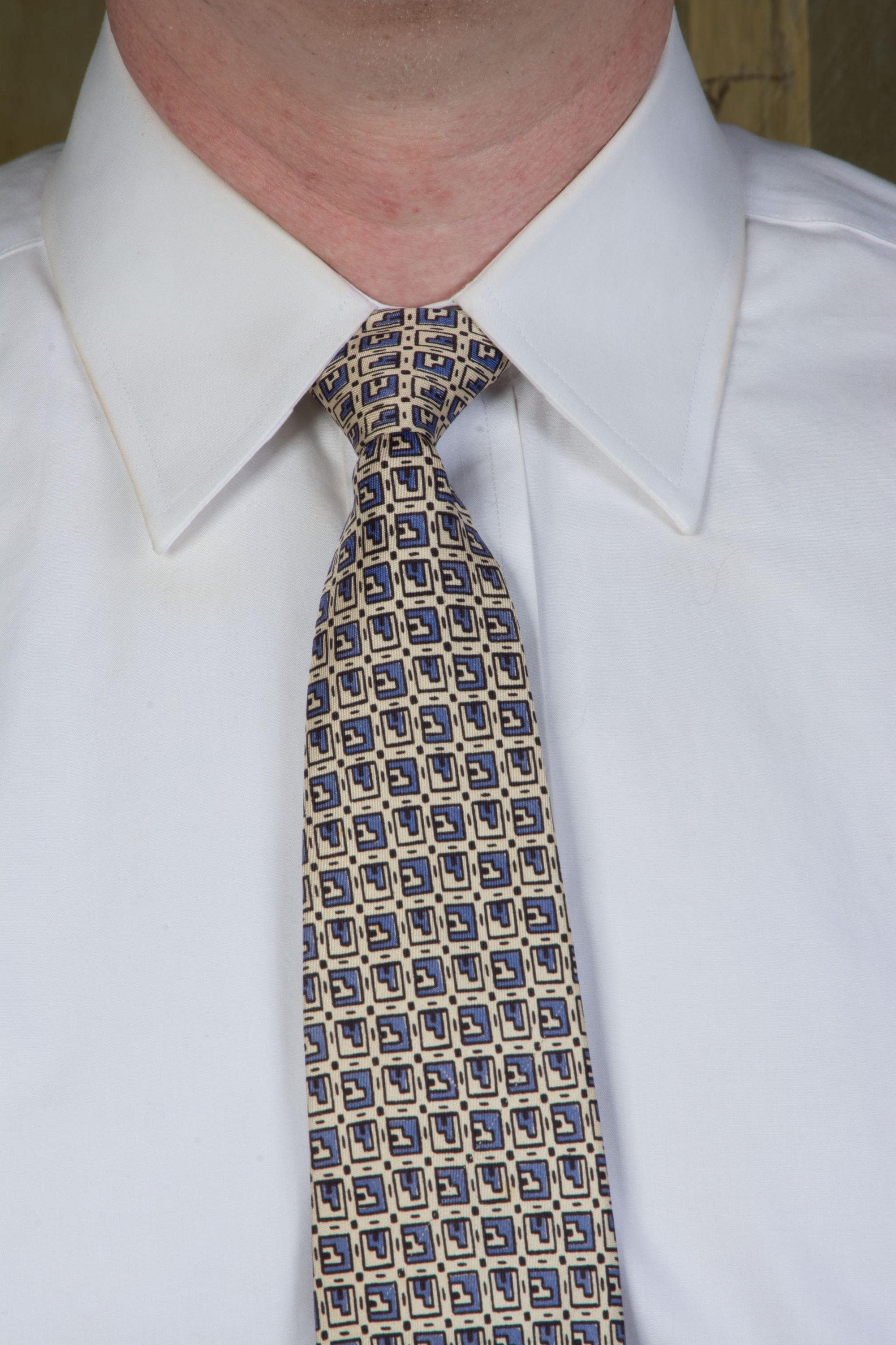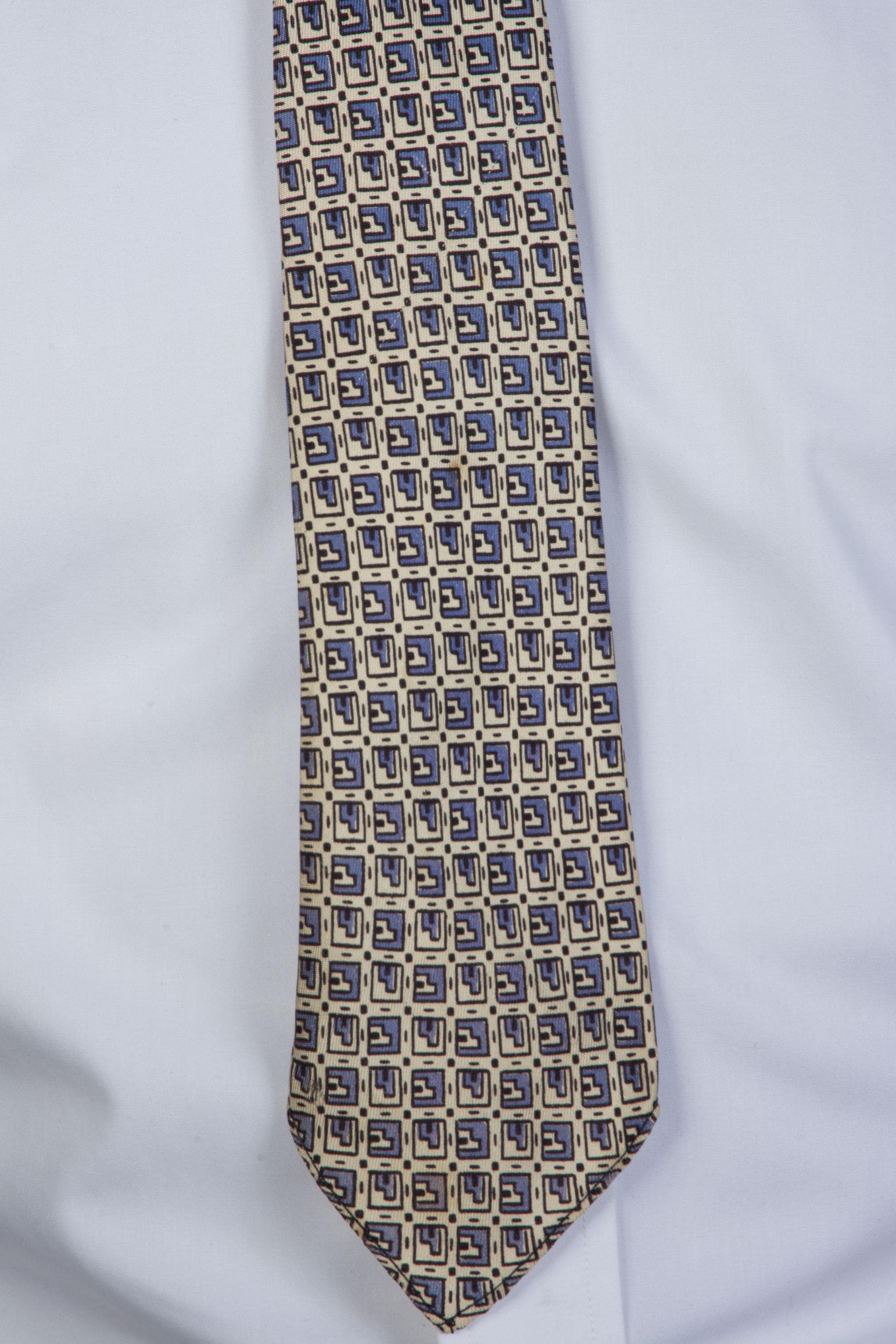 This tie wears beautifully. There are two small spots midway down, and one faint yellow area at the bottom of the blade, but it's REALLY hard to see. Has not been dry cleaned.