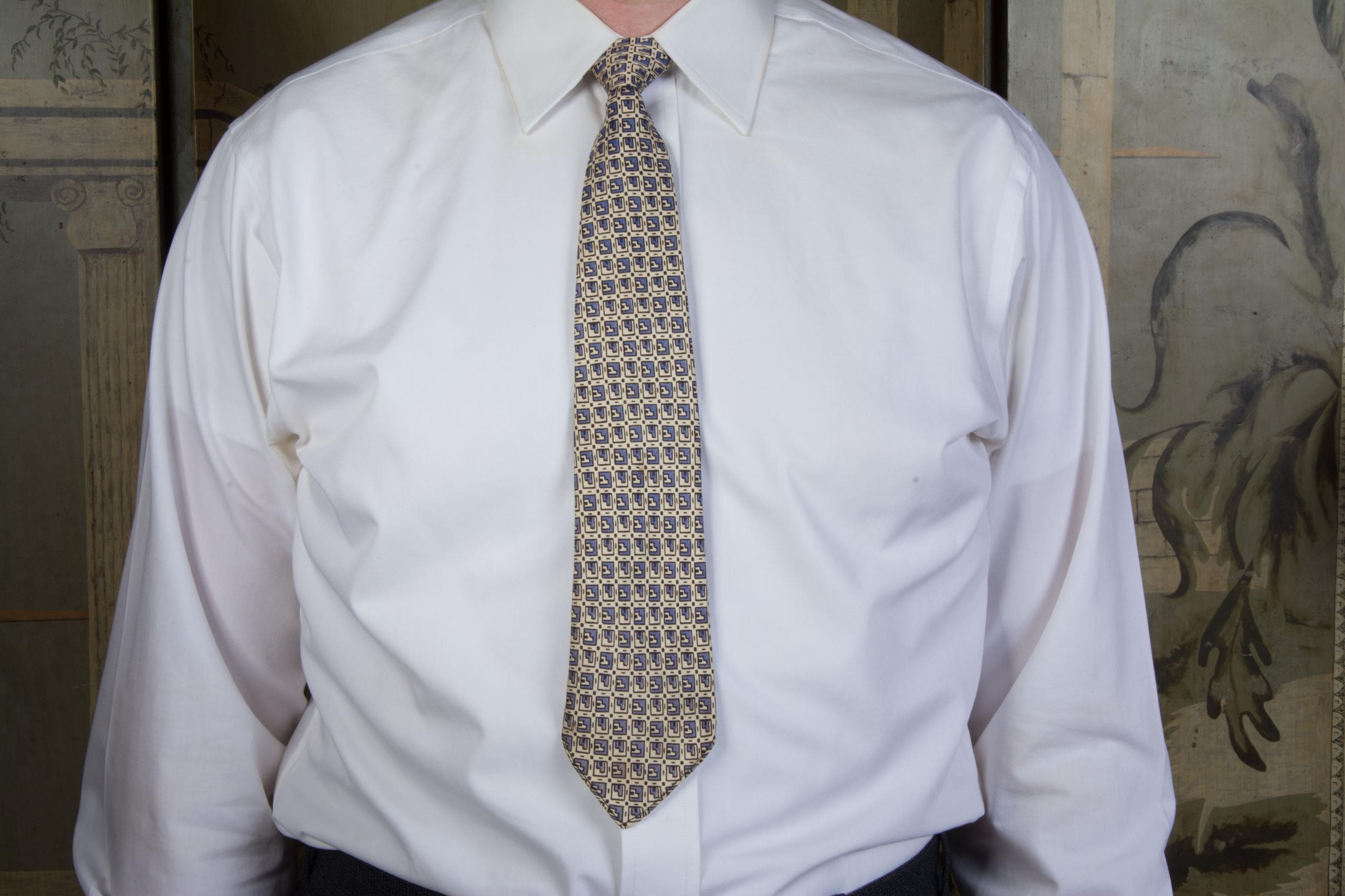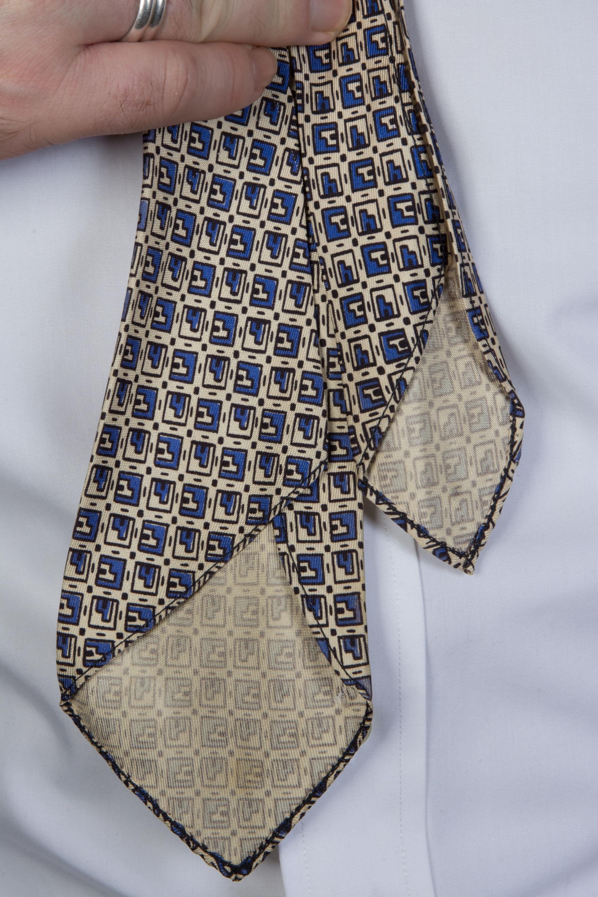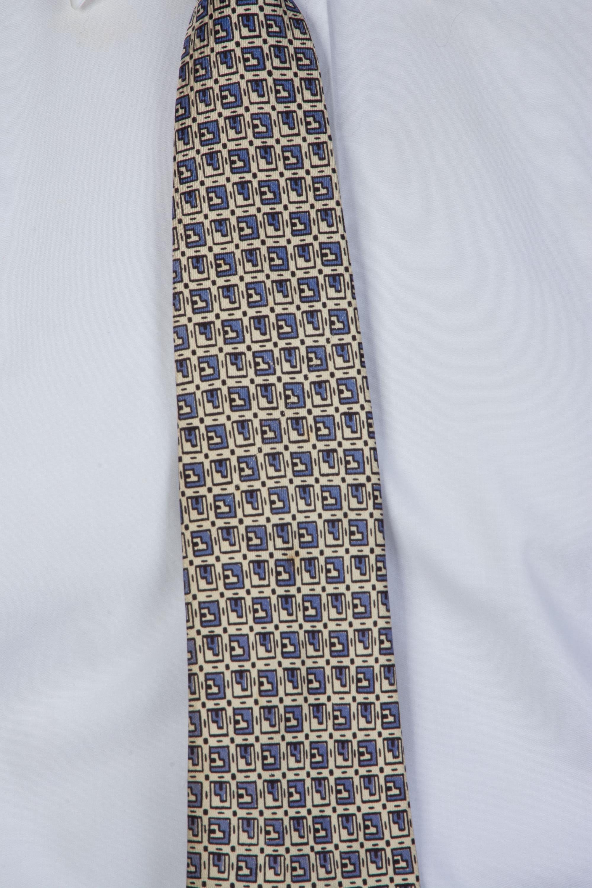 A rare early tie, elegant in soft silk. This art deco design feels INCREDIBLY modern - it's a print I could easily see made by a high end brand today. This is one of three that I actually found years ago in deadstock condition - I sold the yellow then, and the red and blue have been consigned back to me a decade later! Bias cut with asymmetric folds and unlined, with a very lightweight interfacing, this early tie is a real treat.