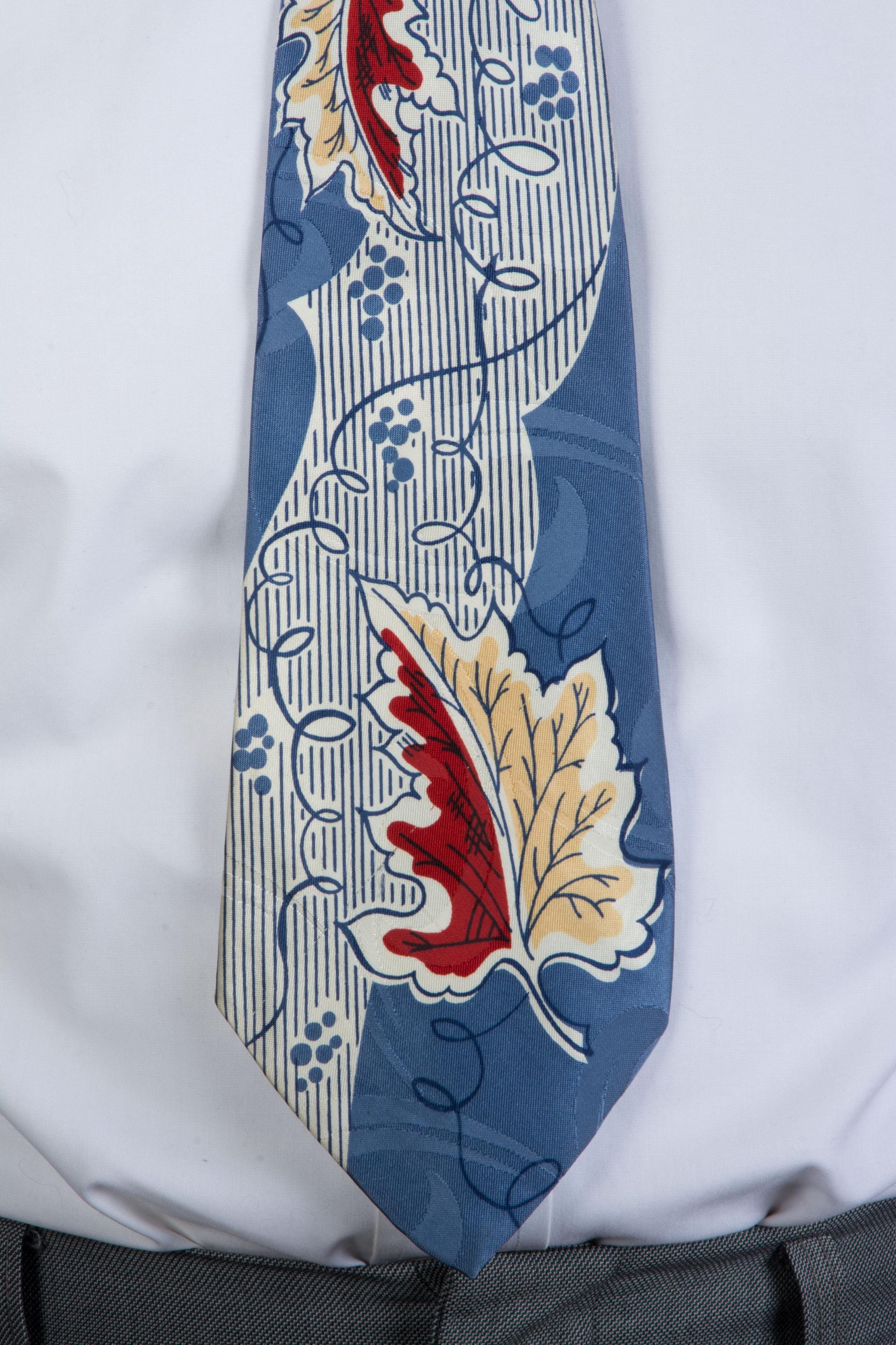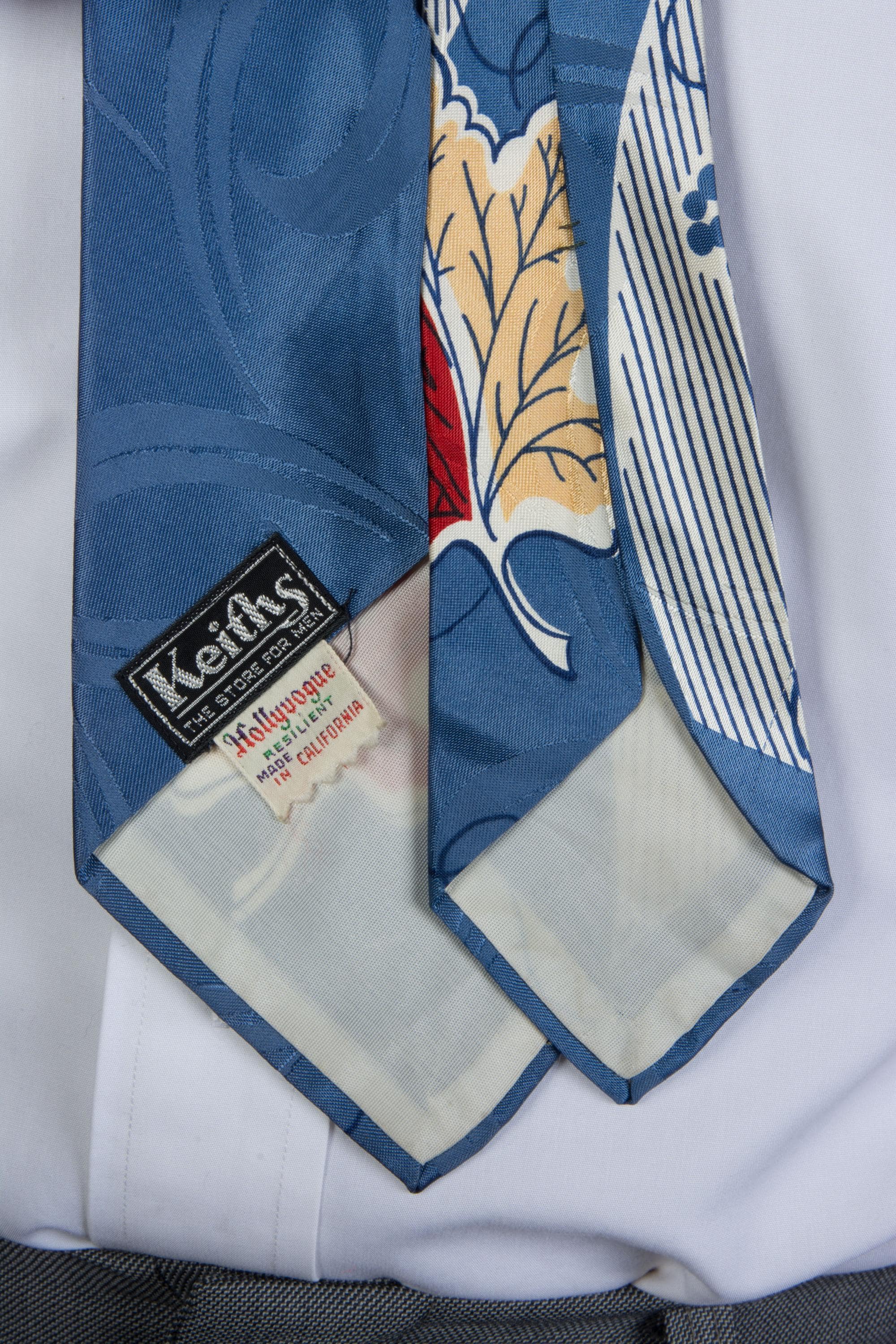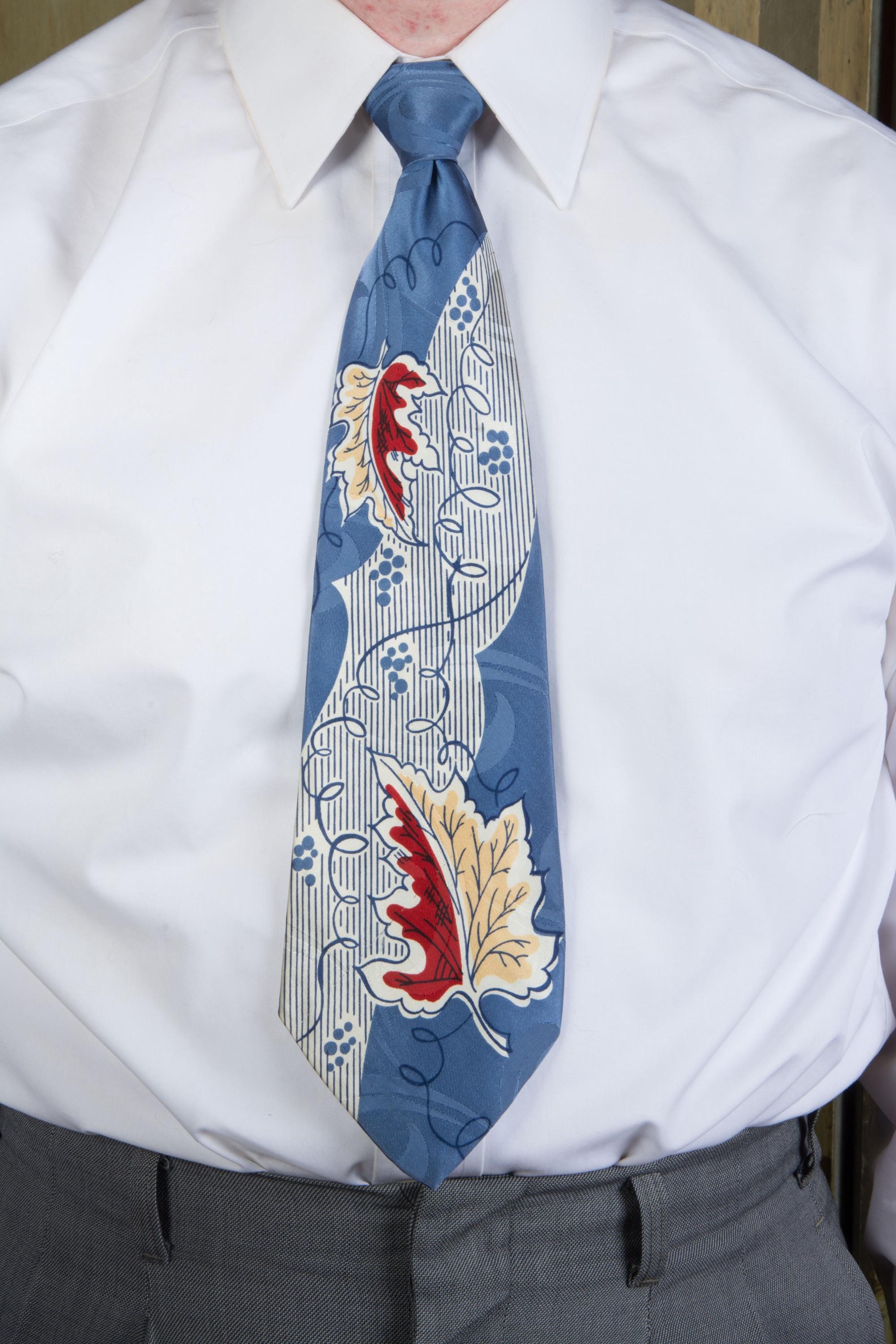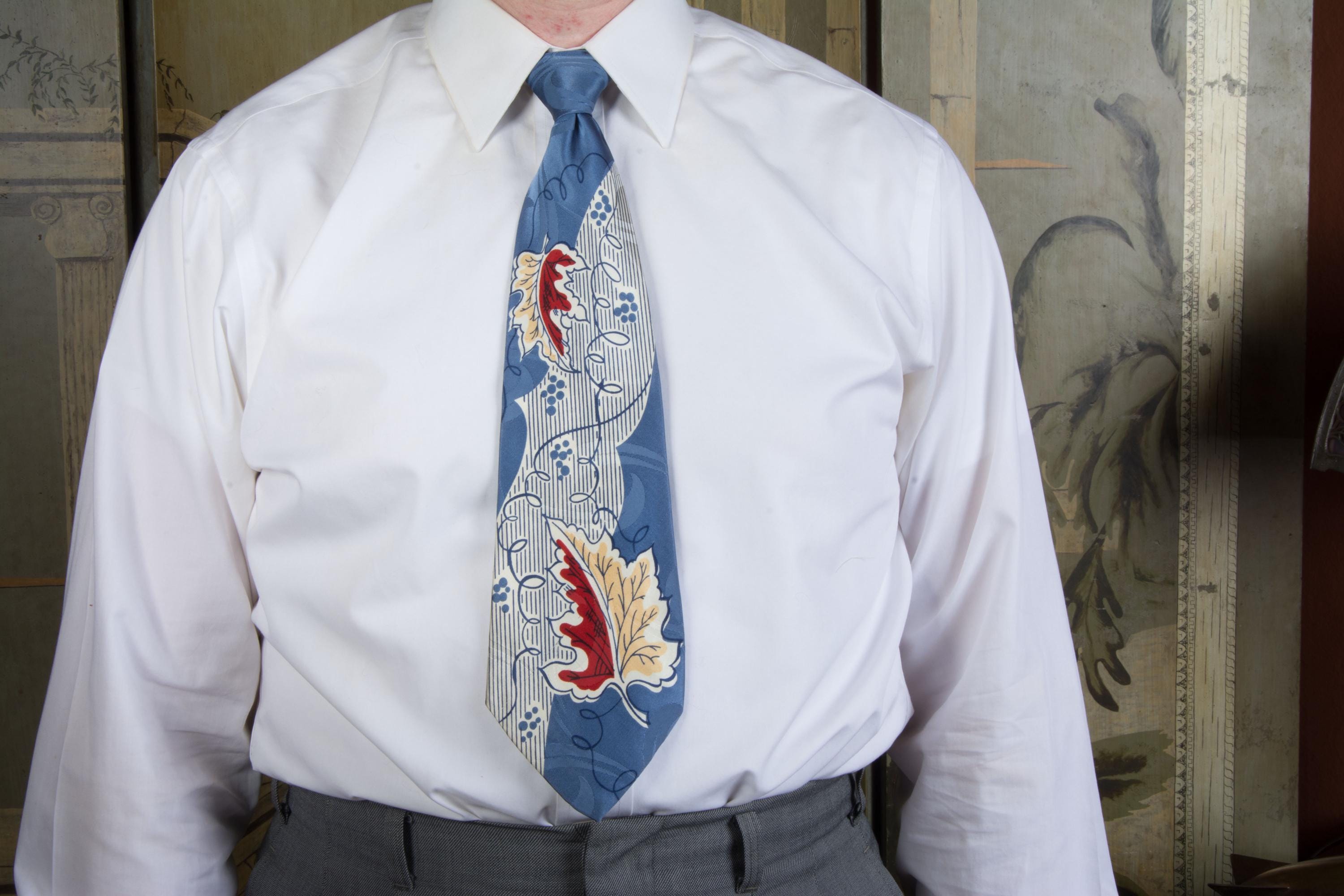 A stunning late 1940s tie with autumnal theme, made of a shiny satin brocade. This is a cool cornflower blue hue printed with oakleaves leaves in brick and yellow over a blue and white pattern of stripes, swirls and dots, all with a swirly brocade behind. Fully lined. A fantastic choice for navy blue or rust hued suits.