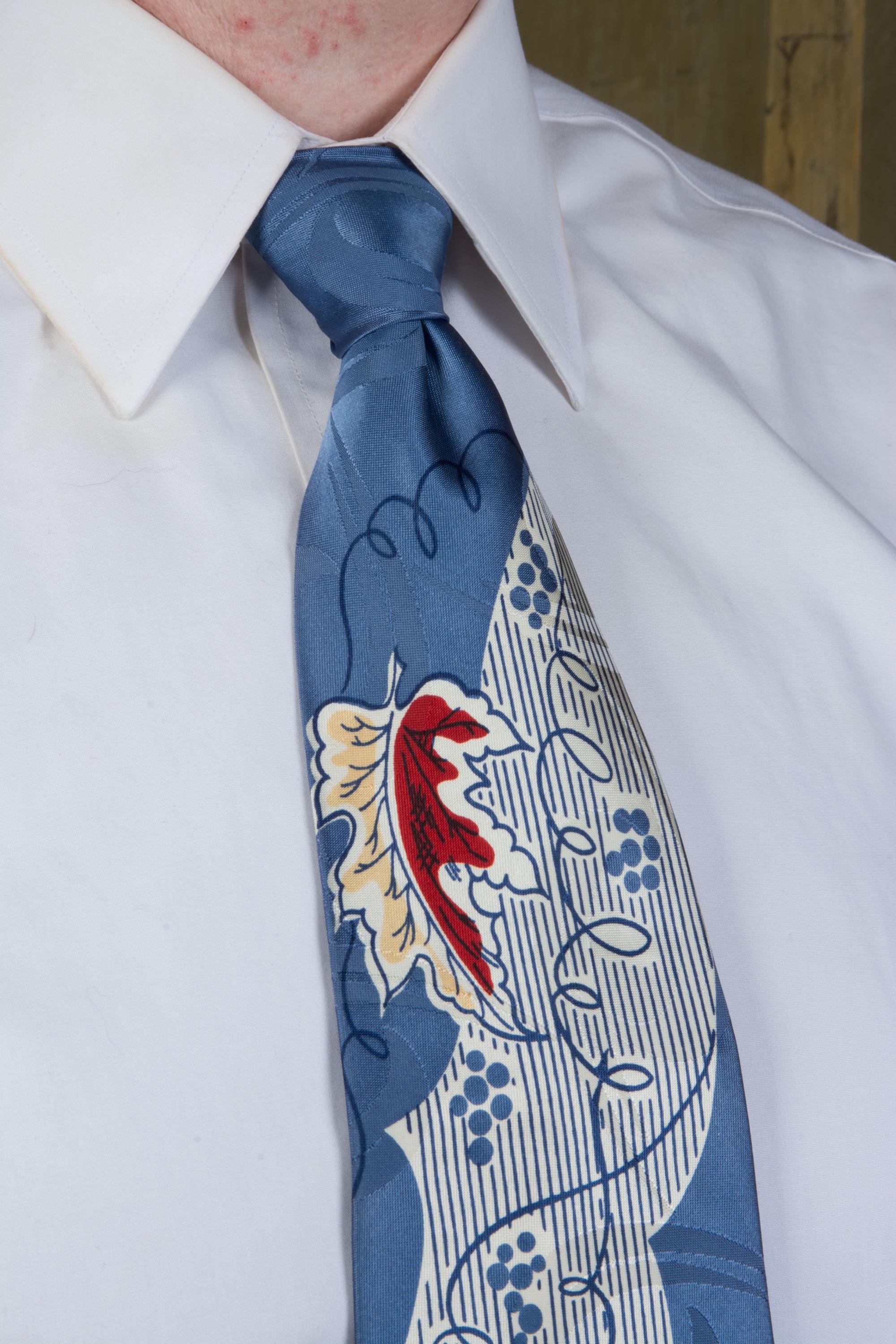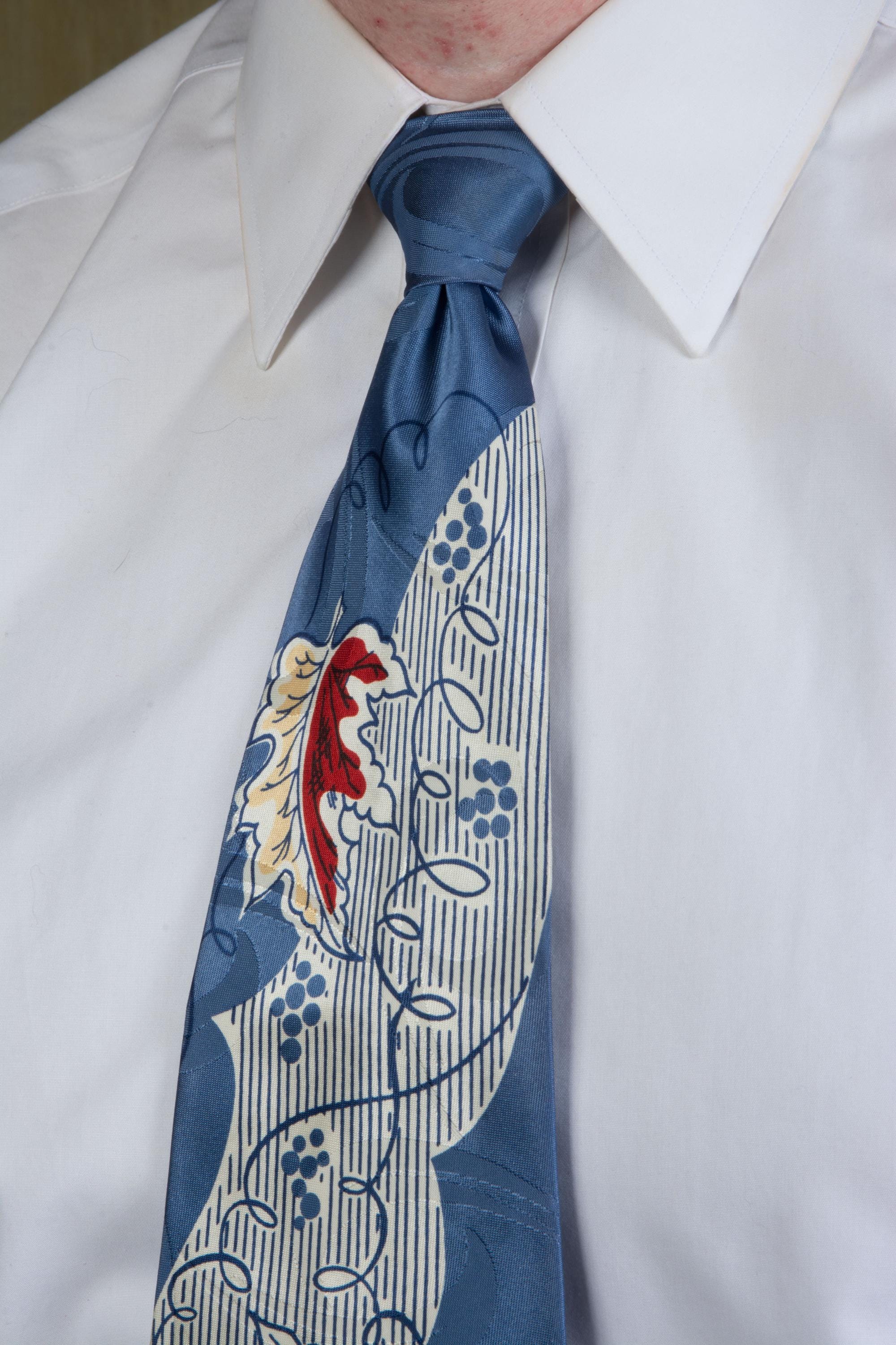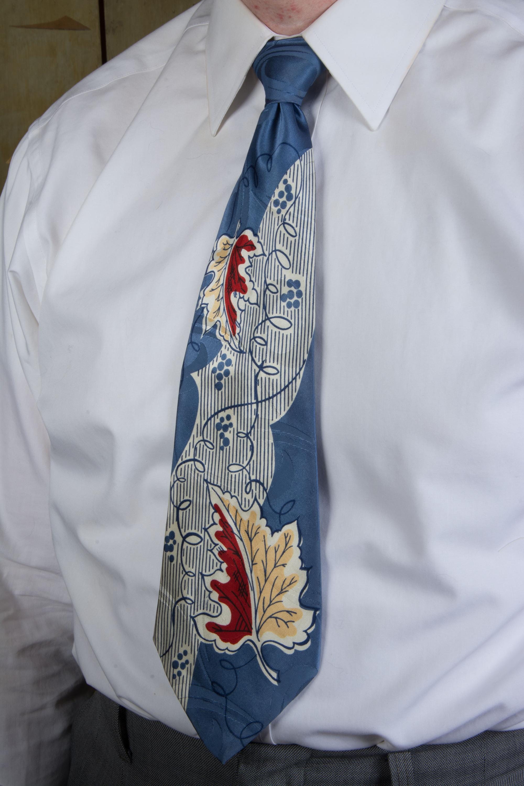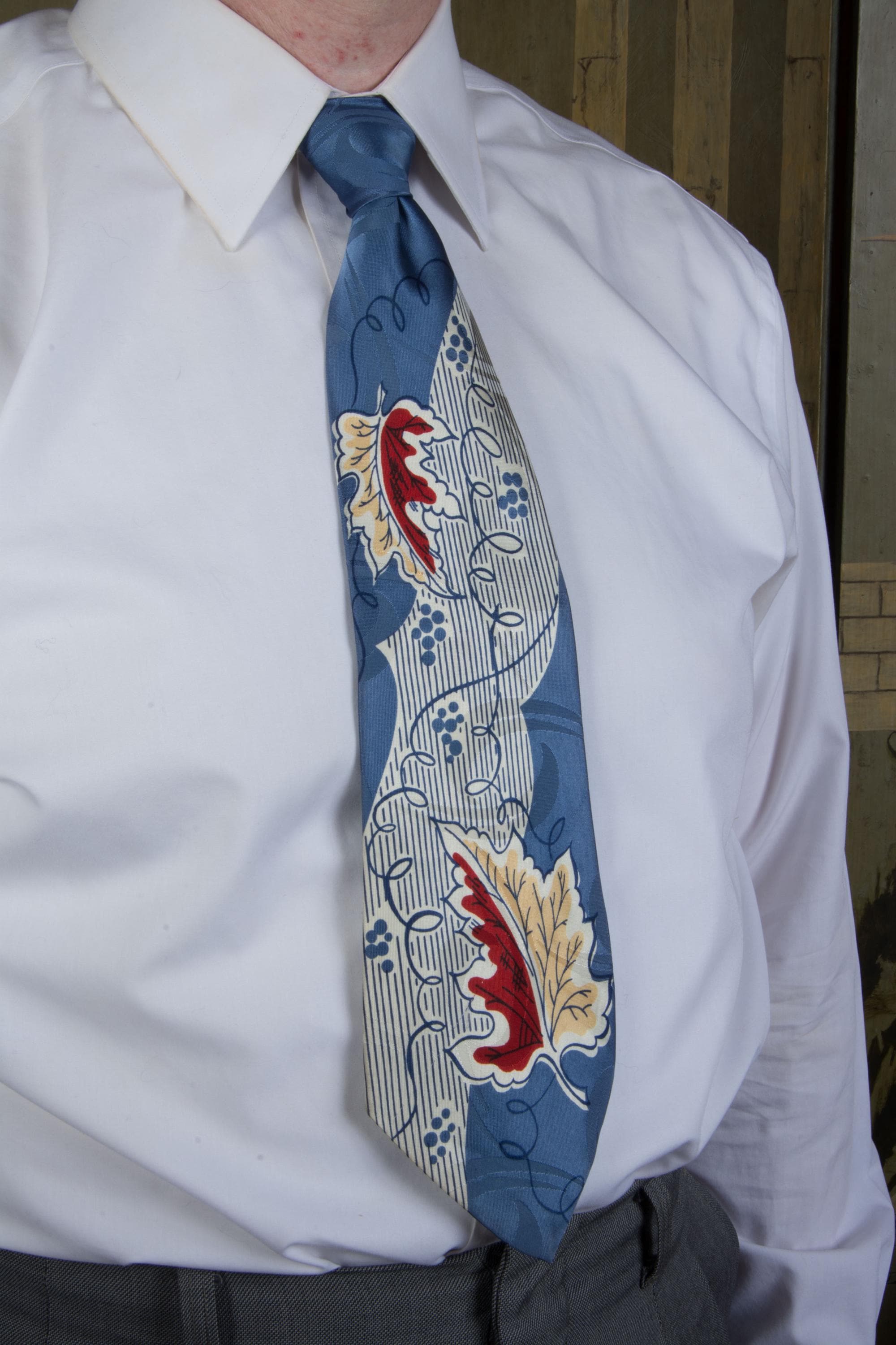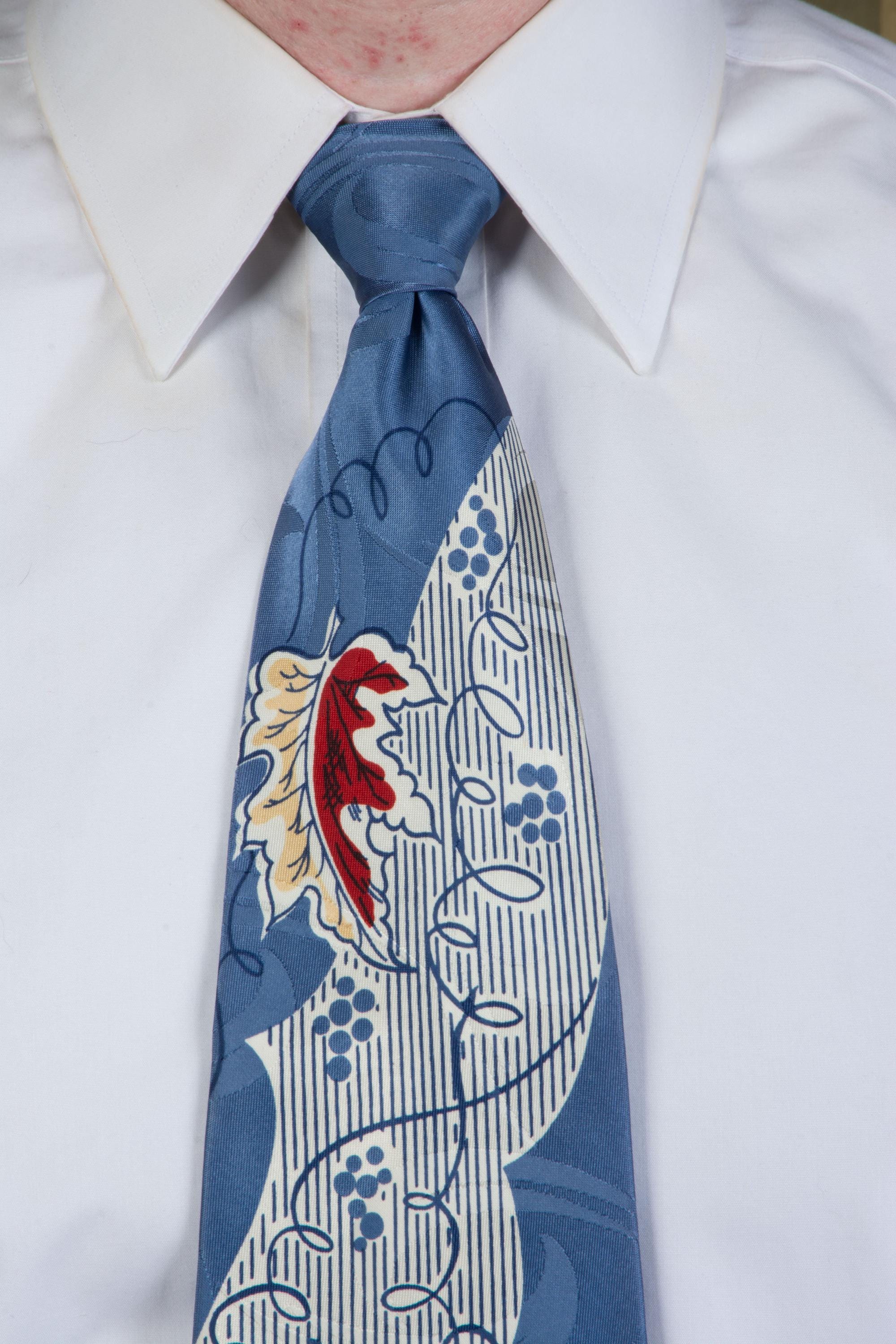 A stunning late 1940s tie with autumnal theme, made of a shiny satin brocade. This is a cool cornflower blue hue printed with oakleaves leaves in brick and yellow over a blue and white pattern of stripes, swirls and dots, all with a swirly brocade behind. Fully lined. A fantastic choice for navy blue or rust hued suits.