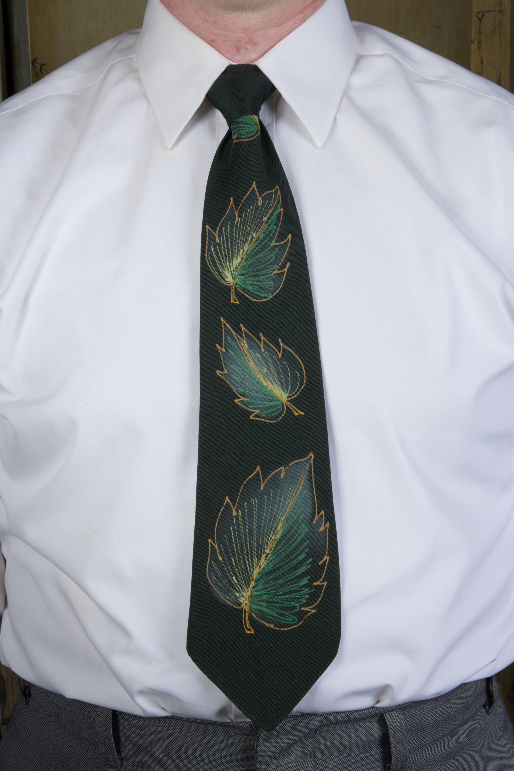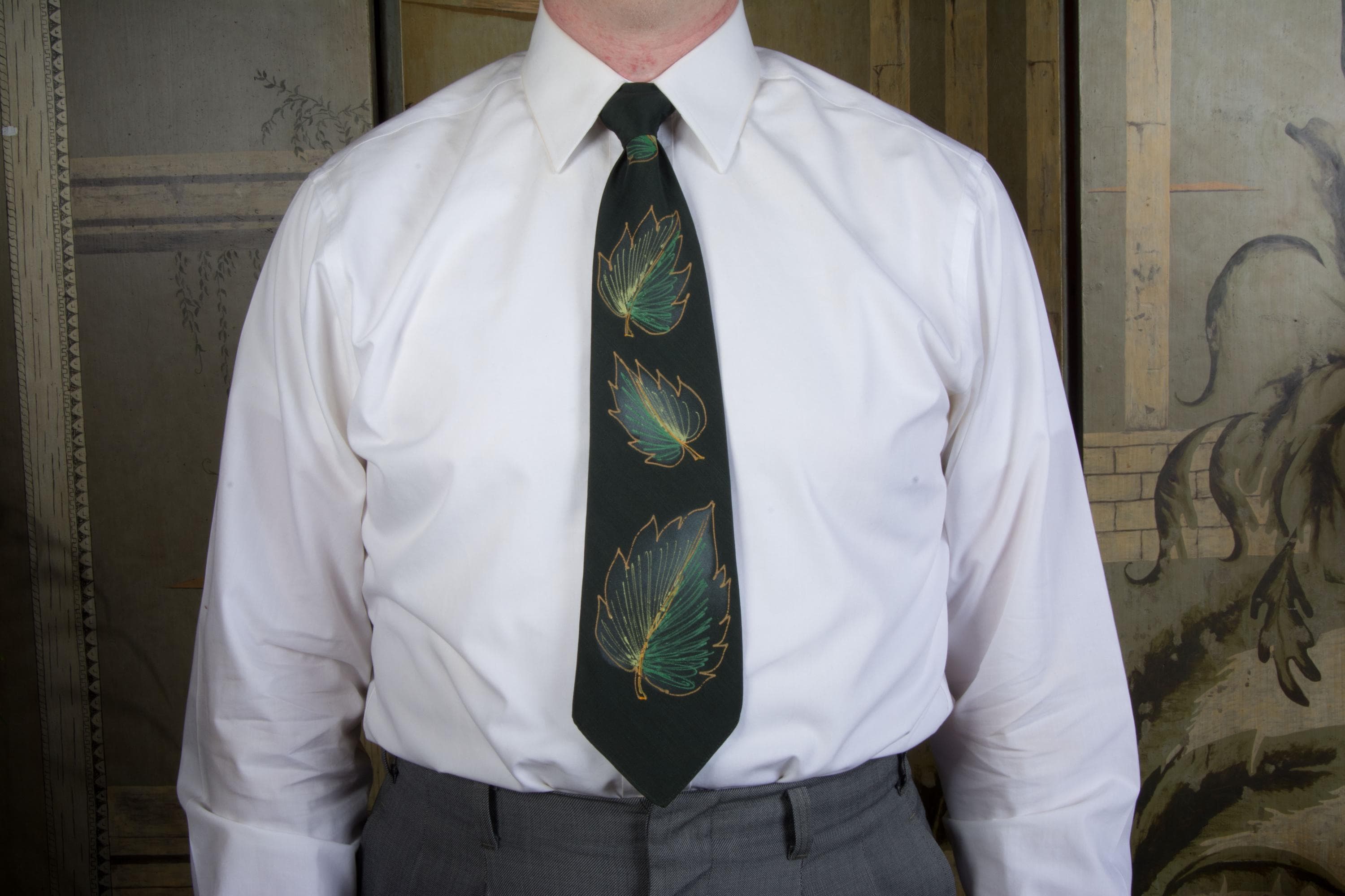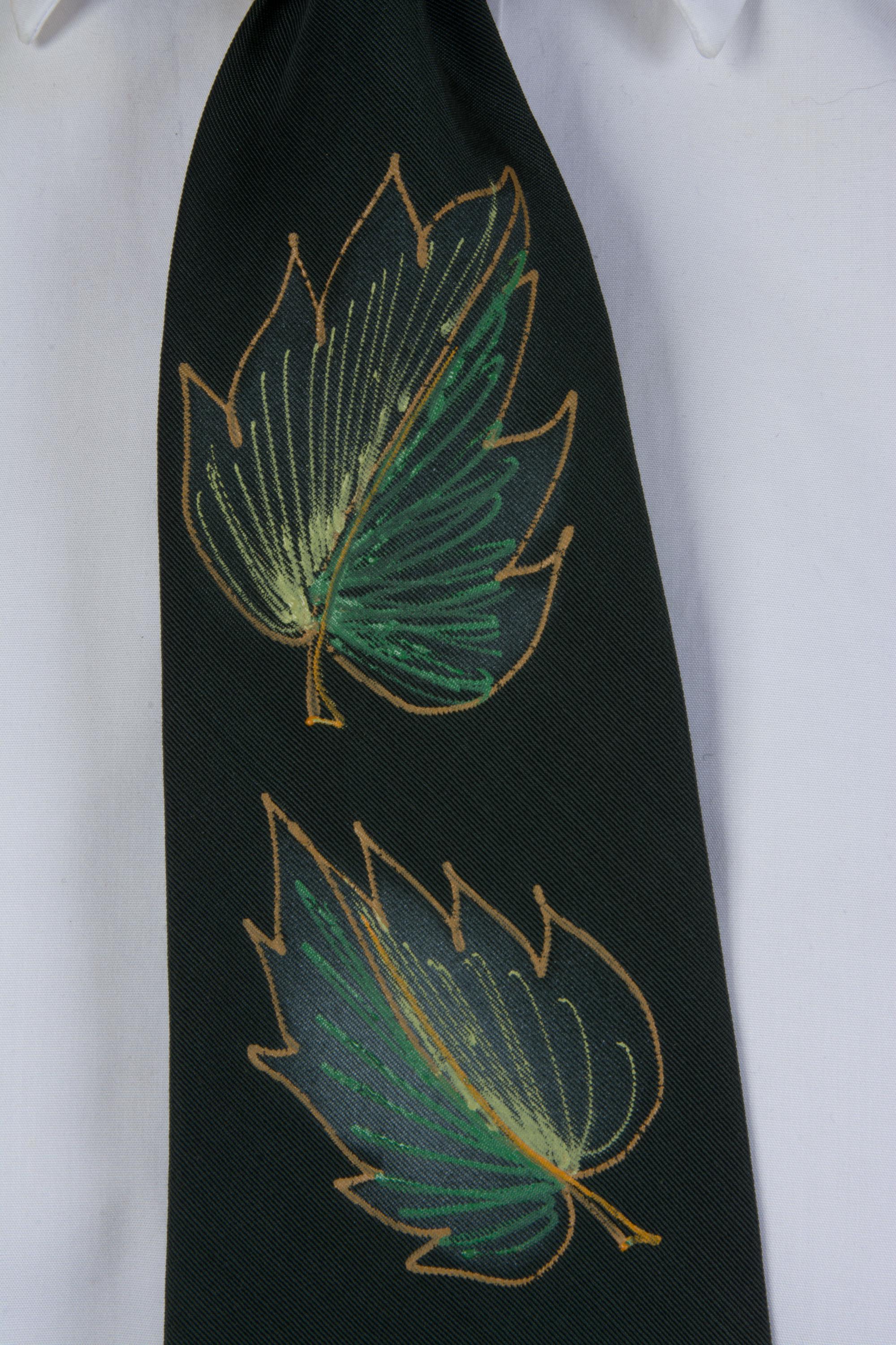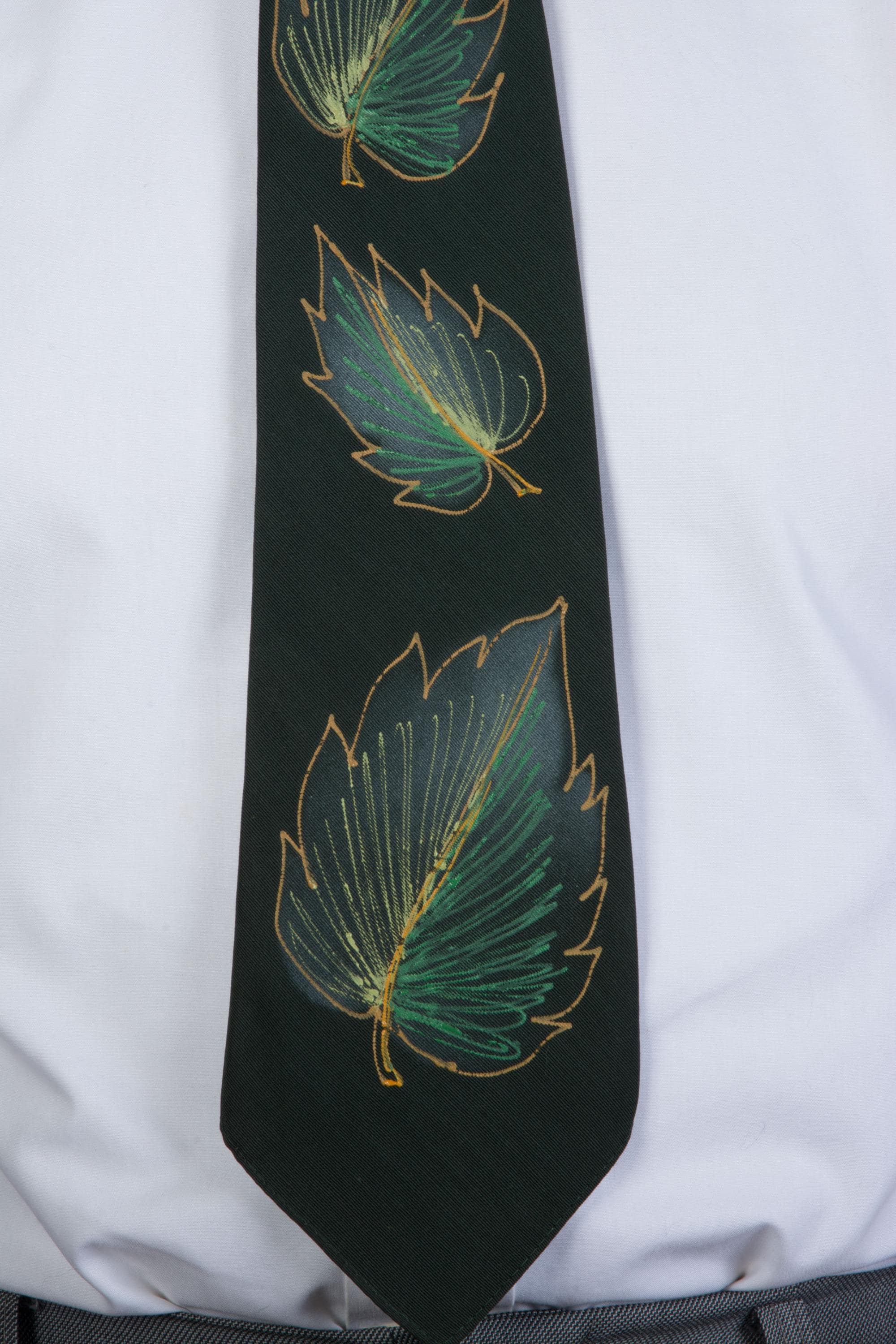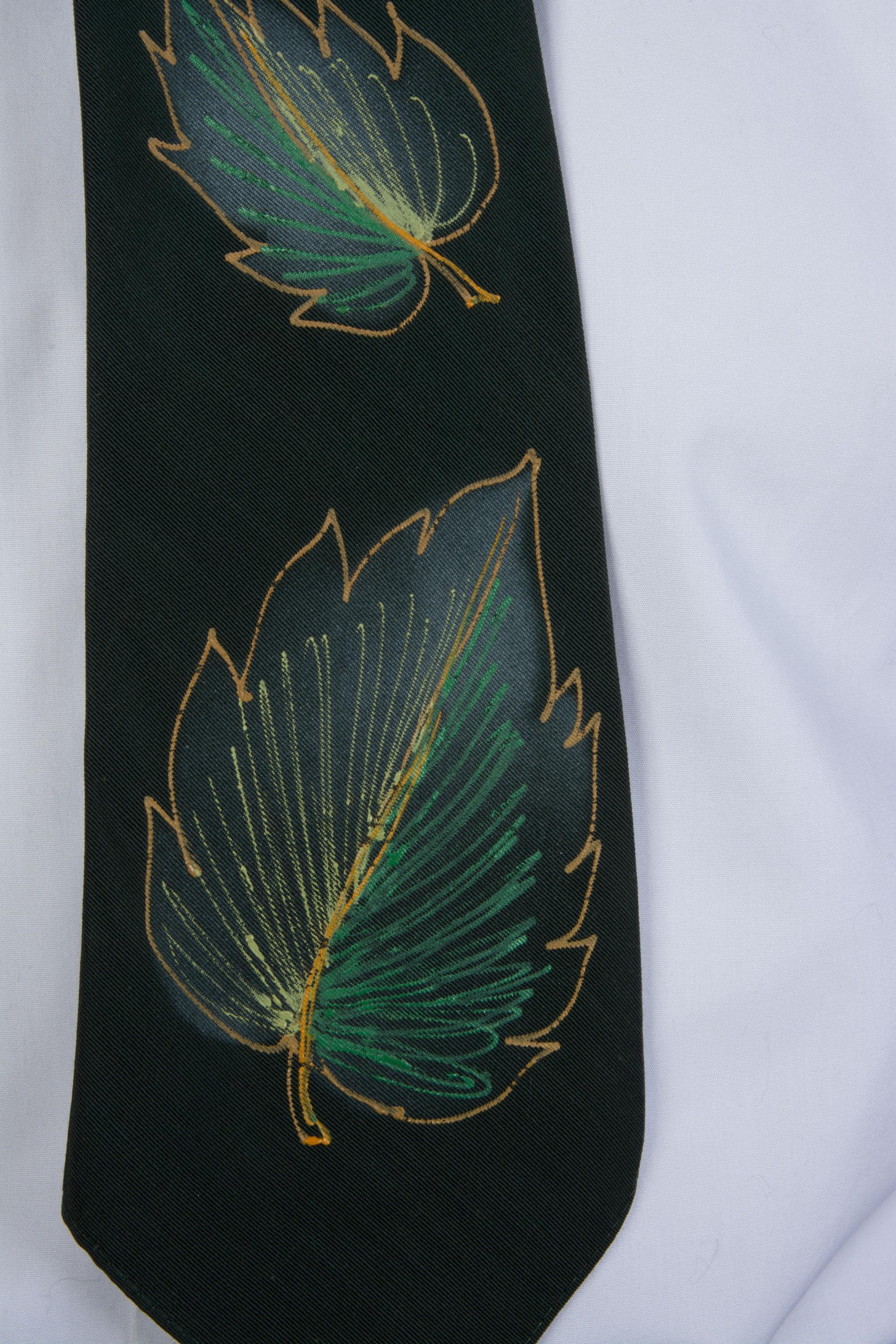 Vintage 1940s Hand Painted Towncraft Deluxe Necktie in Deep Spruce Green with Painted Leaves