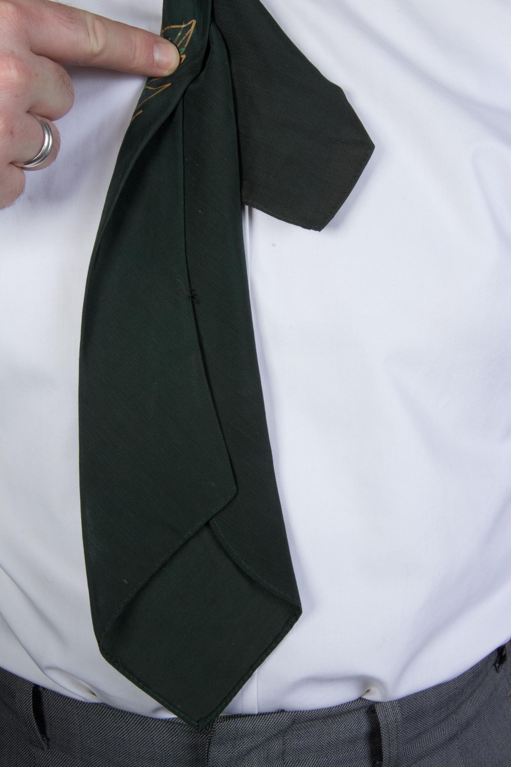 This tie is clean, crisp and freshly pressed. The face is VERY slightly faded, just that subtle chemical fade common to these green dyes of the period. The inside of the tail has pressing sheen. I find no other issues to note!