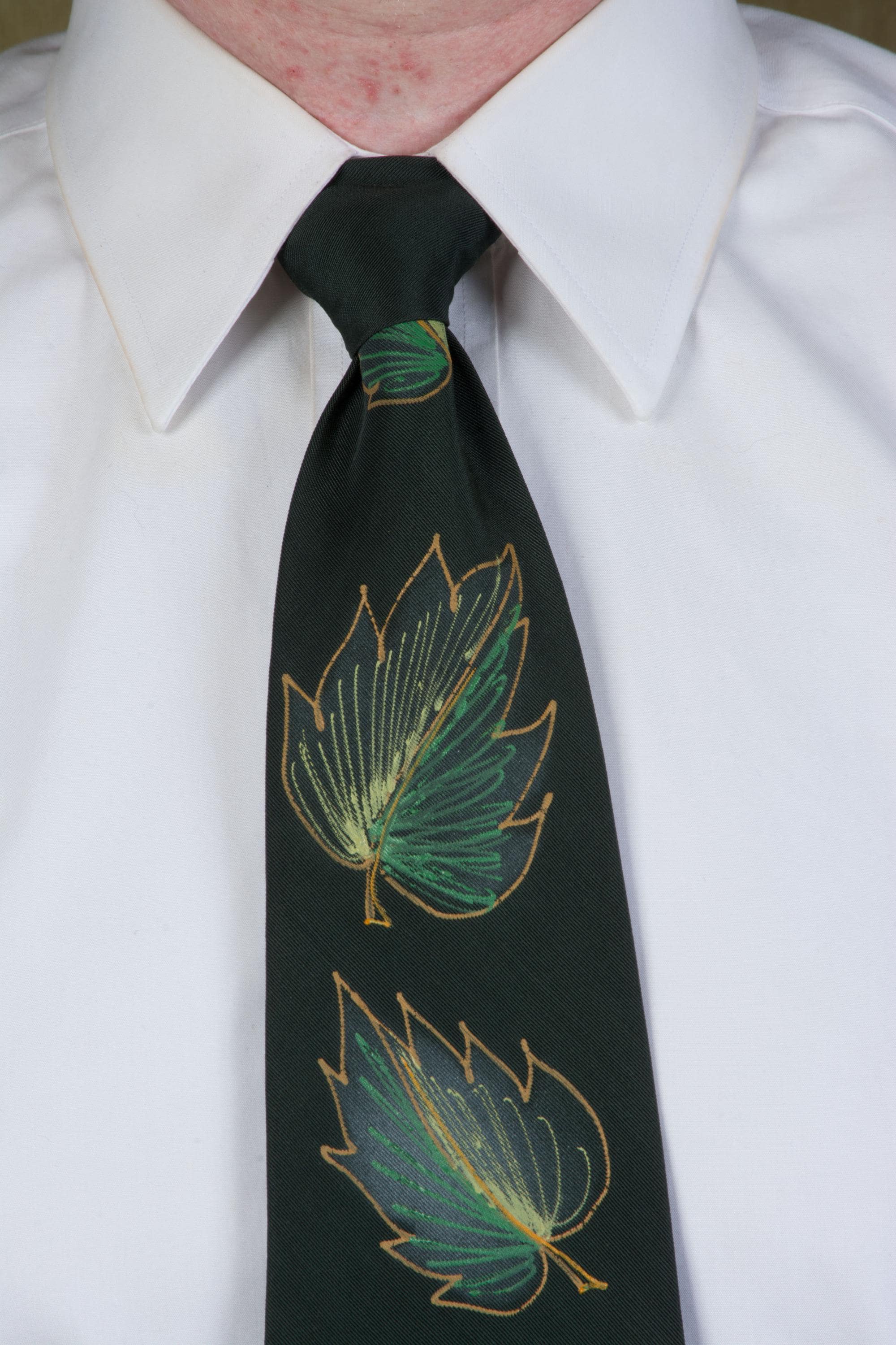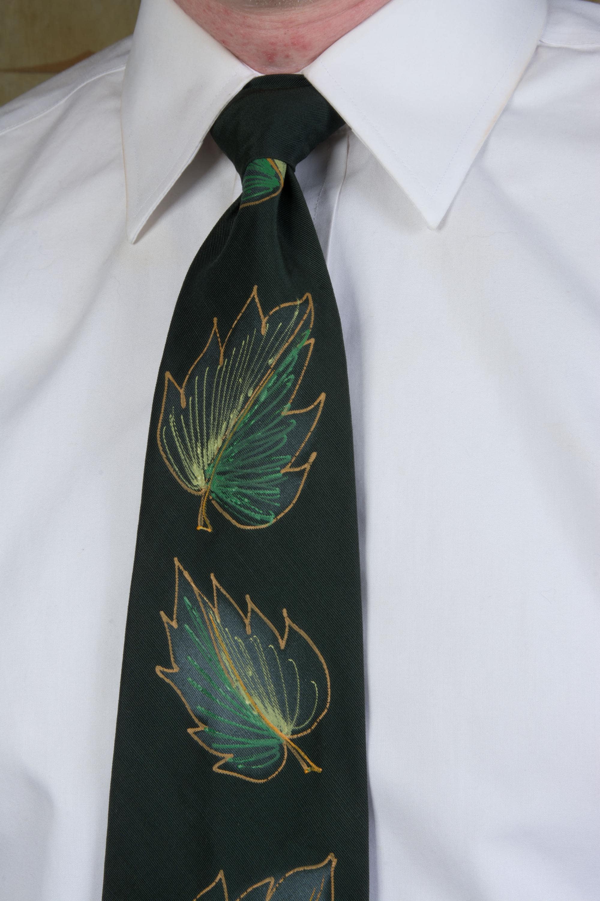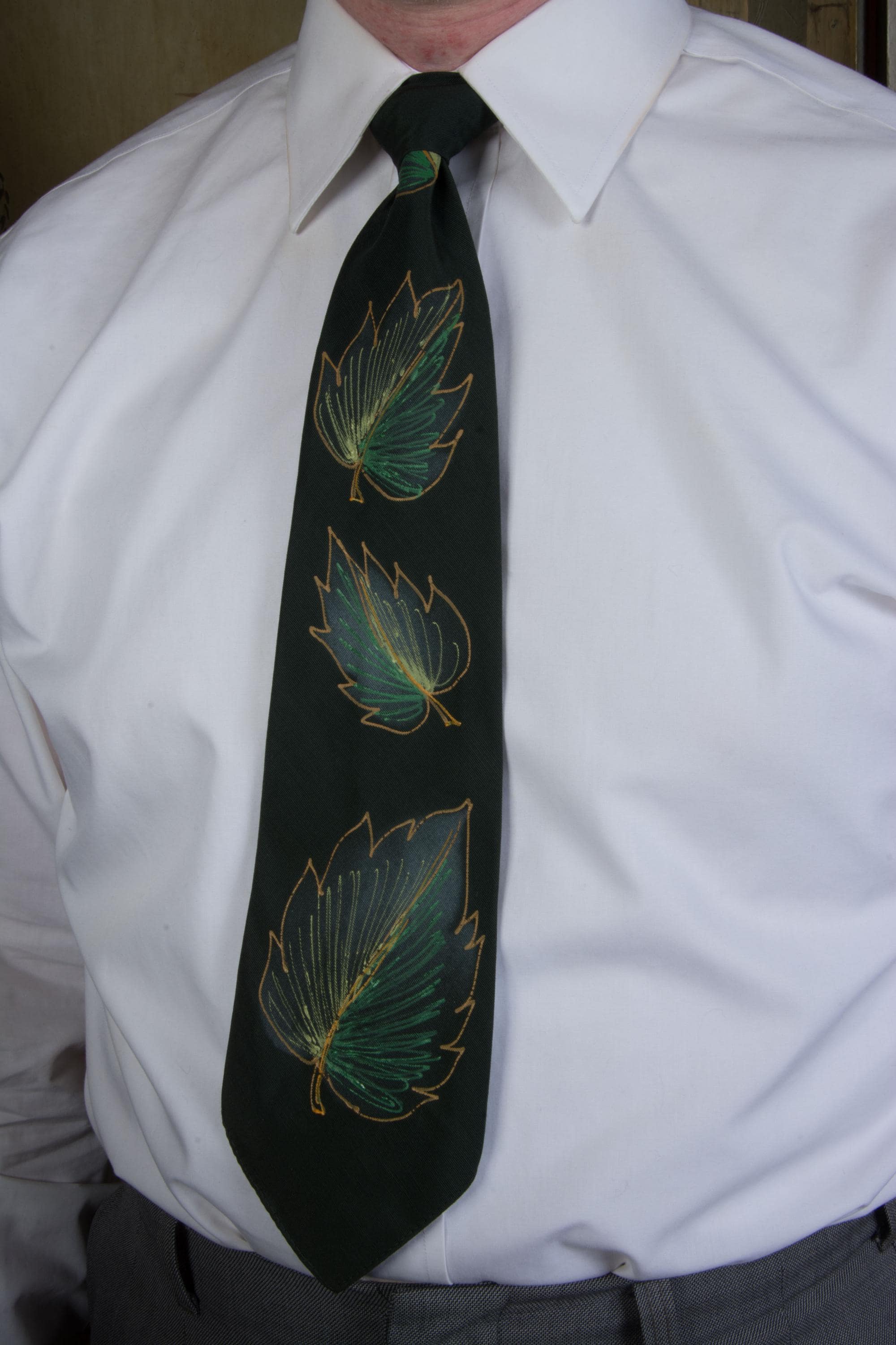 Gorgeous 1940s painted tie from Towncraft Deluxe is made of "spun rayon" - it has a deep green faille texture. There are four painted leaves - although it's short enough you can't get more than three to show. The edges are goldenrod, the centers have a light wash, and lines of kelly and melon green. It is unlined, having just a light interfacing.