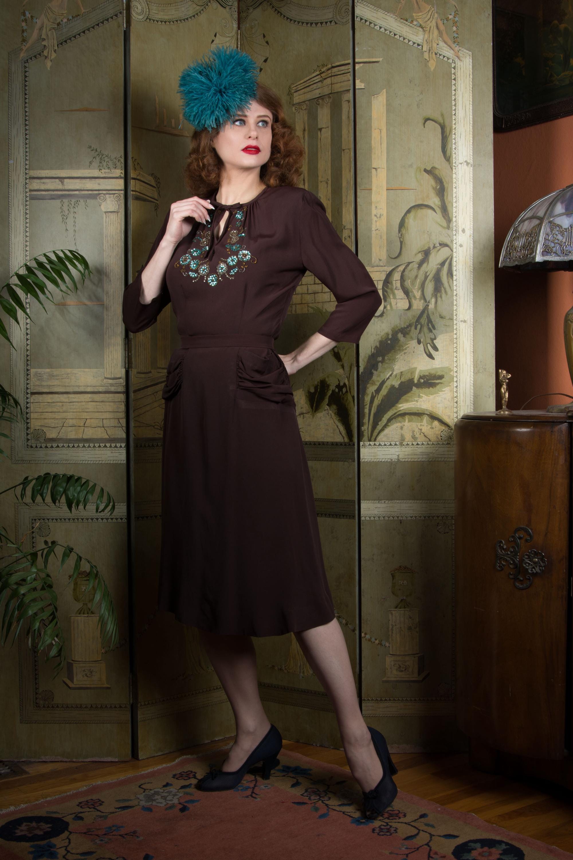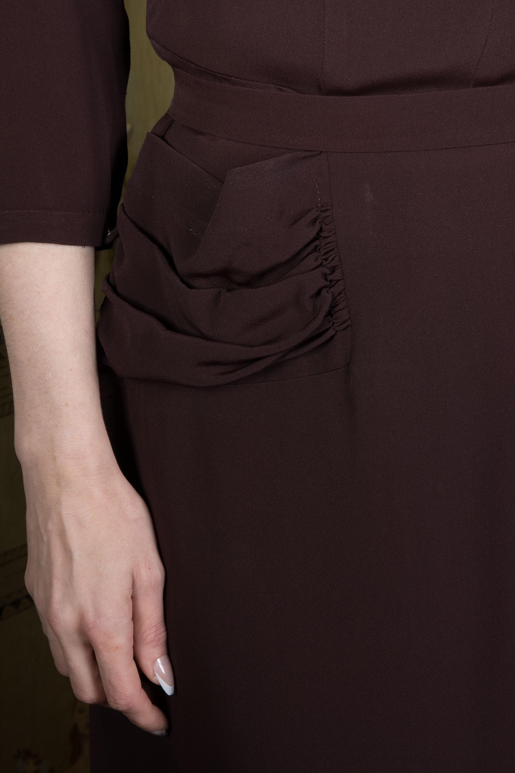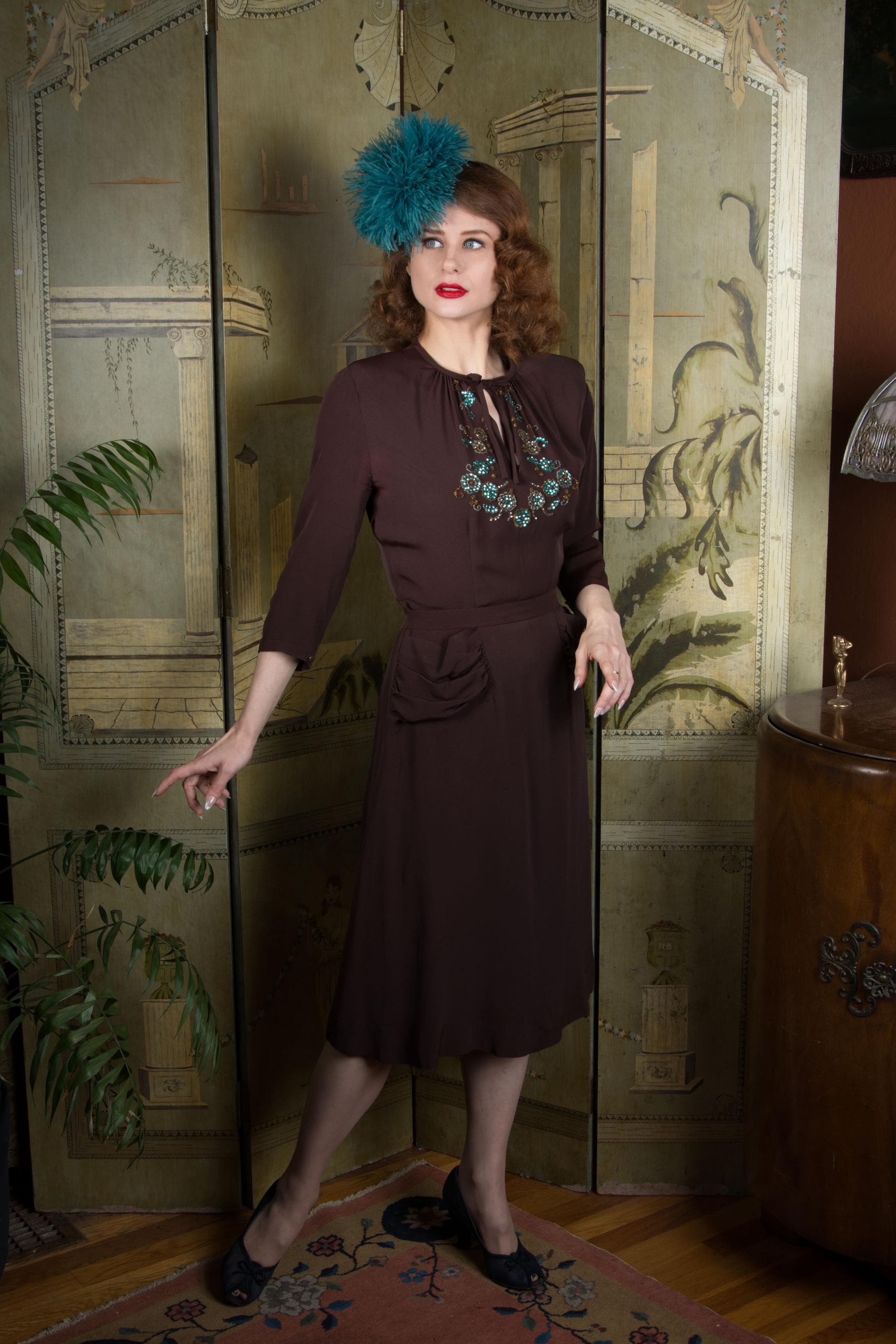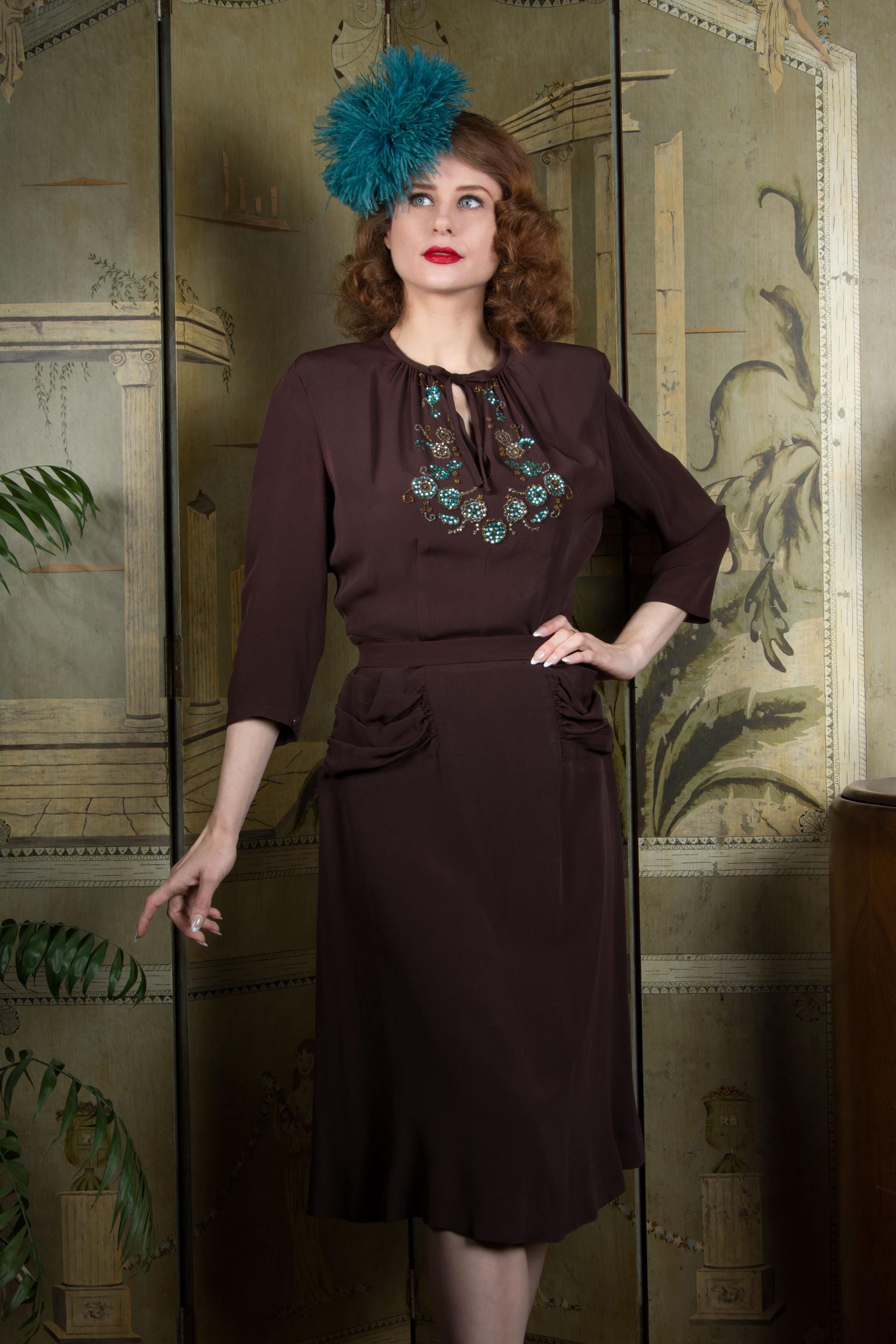 Vintage 1940s cocktail dress in a drapey rayon or rayon blend. The brown hue is rich and dark - the kind of brown that is tinged a bit plum. It's a very sleek rayon blend faille - not too thick or heavy but with marvelous drape. The shoulders feature mid weight shoulder pads for a perfect silhouette. The gathered neckline closes with slim self-fabric piping ties. Surrounding the keyhole are sequins of bright blue and pale gold, with clear and golden yellow seed beads. The skirt is a single panel at front, and three gores at the back. Ruched accents at each hip are actually working pockets! What's not to love? This dress closes on the side with a metal zipper.