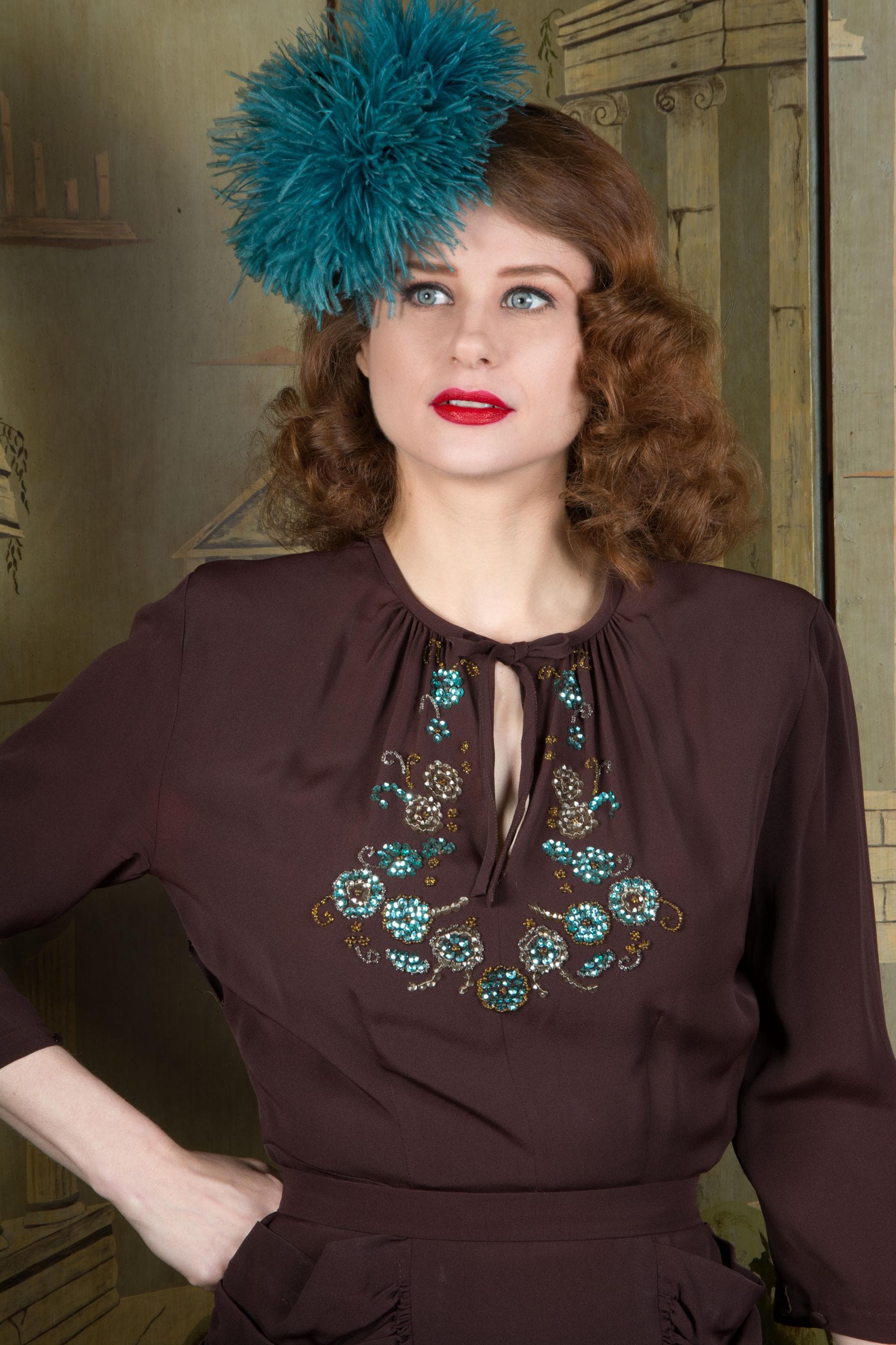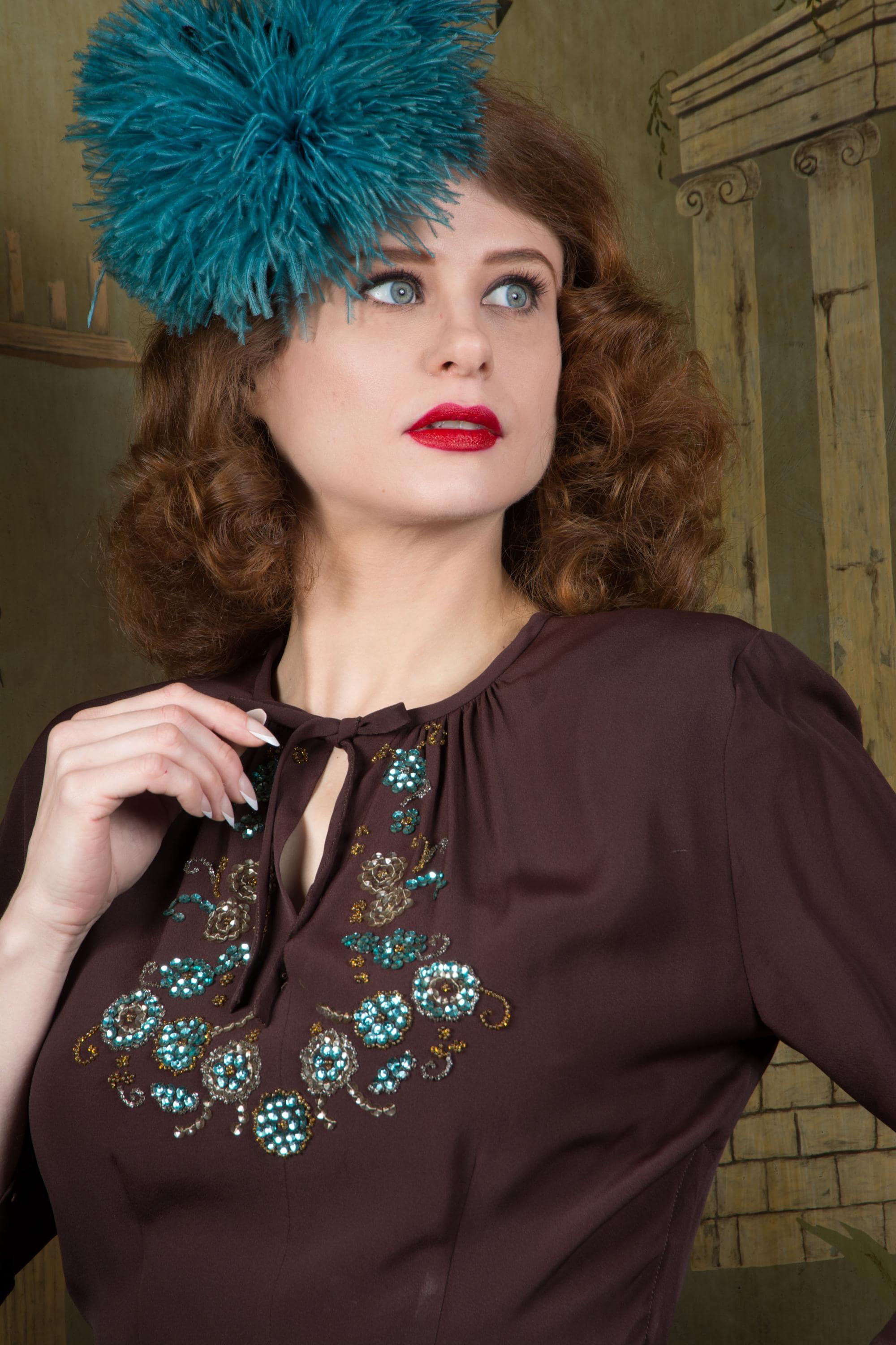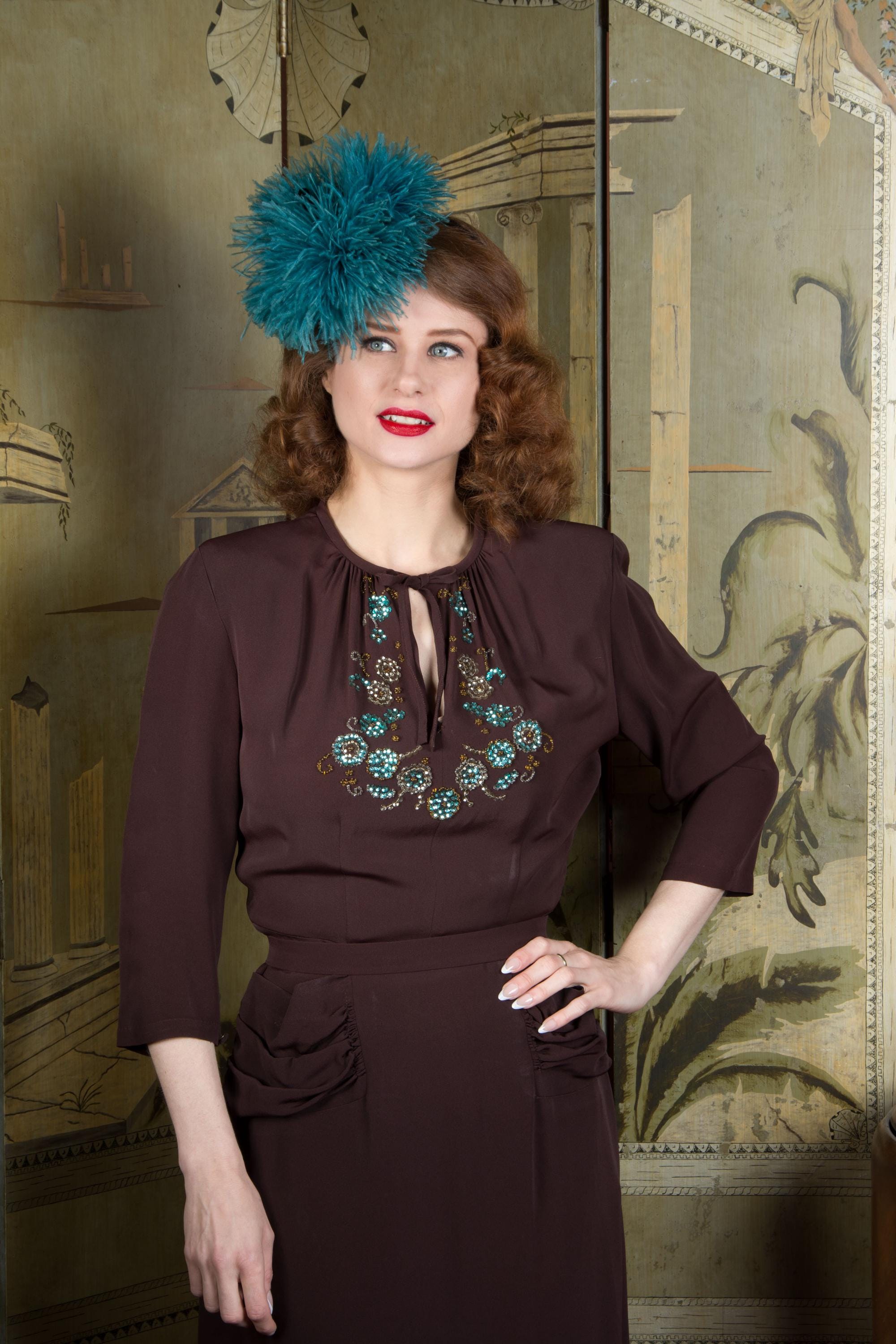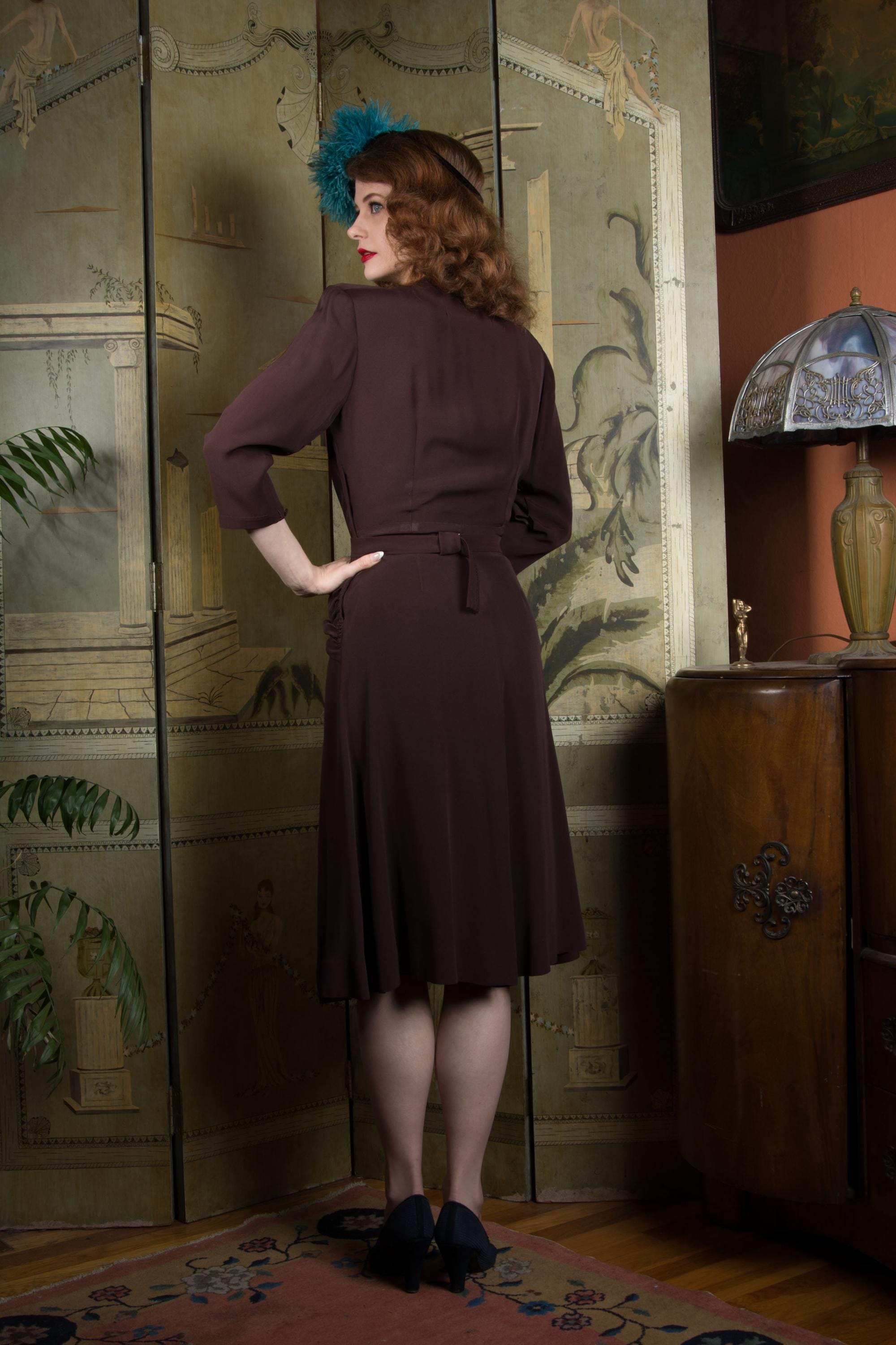 Vintage 1940s cocktail dress in a drapey rayon or rayon blend. The brown hue is rich and dark - the kind of brown that is tinged a bit plum. It's a very sleek rayon blend faille - not too thick or heavy but with marvelous drape. The shoulders feature mid weight shoulder pads for a perfect silhouette. The gathered neckline closes with slim self-fabric piping ties. Surrounding the keyhole are sequins of bright blue and pale gold, with clear and golden yellow seed beads. The skirt is a single panel at front, and three gores at the back. Ruched accents at each hip are actually working pockets! What's not to love? This dress closes on the side with a metal zipper.