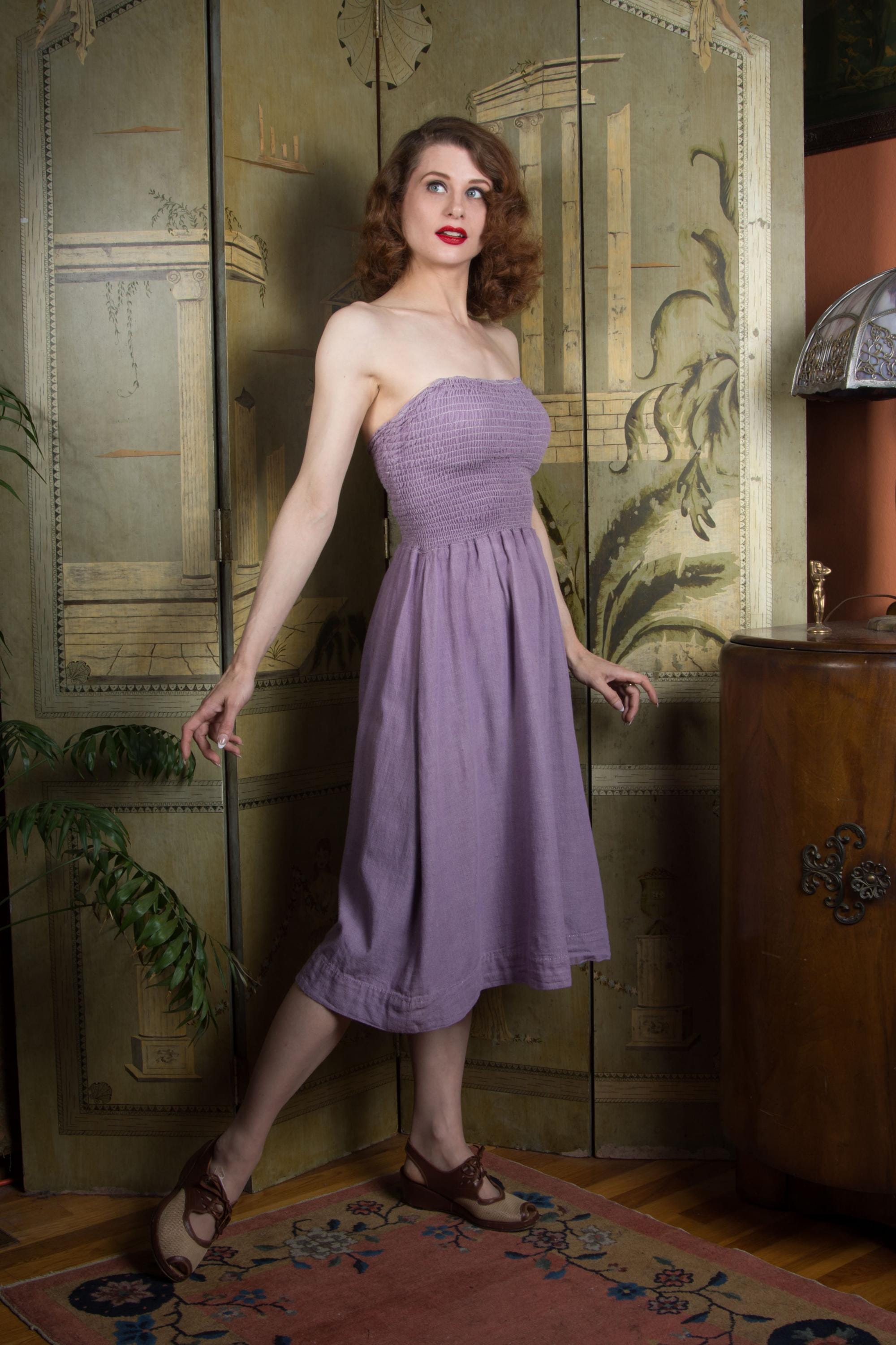 1940s Strapless Summer Sundress Vintage 1940s or Early 50s Purple Chambray Cotton Frock with Smocked Bodice